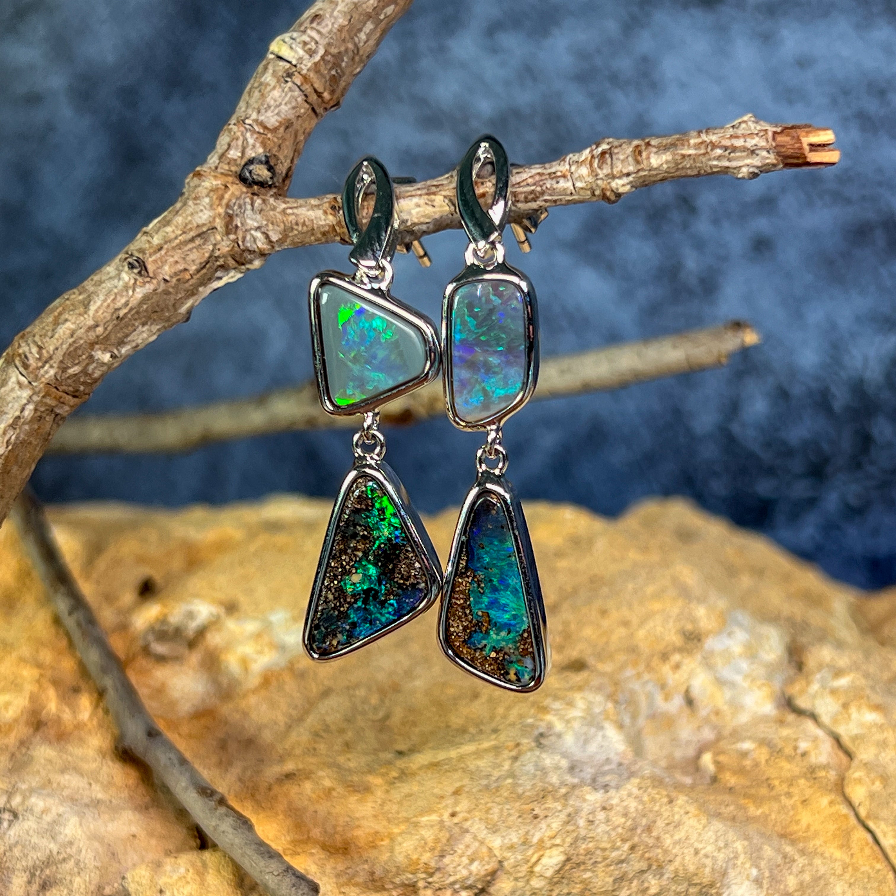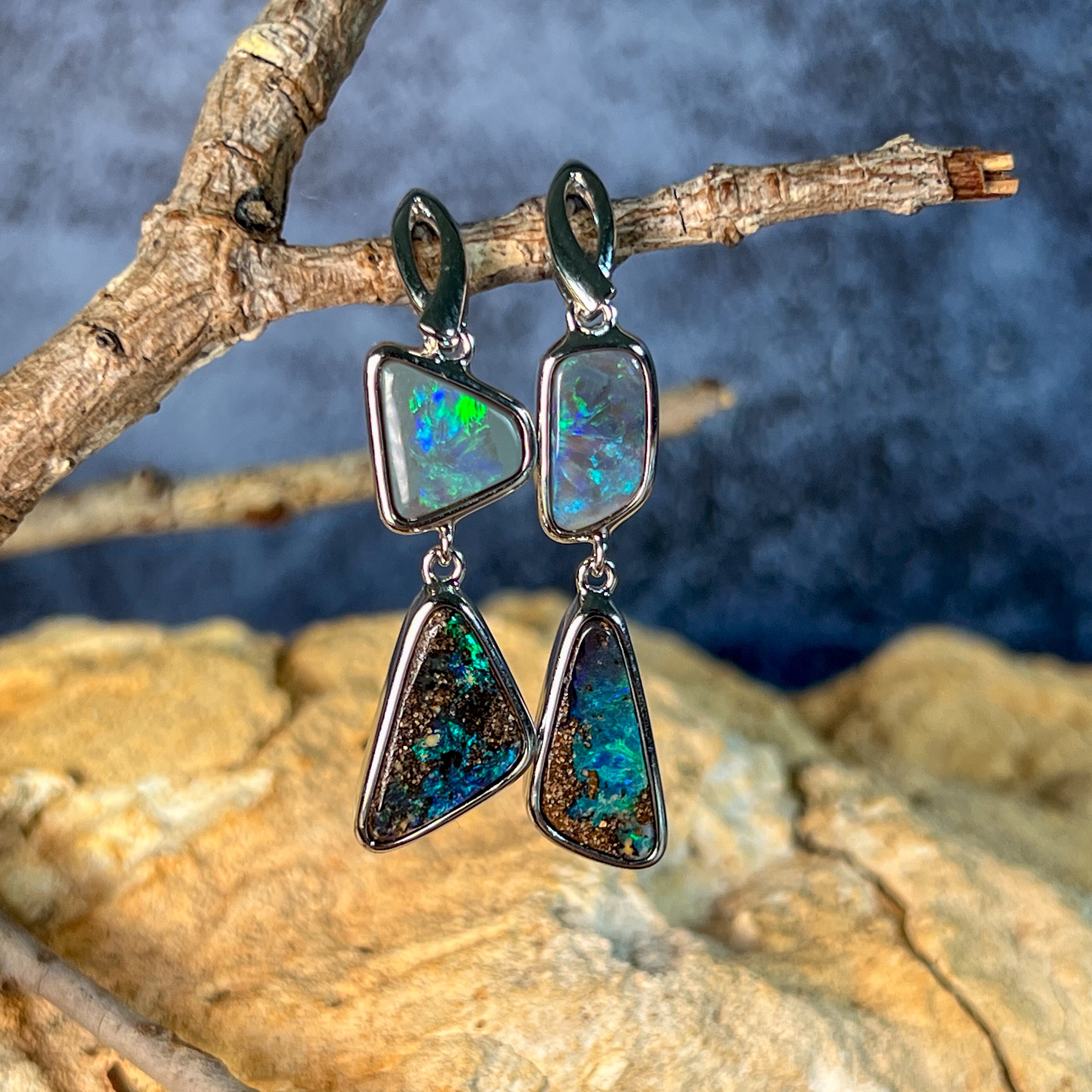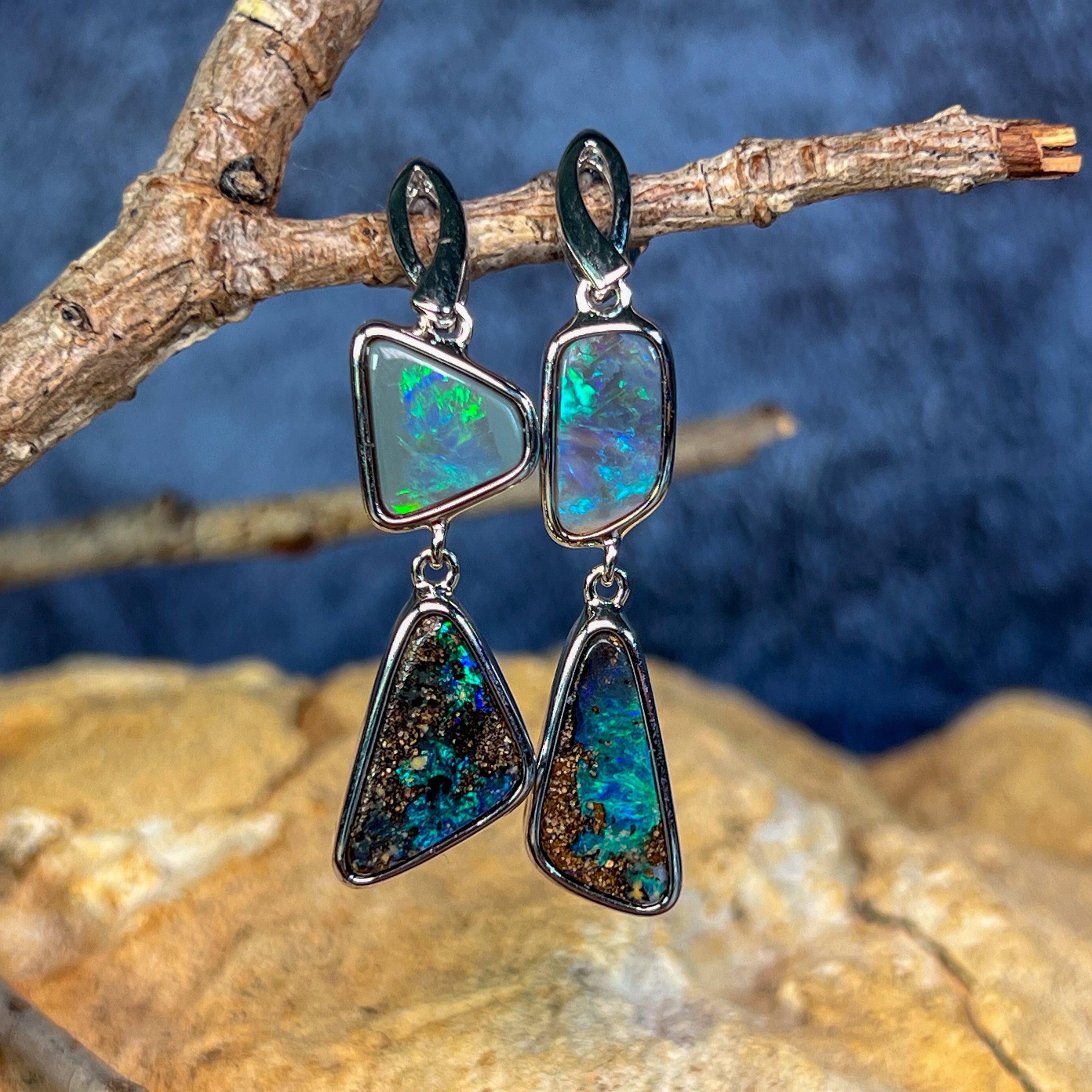 Add a touch of unique elegance to your style with these Sterling Silver Black Opal and Boulder Opal dangling earrings. Handcrafted with natural freeform boulder opals, these earrings make the perfect gift for any jewelry lover. Stand out from the crowd and embrace your individuality with these one-of-a-kind pieces.