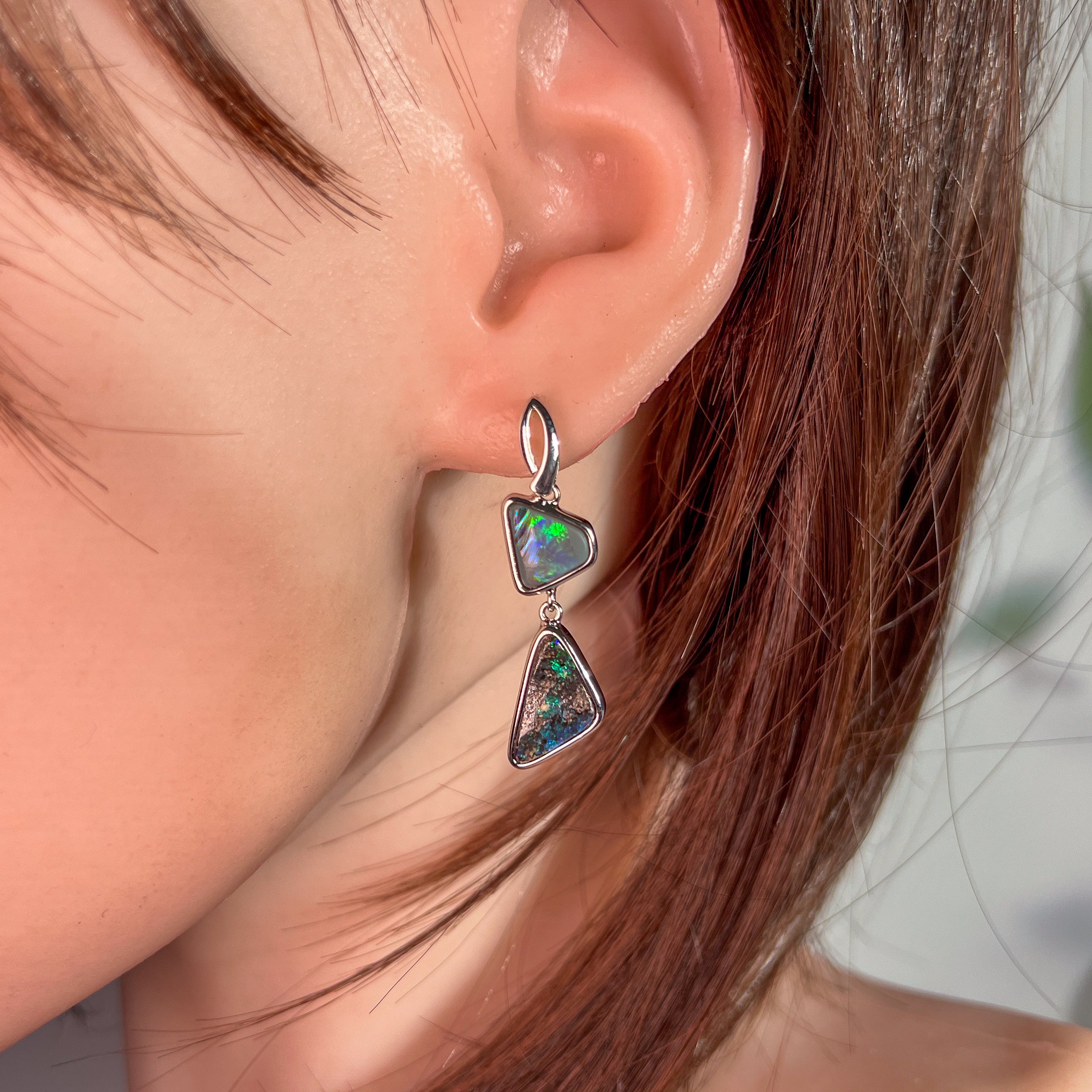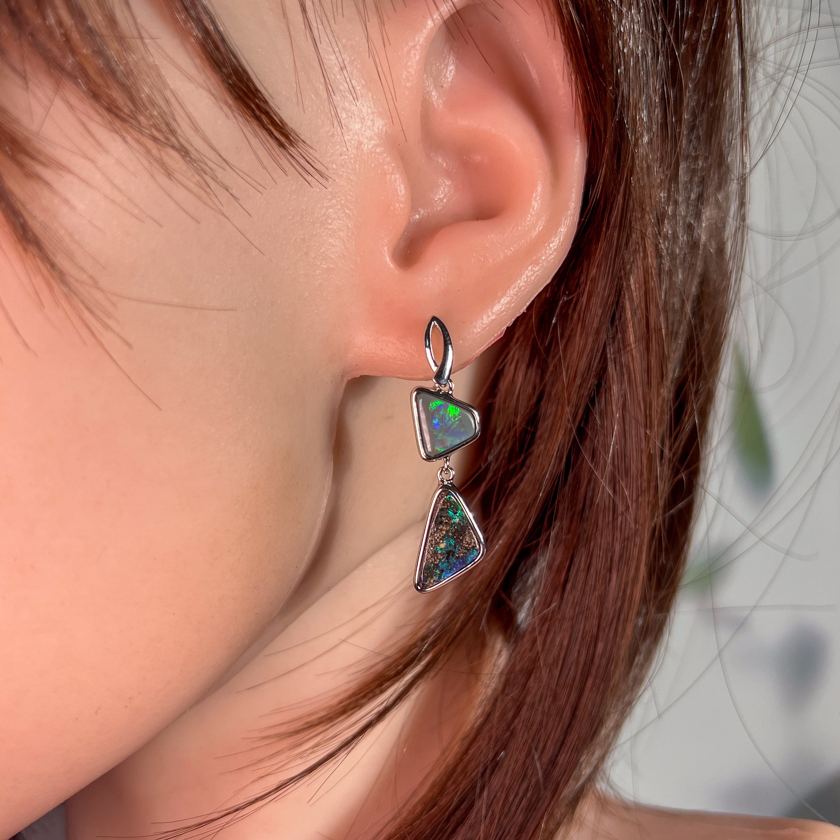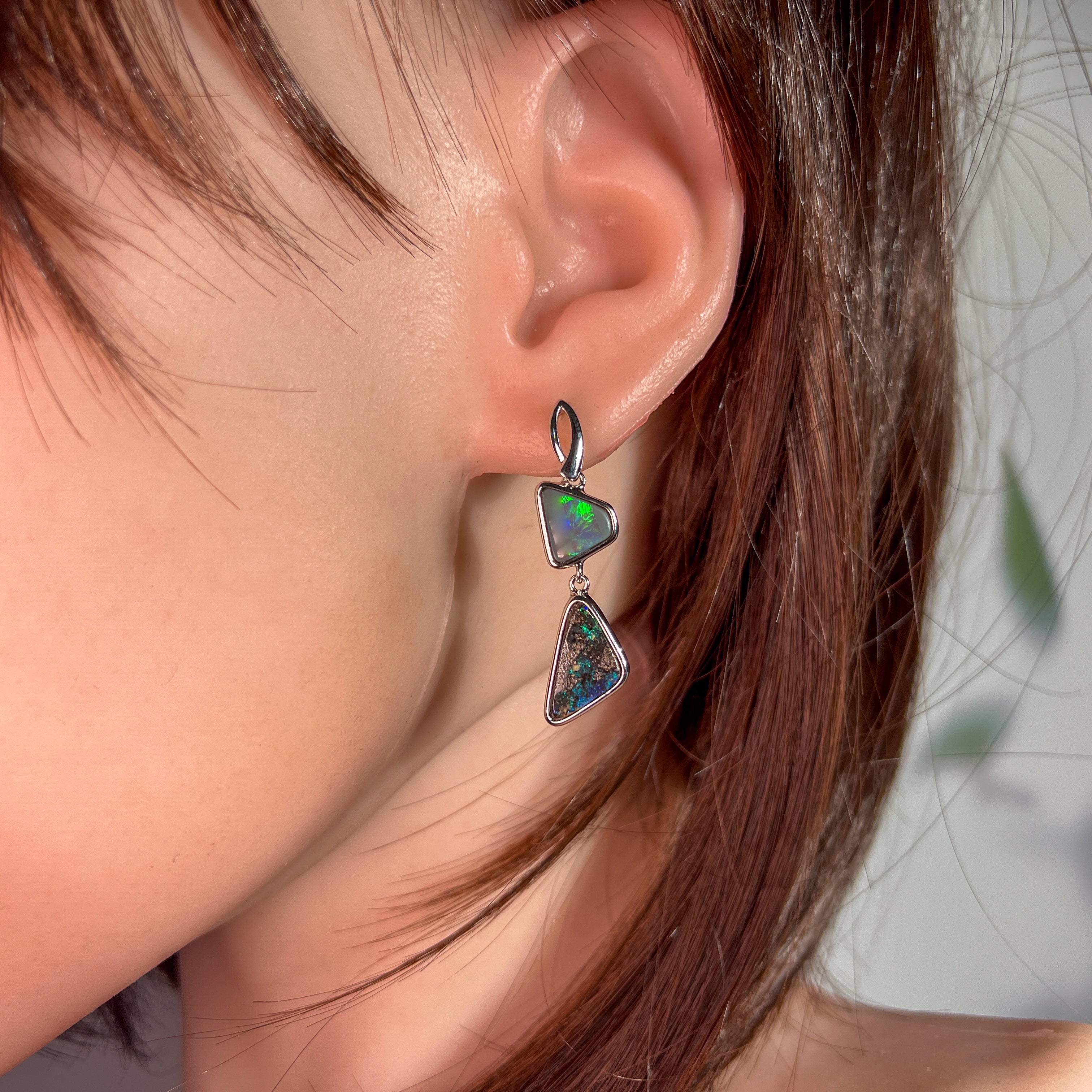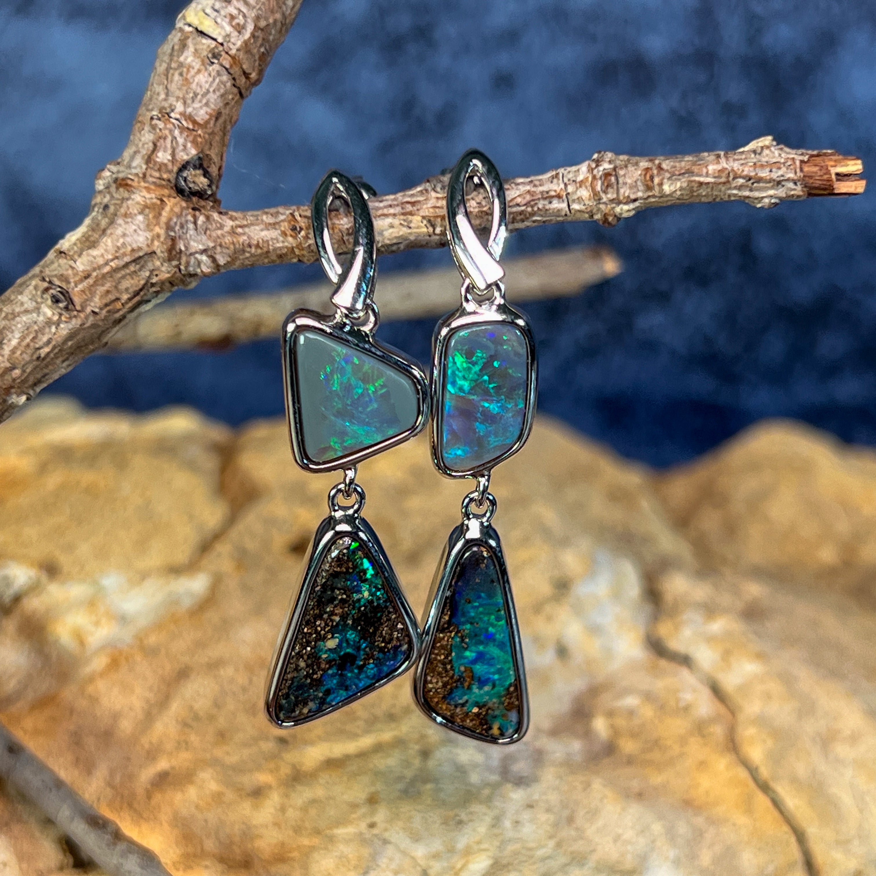 Add a touch of unique elegance to your style with these Sterling Silver Black Opal and Boulder Opal dangling earrings. Handcrafted with natural freeform boulder opals, these earrings make the perfect gift for any jewelry lover. Stand out from the crowd and embrace your individuality with these one-of-a-kind pieces.