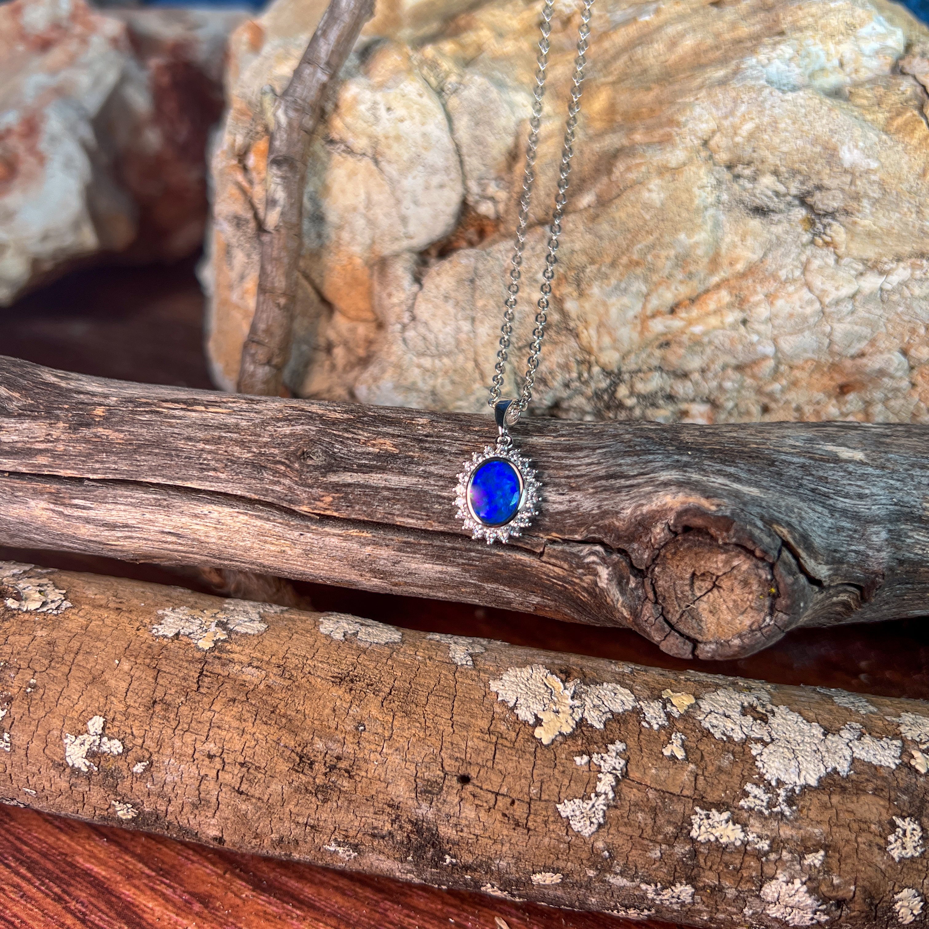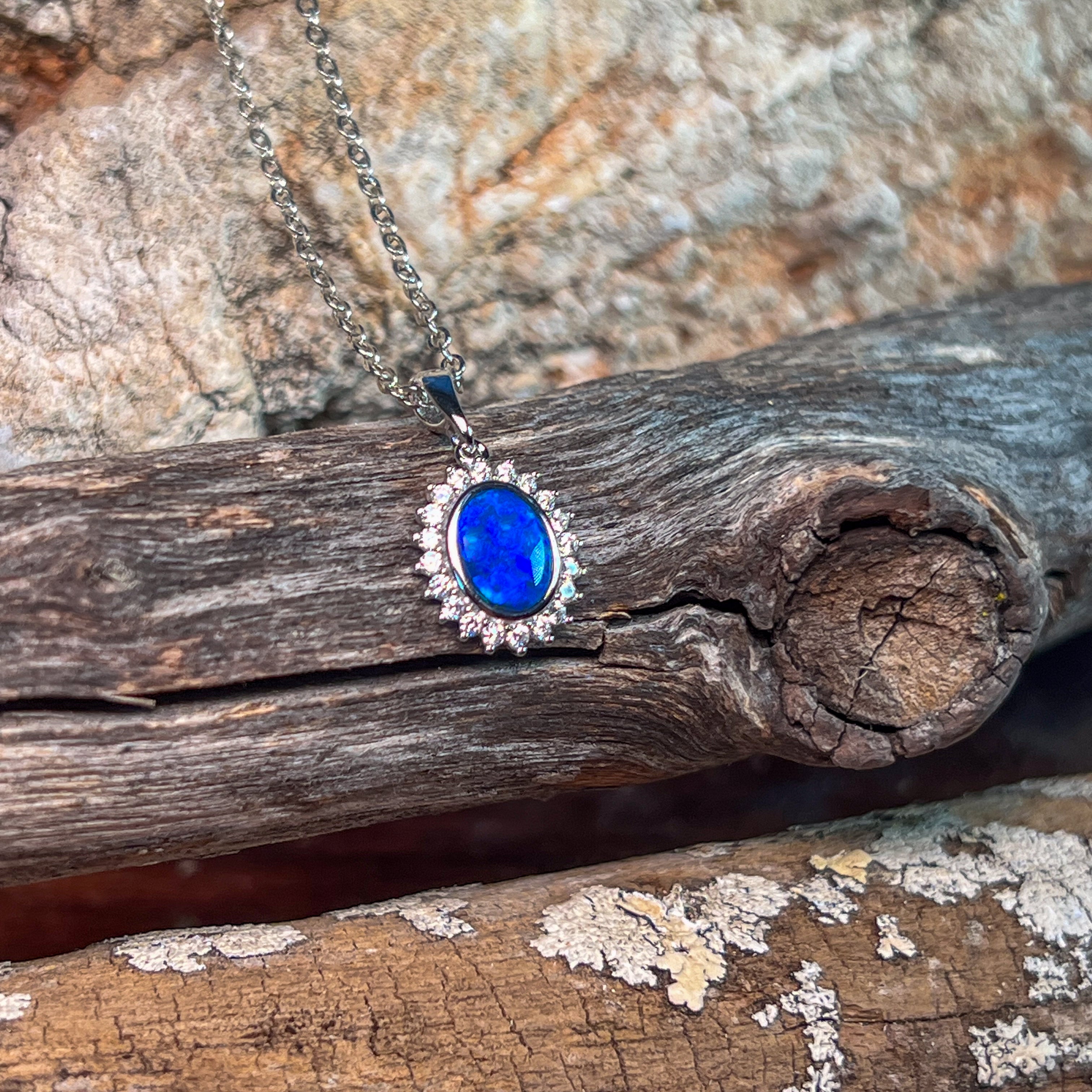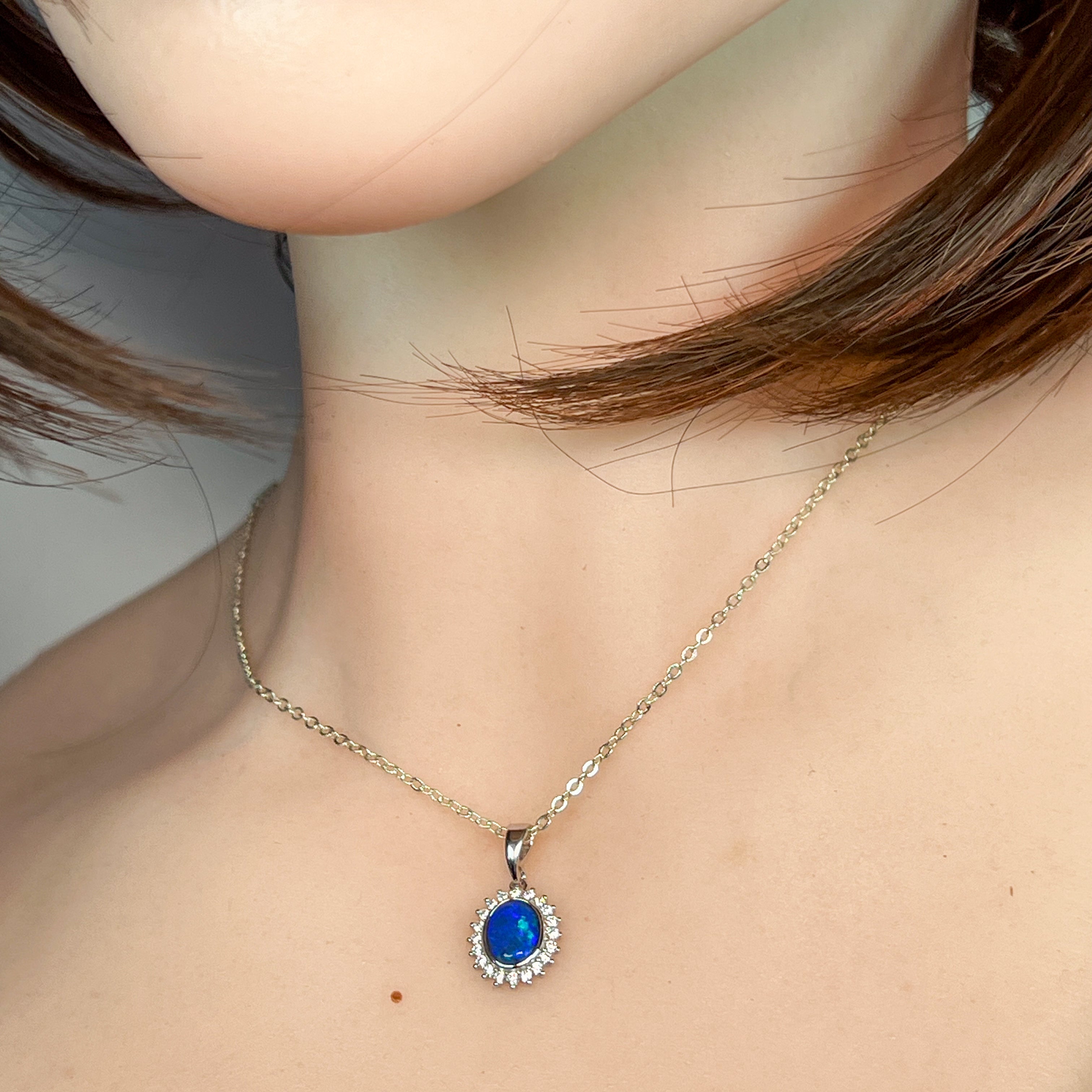 Elevate your elegance with this sterling silver pendant featuring a captivating black opal doublet framed by a delicate blue colour halo. Its classic dainty design offers timeless style perfect for daily wear or special occasions, while the vibrant opal glow adds a unique touch of sophistication to any outfit.