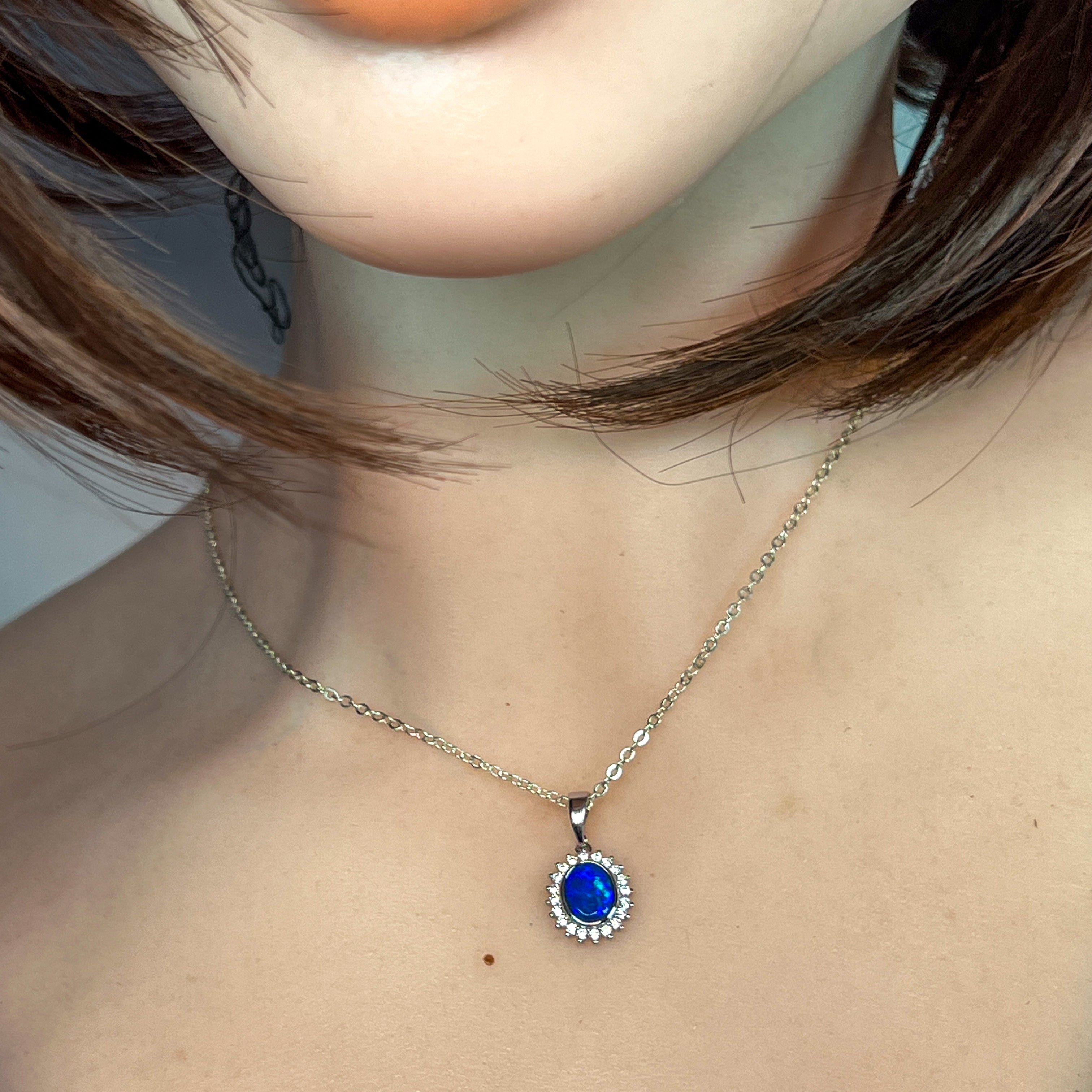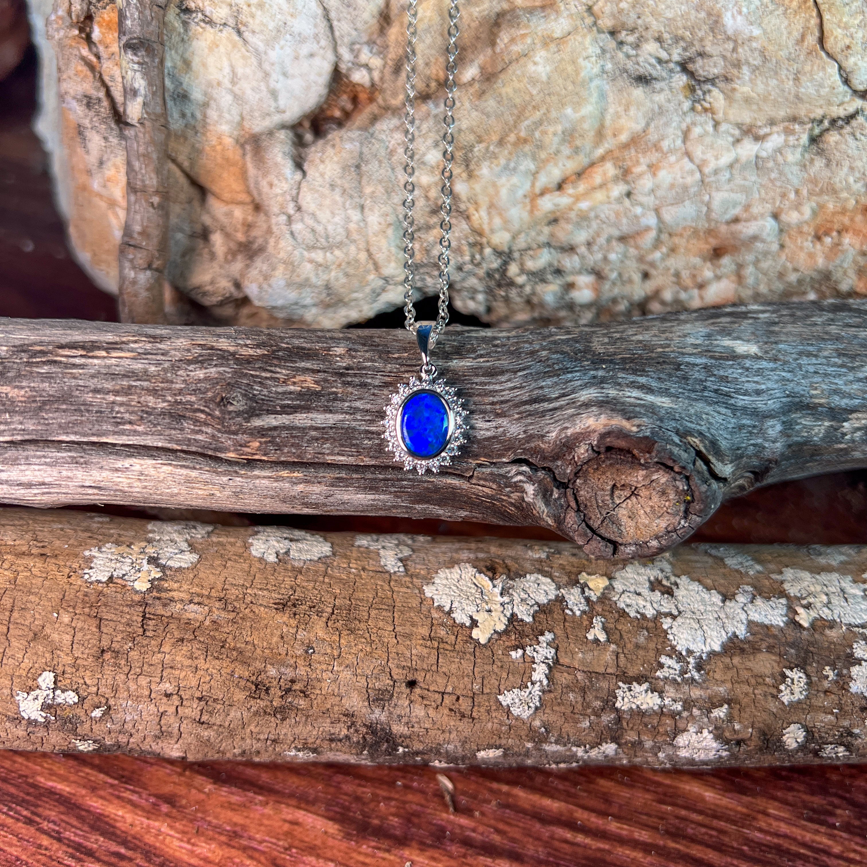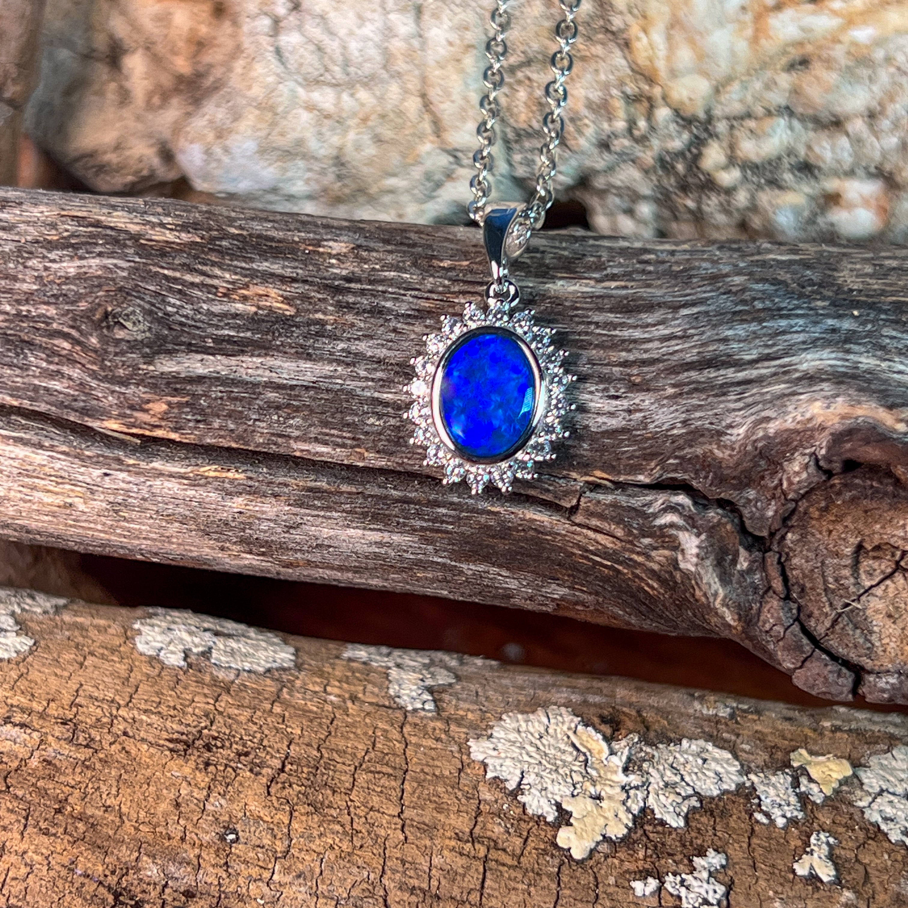 Elevate your elegance with this sterling silver pendant featuring a captivating black opal doublet framed by a delicate blue colour halo. Its classic dainty design offers timeless style perfect for daily wear or special occasions, while the vibrant opal glow adds a unique touch of sophistication to any outfit.