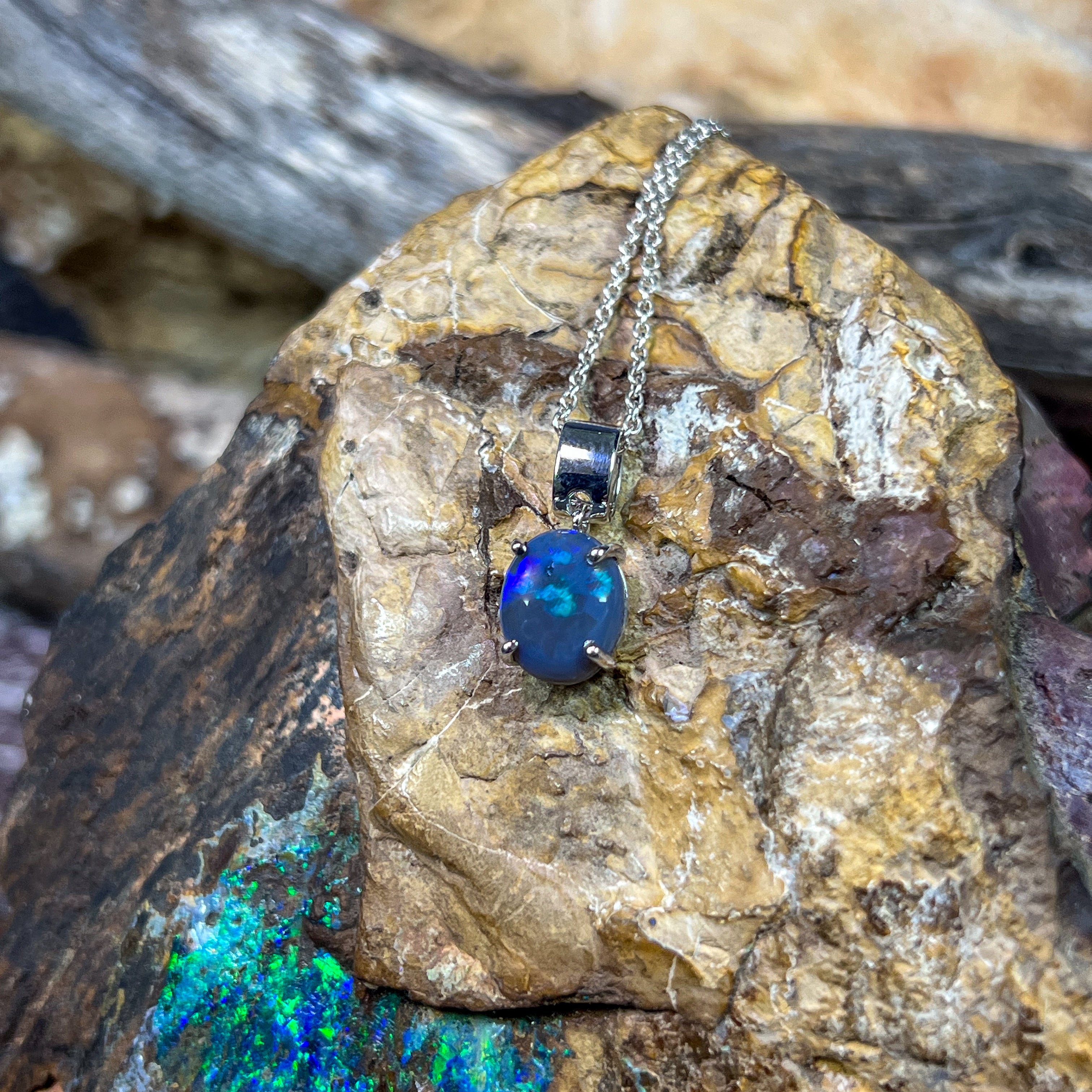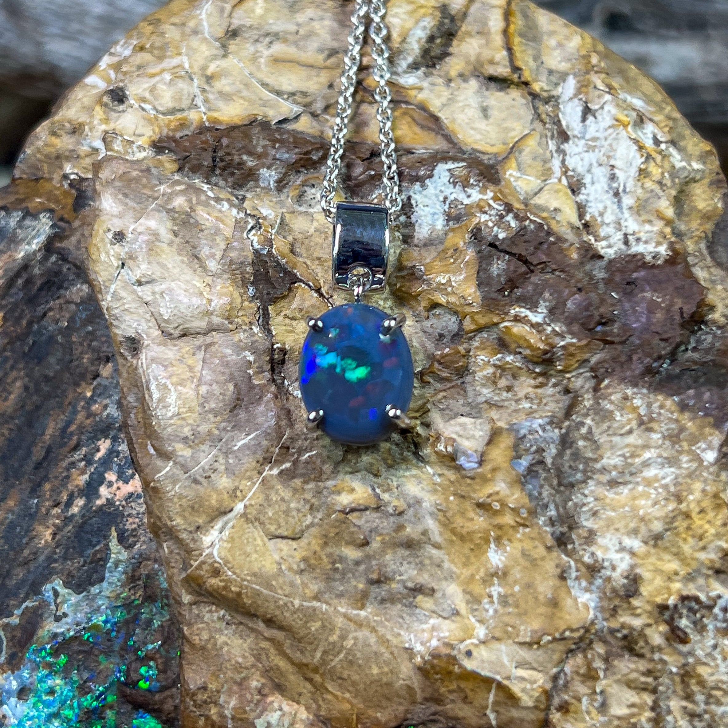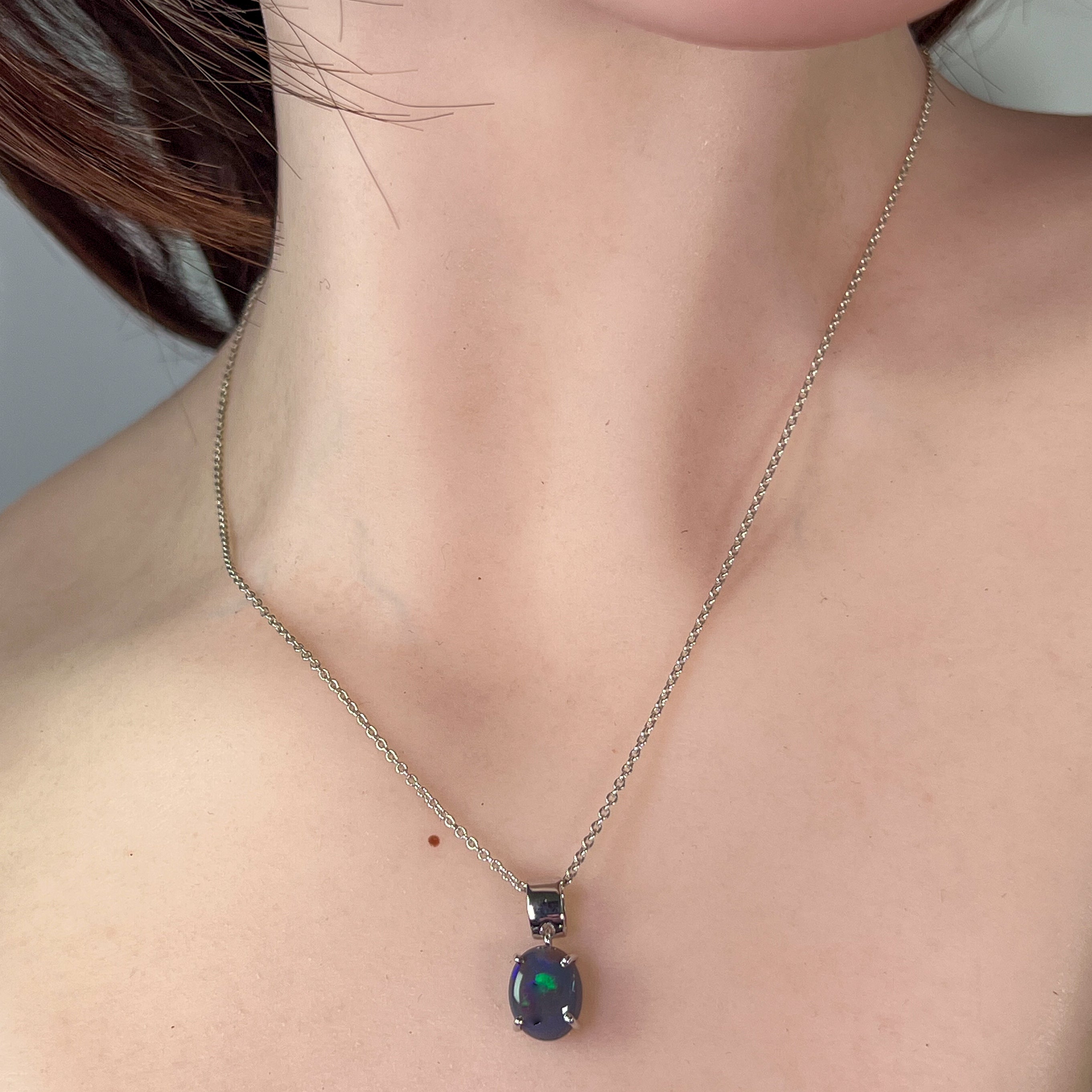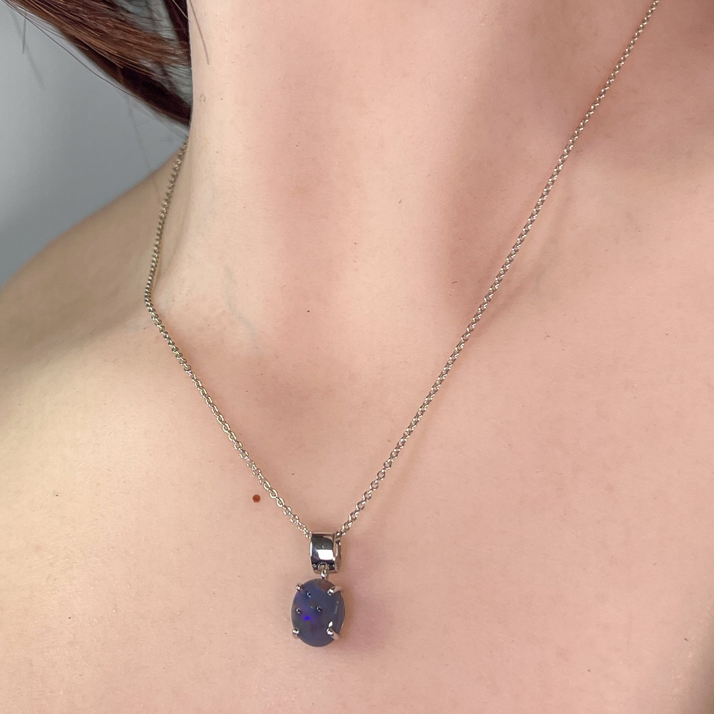 Upgrade your jewelry collection with our stunning Sterling Silver Black Opal Solitaire Pendant! This 10x8mm black opal gemstone radiates elegance and sophistication. Let the mesmerizing colors of the opal enhance your style and make a statement wherever you go. A must-have for any fashion-forward individual!