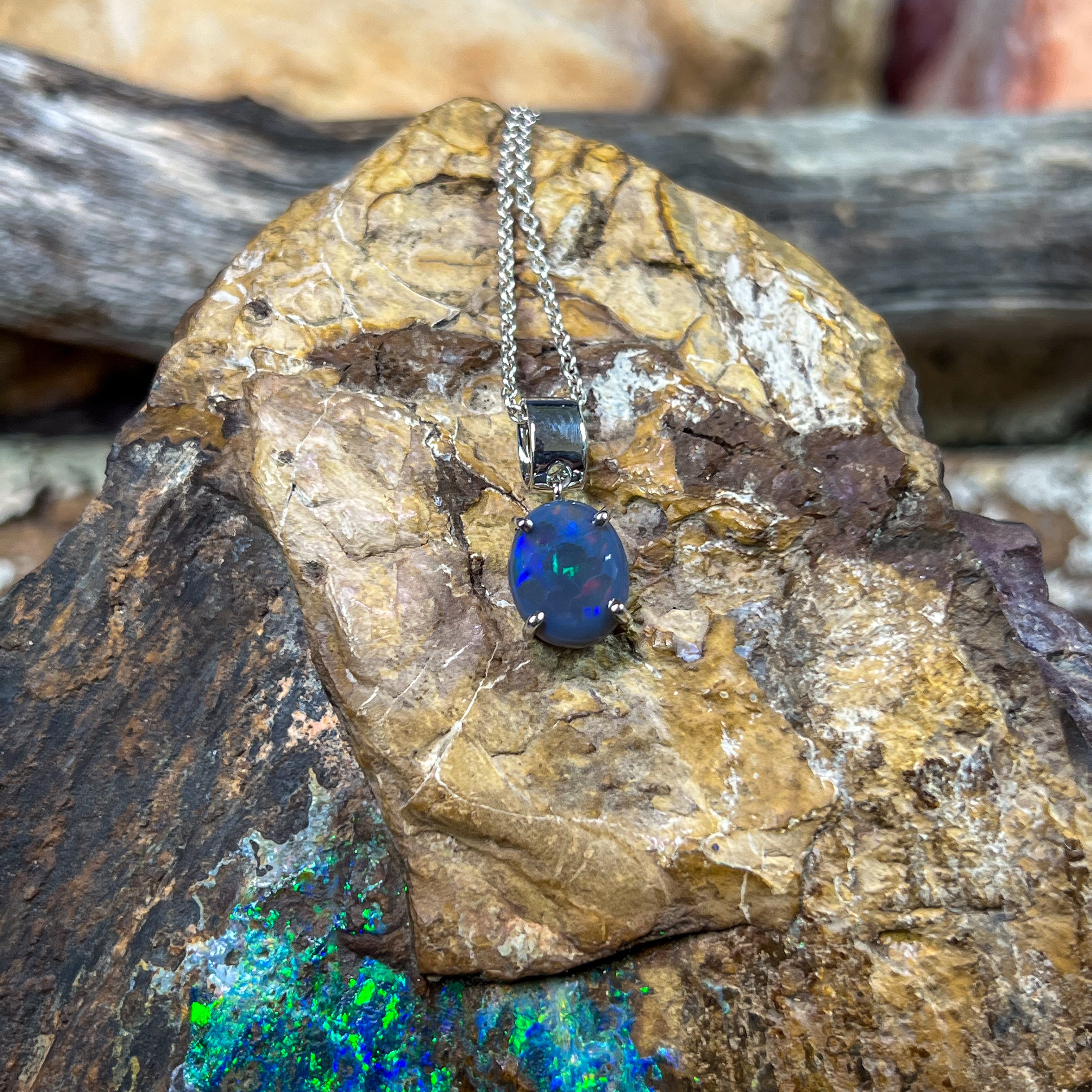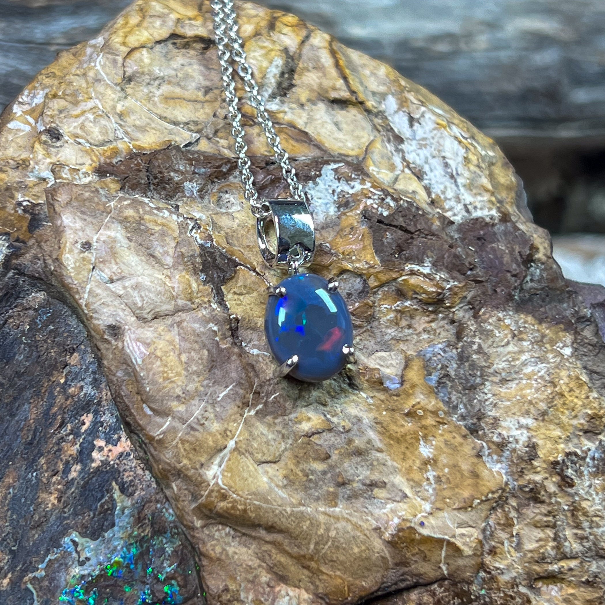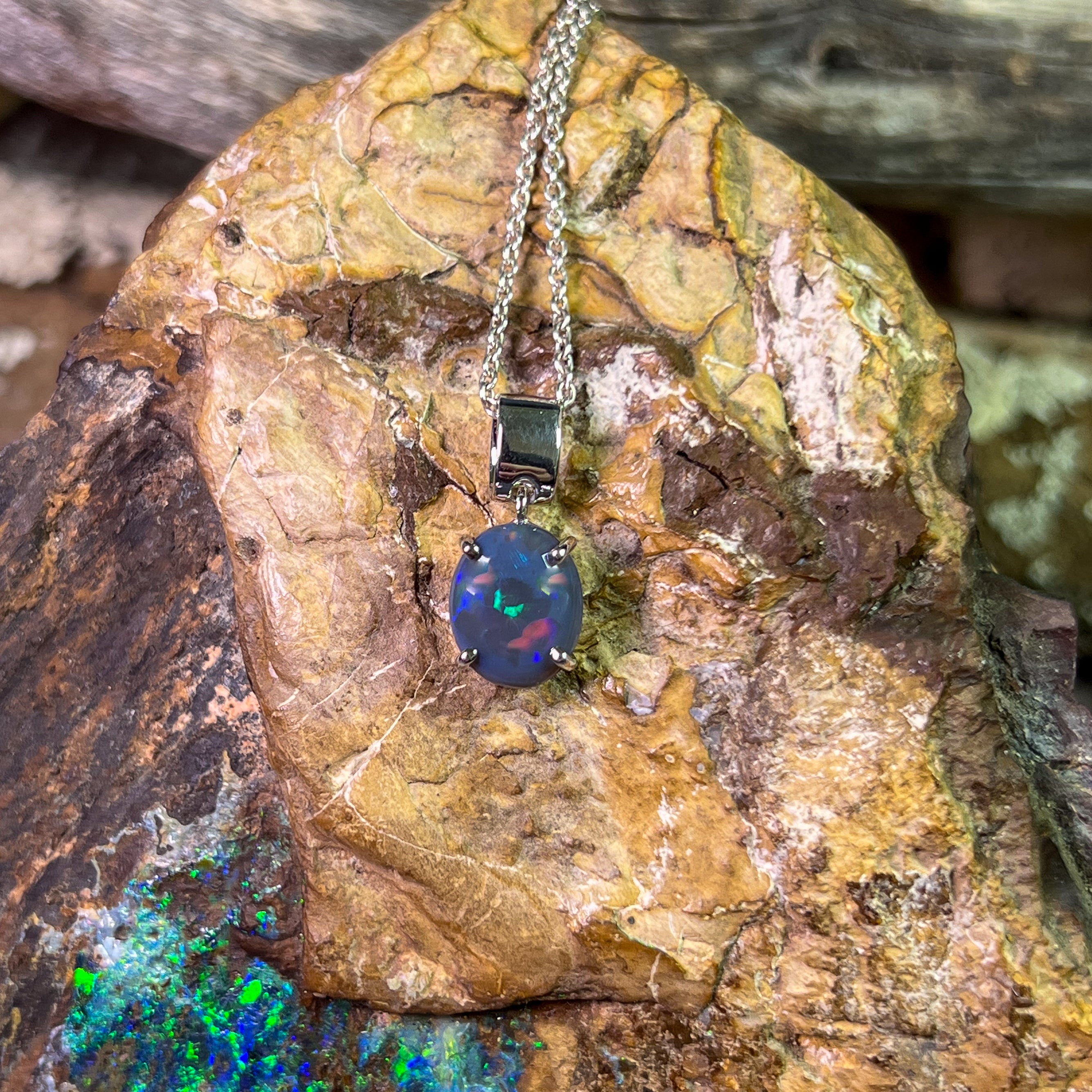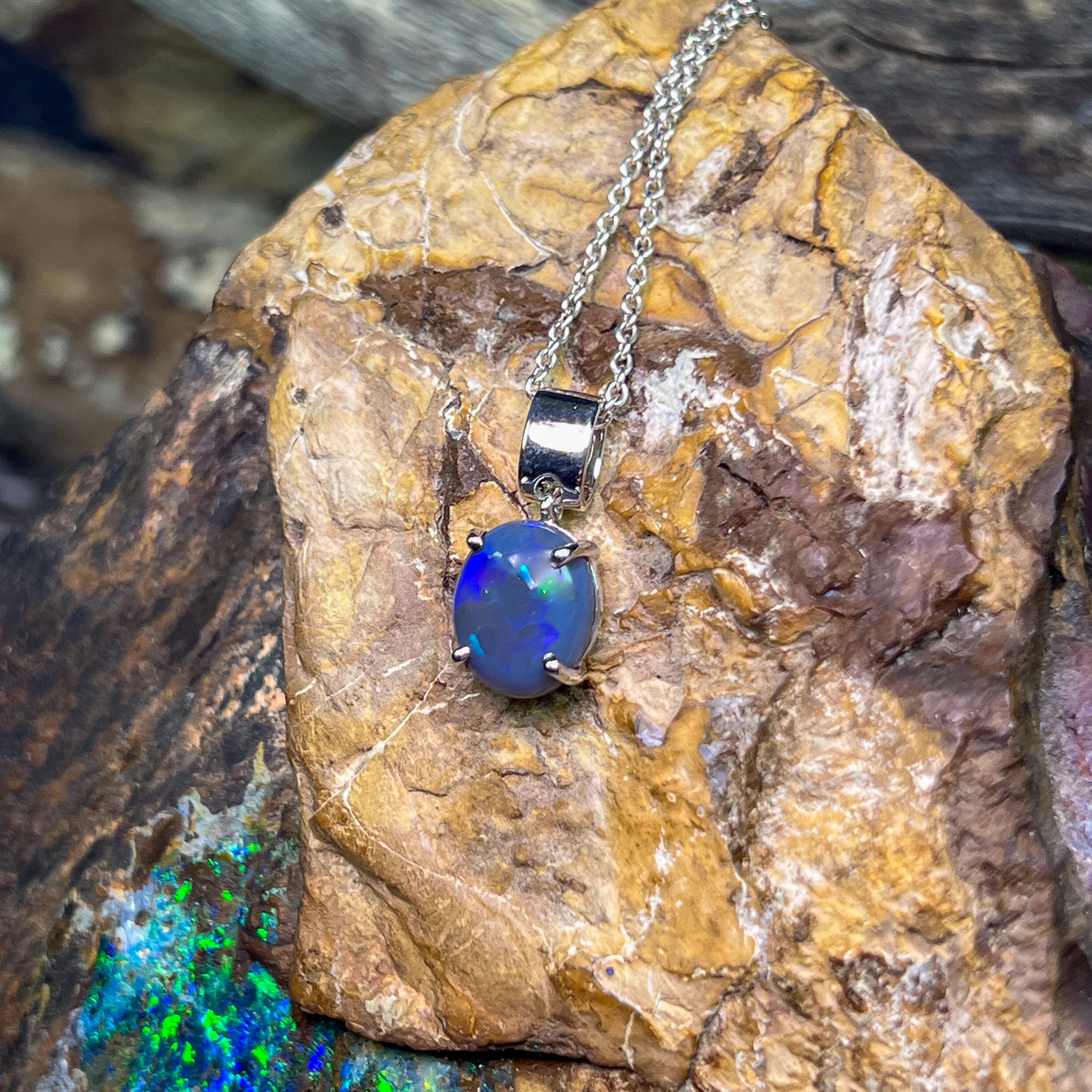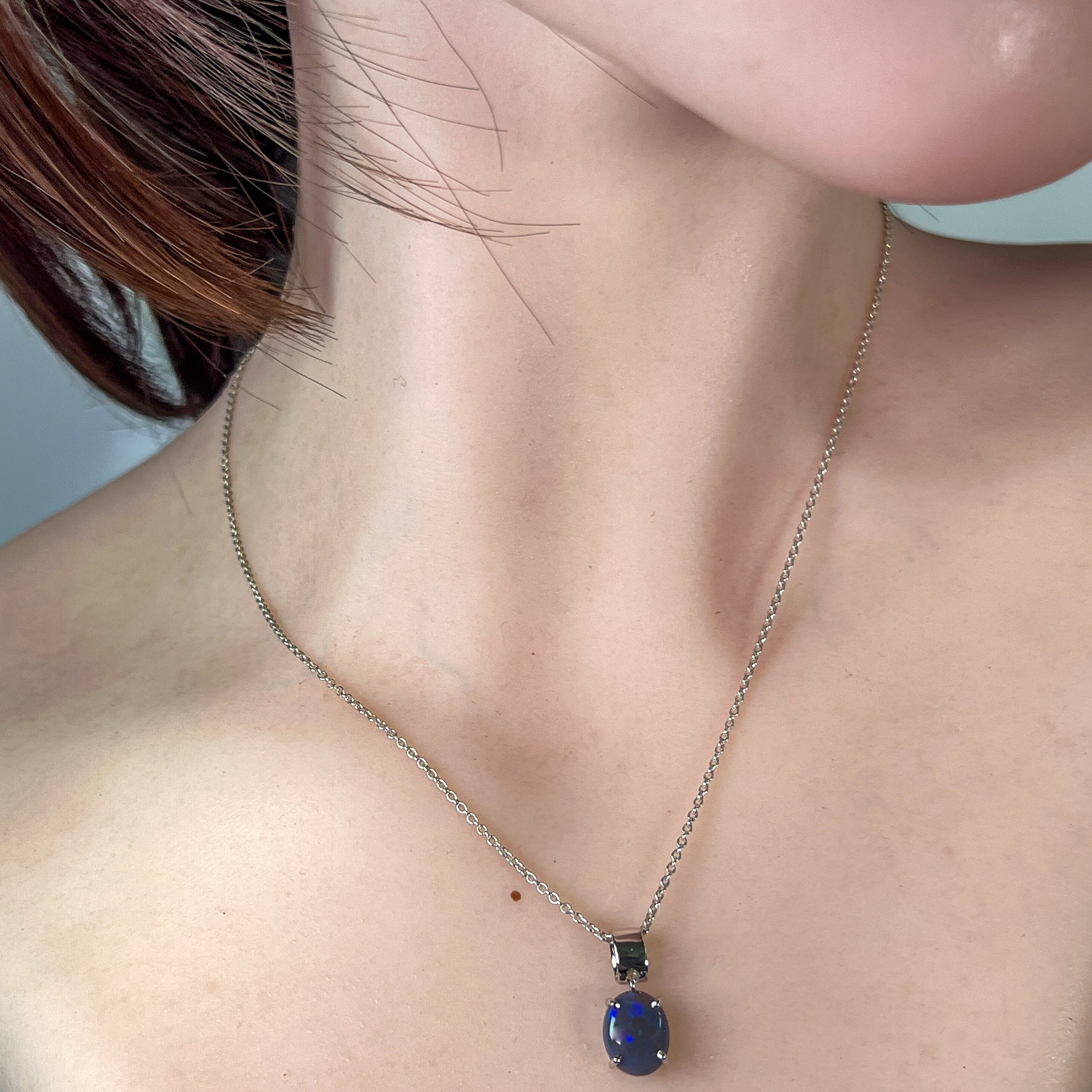 Upgrade your jewelry collection with our stunning Sterling Silver Black Opal Solitaire Pendant! This 10x8mm black opal gemstone radiates elegance and sophistication. Let the mesmerizing colors of the opal enhance your style and make a statement wherever you go. A must-have for any fashion-forward individual!