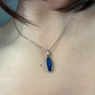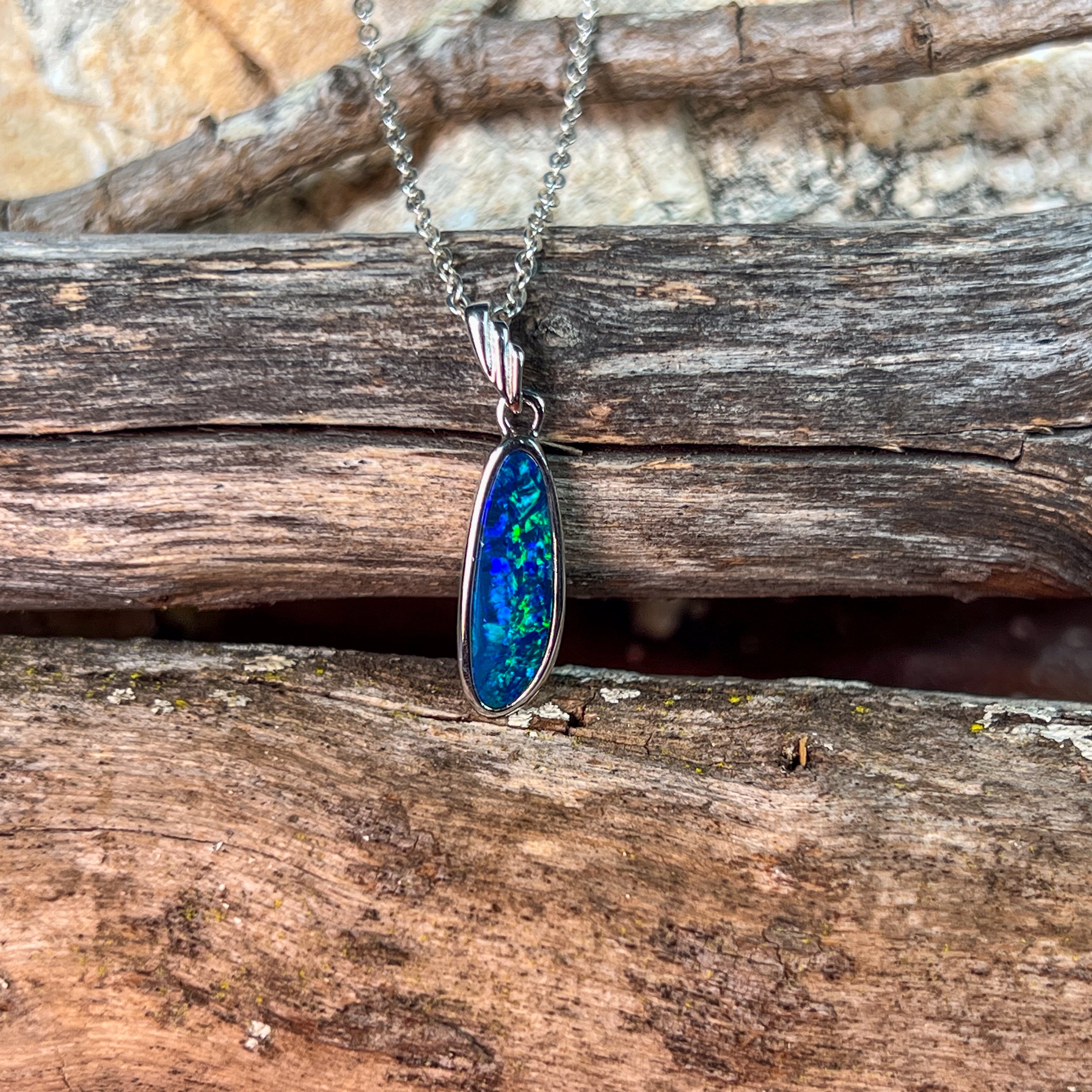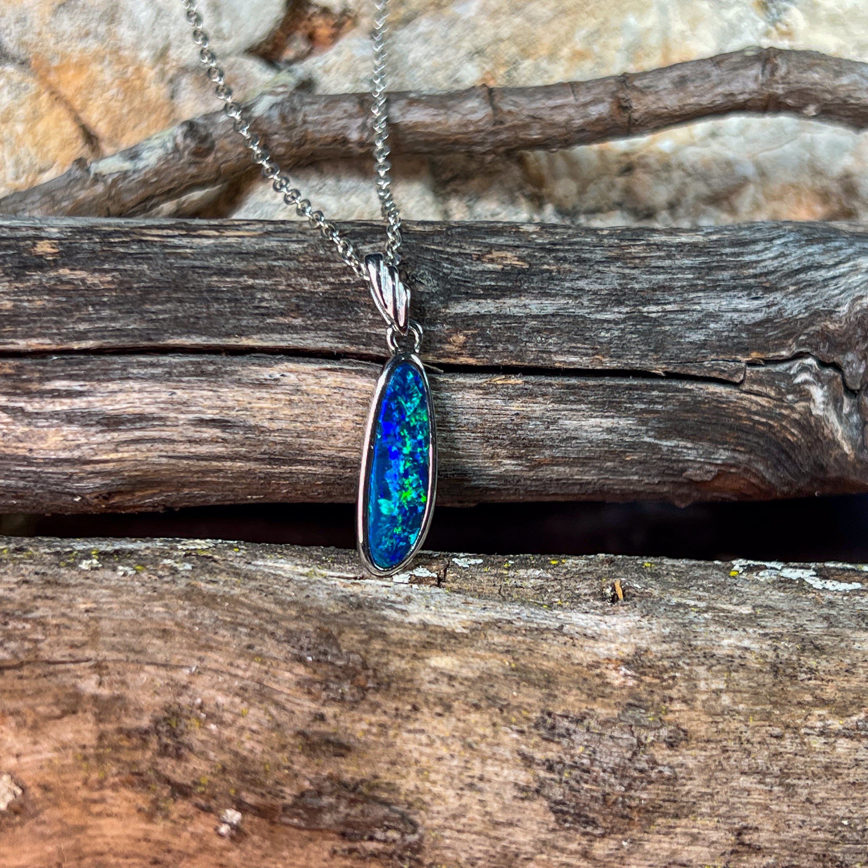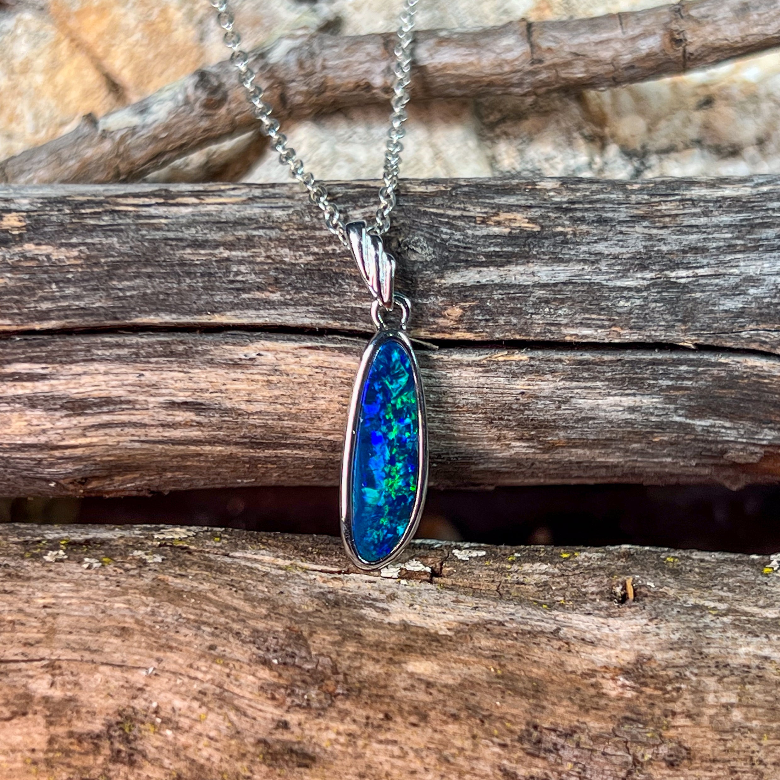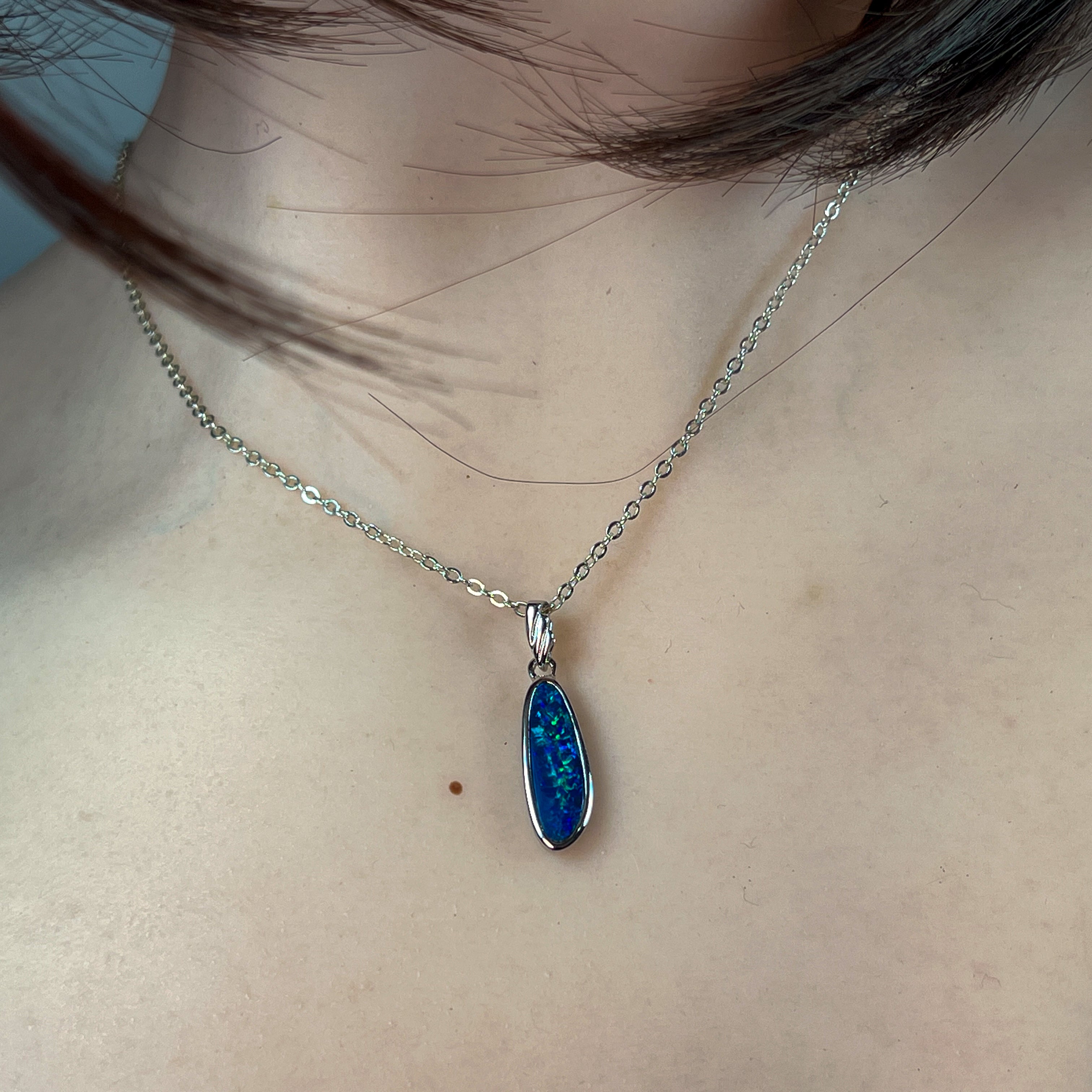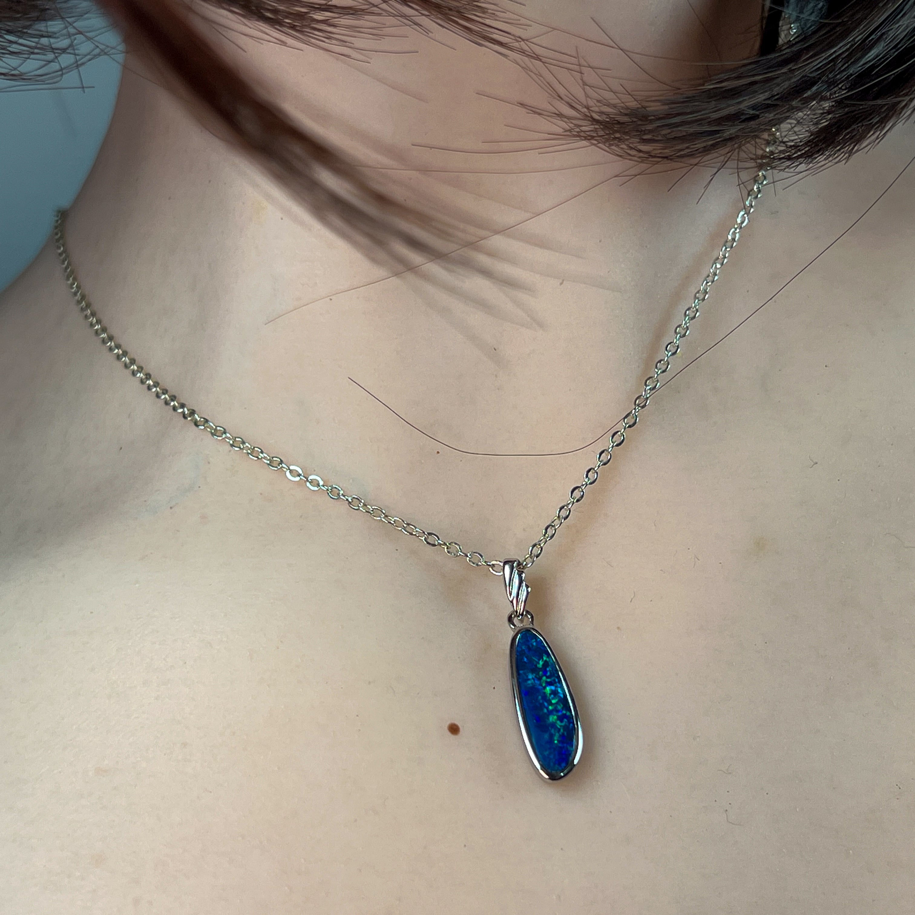 Discover the serene beauty of our Sterling Silver Blue Green Long Shape Opal Doublet Pendant. This elegant piece captures the mesmerizing ocean hues of premium opal, showcasing stunning blue and green tones that shift with every movement. Expertly crafted in lustrous sterling silver, the elongated design creates a sophisticated silhouette that flatters any neckline. Perfect for those seeking a statement piece that combines natural gemstone allure with timeless craftsmanship. An investment in wearable art that transforms any outfit into something extraordinary.