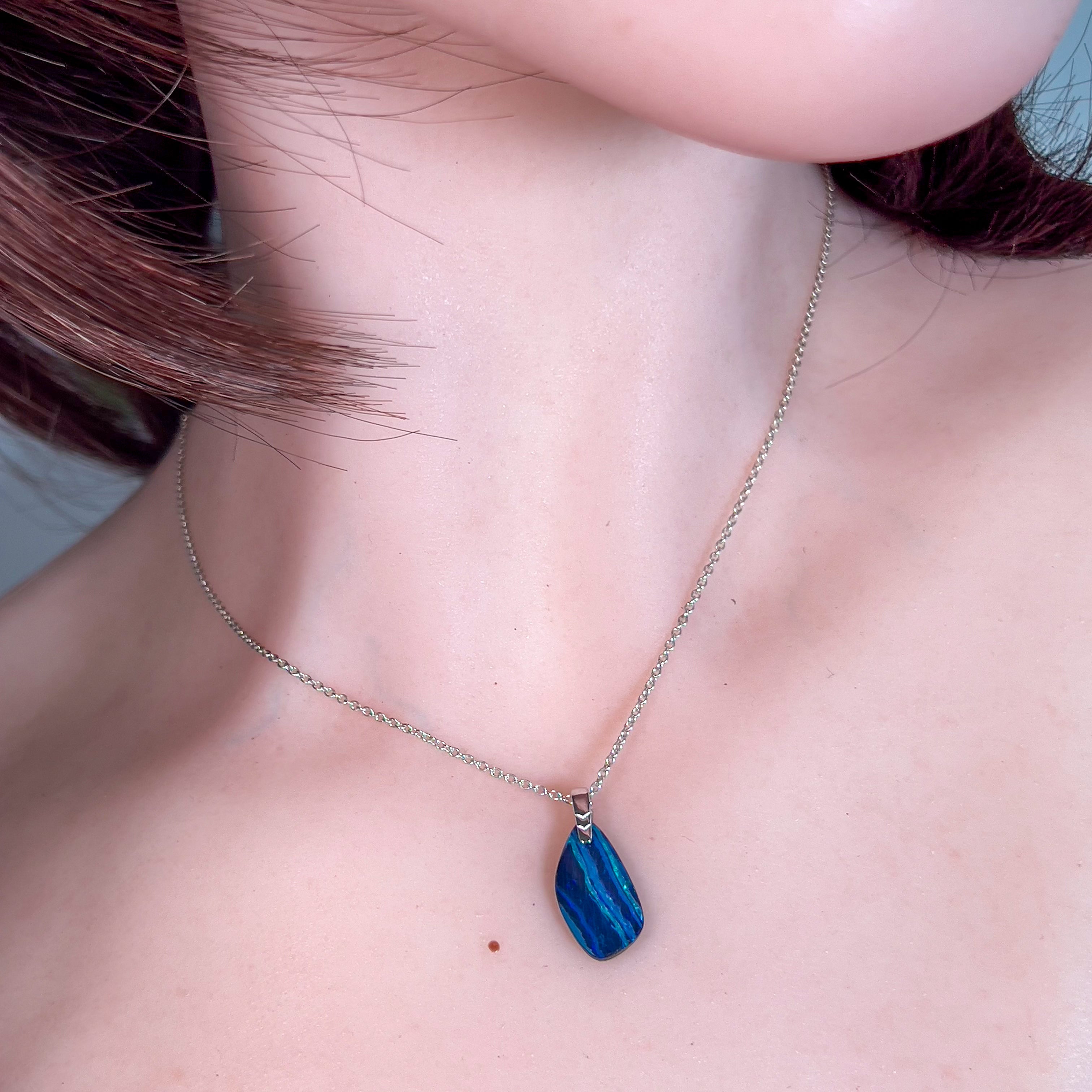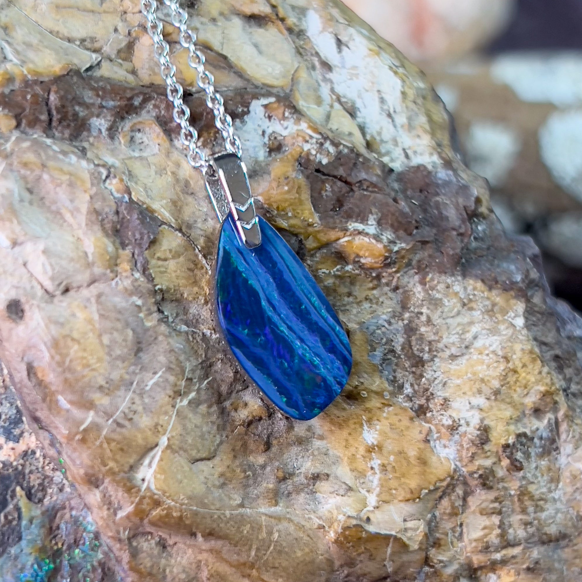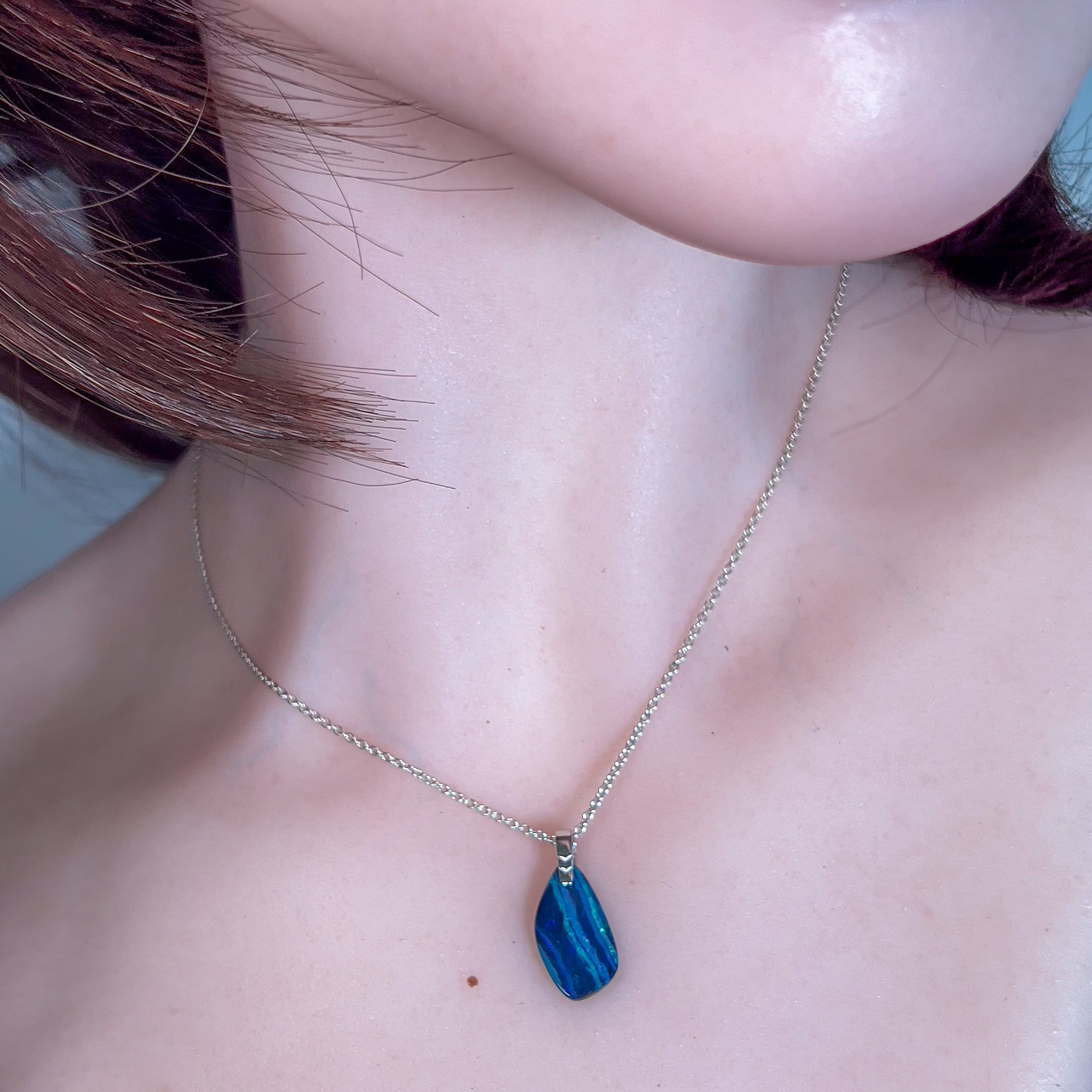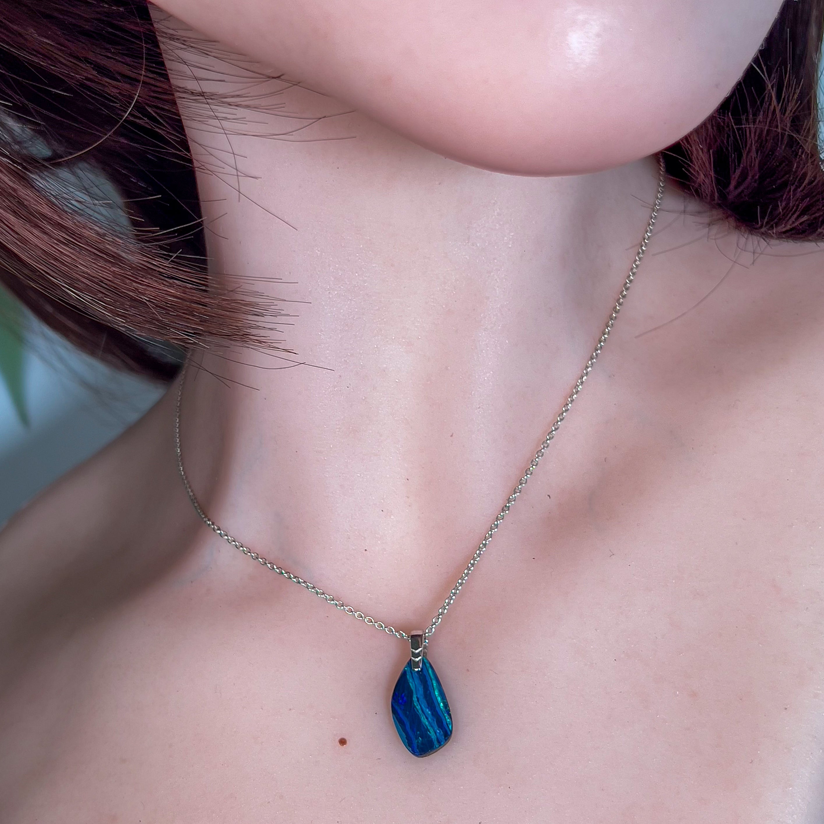 Add some sparkle and sophistication to your collection with our Sterling Silver Blue stripe pattern Opal doublet pattern. The unique stripe pattern adds a touch of elegance, while the stunning opal doublet reflects a mesmerizing array of colors. Elevate any outfit and make a statement with this must-have piece.
