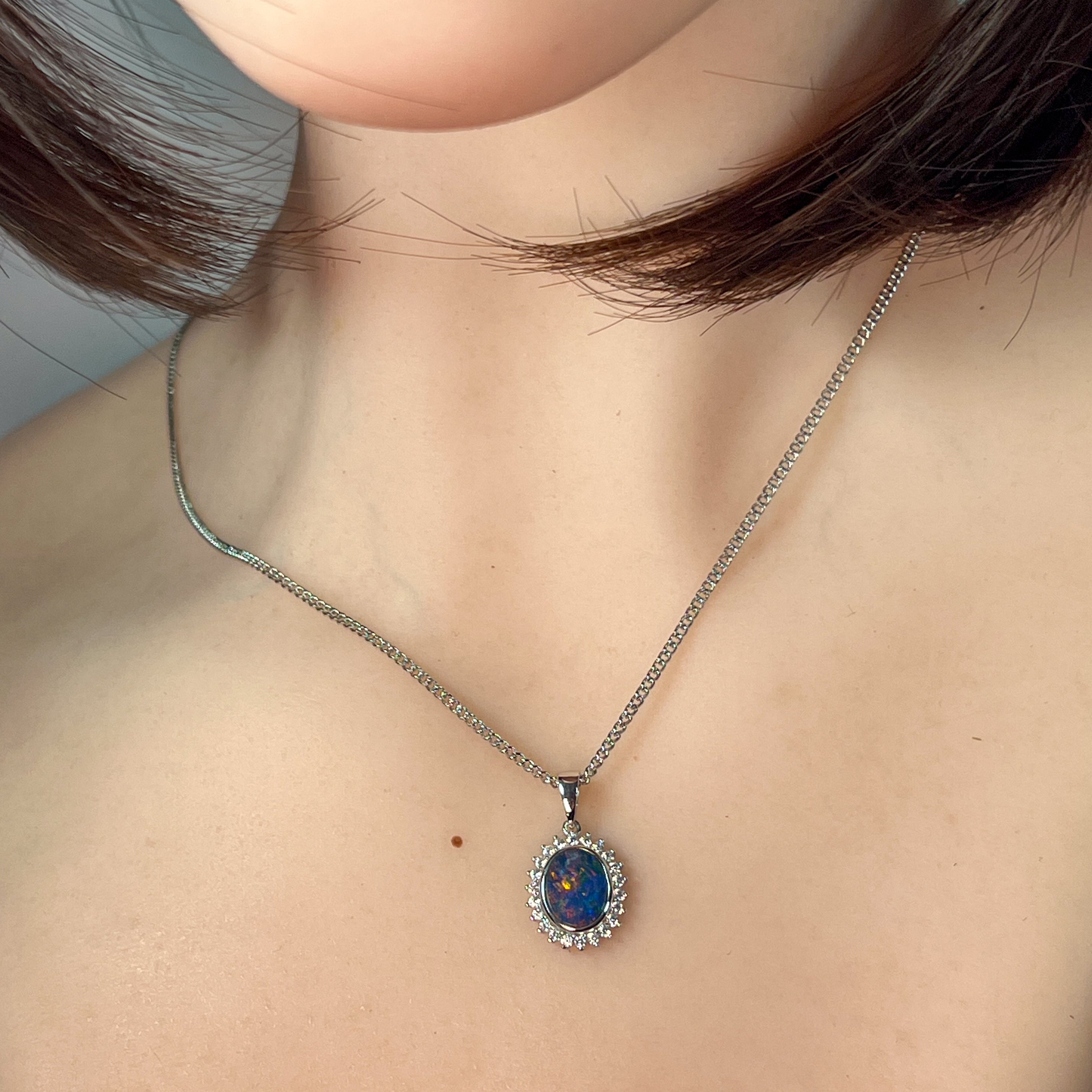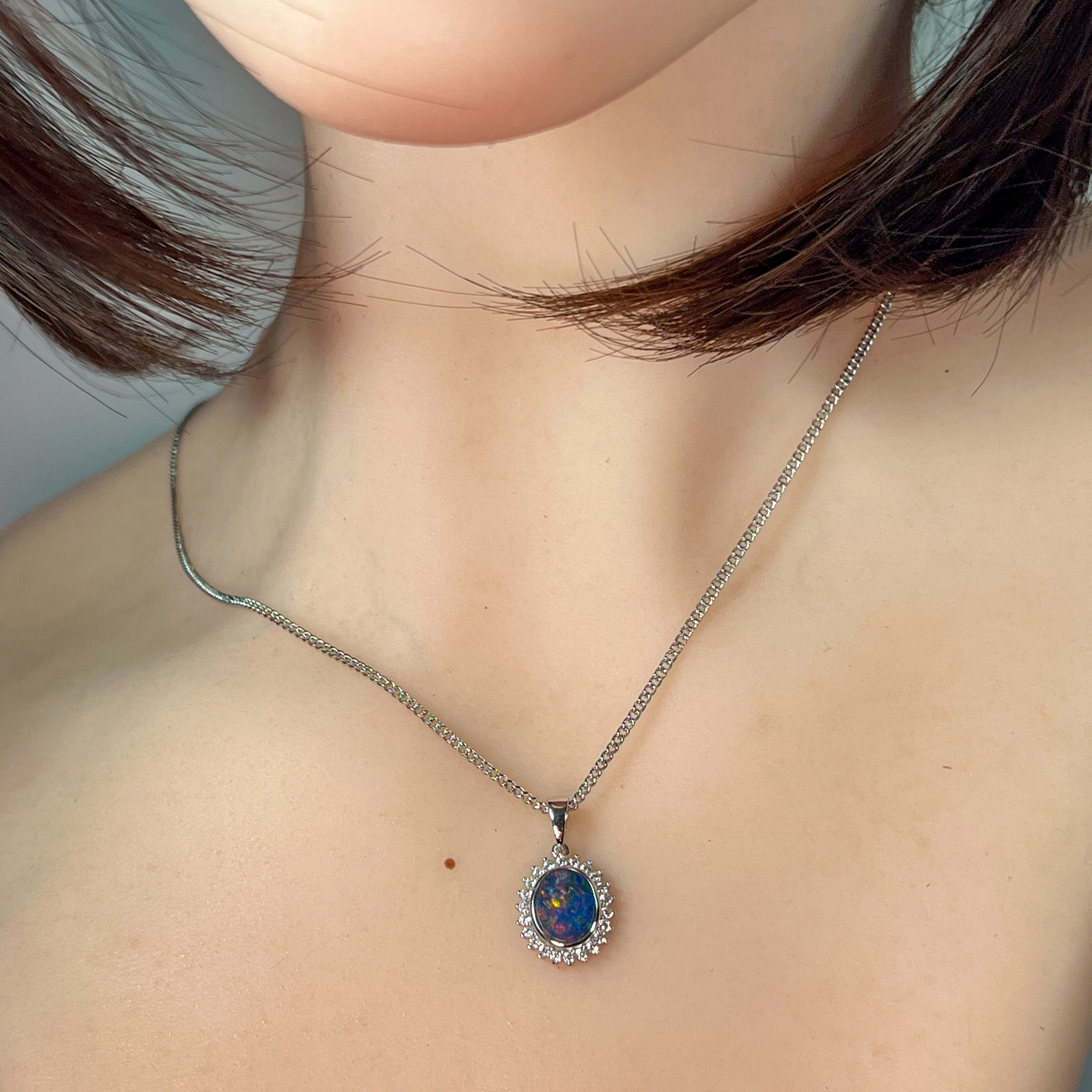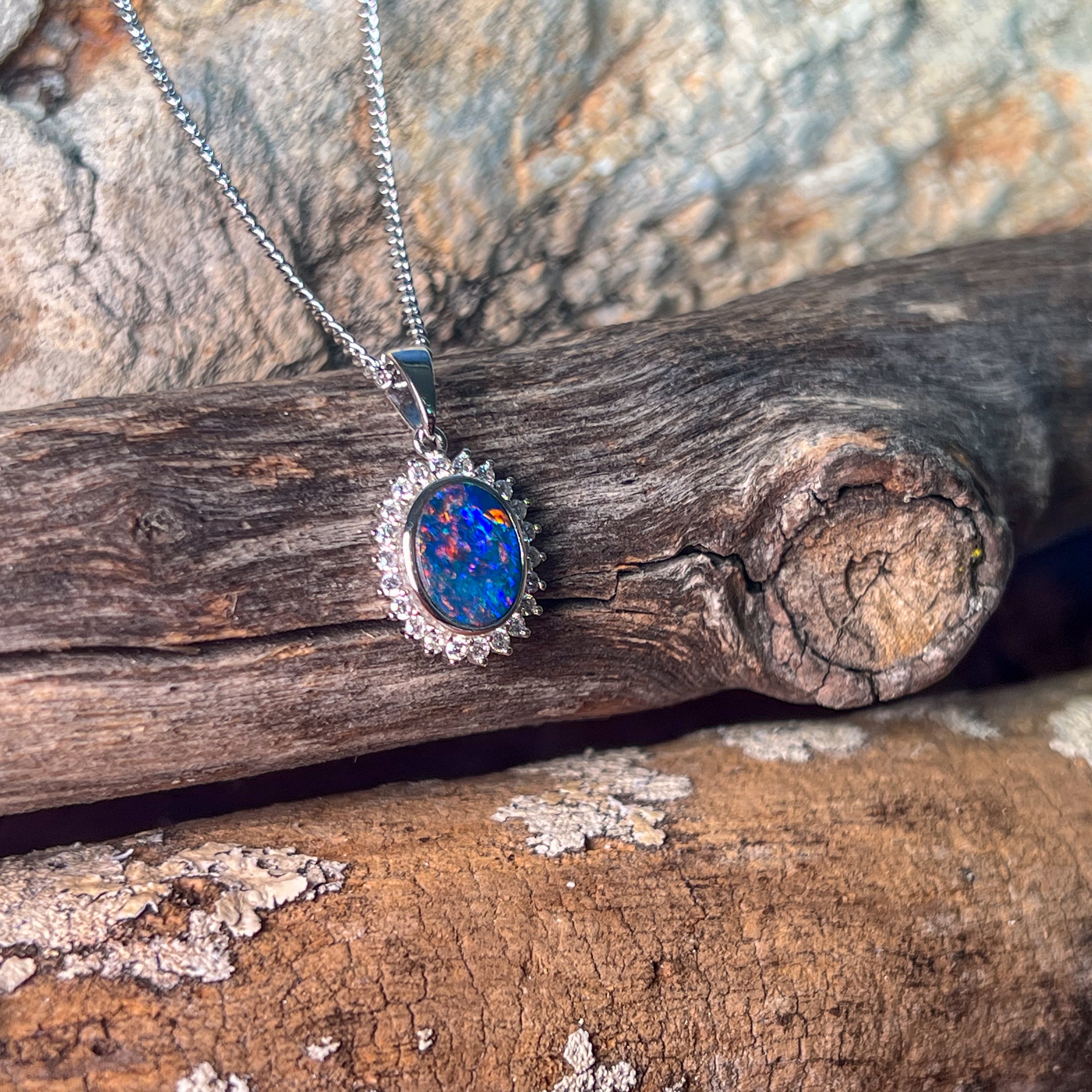 Elevate your elegance with this sterling silver pendant featuring a classic cluster design. The 9x7mm opal doublet showcases mesmerizing blue and red hues, capturing light with every movement. Perfectly crafted to add a refined touch to any ensemble, this pendant blends timeless