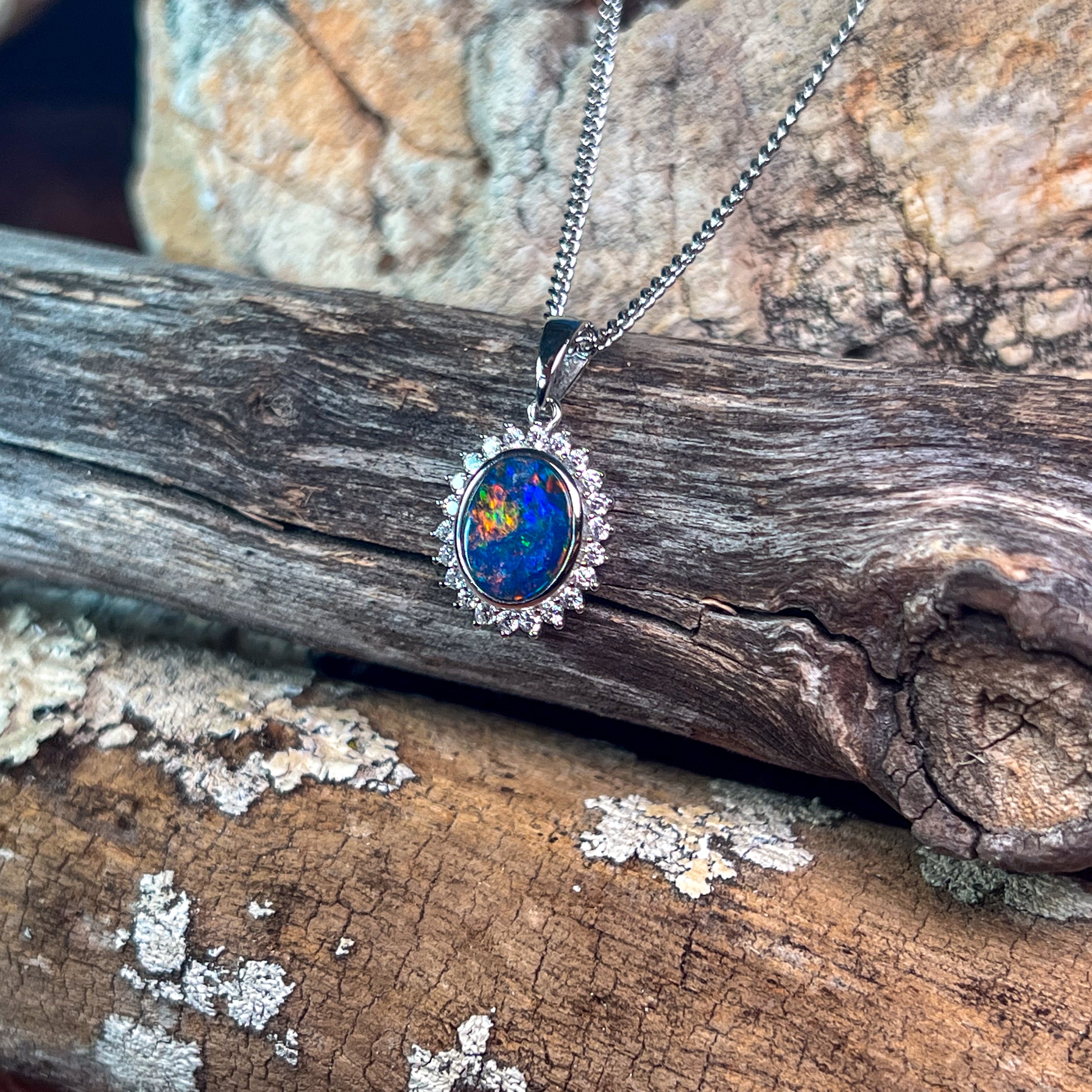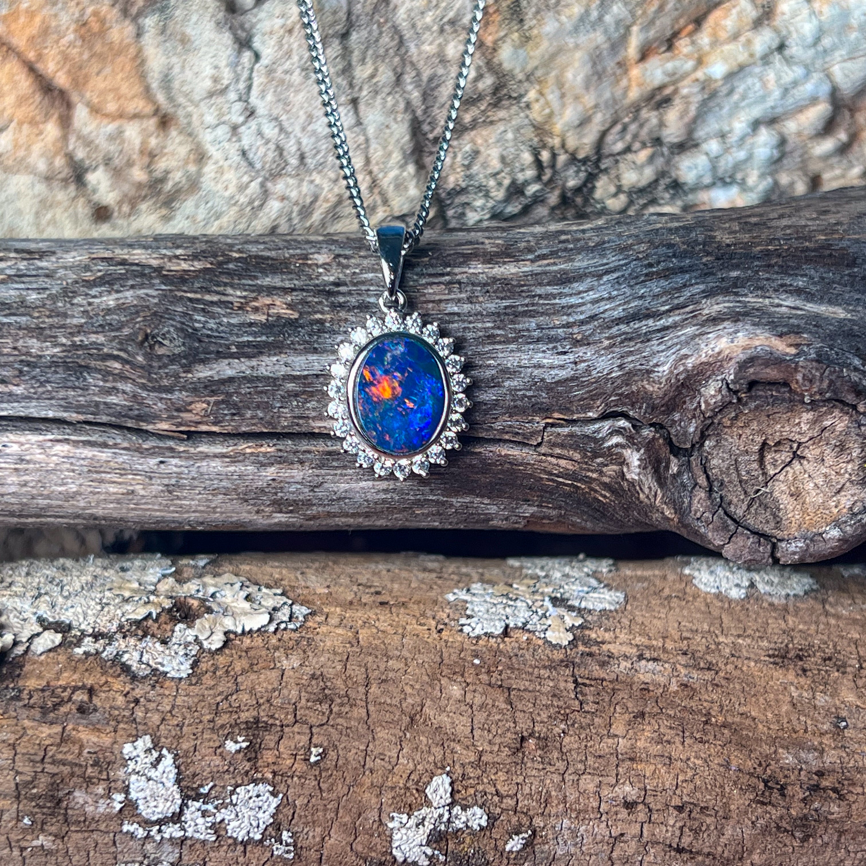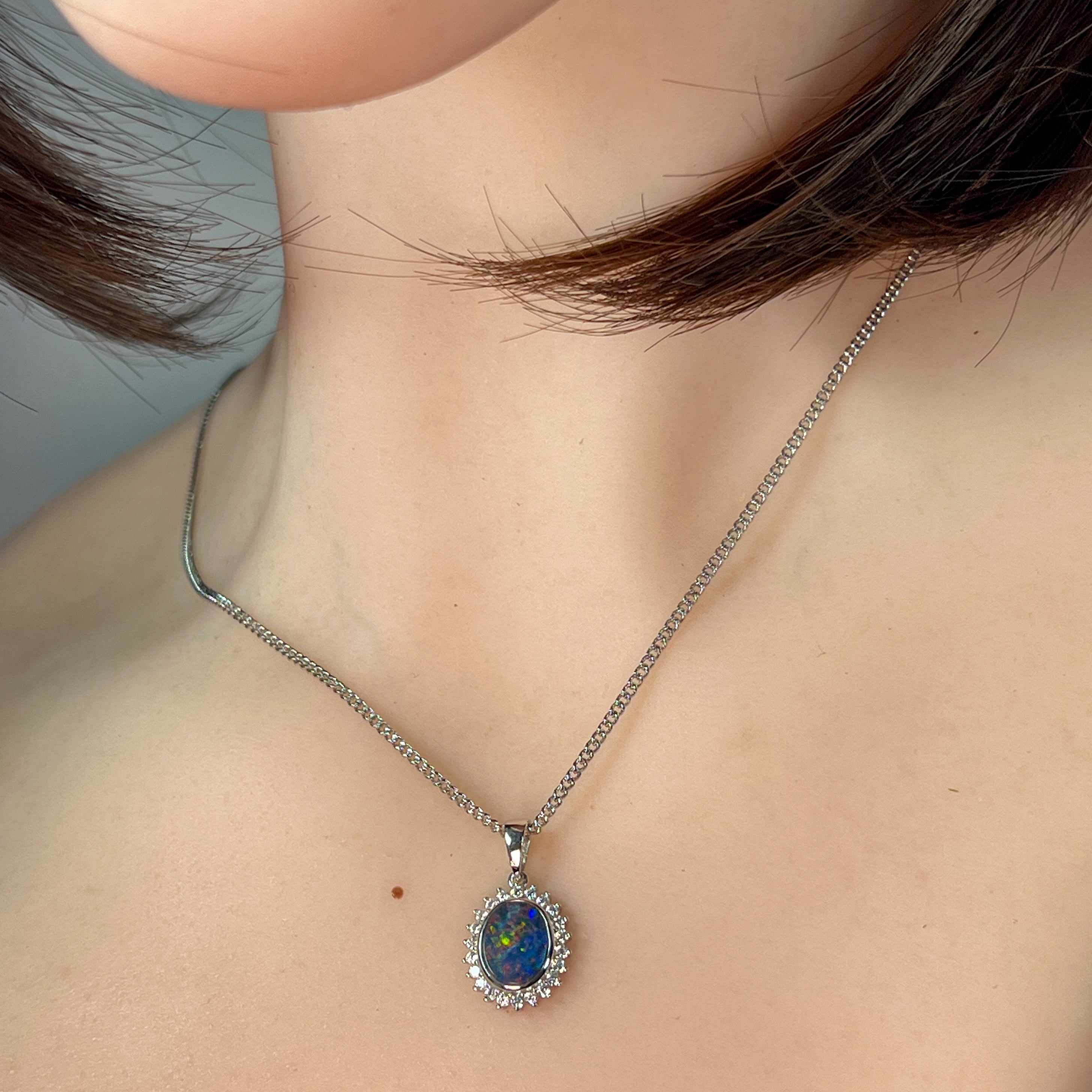 Elevate your elegance with this sterling silver pendant featuring a classic cluster design. The 9x7mm opal doublet showcases mesmerizing blue and red hues, capturing light with every movement. Perfectly crafted to add a refined touch to any ensemble, this pendant blends timeless