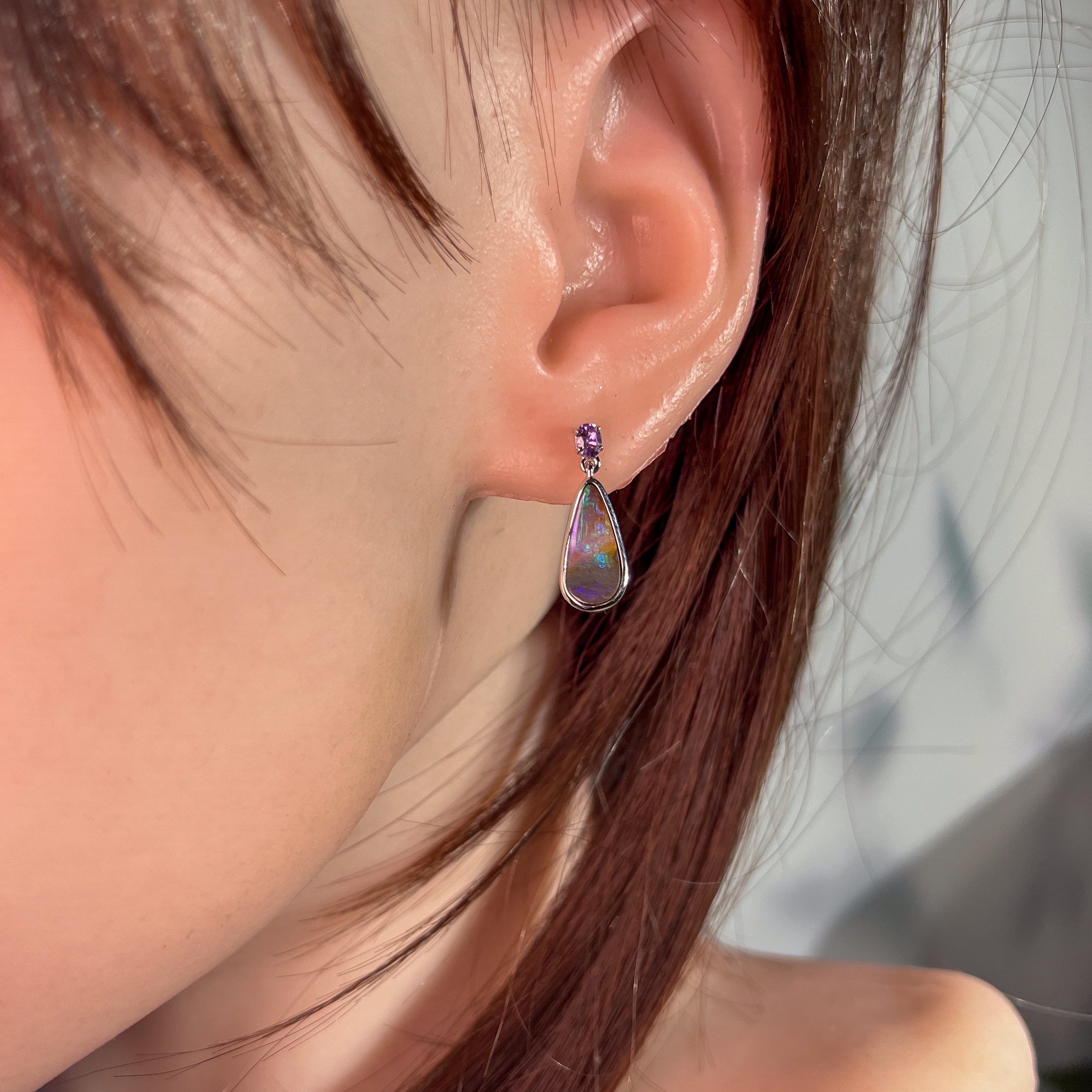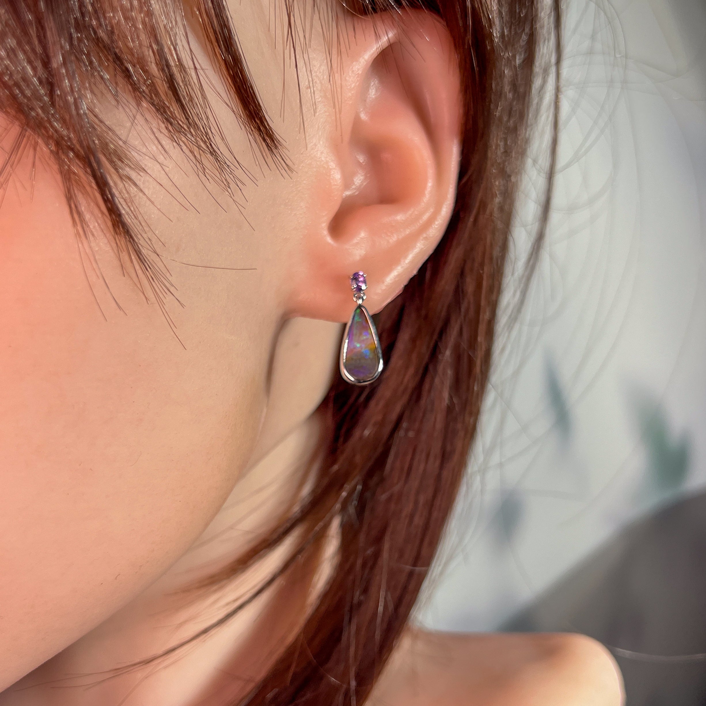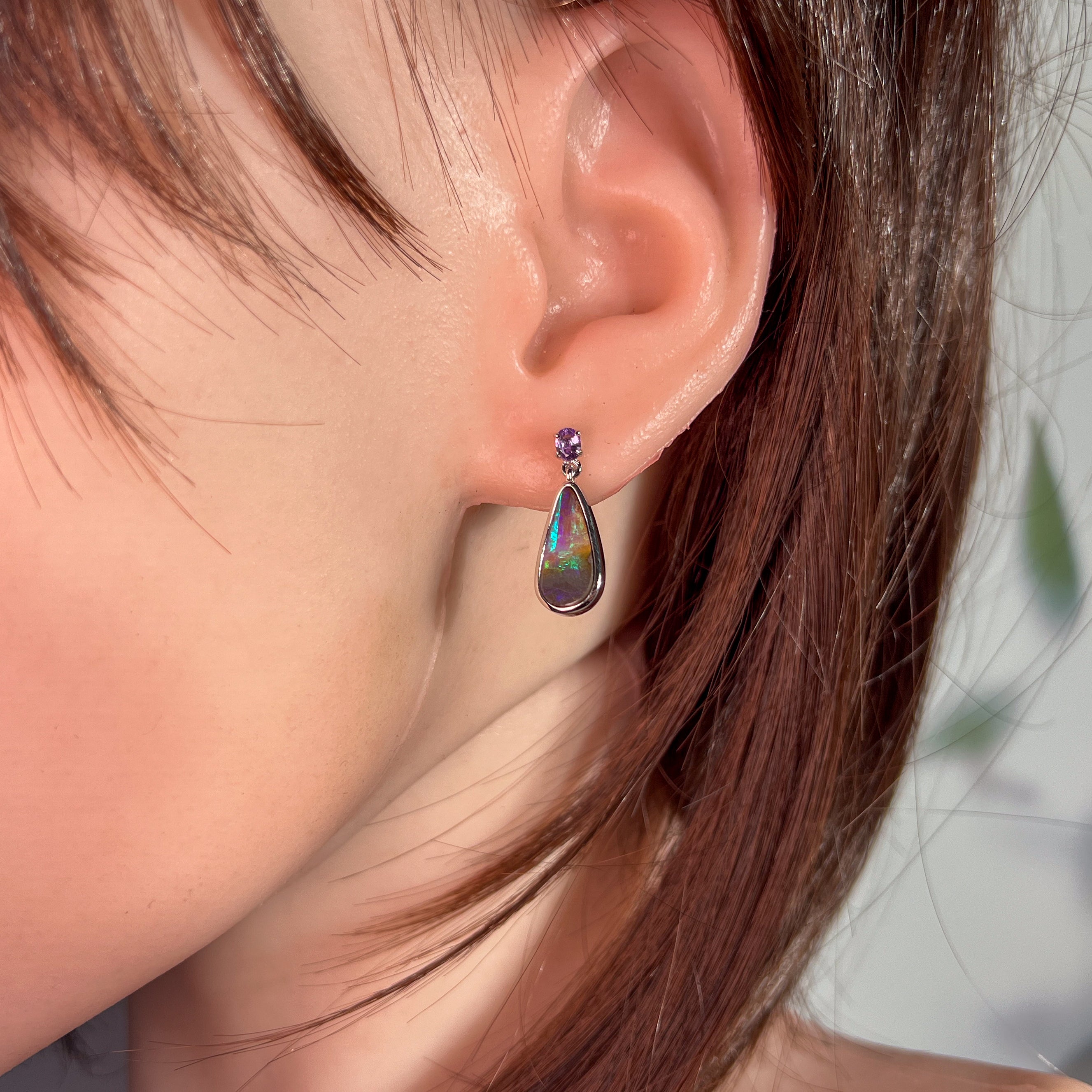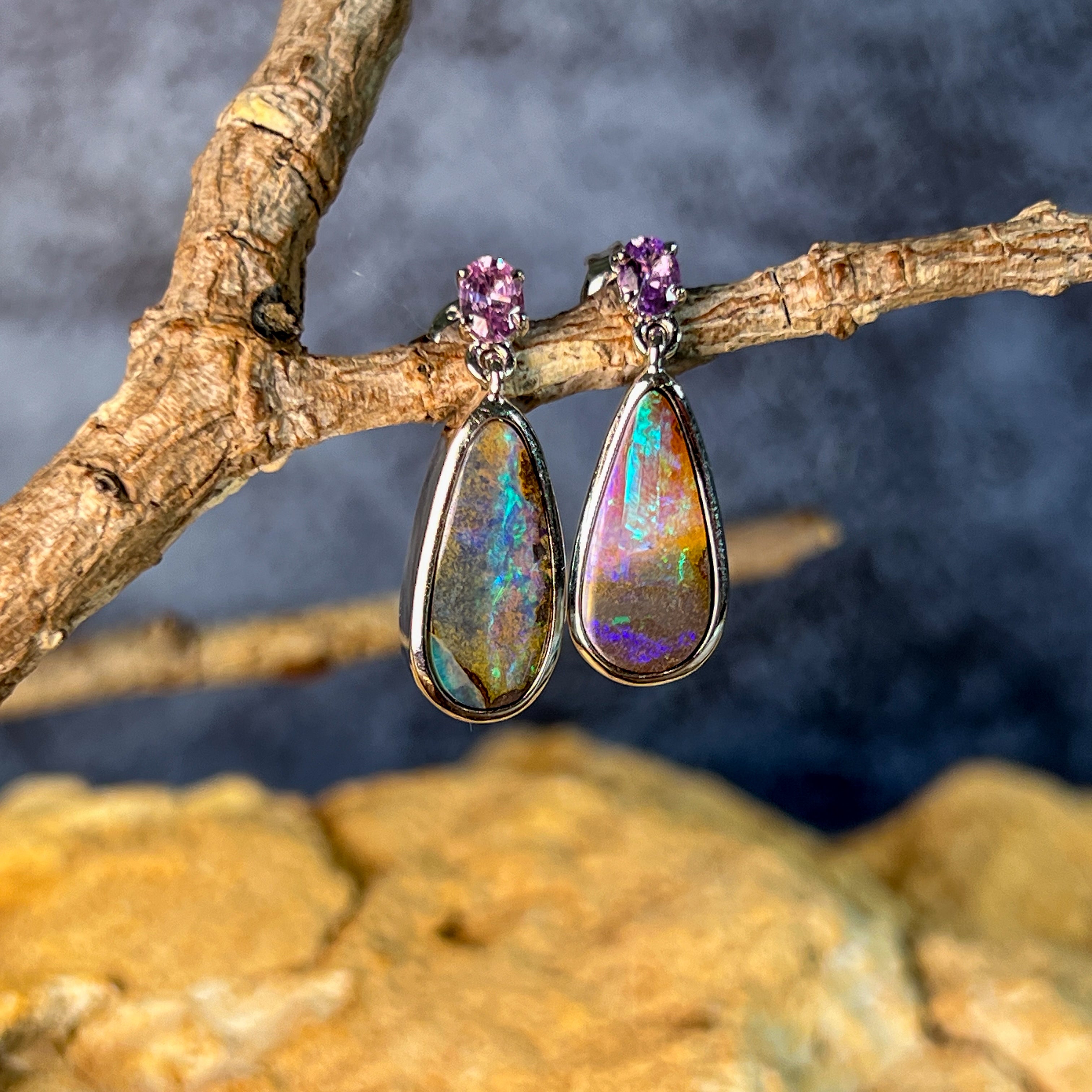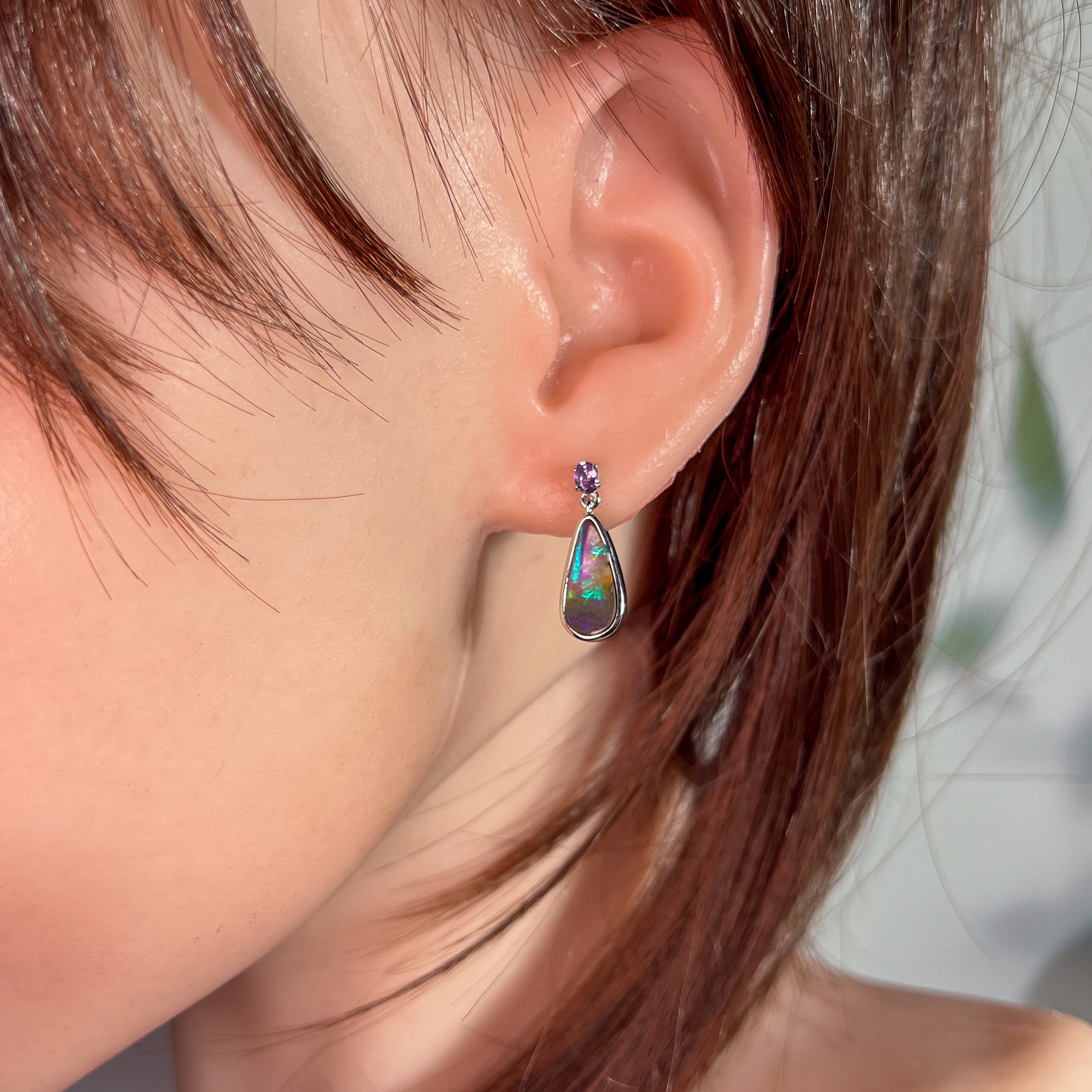 Expertly crafted with sterling silver, these dangling earrings feature stunning boulder opals in a rich lilac hue. Complementing the opals are vibrant amethyst stones, creating a unique and elegant look. Elevate any outfit with these exquisite earrings that showcase the beauty of natural gemstones.