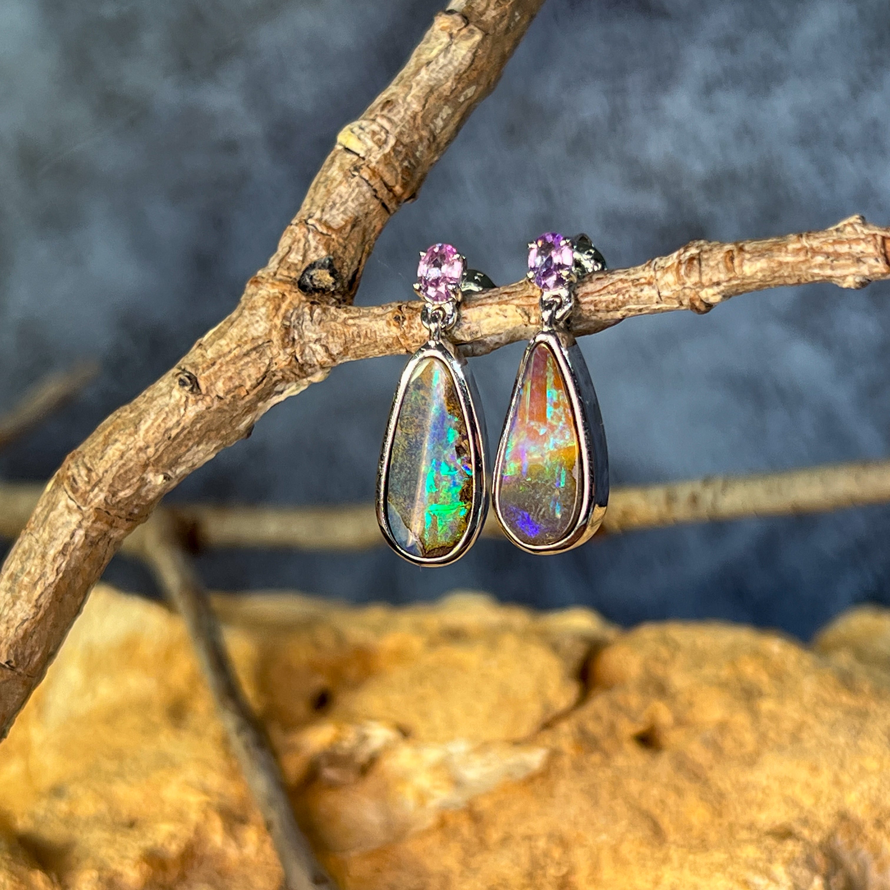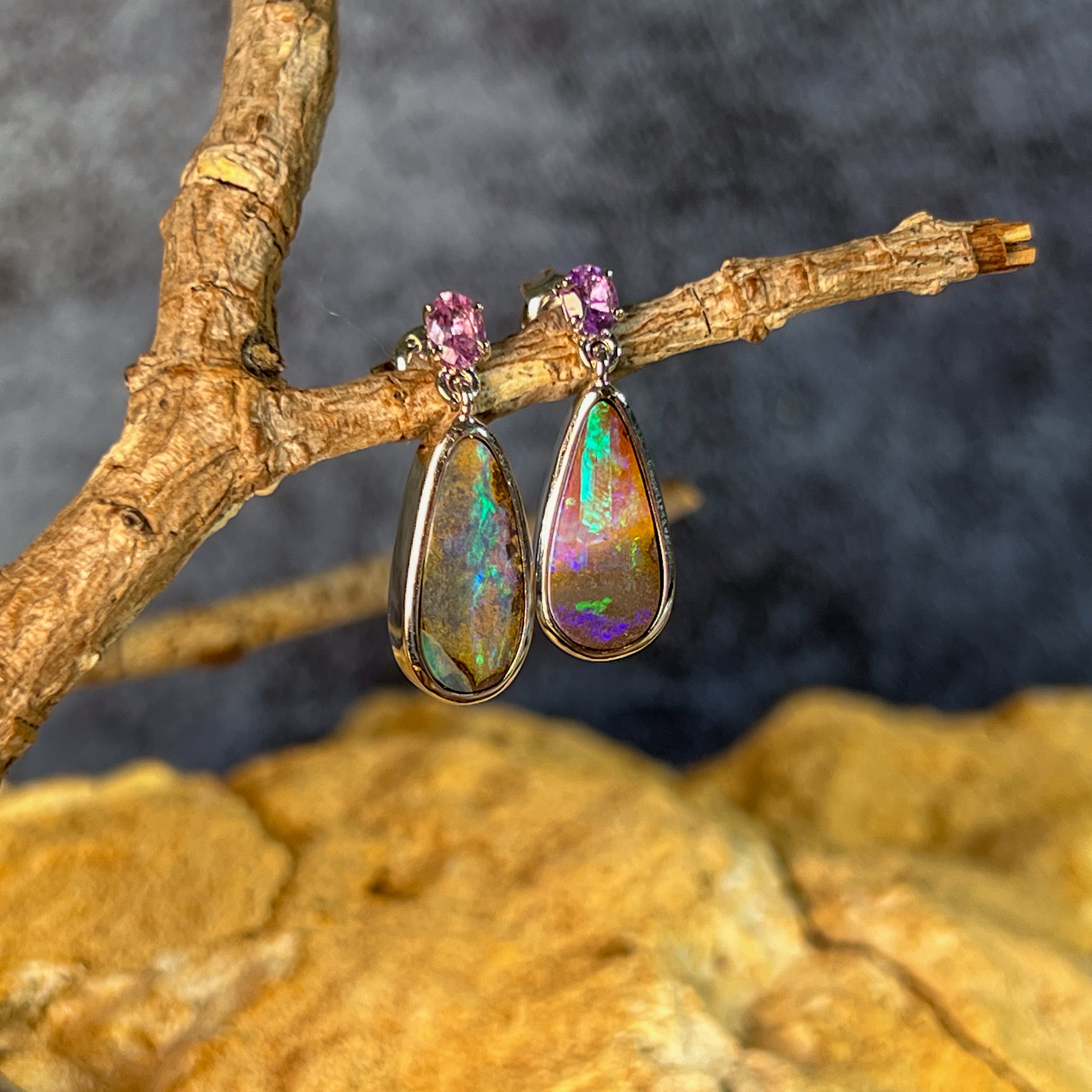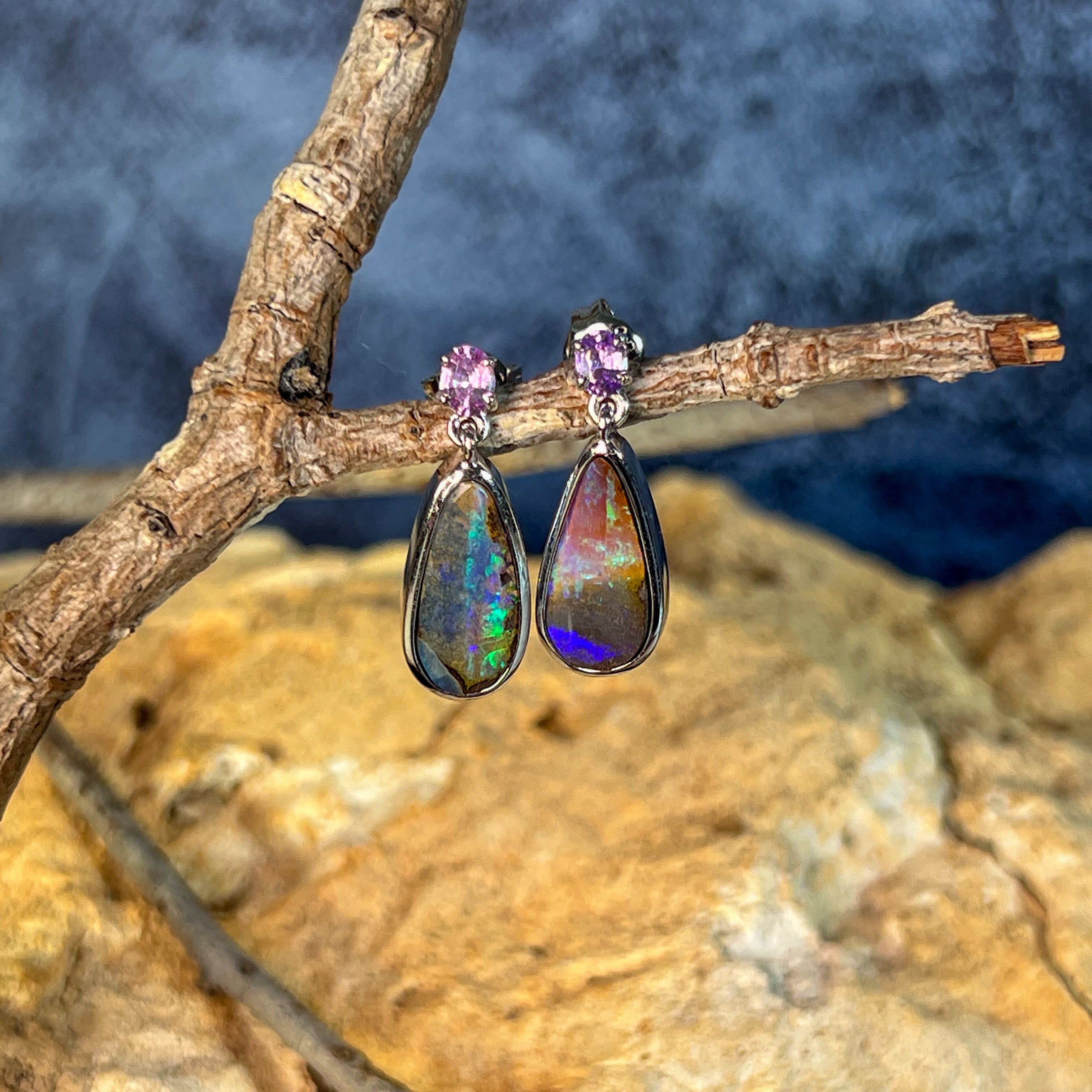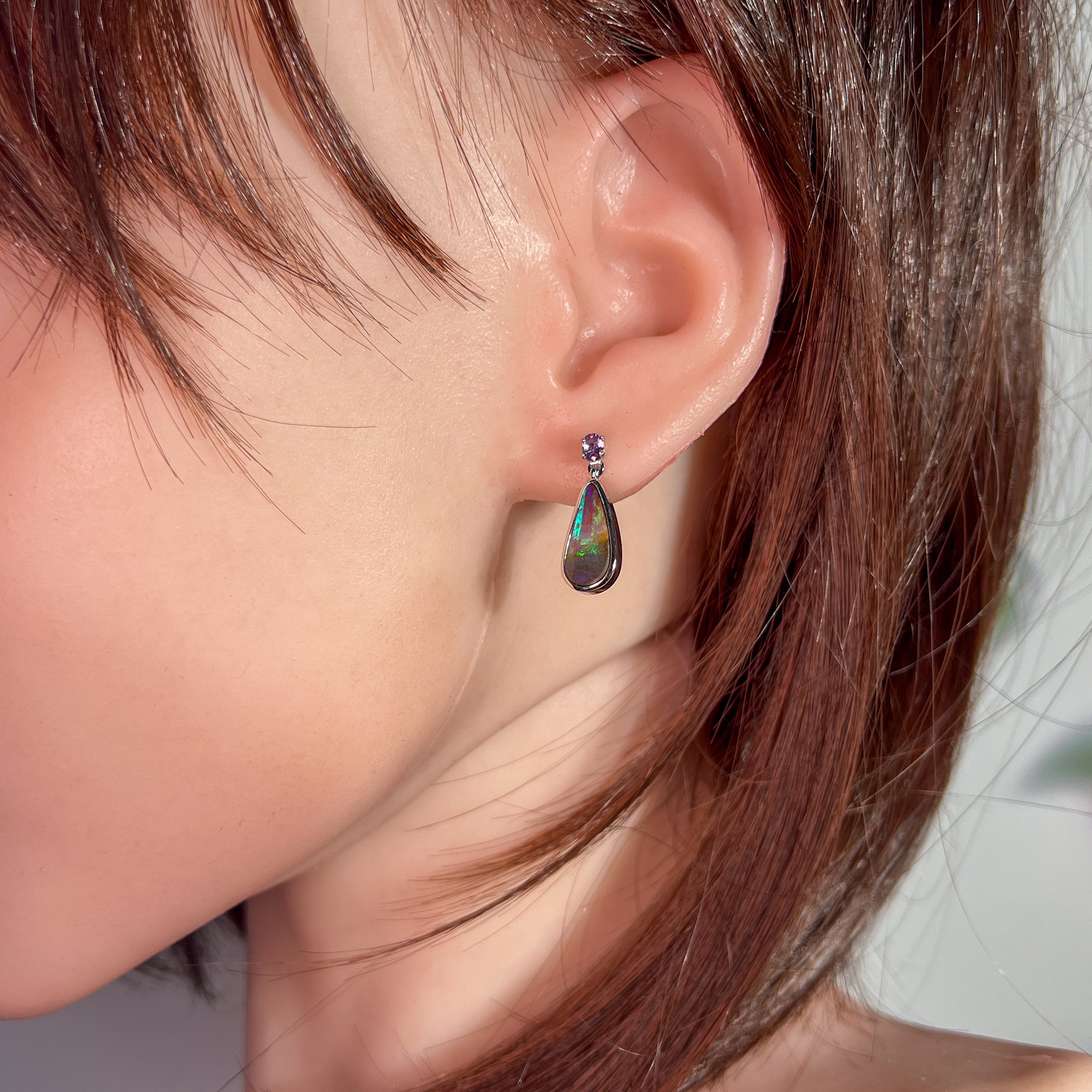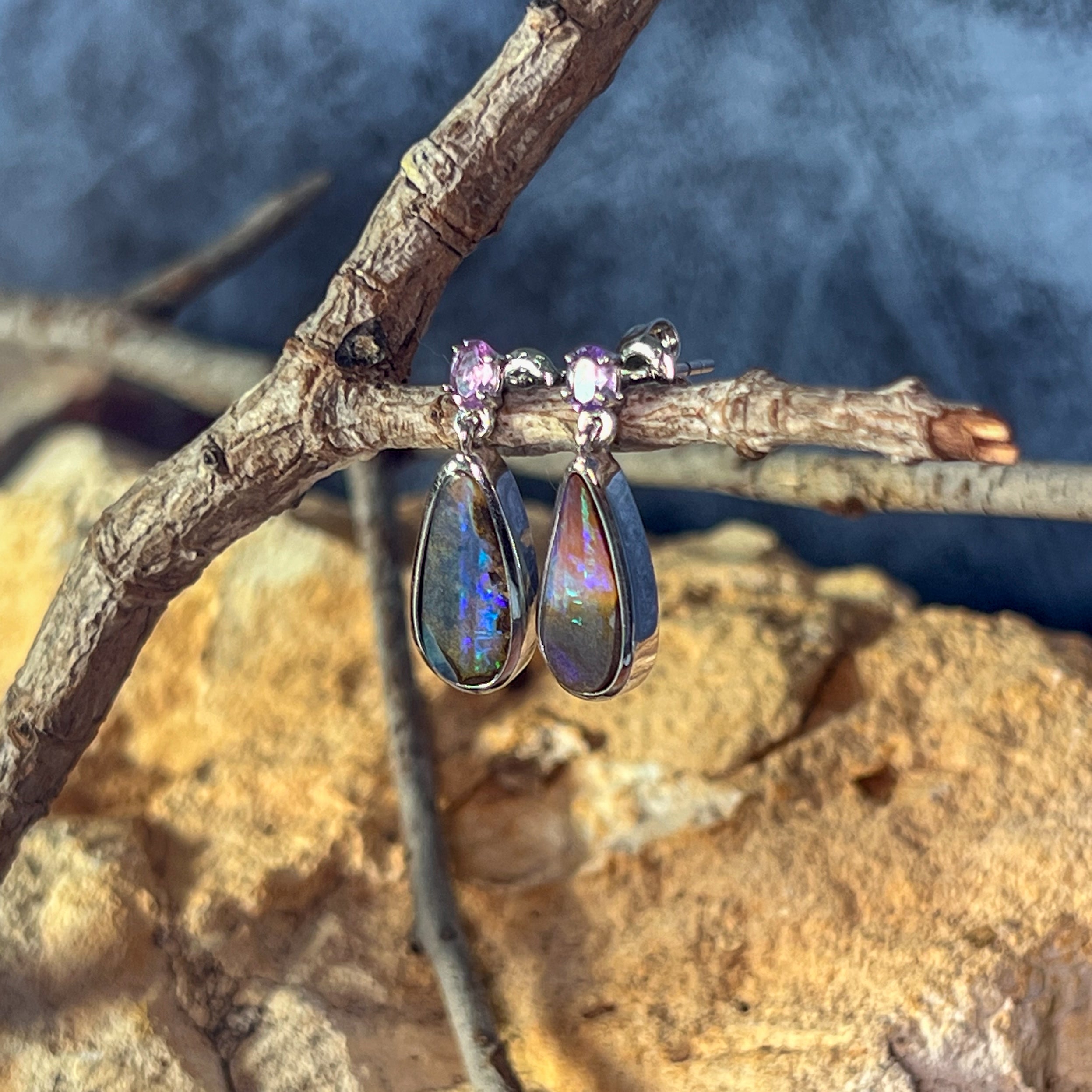 Expertly crafted with sterling silver, these dangling earrings feature stunning boulder opals in a rich lilac hue. Complementing the opals are vibrant amethyst stones, creating a unique and elegant look. Elevate any outfit with these exquisite earrings that showcase the beauty of natural gemstones.