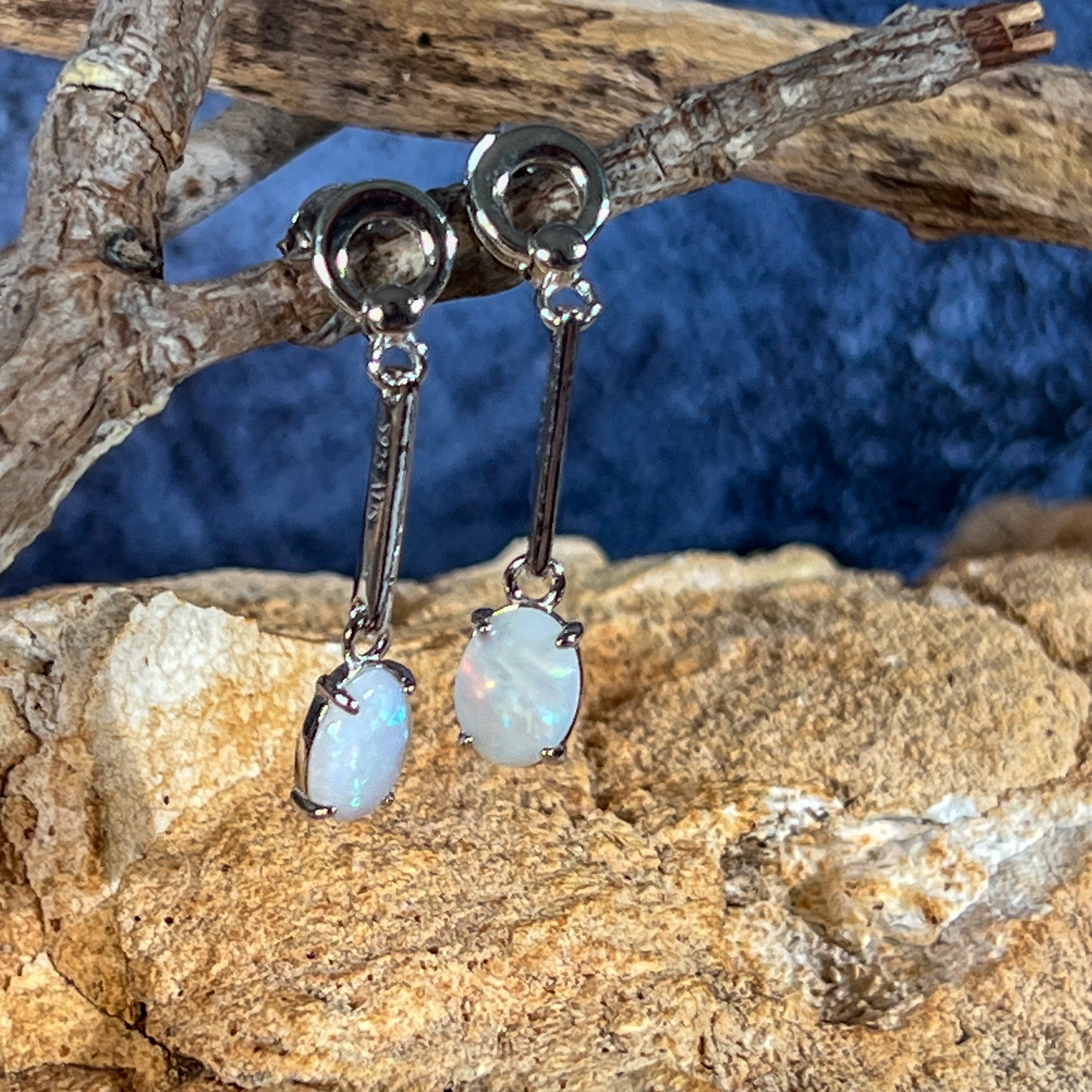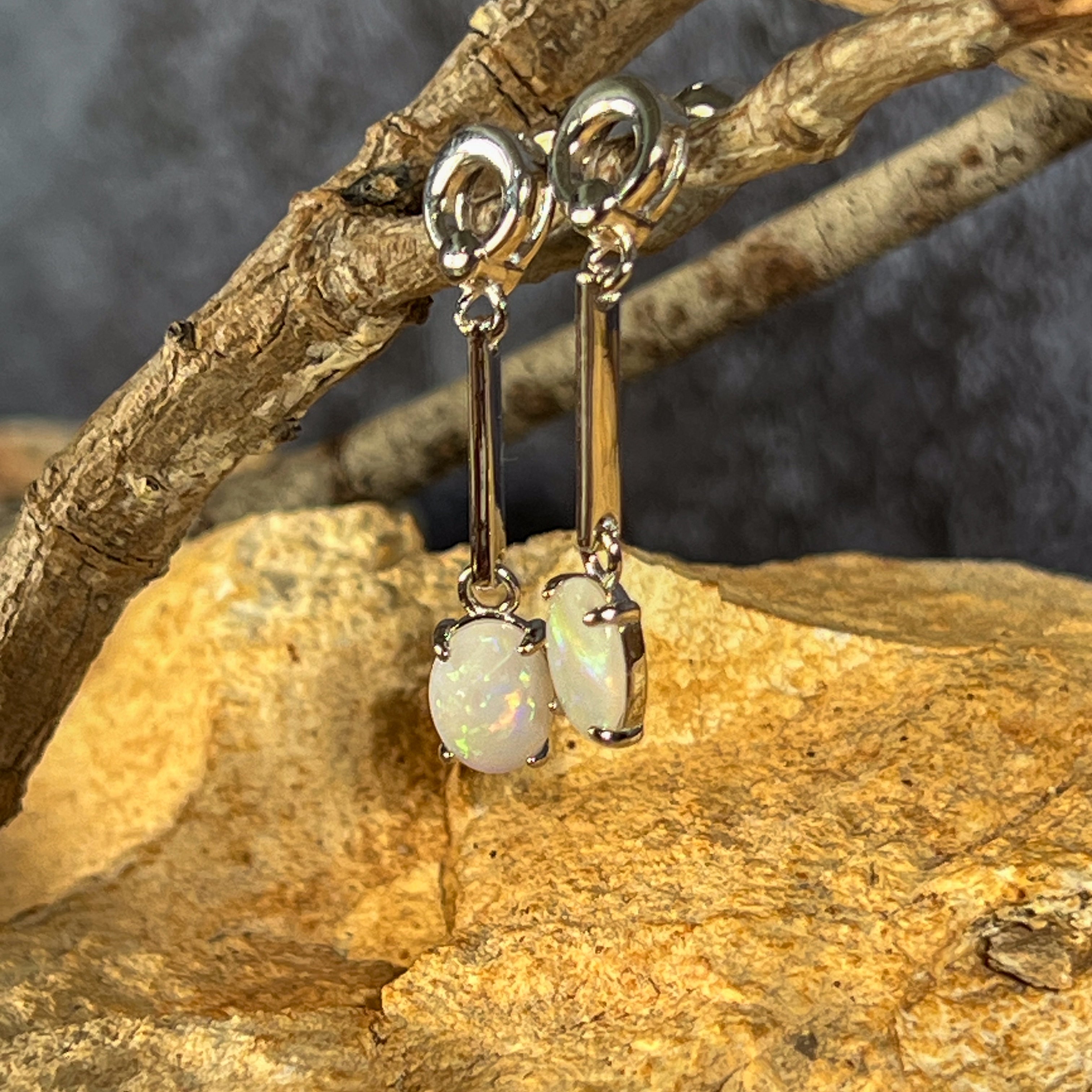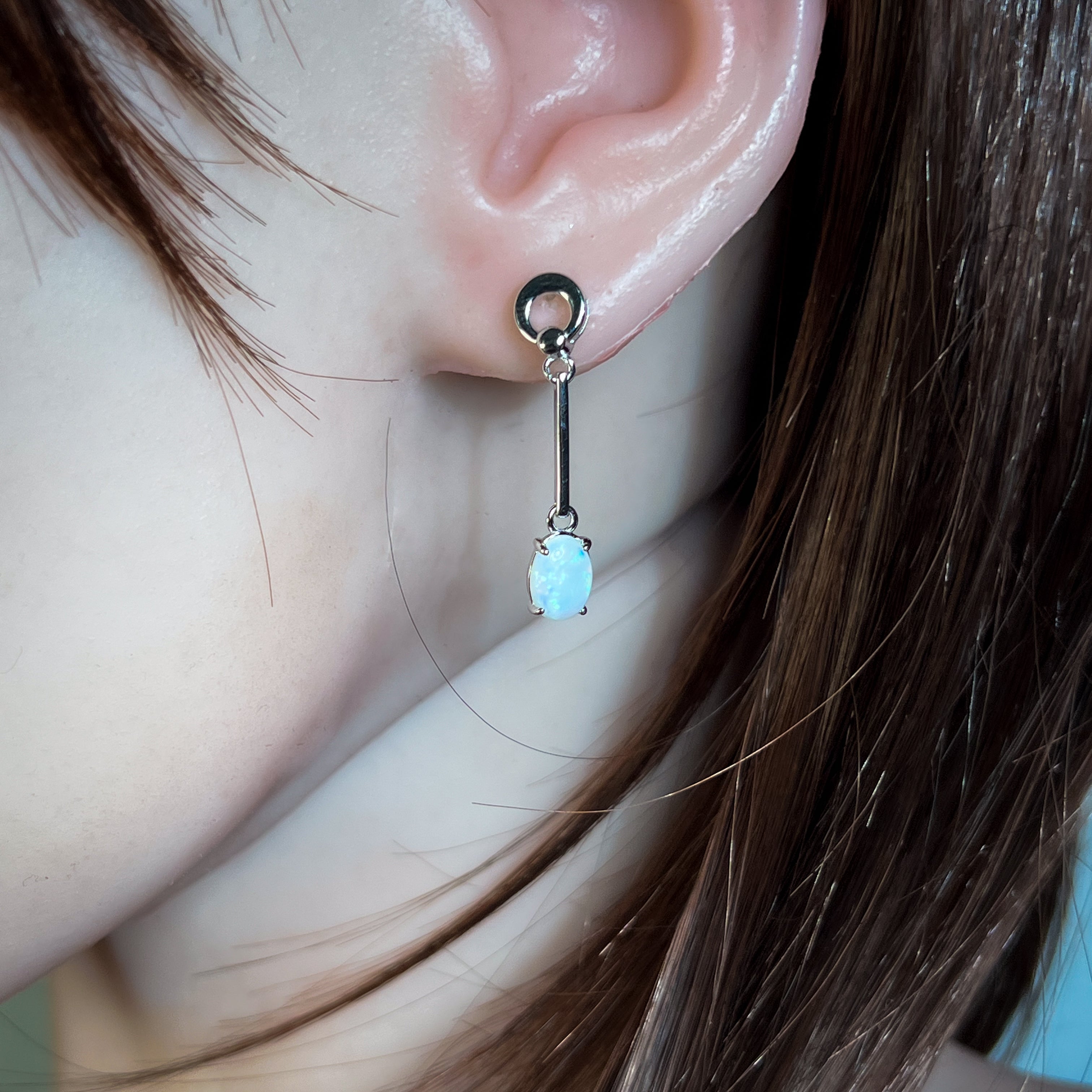 These elegant Sterling Silver opal dangle earrings make the perfect gift for her. Featuring 8x6mm White Opals in a delicate bar style setting, they add a touch of sophistication to any outfit. Show your loved one you care with this timeless and stylish piece.