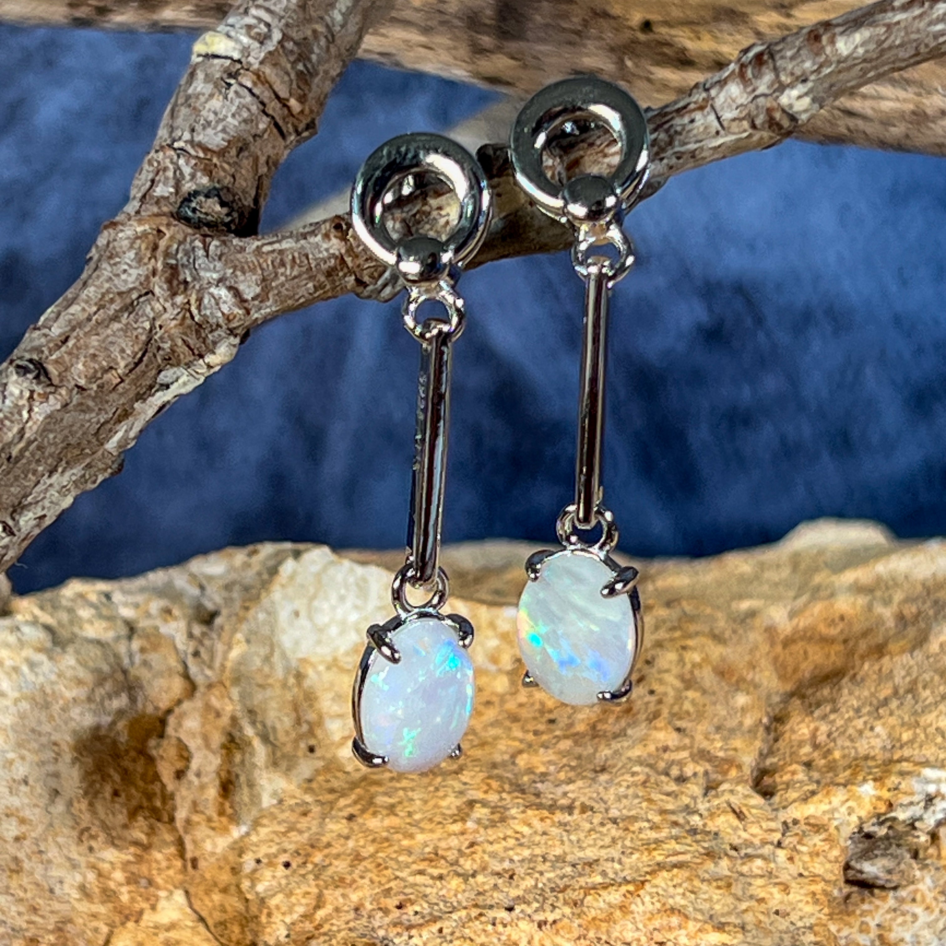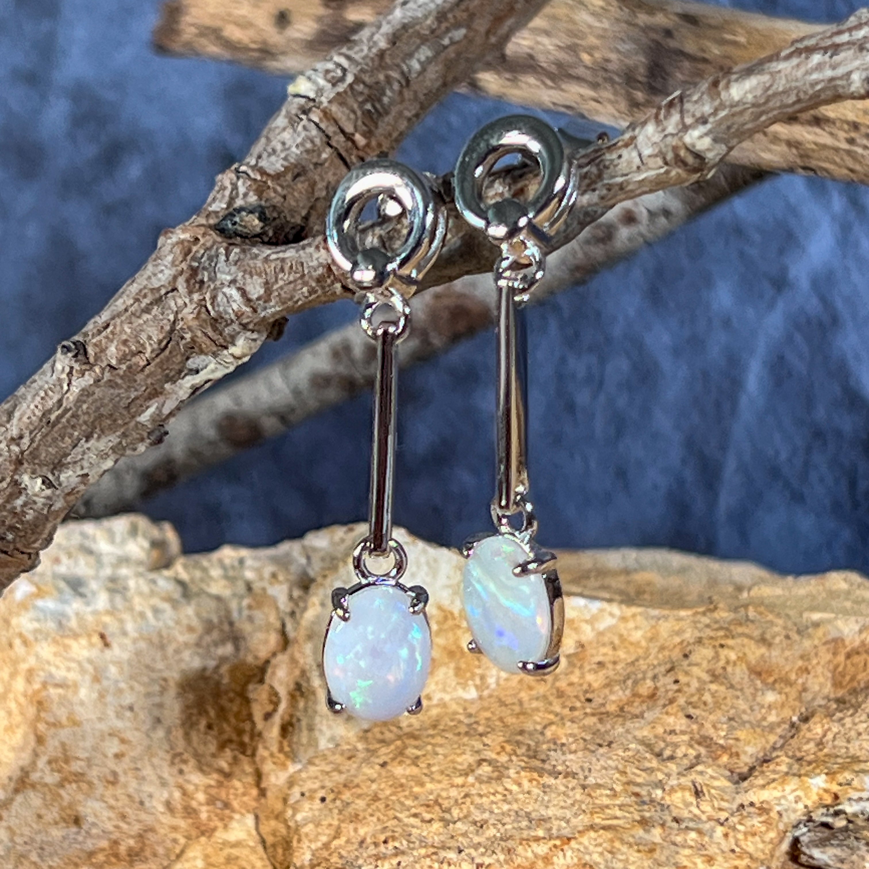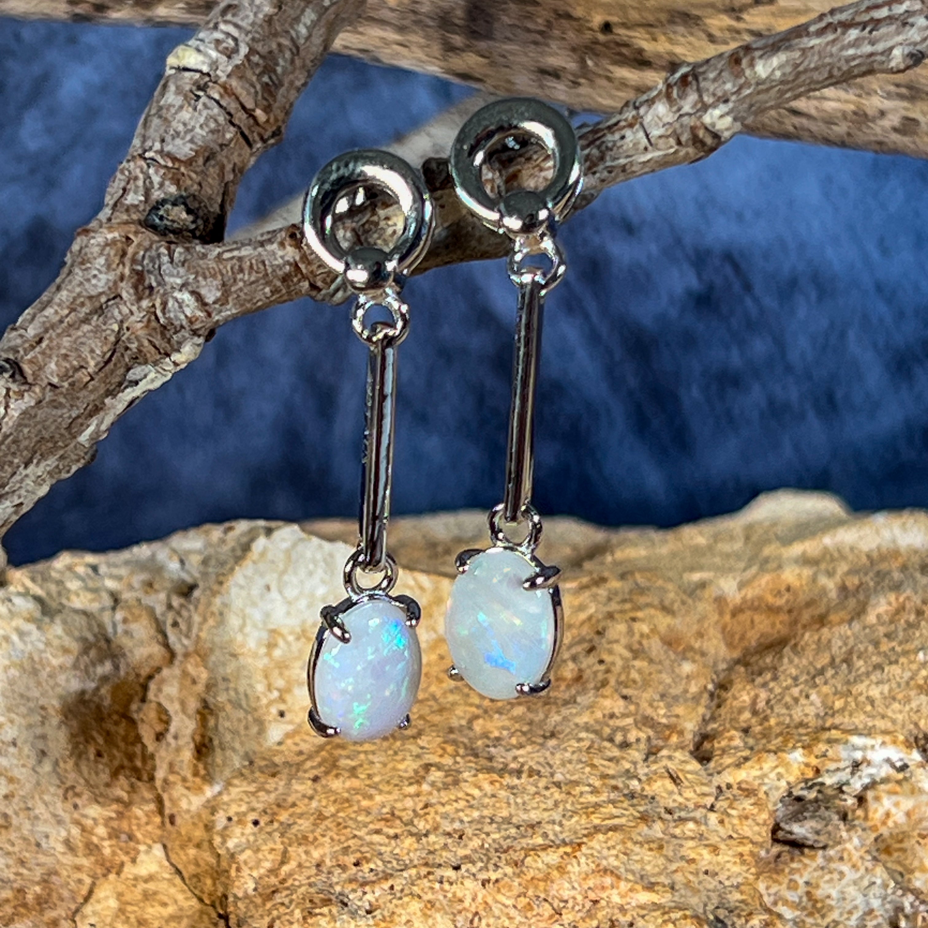 These elegant Sterling Silver opal dangle earrings make the perfect gift for her. Featuring 8x6mm White Opals in a delicate bar style setting, they add a touch of sophistication to any outfit. Show your loved one you care with this timeless and stylish piece.
