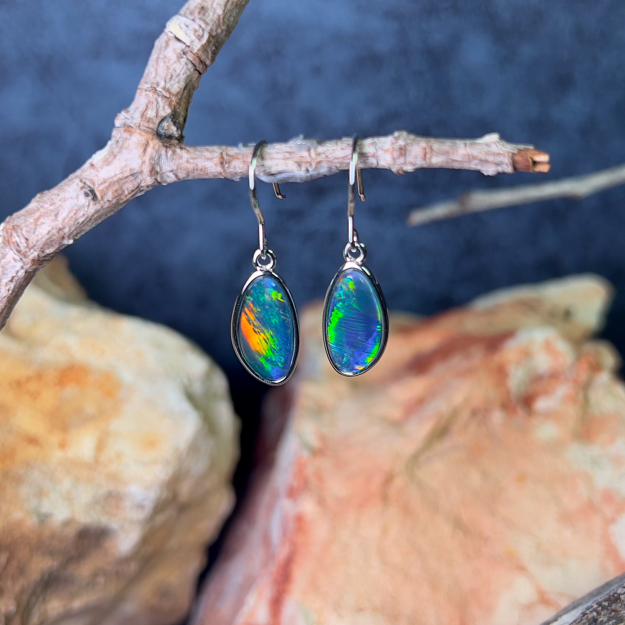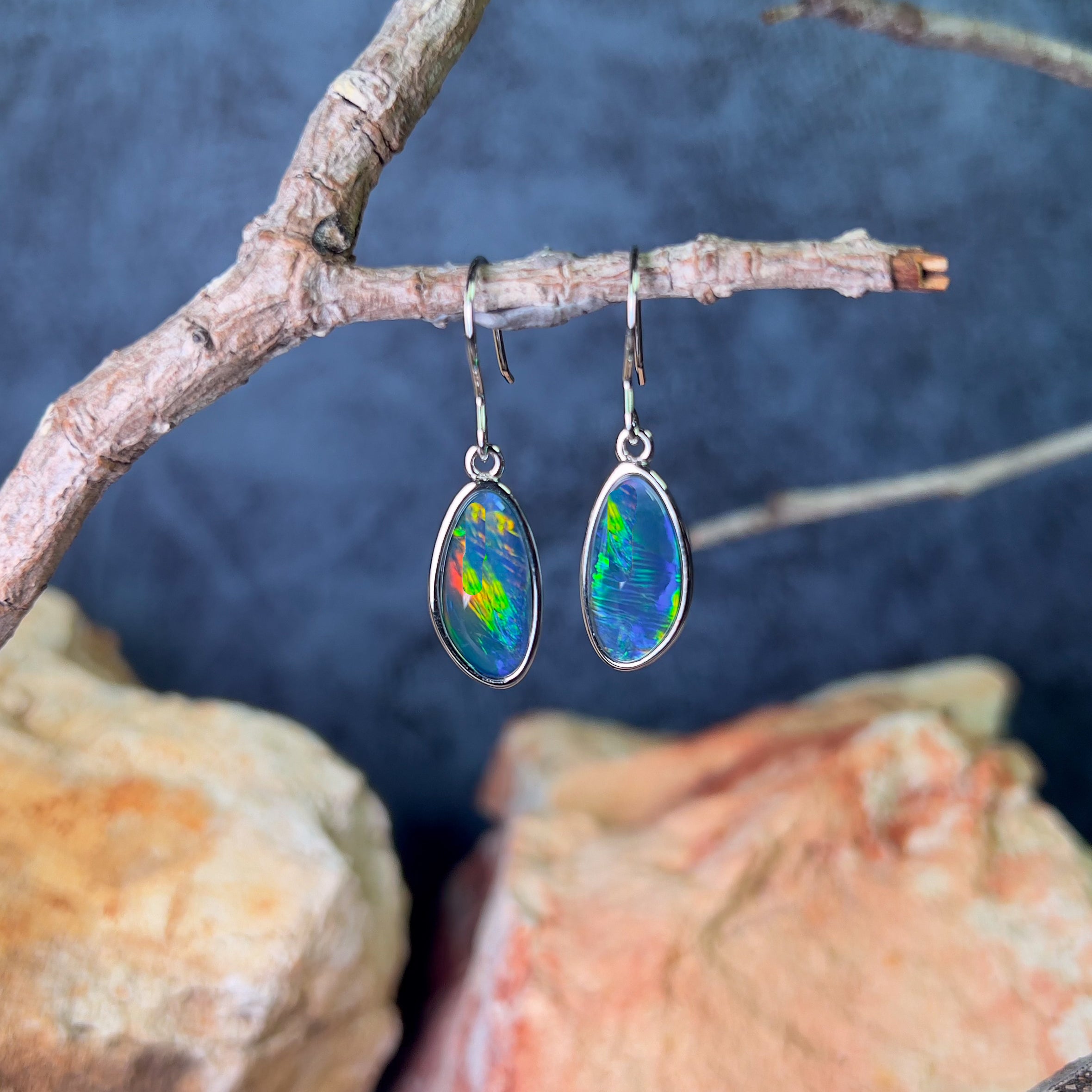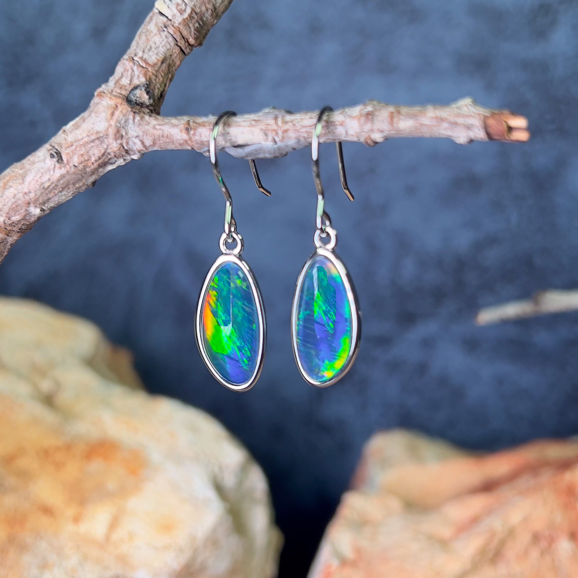 Sterling Silver dangling Freeform shape Opal triplet earrings 16x8mm