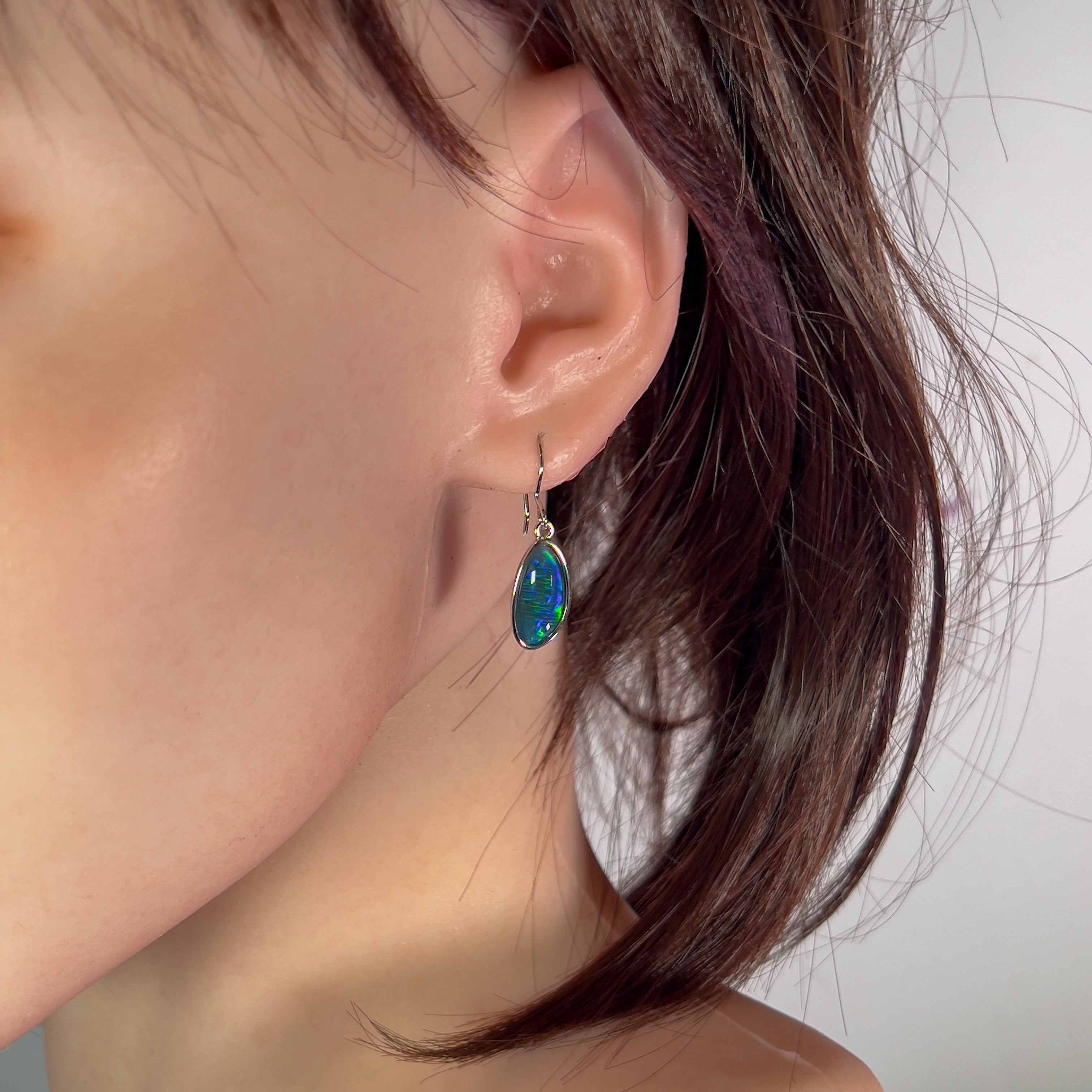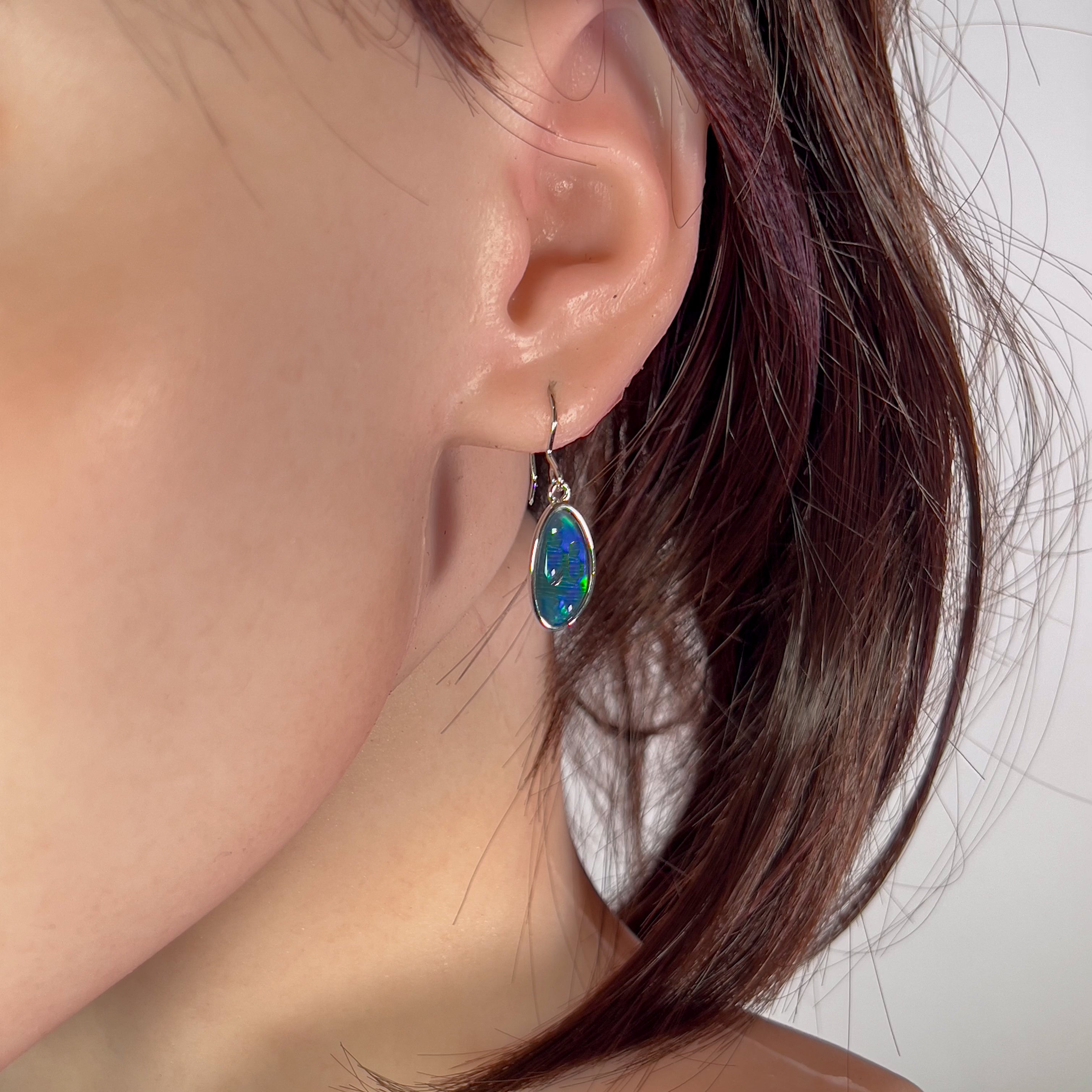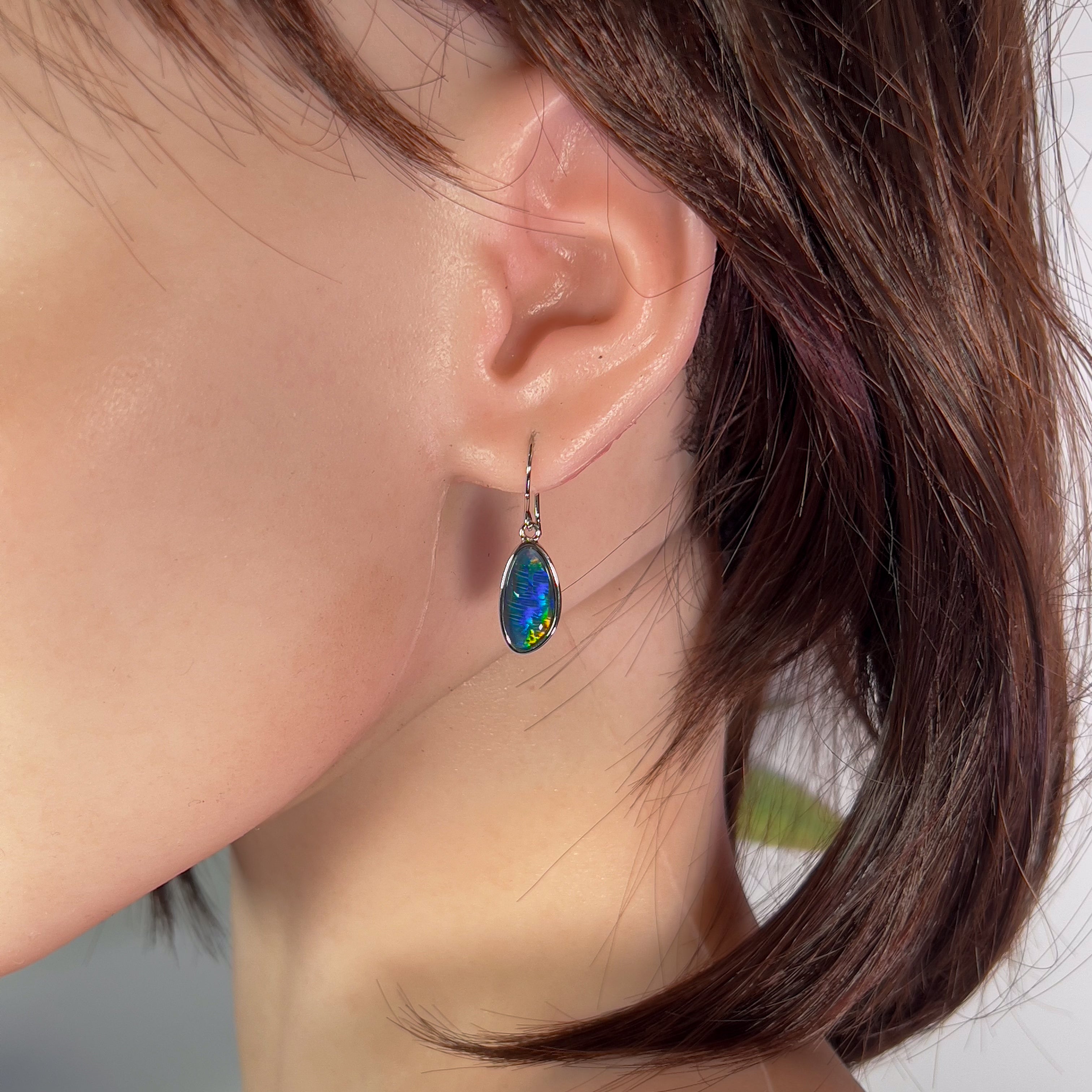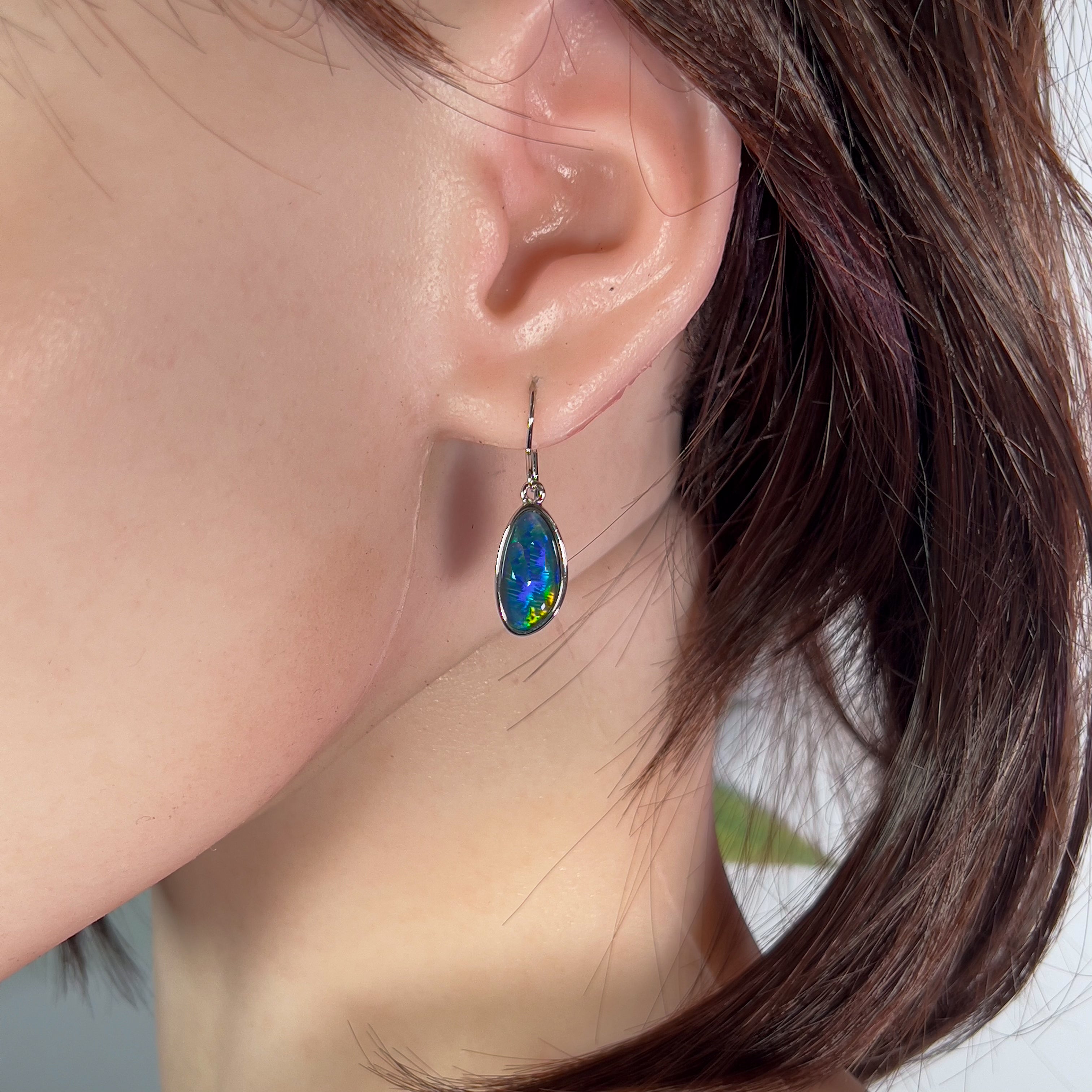 Elevate your look with these stunning Sterling Silver Opal triplet earrings. The unique Freeform shape and large drop of the 16x8mm opal create a bold and eye-catching design. Perfect for adding a touch of elegance and color to any outfit.