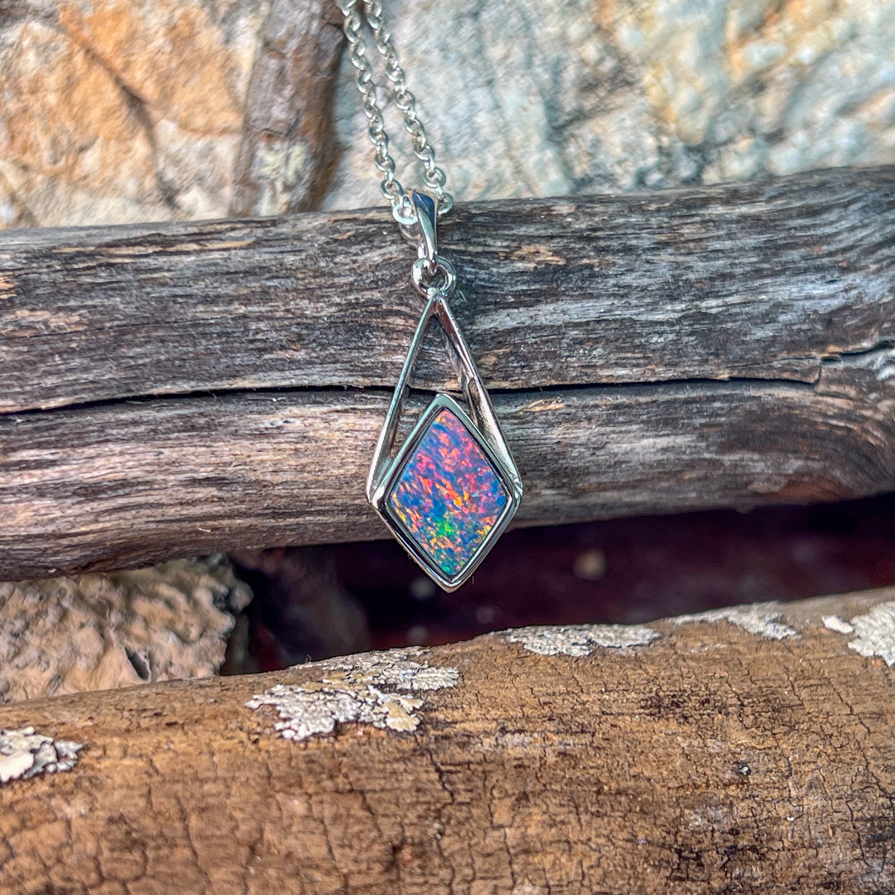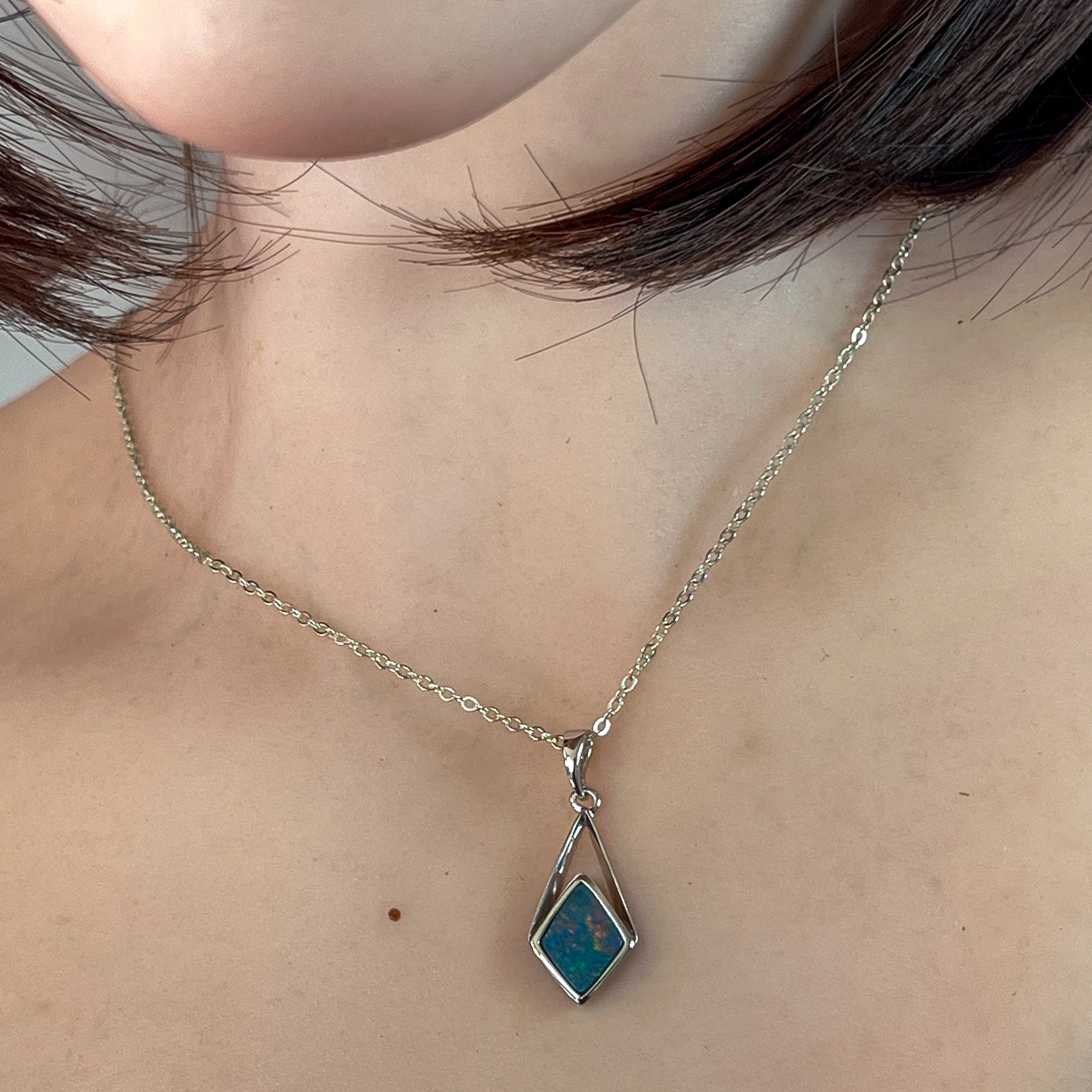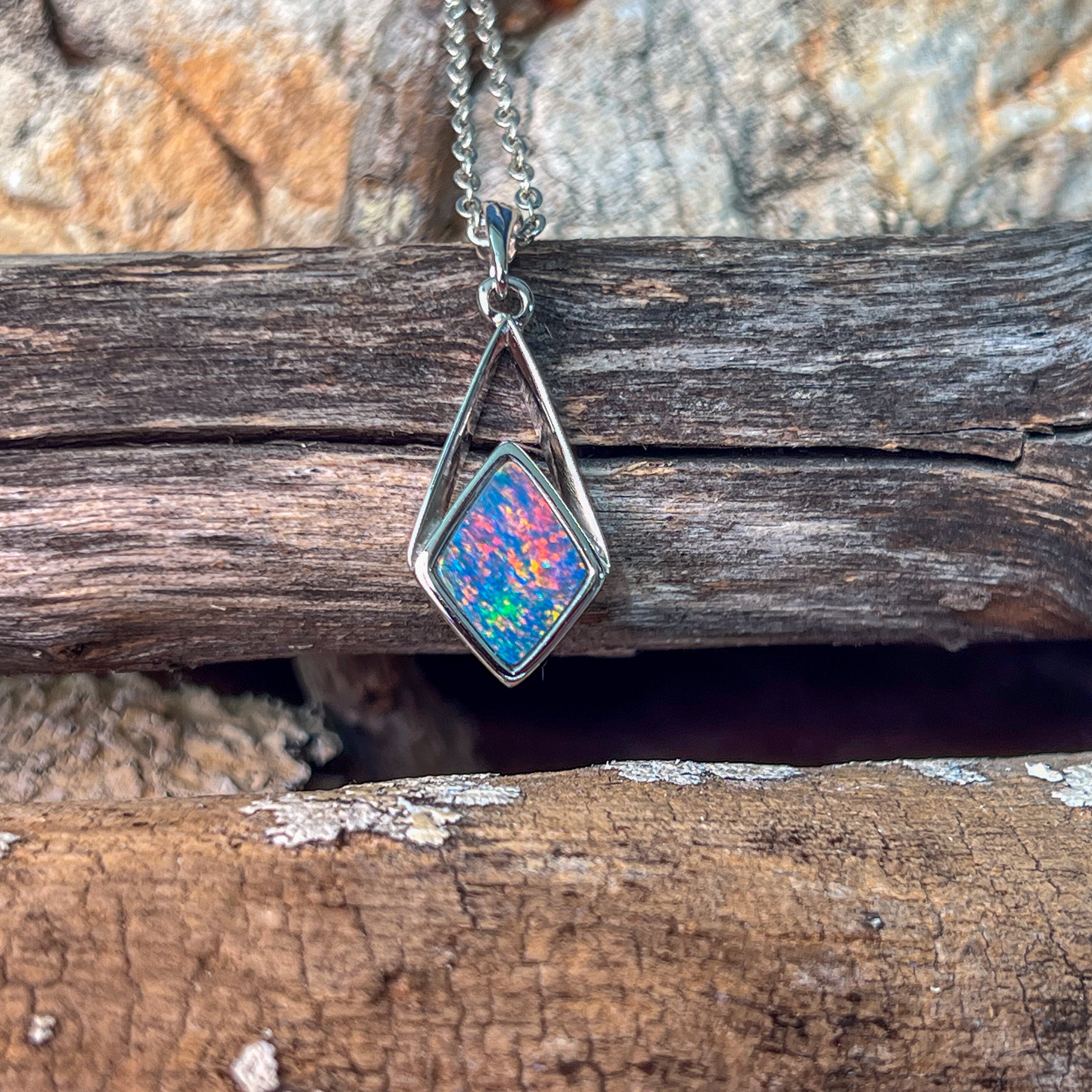 Add a touch of whimsy to your look with this sterling silver pendant featuring a dazzling diamond-shaped opal doublet. Its playful sparkle catches the light beautifully, making it the perfect accessory to brighten any outfit and spark conversations wherever you go.