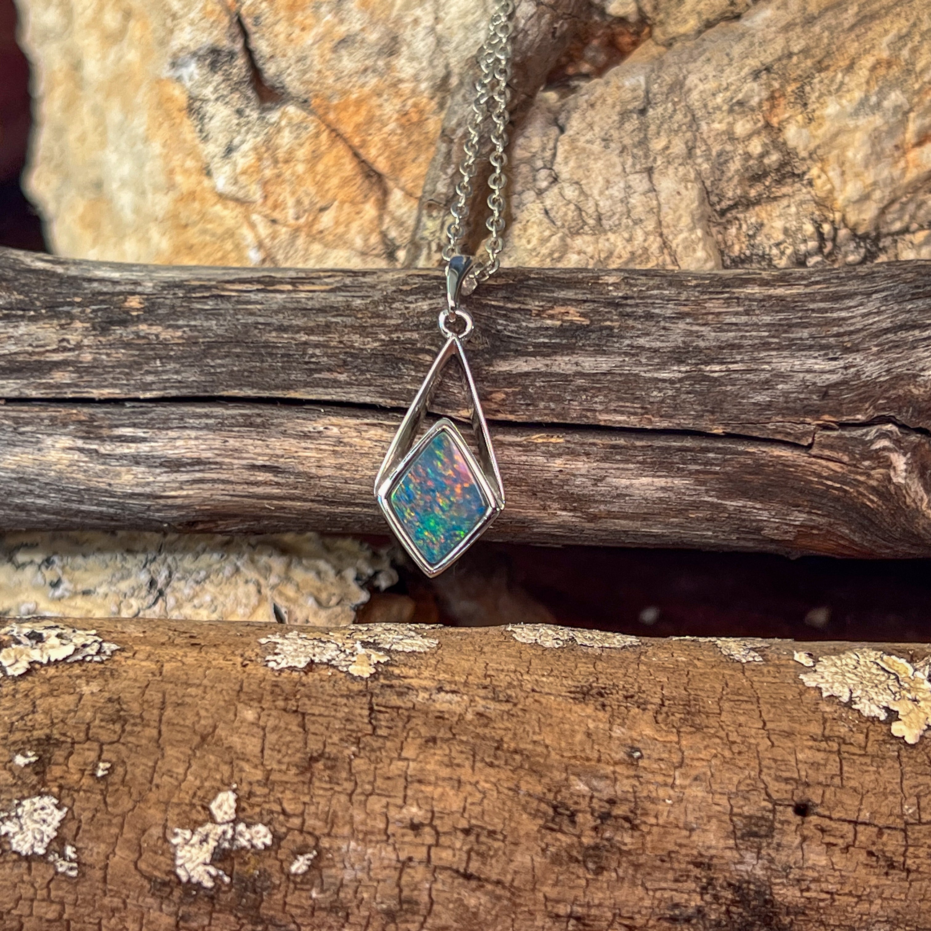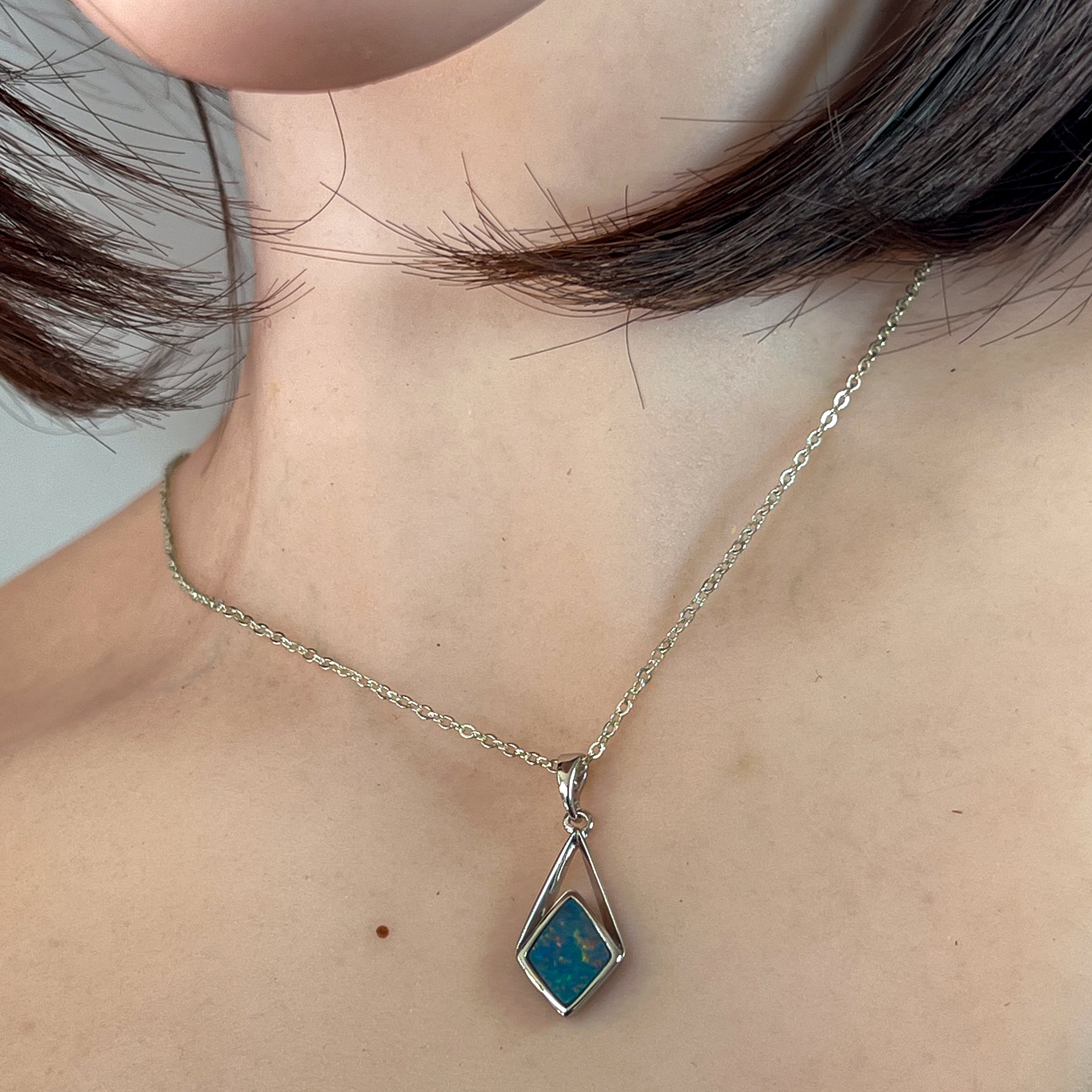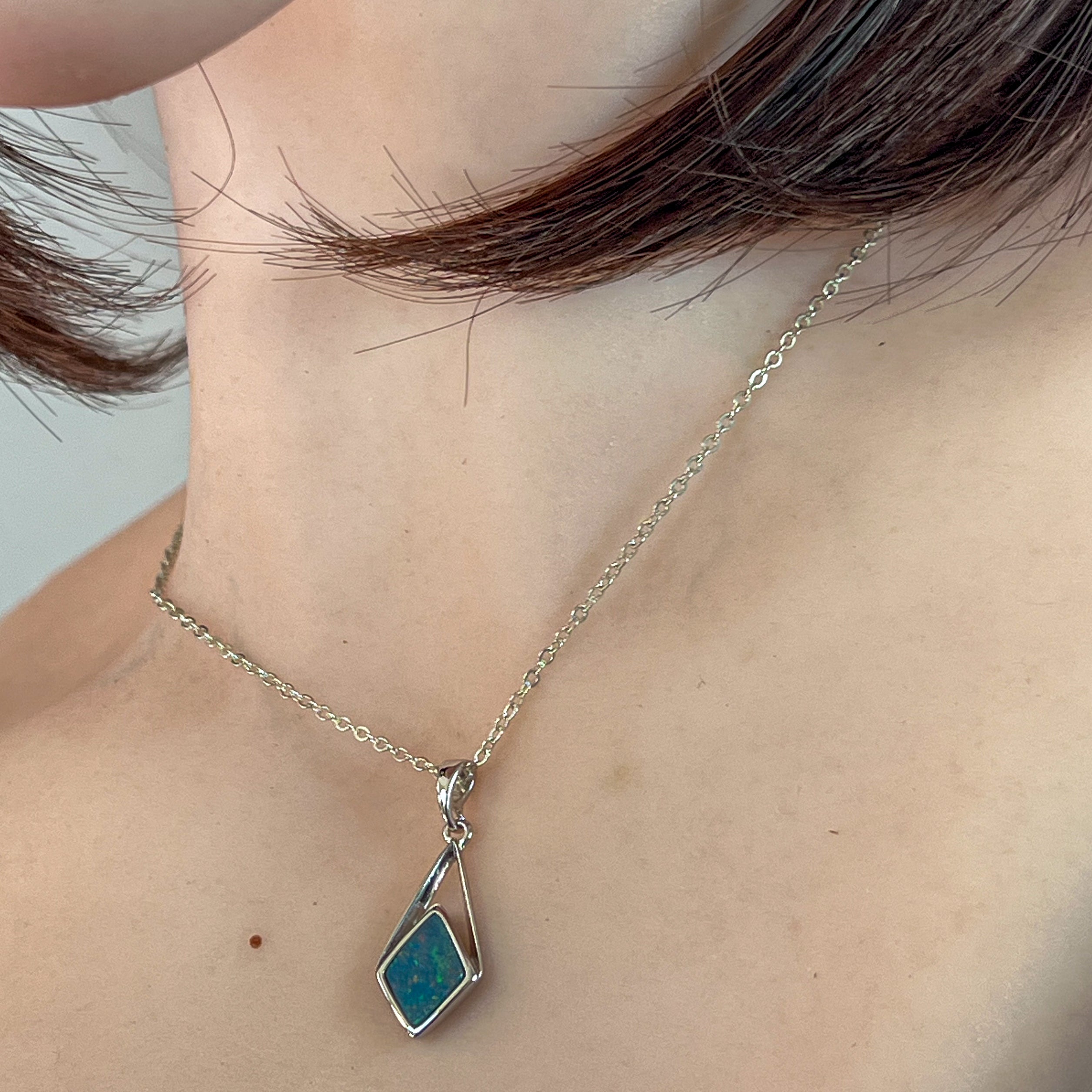 Add a touch of whimsy to your look with this sterling silver pendant featuring a dazzling diamond-shaped opal doublet. Its playful sparkle catches the light beautifully, making it the perfect accessory to brighten any outfit and spark conversations wherever you go.