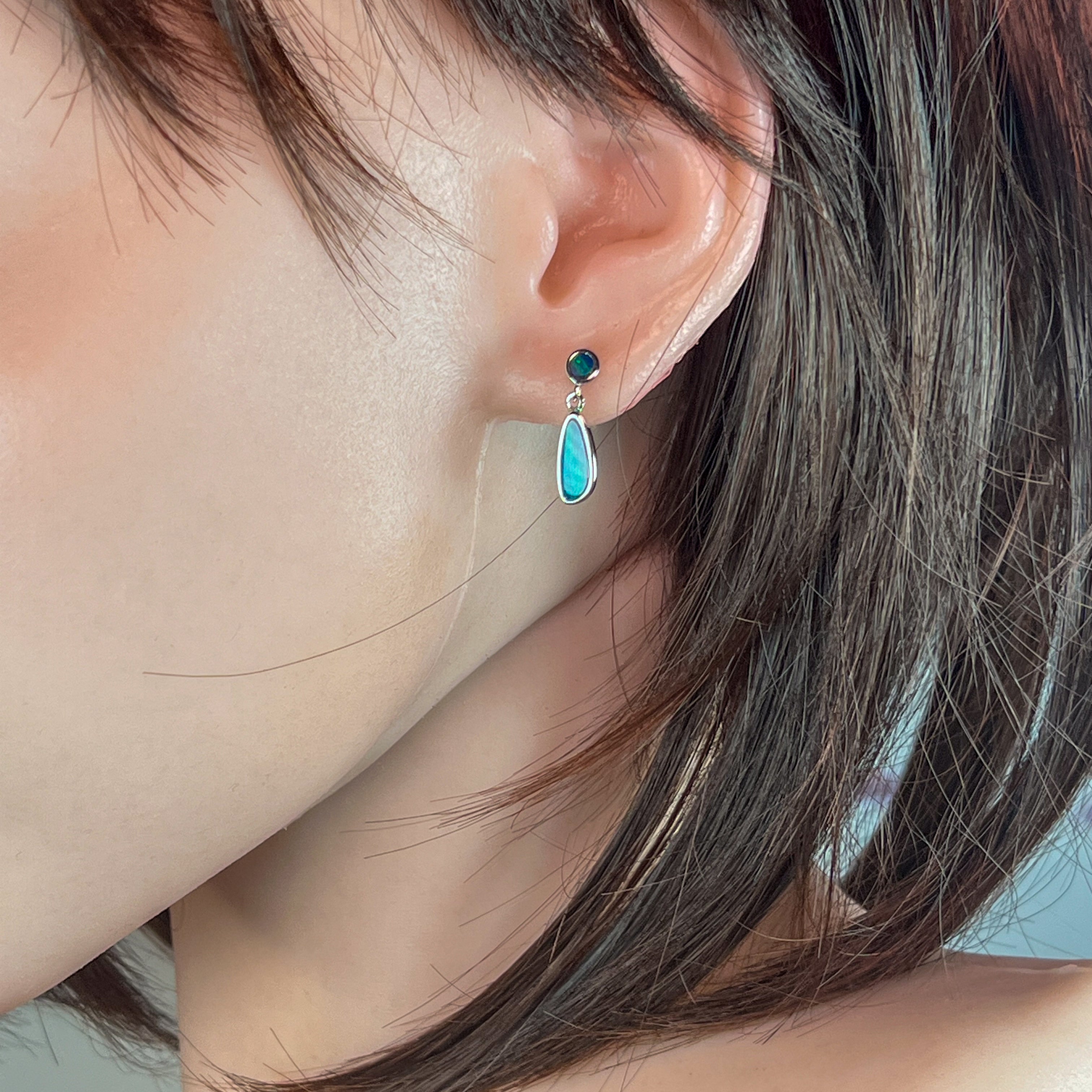 Add a splash of whimsy to your look with these sterling silver drop earrings featuring soft pastel hues of blue, green, and red in a charming line pattern. The opal doublets, bezel set for a secure and sleek finish, catch the light beautifully, making every movement sparkle. Perfect for adding a playful touch to any outfit, these earrings bring delicate color and effortless style together in one delightful accessory.