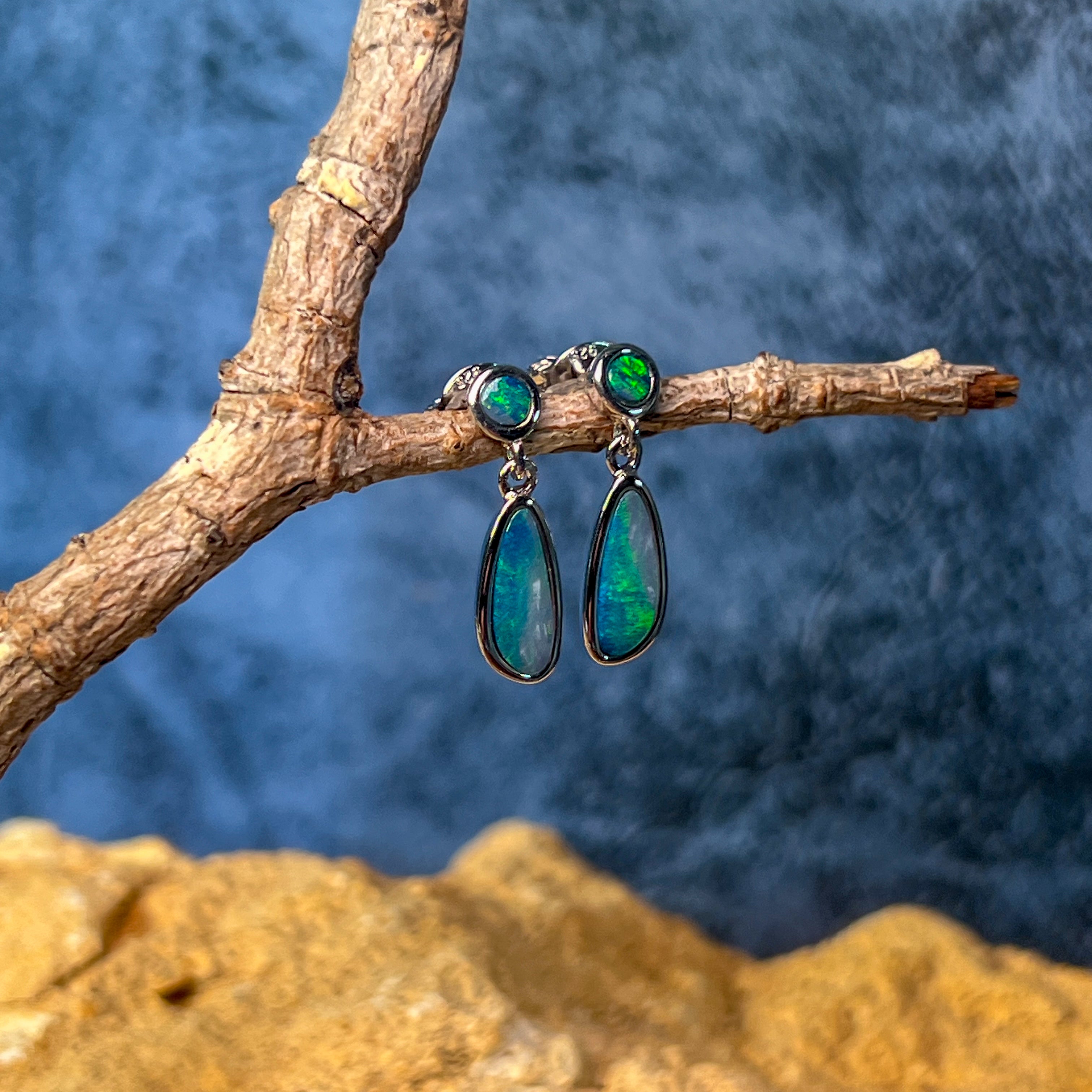 Sterling Silver drop earrings Blue Green Red line pattern Opal doublets bezel set
