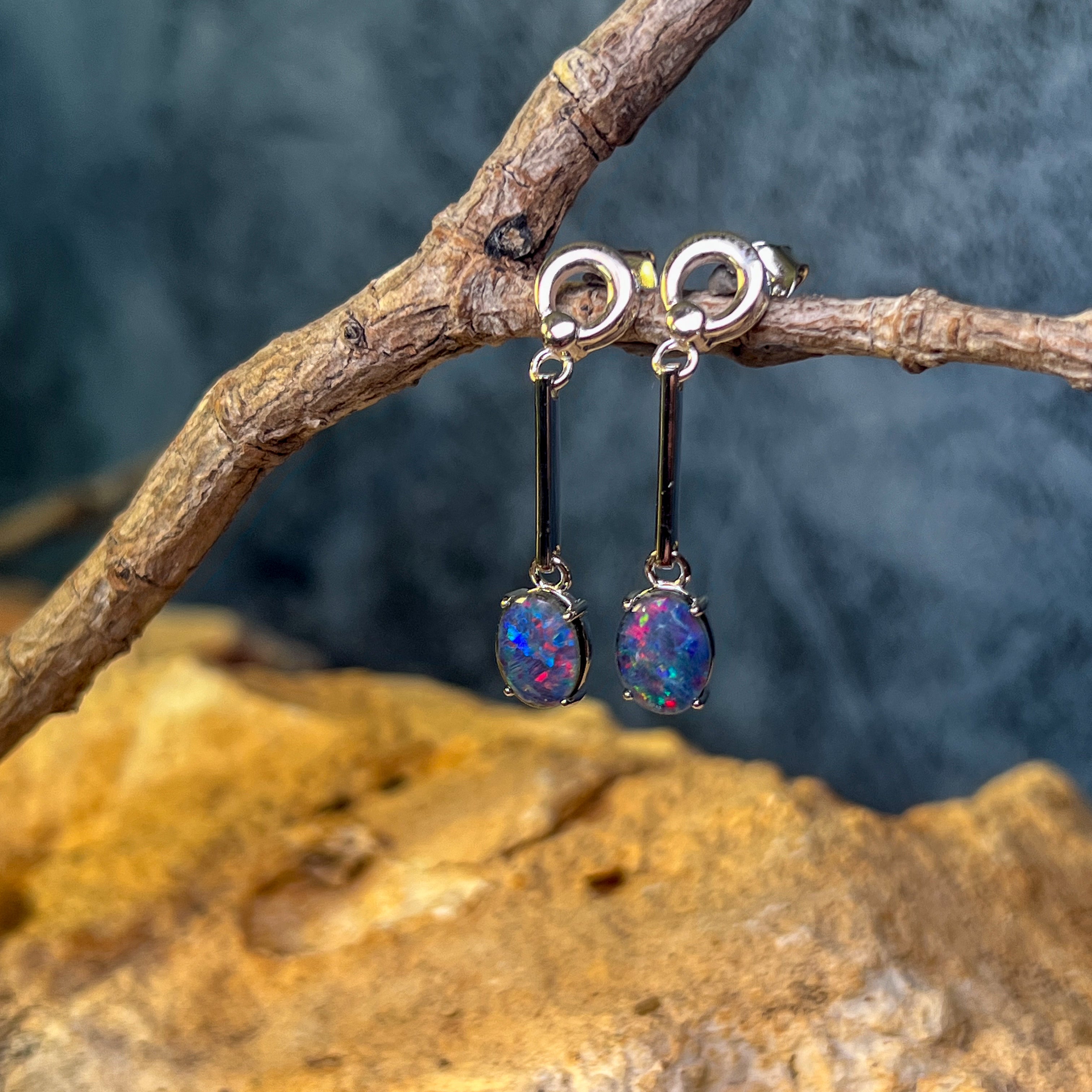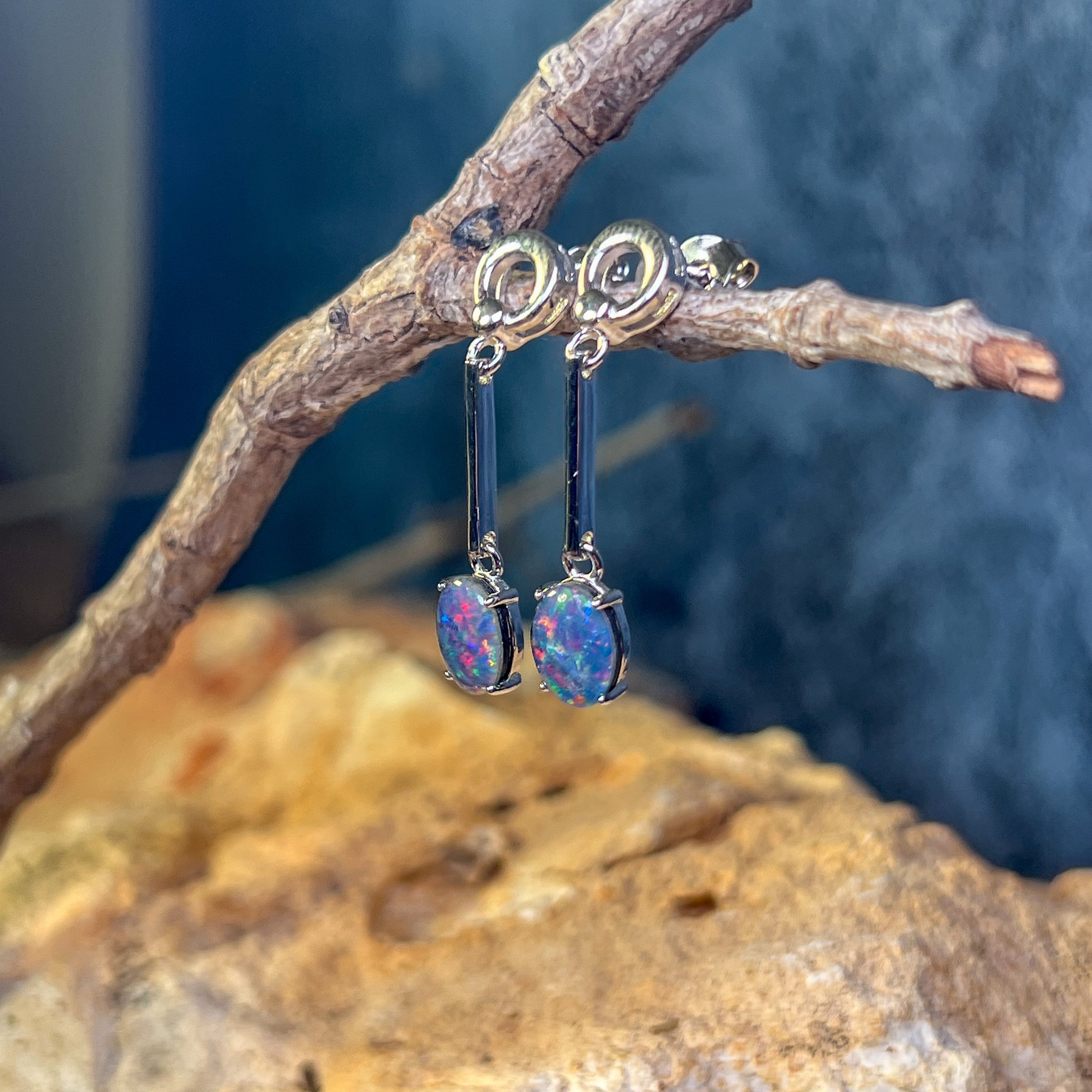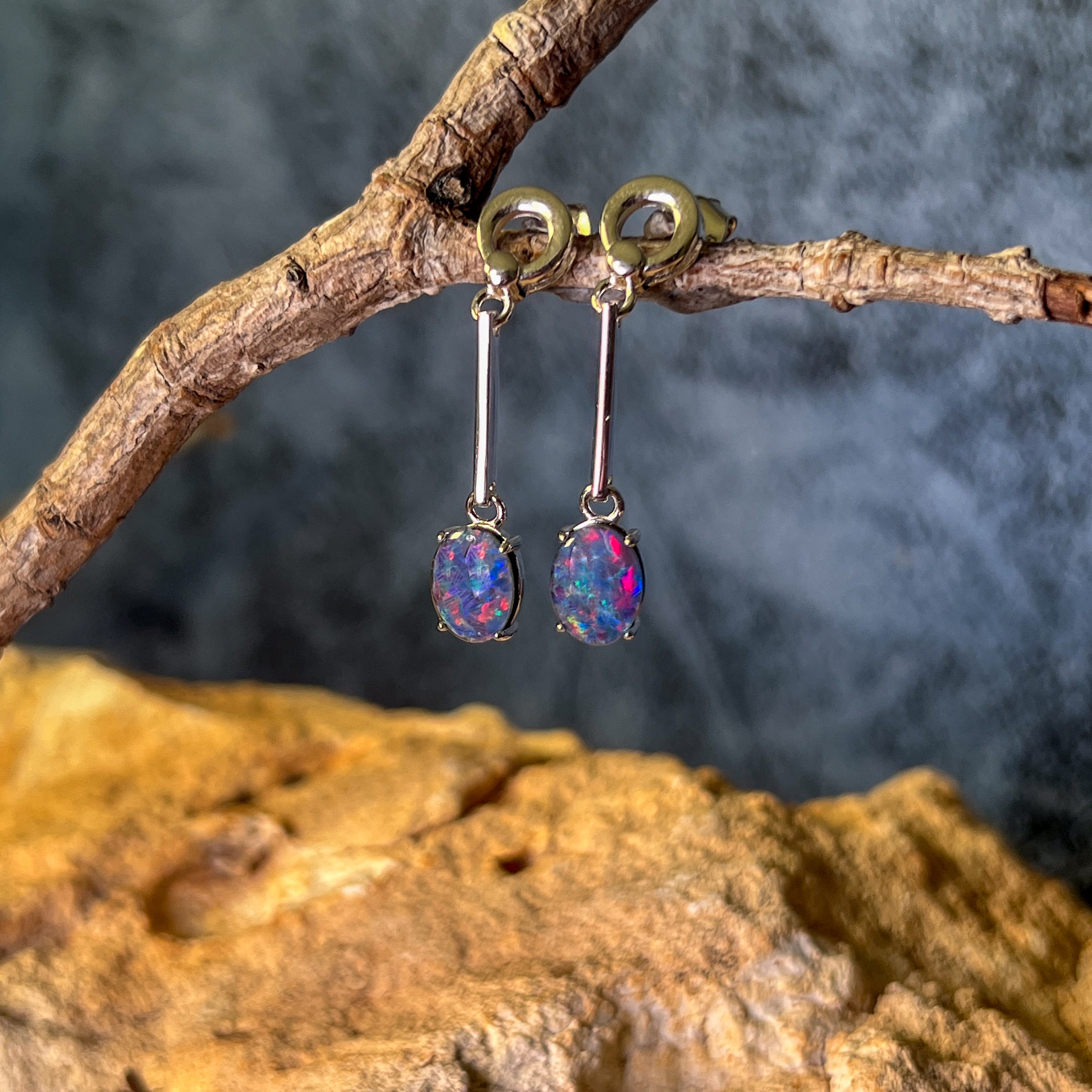Elevate your style with these daring sterling silver drop bar earrings, featuring vibrant 8x6mm opal triplets. Their sleek, minimalistic design makes a bold statement while adding a touch of fiery color and elegance to any look. Perfect for those who dare to stand out with subtle sophistication.