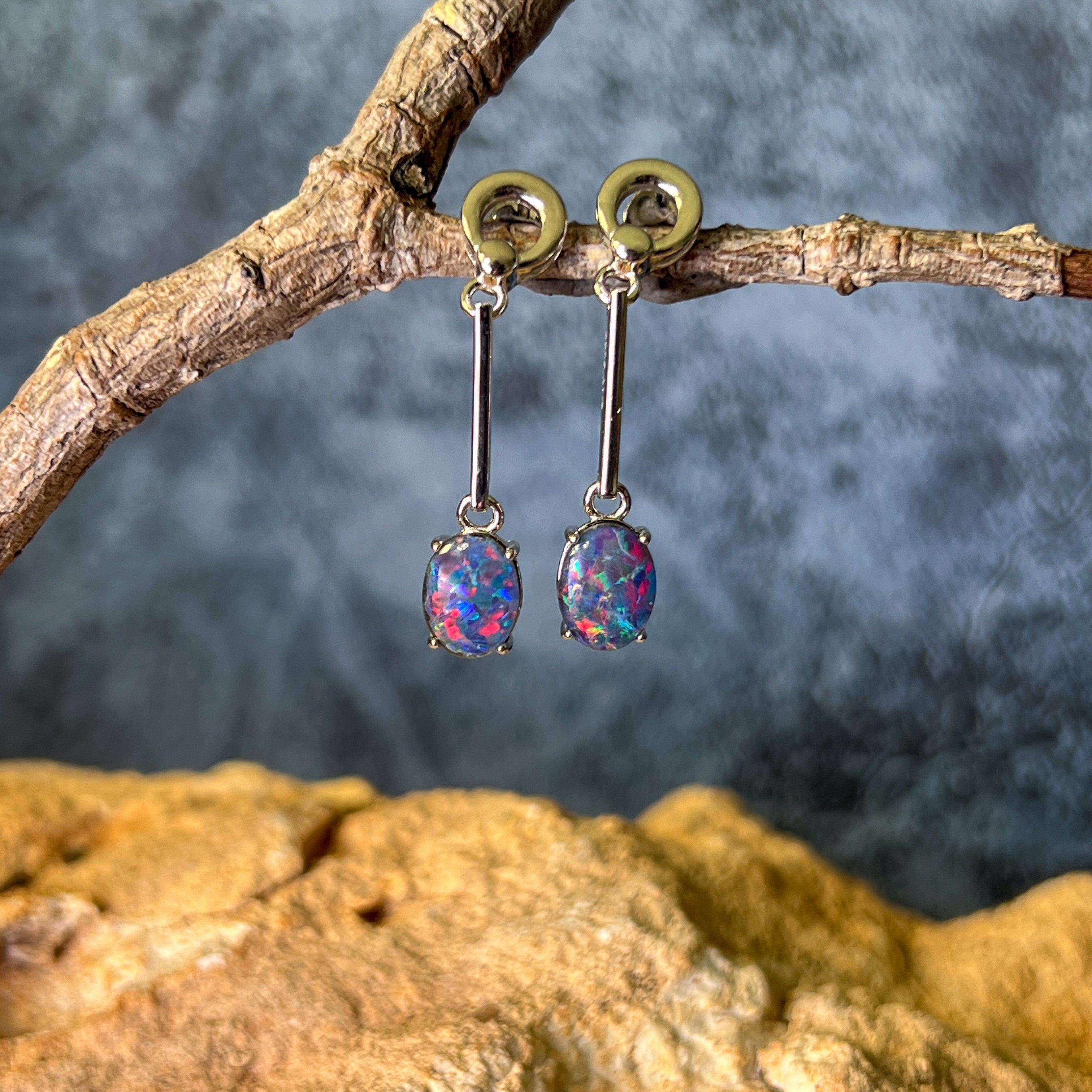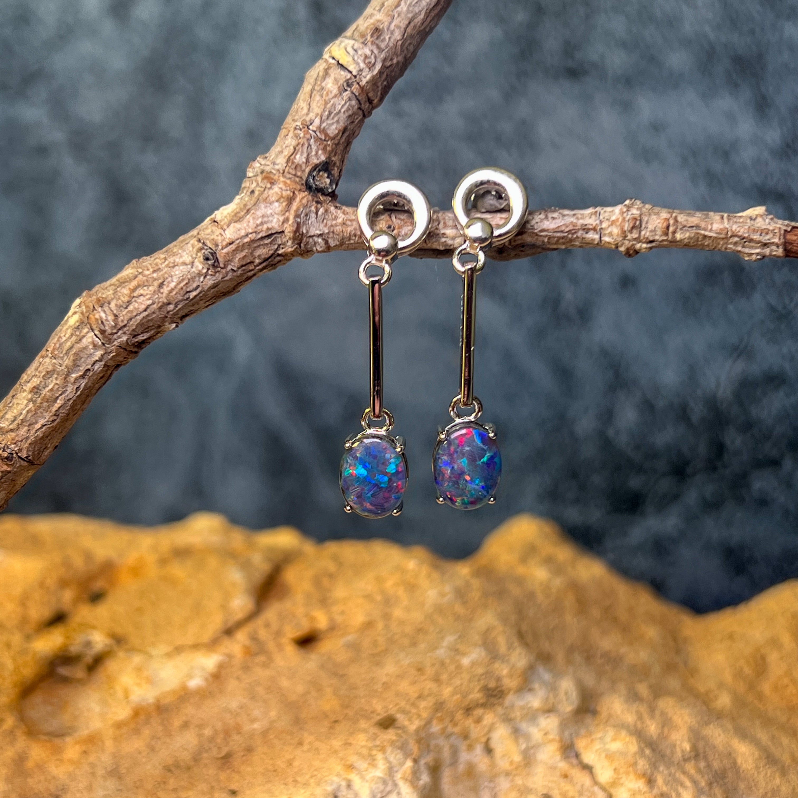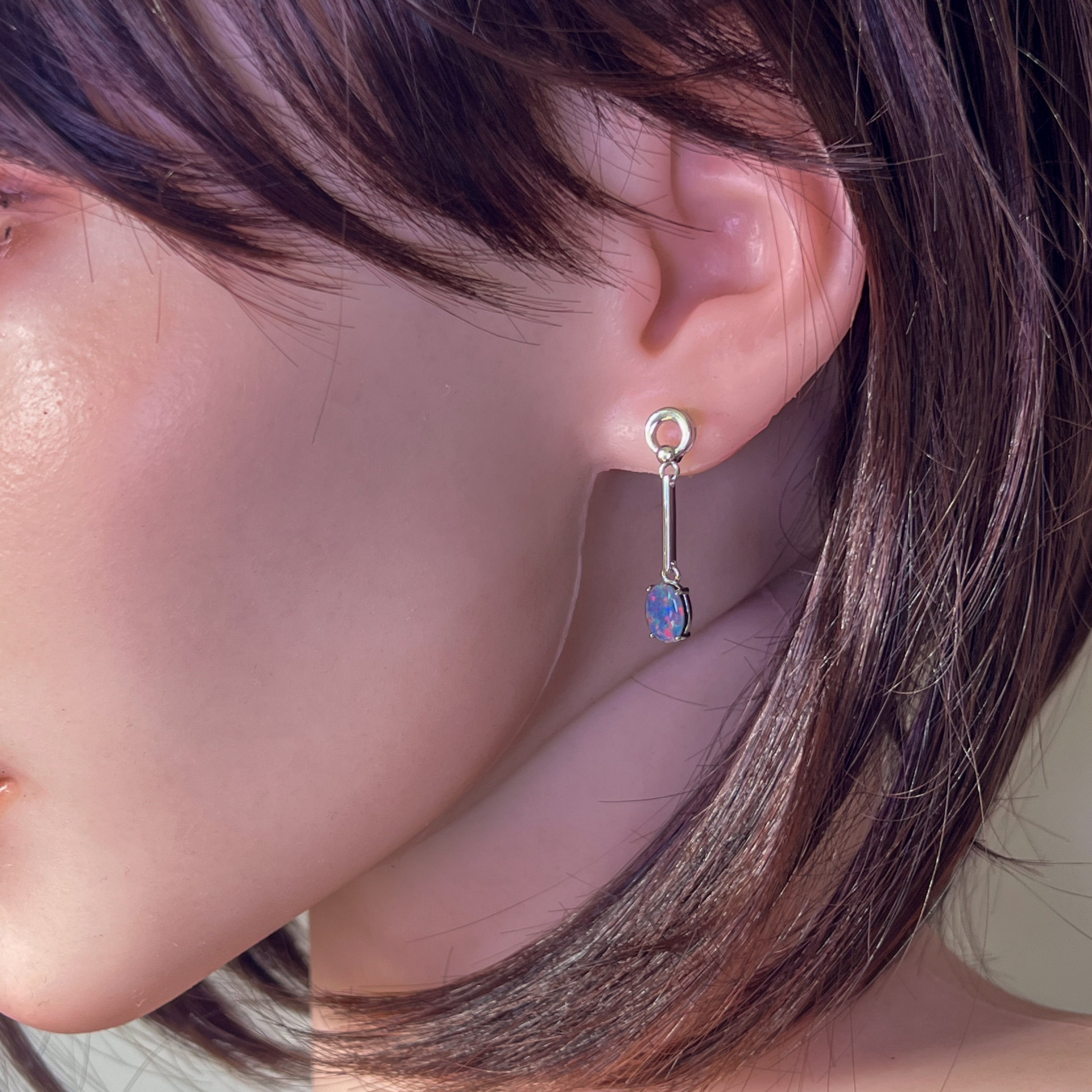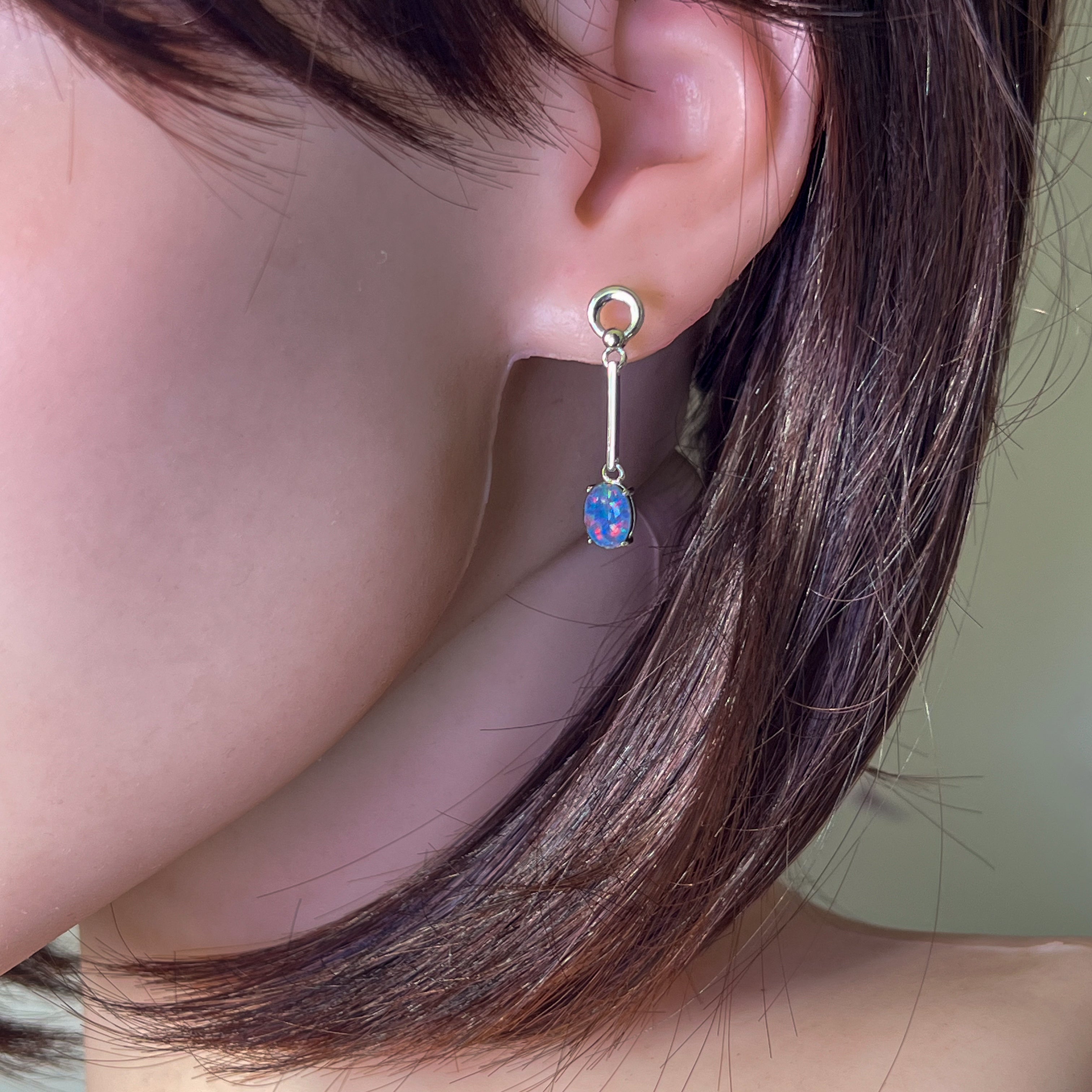 Elevate your style with these daring sterling silver drop bar earrings, featuring vibrant 8x6mm opal triplets. Their sleek, minimalistic design makes a bold statement while adding a touch of fiery color and elegance to any look. Perfect for those who dare to stand out with subtle sophistication.