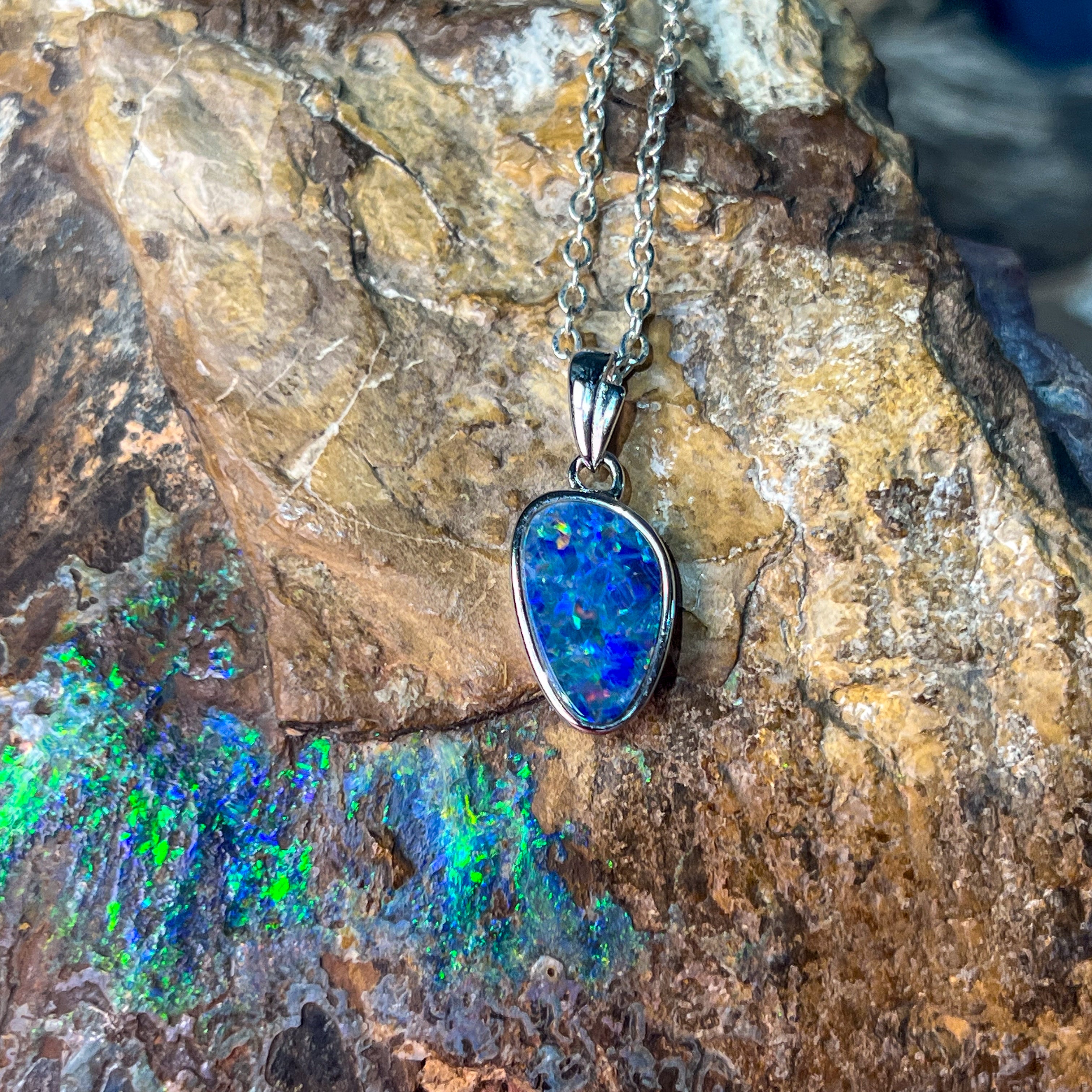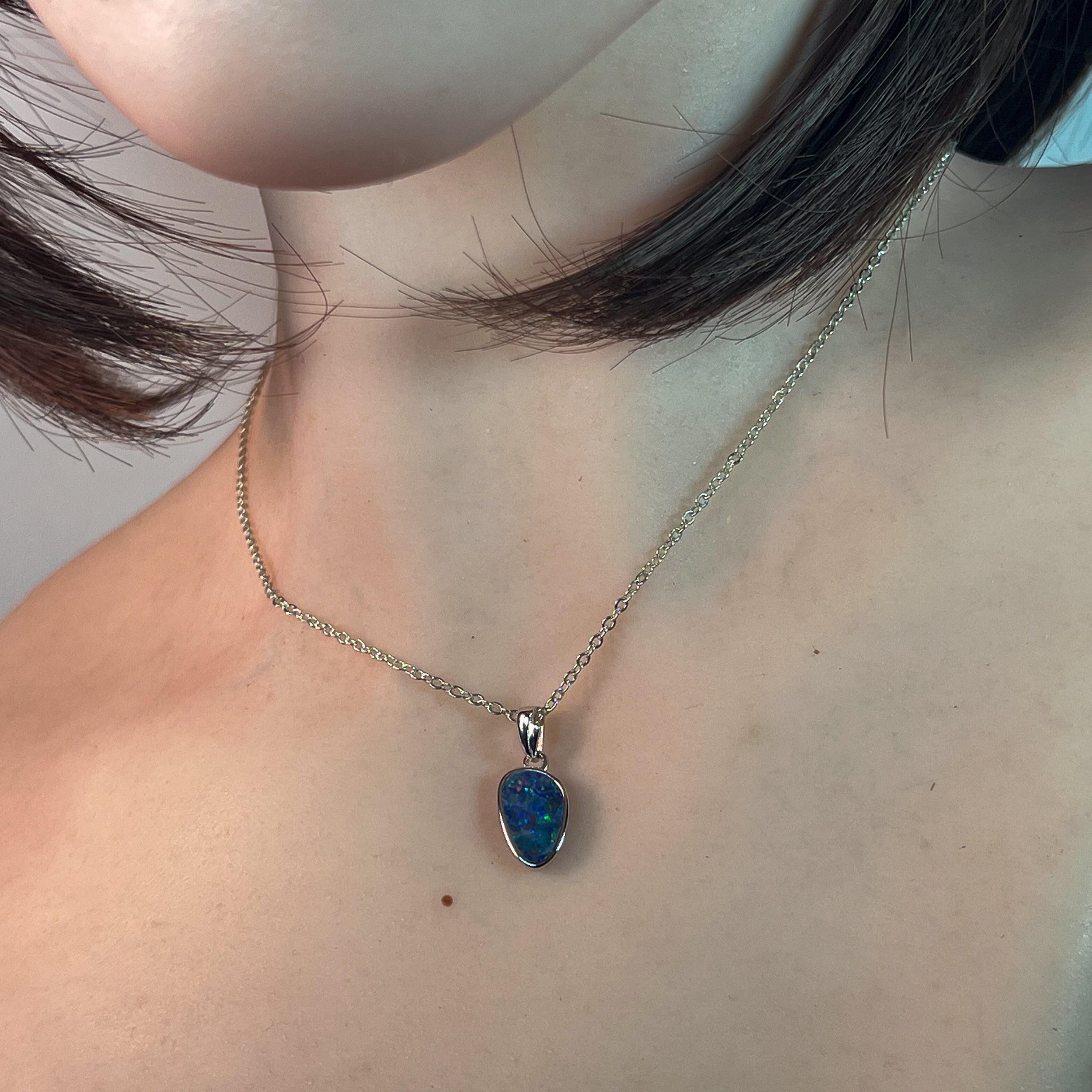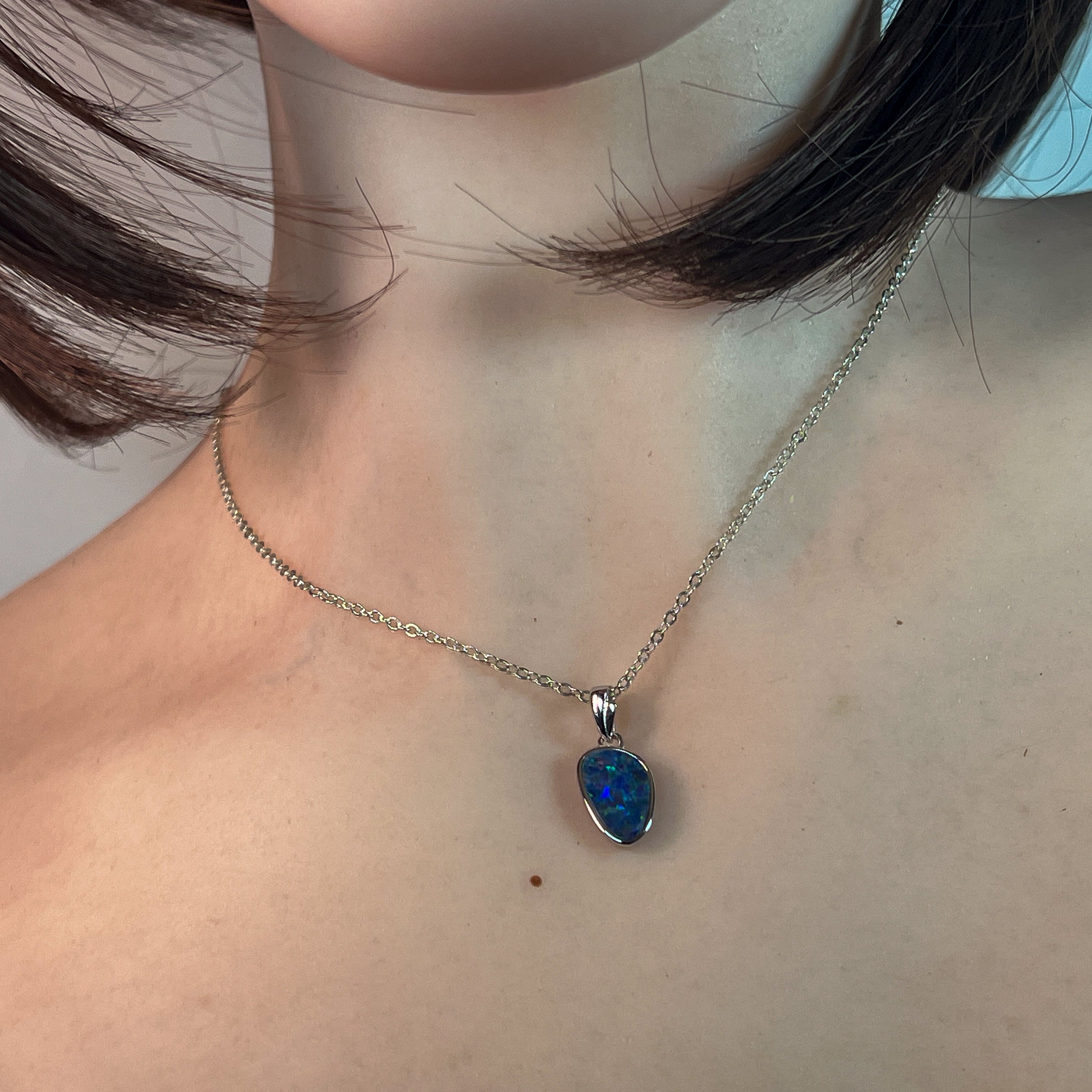 Elevate your everyday style with this sterling silver pendant featuring a freeform doublet opal shimmering in blue, green, and orange hues. Its delicate, classic design offers a subtle yet captivating touch, perfect for adding refined elegance to any outfit. Crafted to highlight the unique colors of the opal, this pendant ensures you stand out with effortless charm.
