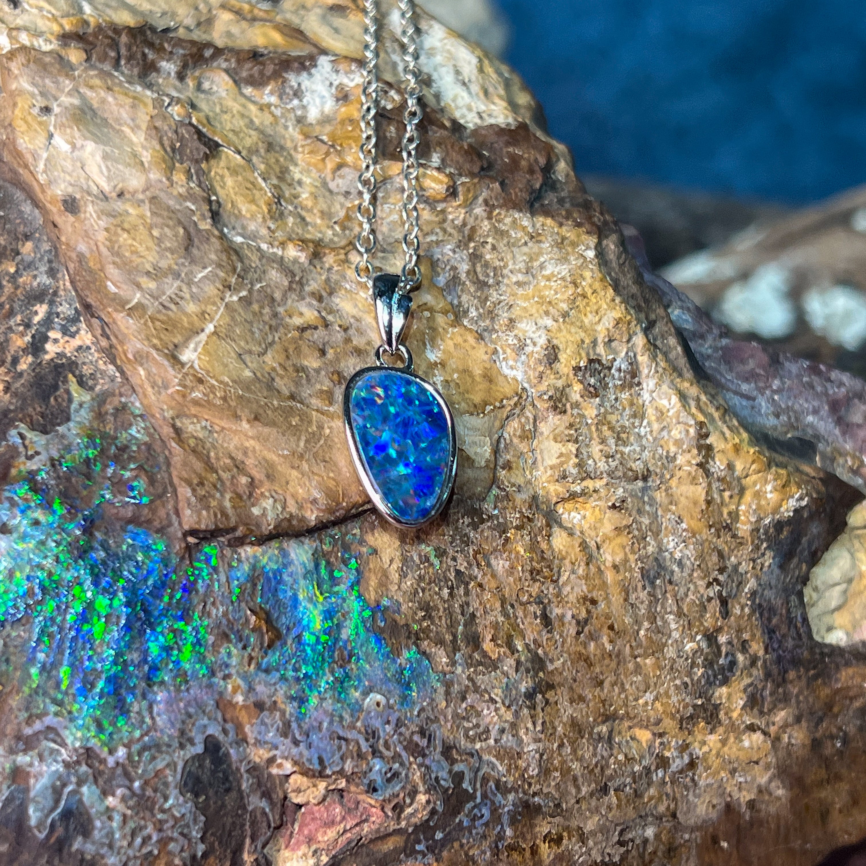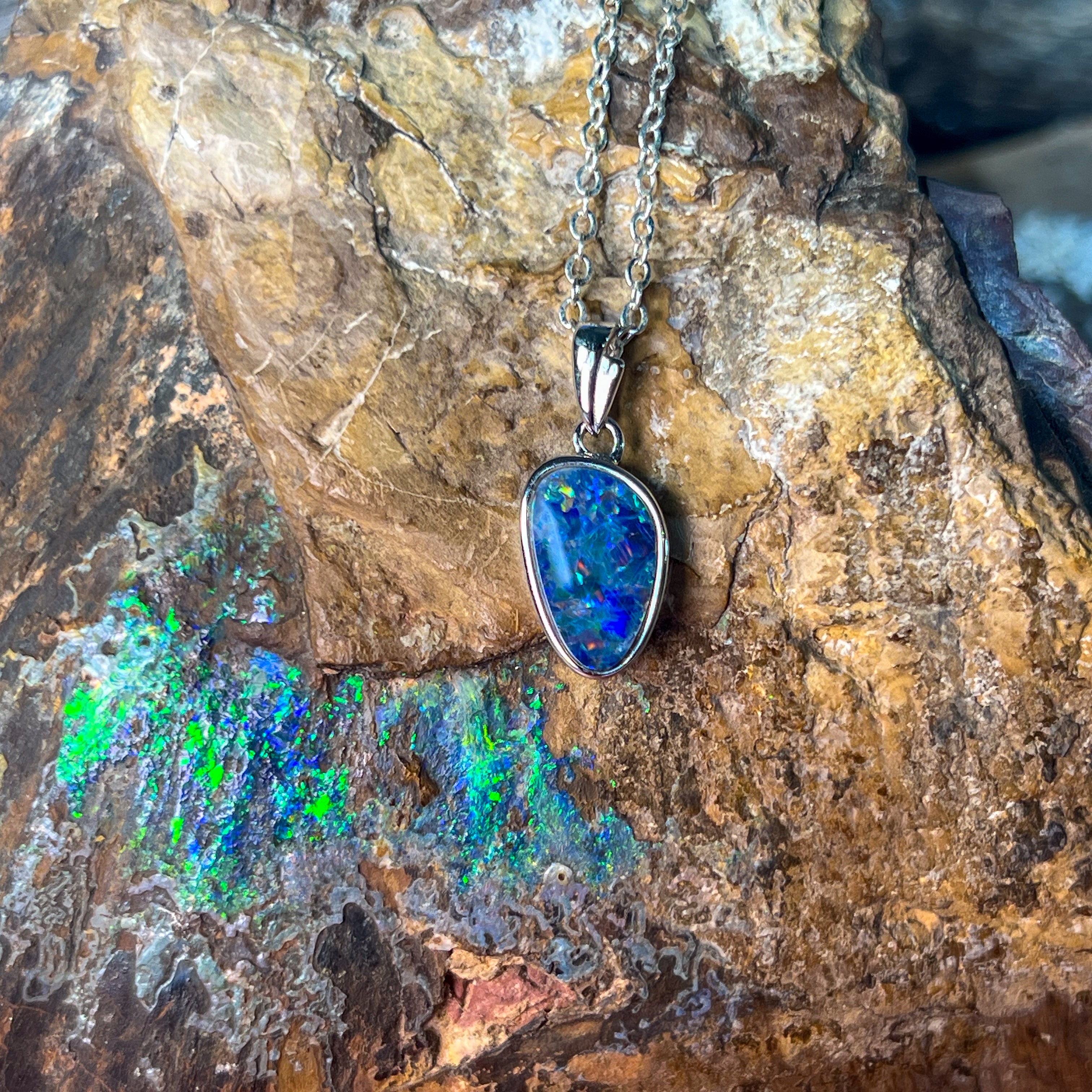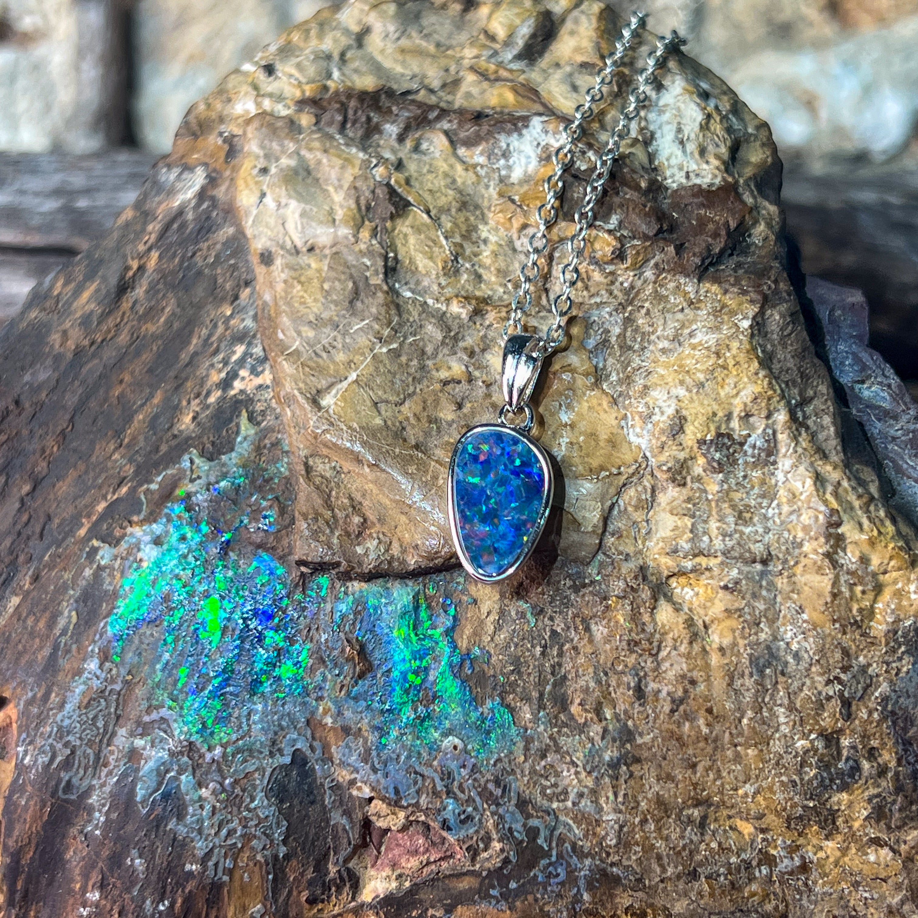 Elevate your everyday style with this sterling silver pendant featuring a freeform doublet opal shimmering in blue, green, and orange hues. Its delicate, classic design offers a subtle yet captivating touch, perfect for adding refined elegance to any outfit. Crafted to highlight the unique colors of the opal, this pendant ensures you stand out with effortless charm.