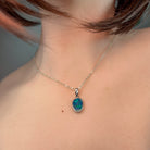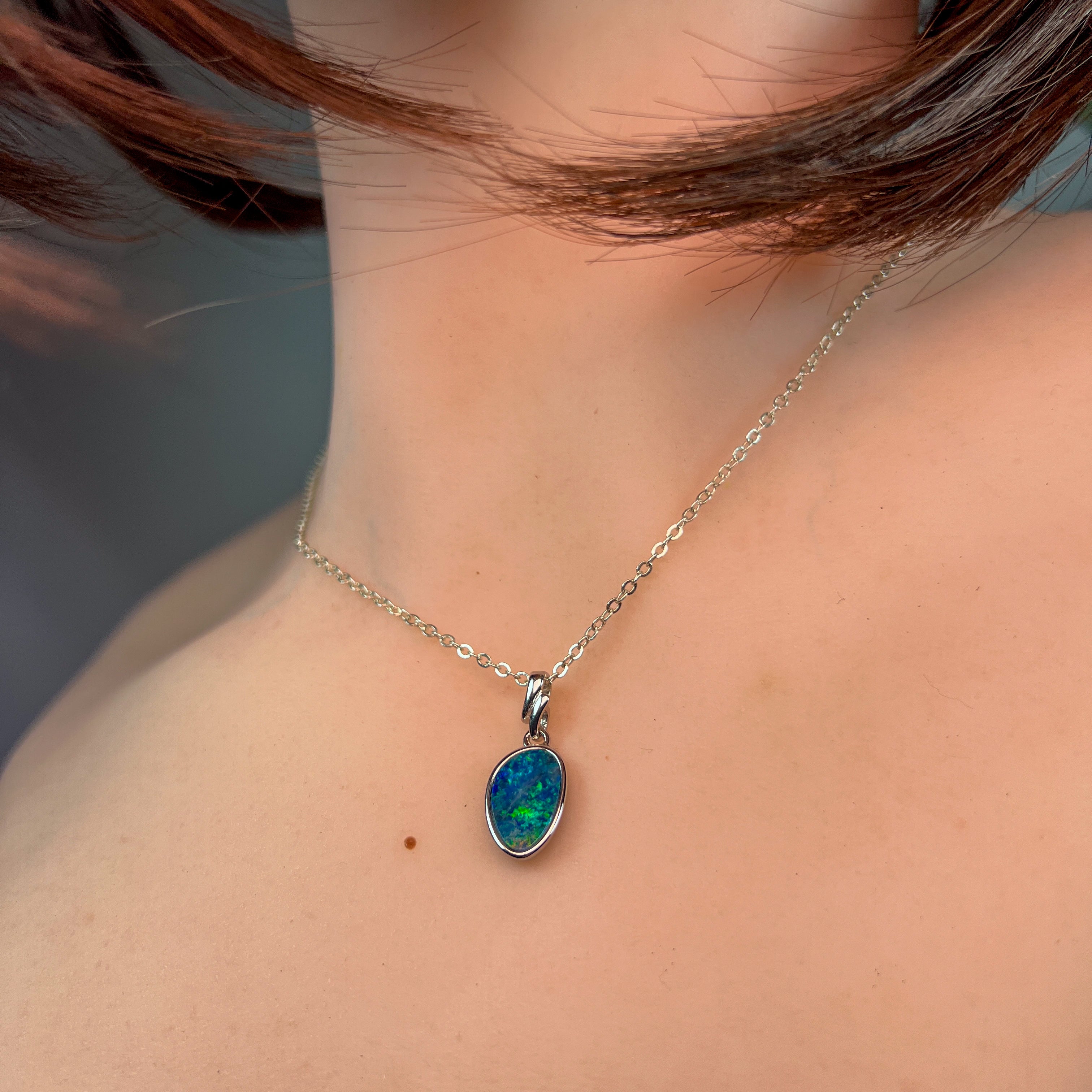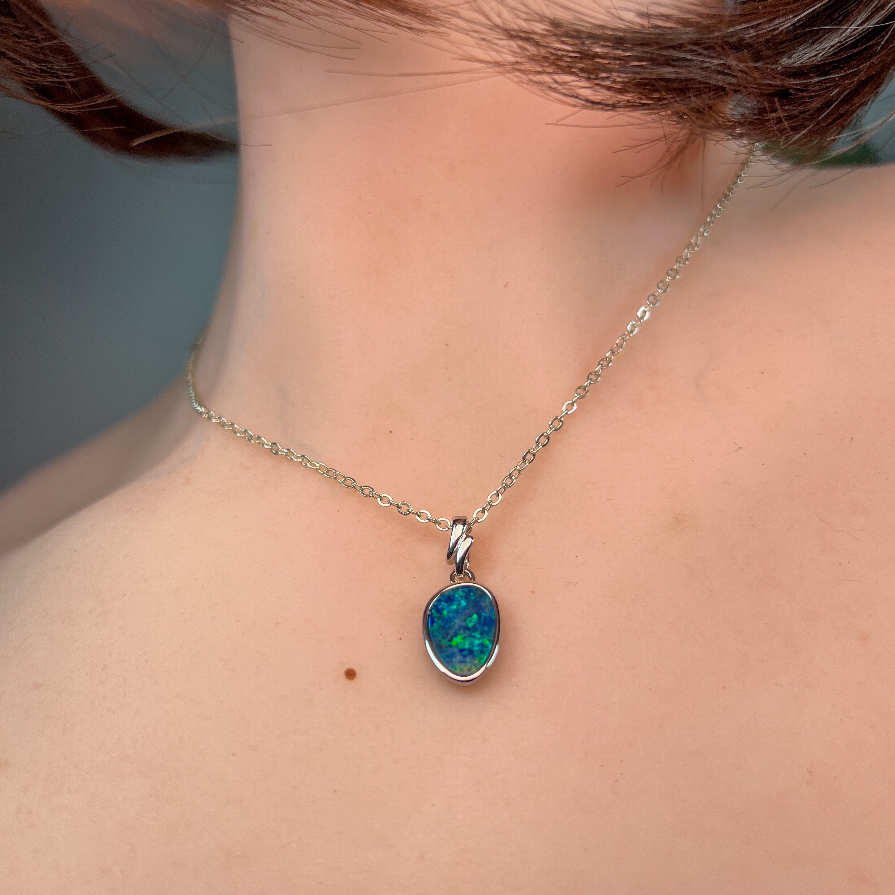 This striking Sterling Silver pendant showcases a freeform Green Blue Opal doublet that captures light with mesmerizing depth and movement. The sharp, vibrant green hues create an eye-catching focal point that draws admiration from every angle. Crafted in quality sterling silver, this piece offers timeless elegance with contemporary flair. Perfect for those seeking a distinctive gemstone pendant that makes a bold statement while maintaining sophisticated appeal. An investment in wearable art that transforms any outfit.