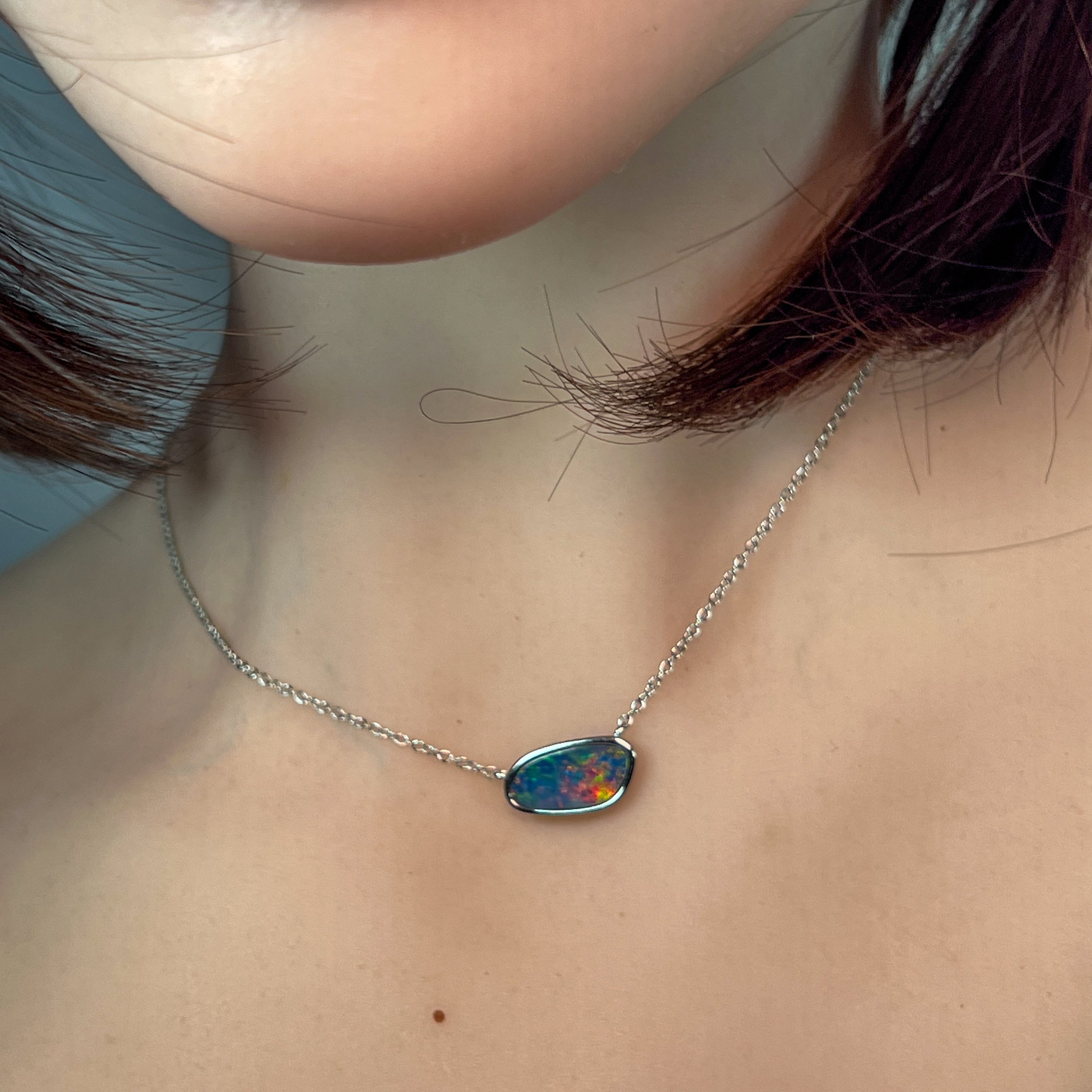 Elevate your elegance with this sterling silver necklace featuring a freeform horizontal bezel-set opal doublet. The unique shape and secure setting highlight the opal’s vibrant play of color, making it a refined statement piece perfect for any sophisticated wardrobe.
