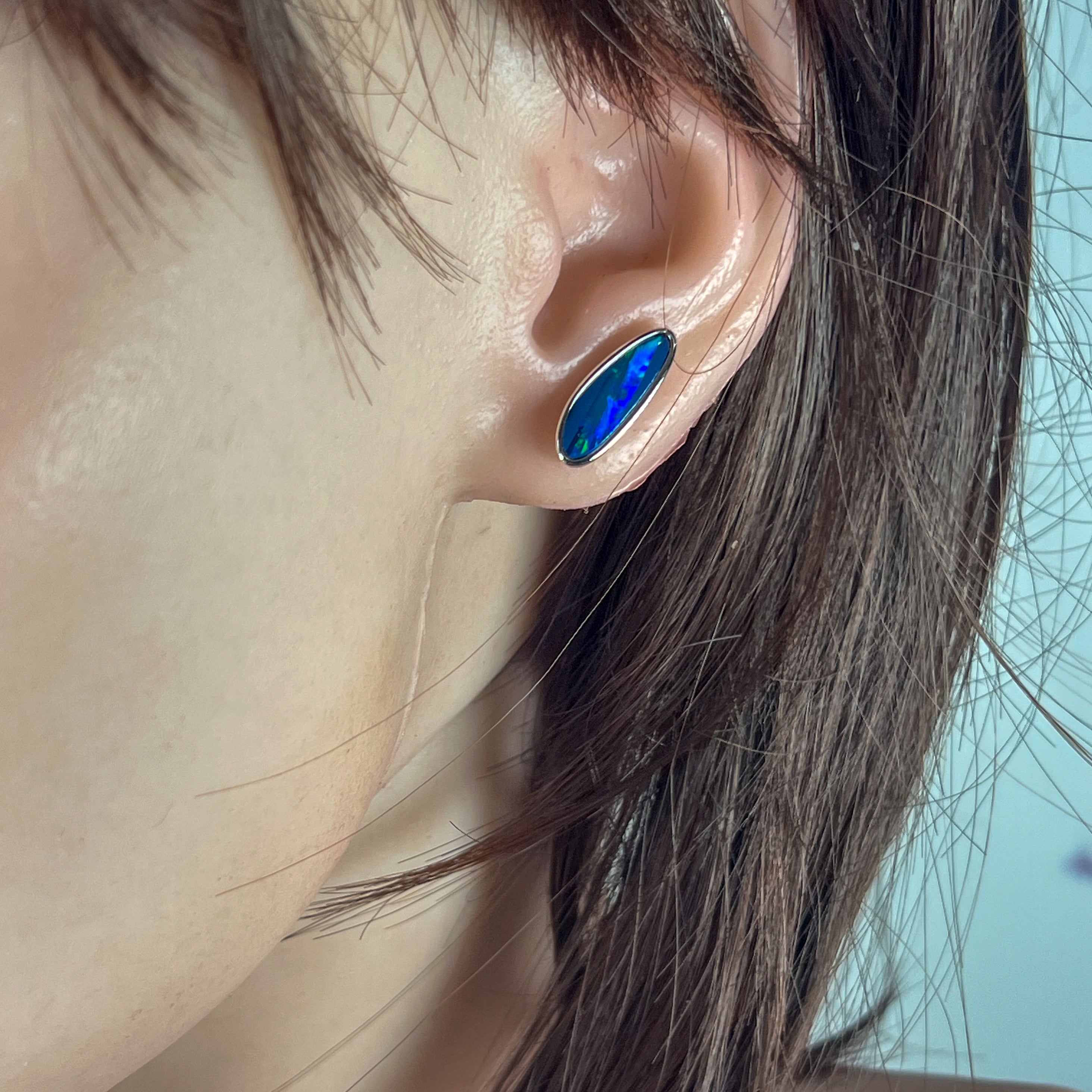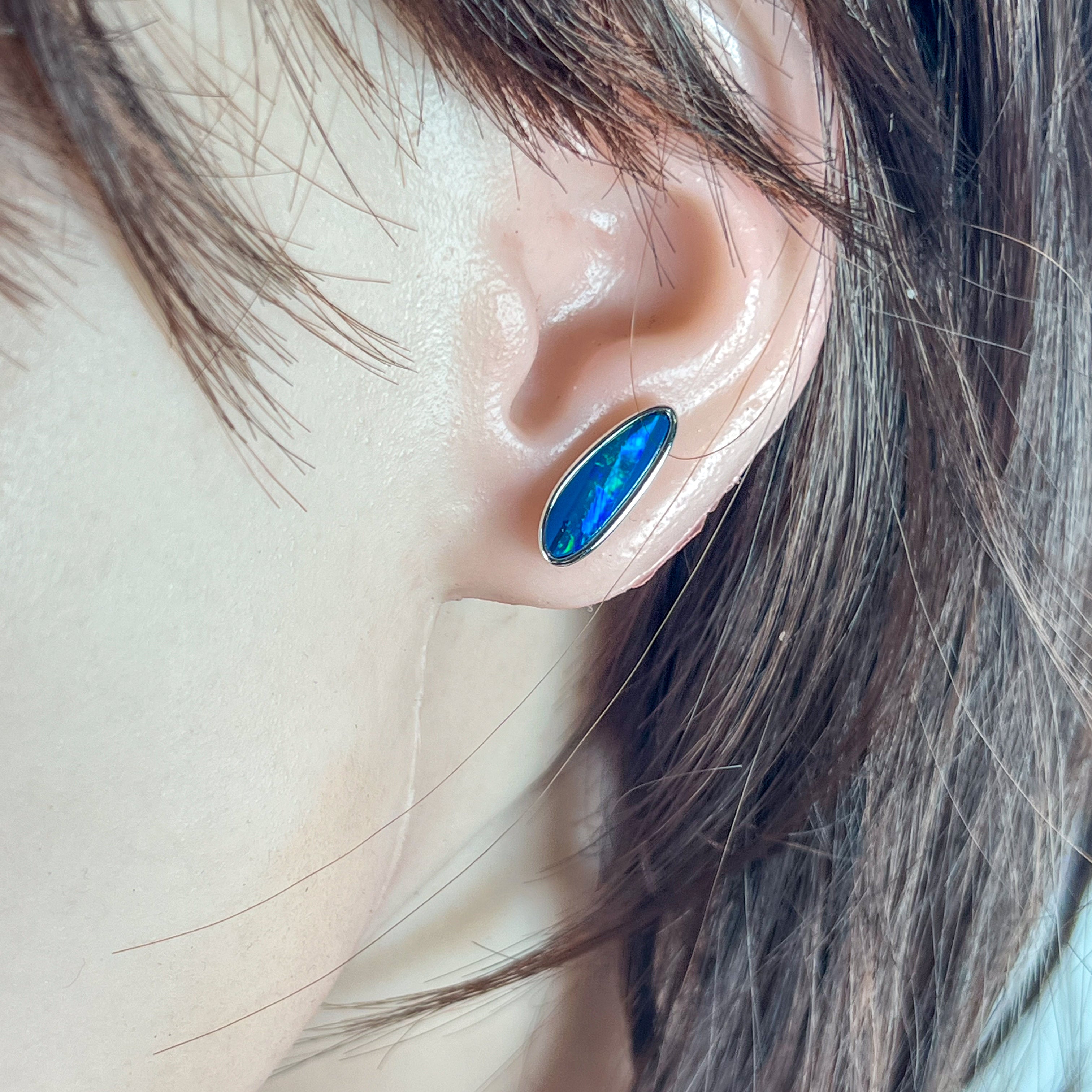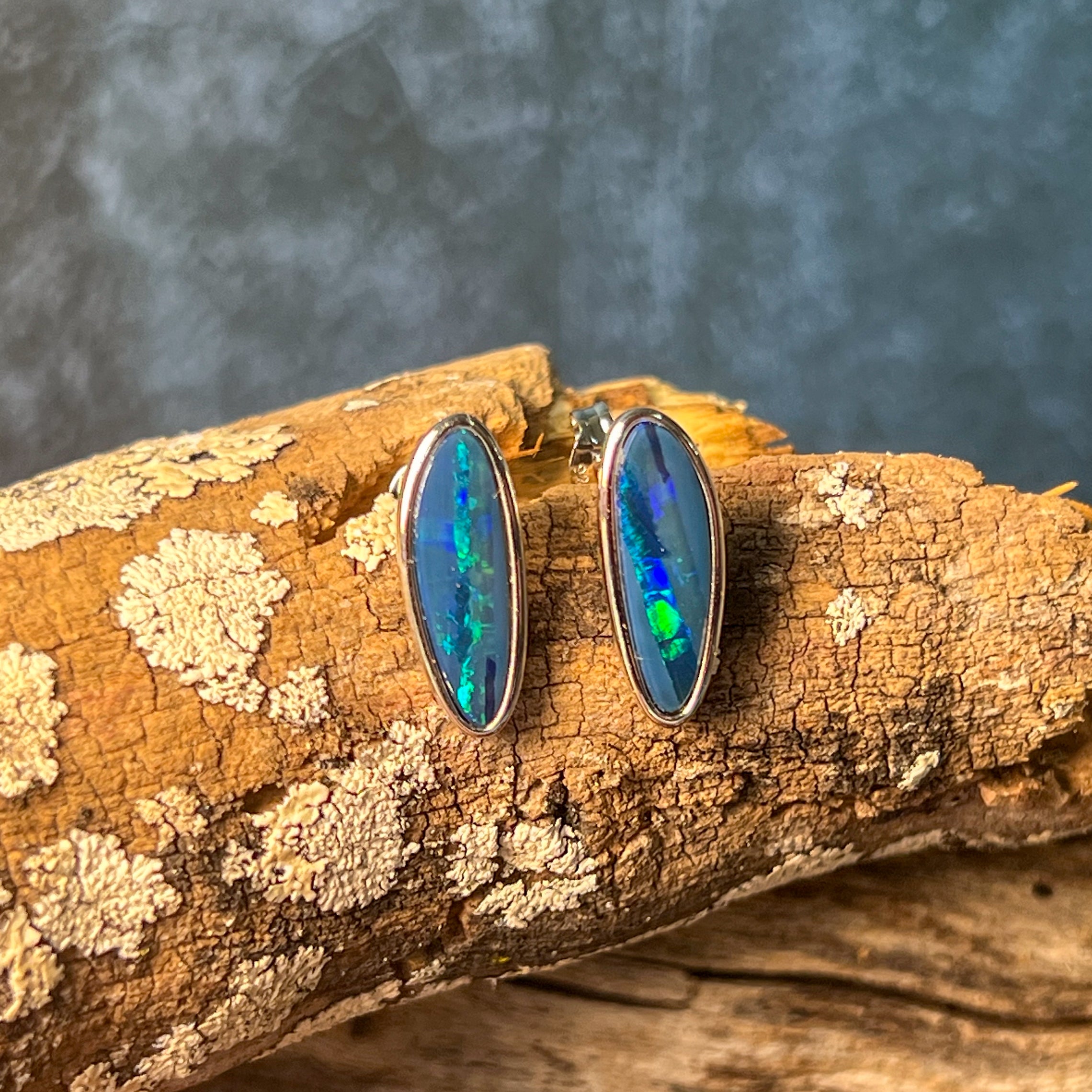 Elevate your elegance with these sterling silver freeform opal doublet earrings, featuring captivating blue-green stripes. Their unique design and rich hues add a refined touch to any ensemble, perfect for those who appreciate subtle sophistication and timeless beauty.