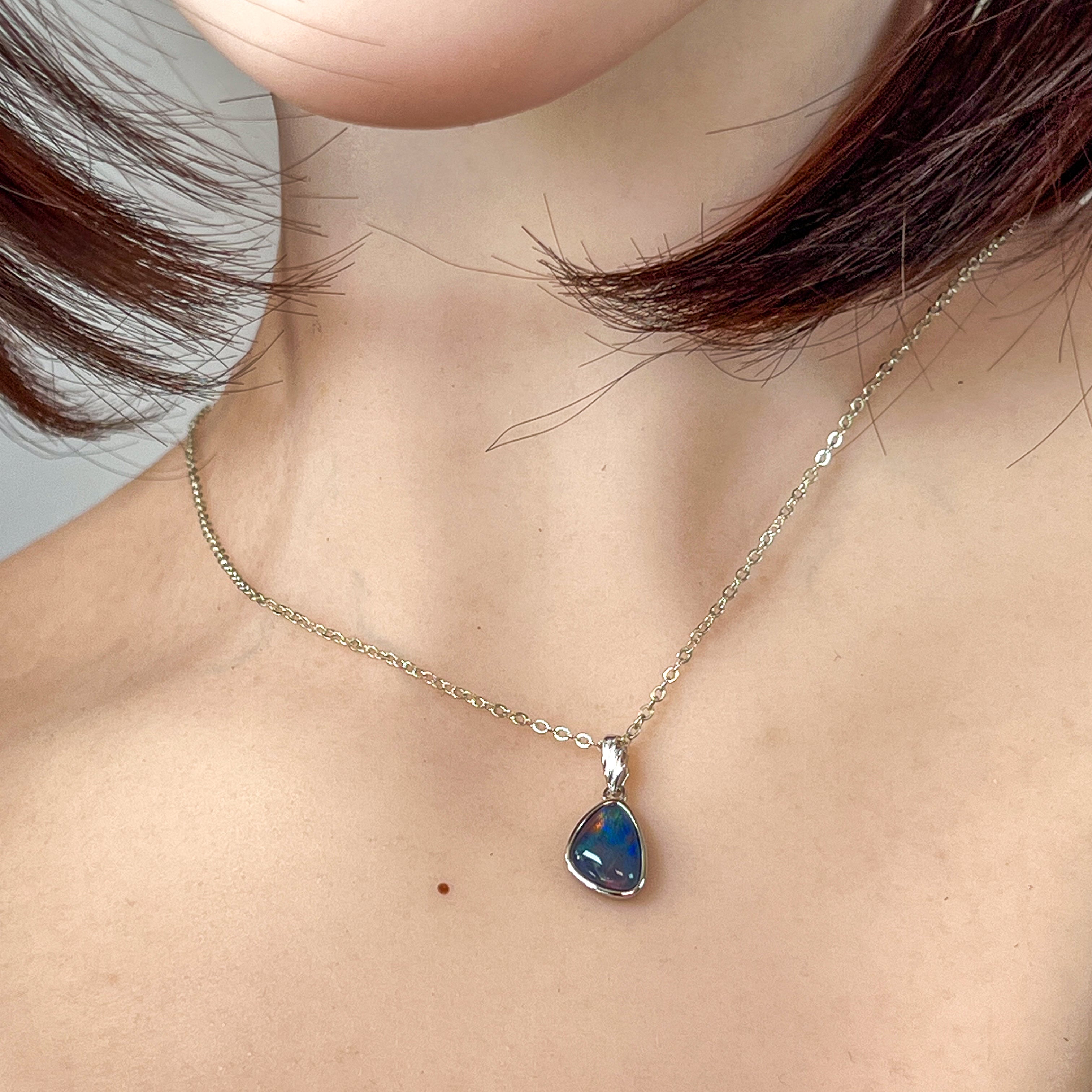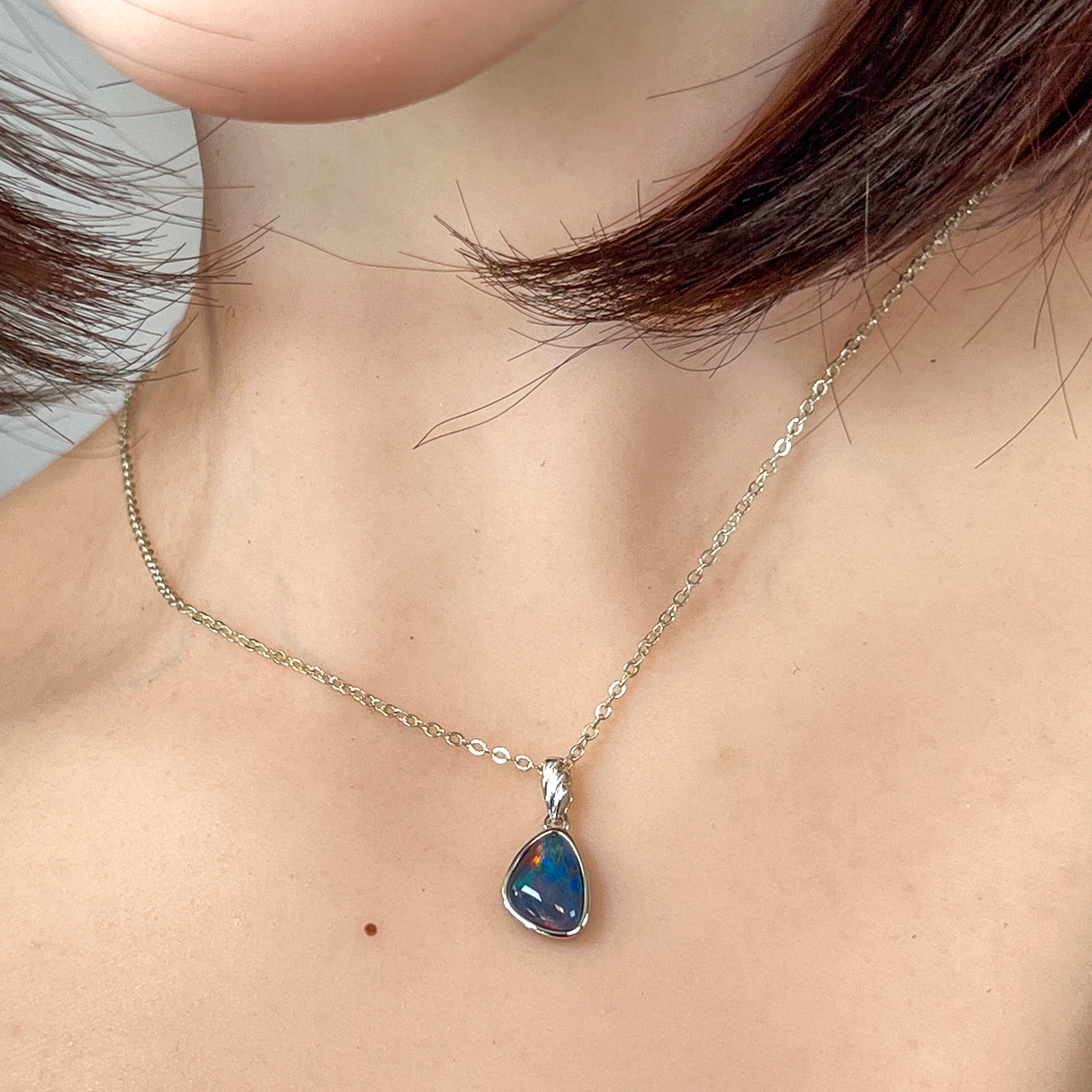 Elevate your elegance with this sterling silver pendant featuring a freeform opal triplet in a striking triangle shape. The vibrant play of bright colors within the opal adds a captivating allure, while the sleek silver setting enhances its sophisticated charm. Perfect for adding a refined touch to any ensemble.