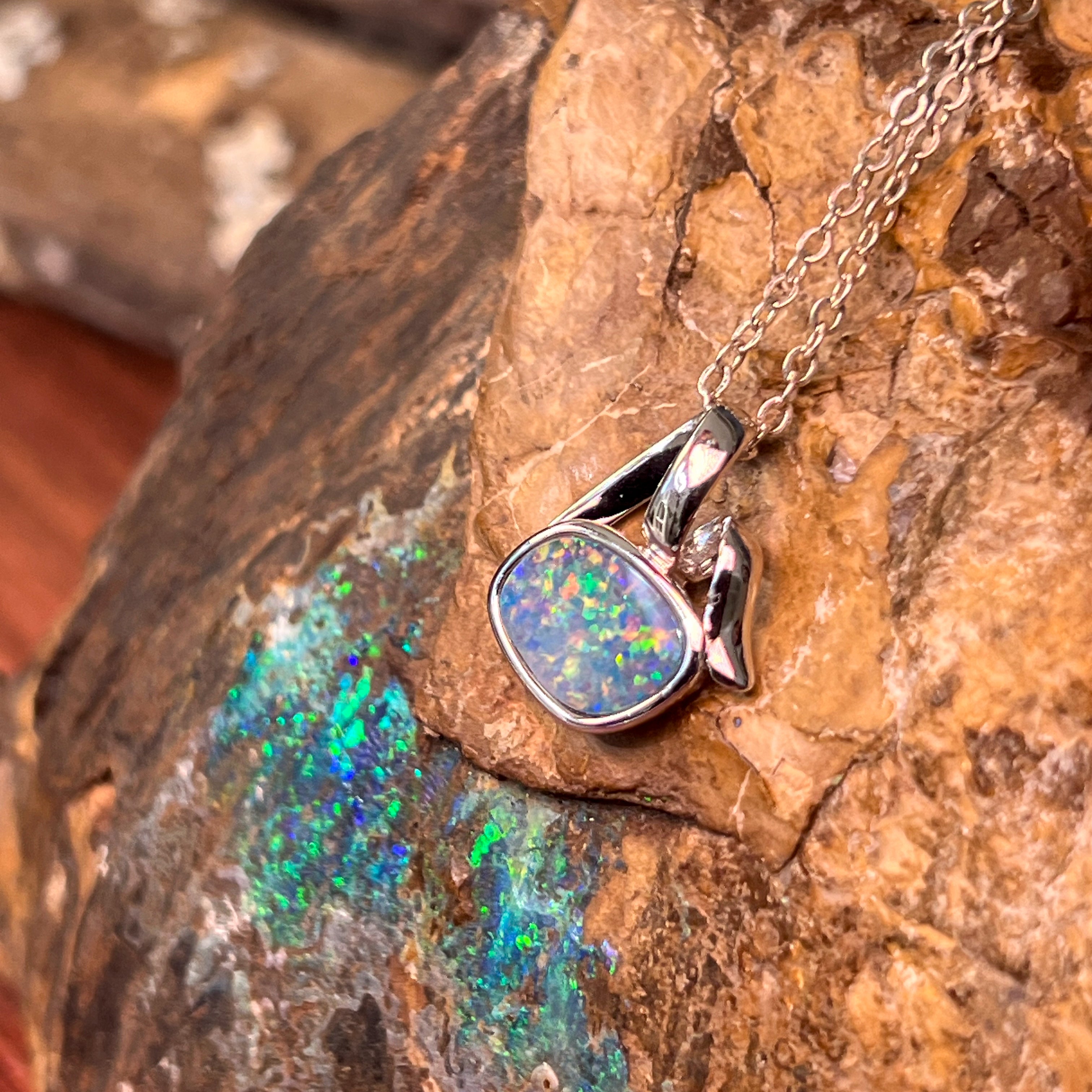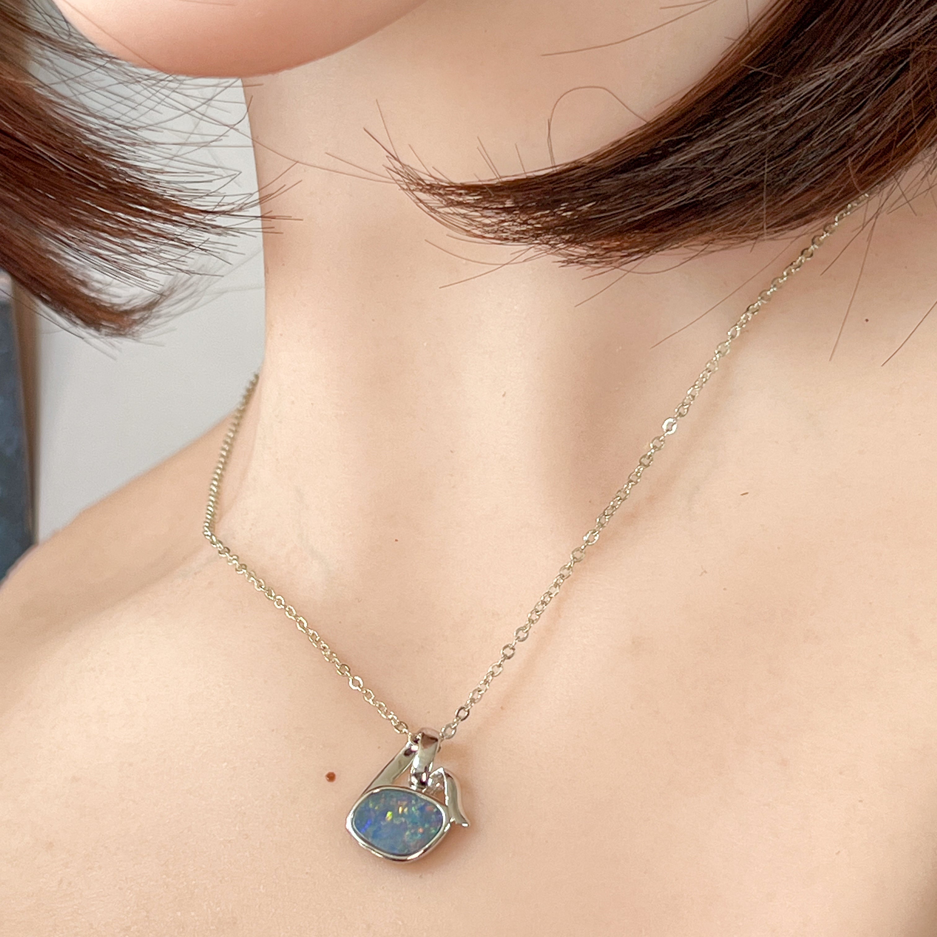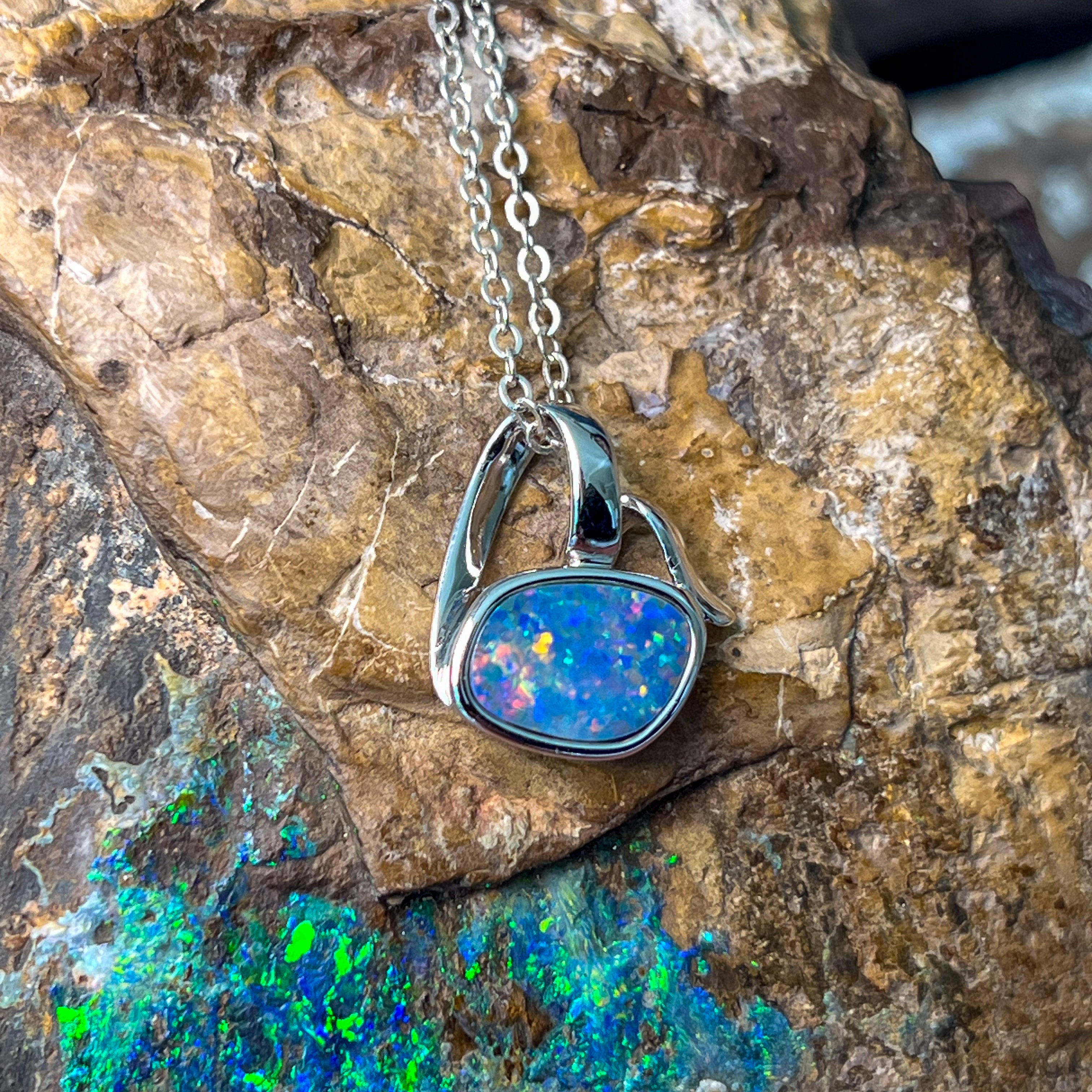 Elevate your style with this sterling silver pendant featuring a horizontal freeform opal doublet. Its modern design combines sleek silver craftsmanship with the unique play of color in the opal, creating a refined accessory that complements both casual and formal looks with understated elegance.