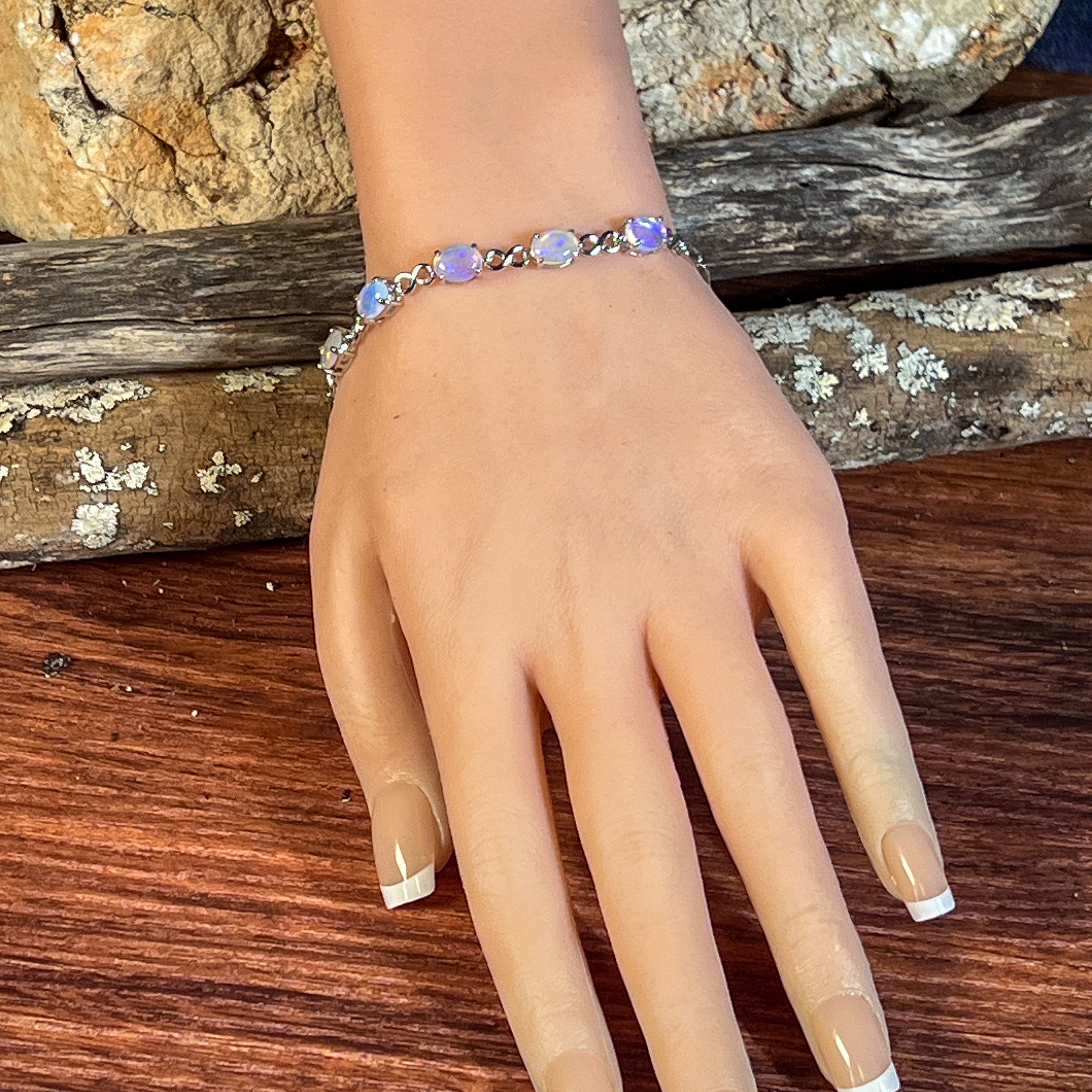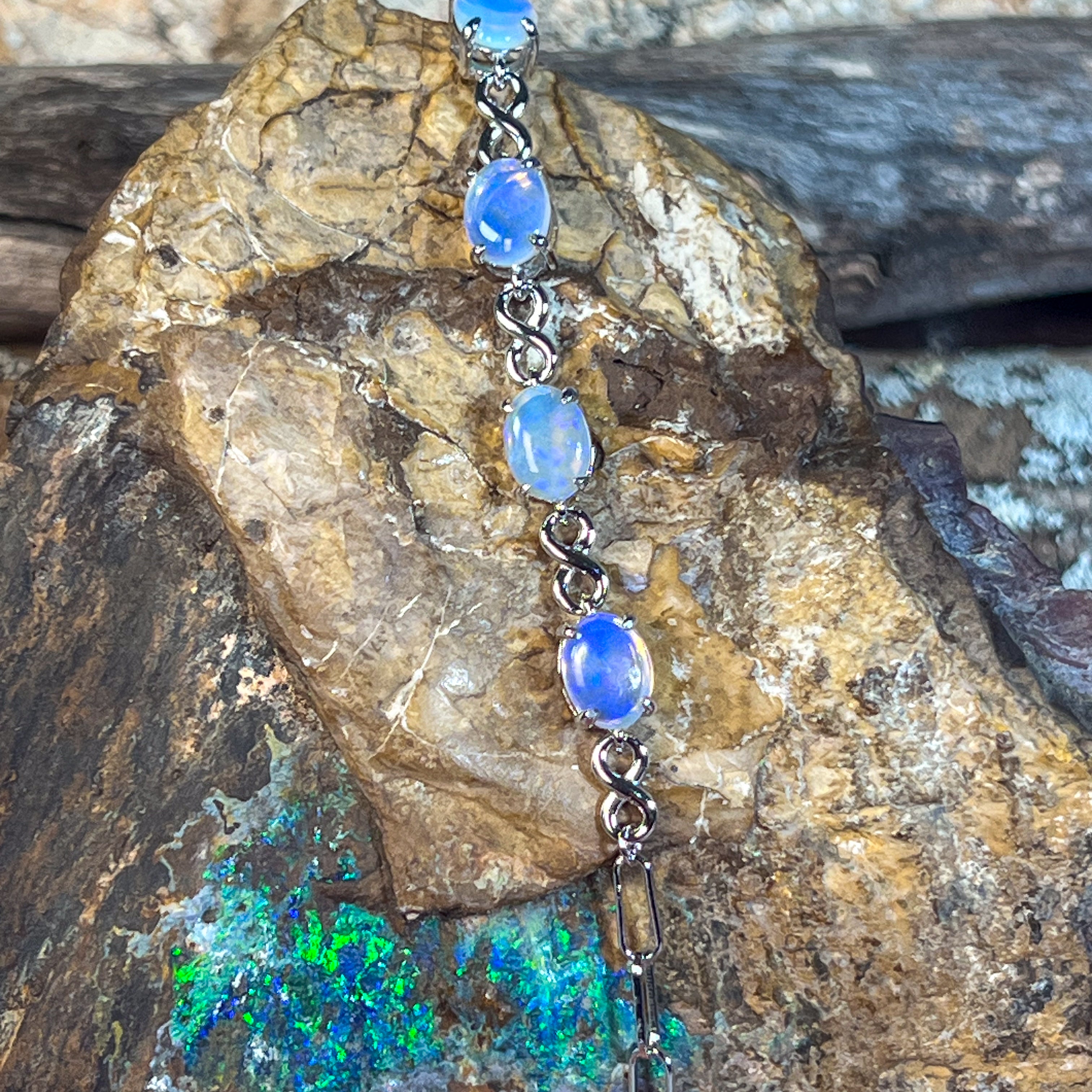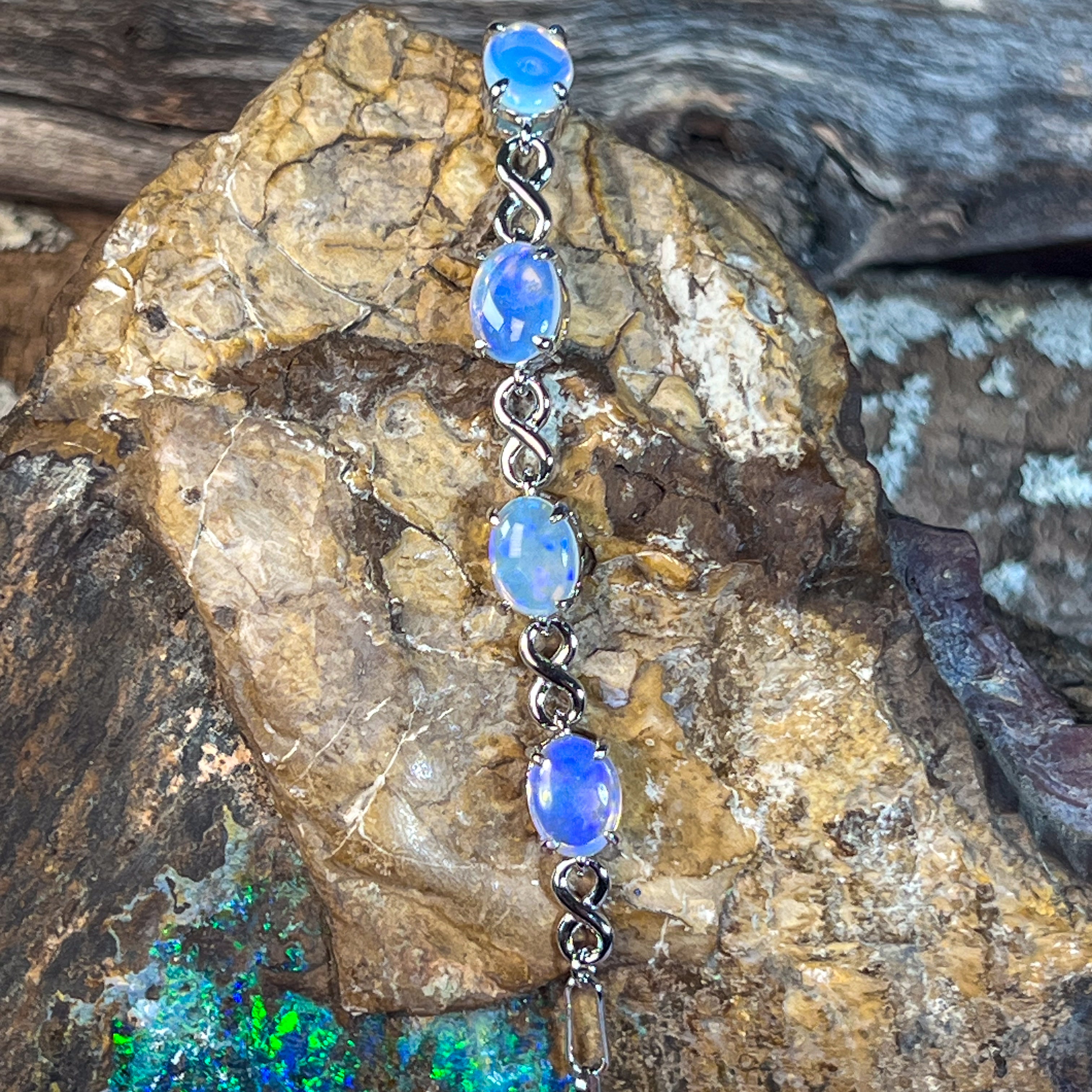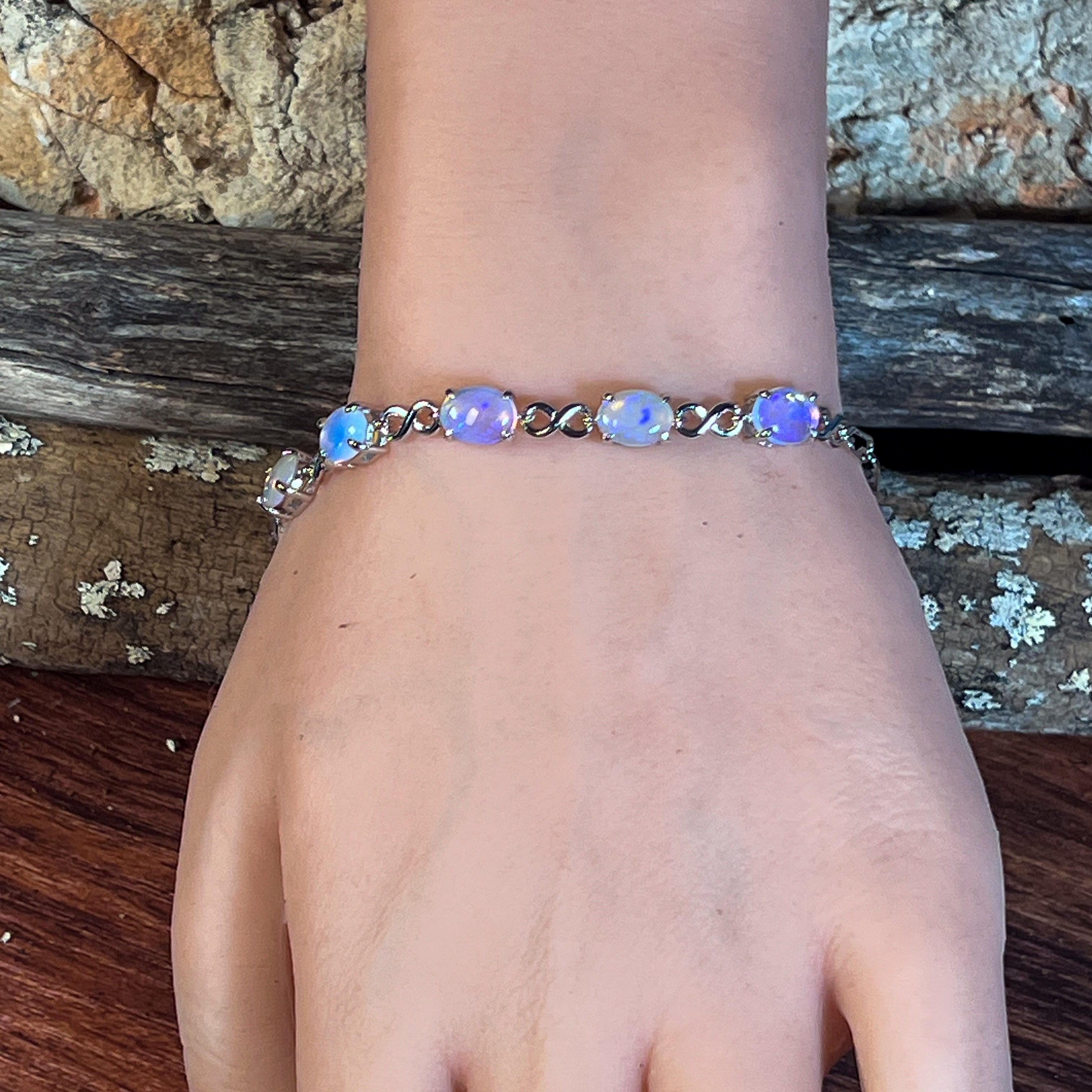 Elevate your style with this sterling silver bracelet featuring a sleek infinity design, symbolizing endless elegance. Adorned with luminous 8x6mm light opals, it captures light beautifully, adding a subtle yet captivating glow to any outfit. Perfect for daily wear or special occasions, this bracelet blends timeless symbolism with modern sophistication.
