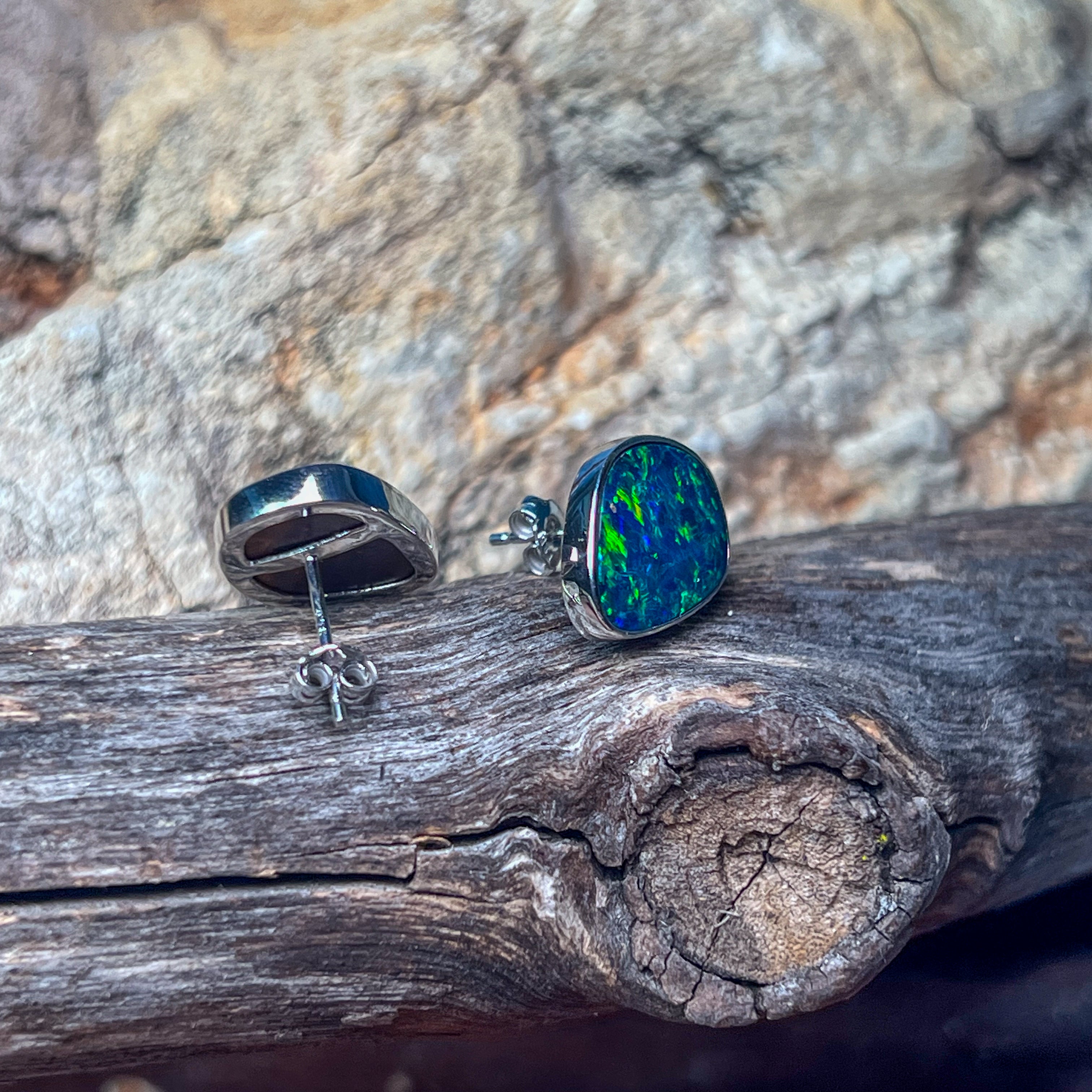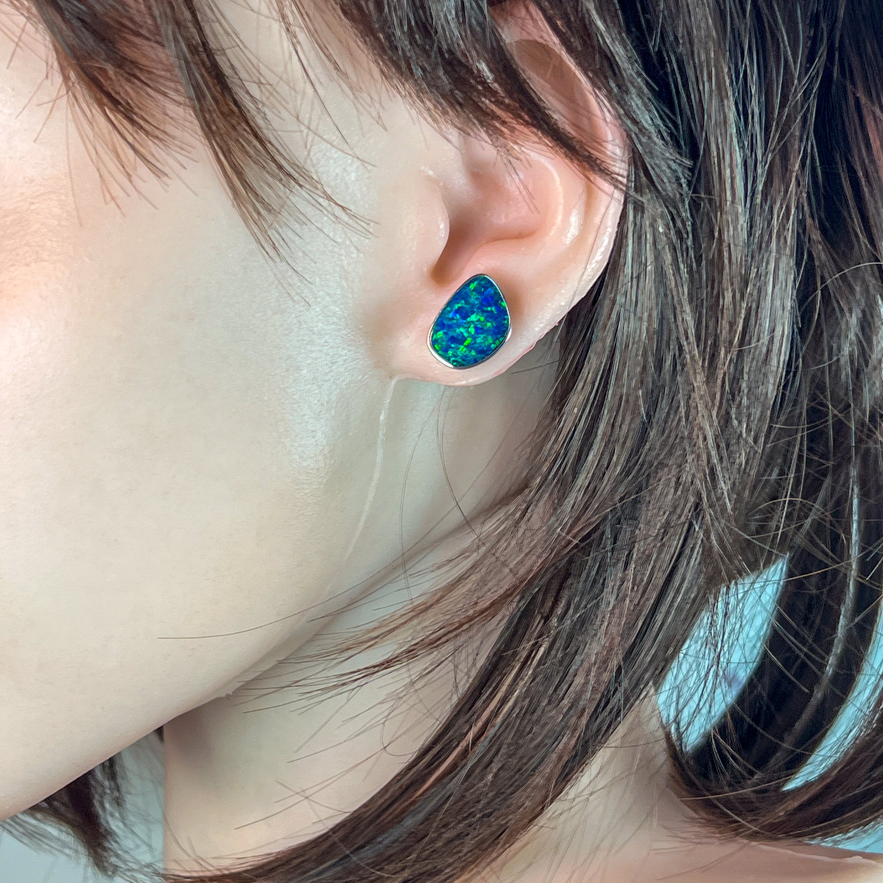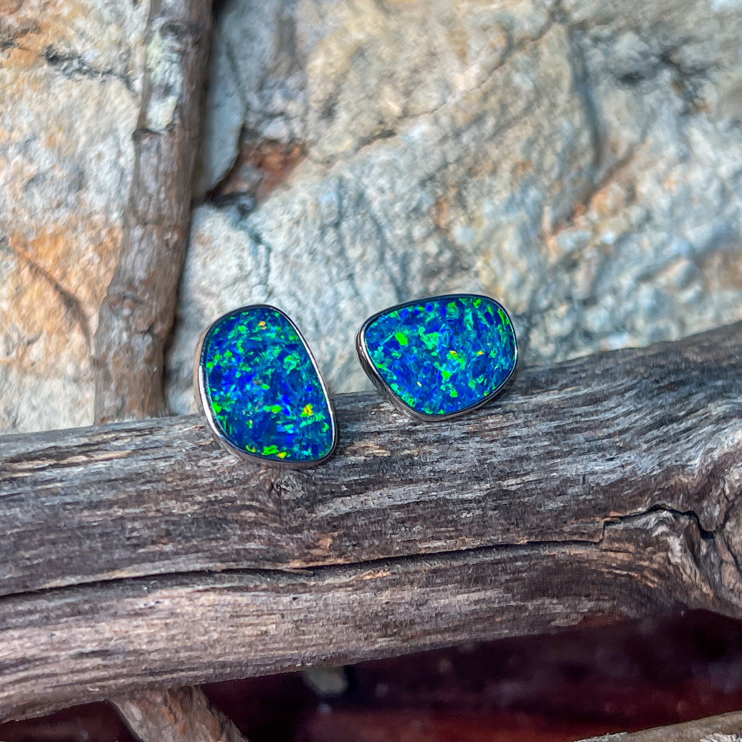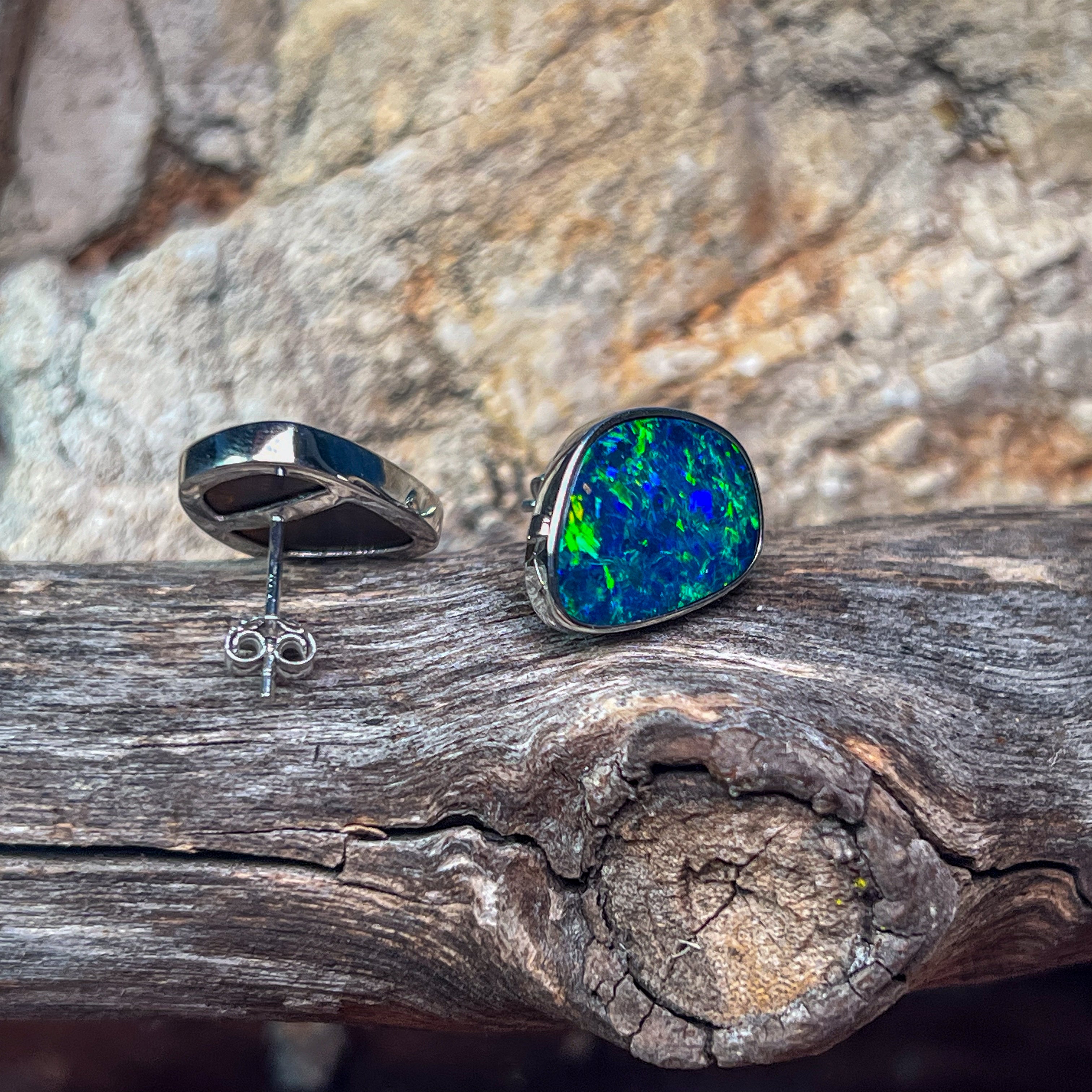 Add a splash of bold elegance with these sterling silver large studs featuring rectangular freeform-shaped opal doublets. Their deep, classic colors catch the light with every move, making your ears the life of the party. Perfect for those who love a playful twist on timeless style!