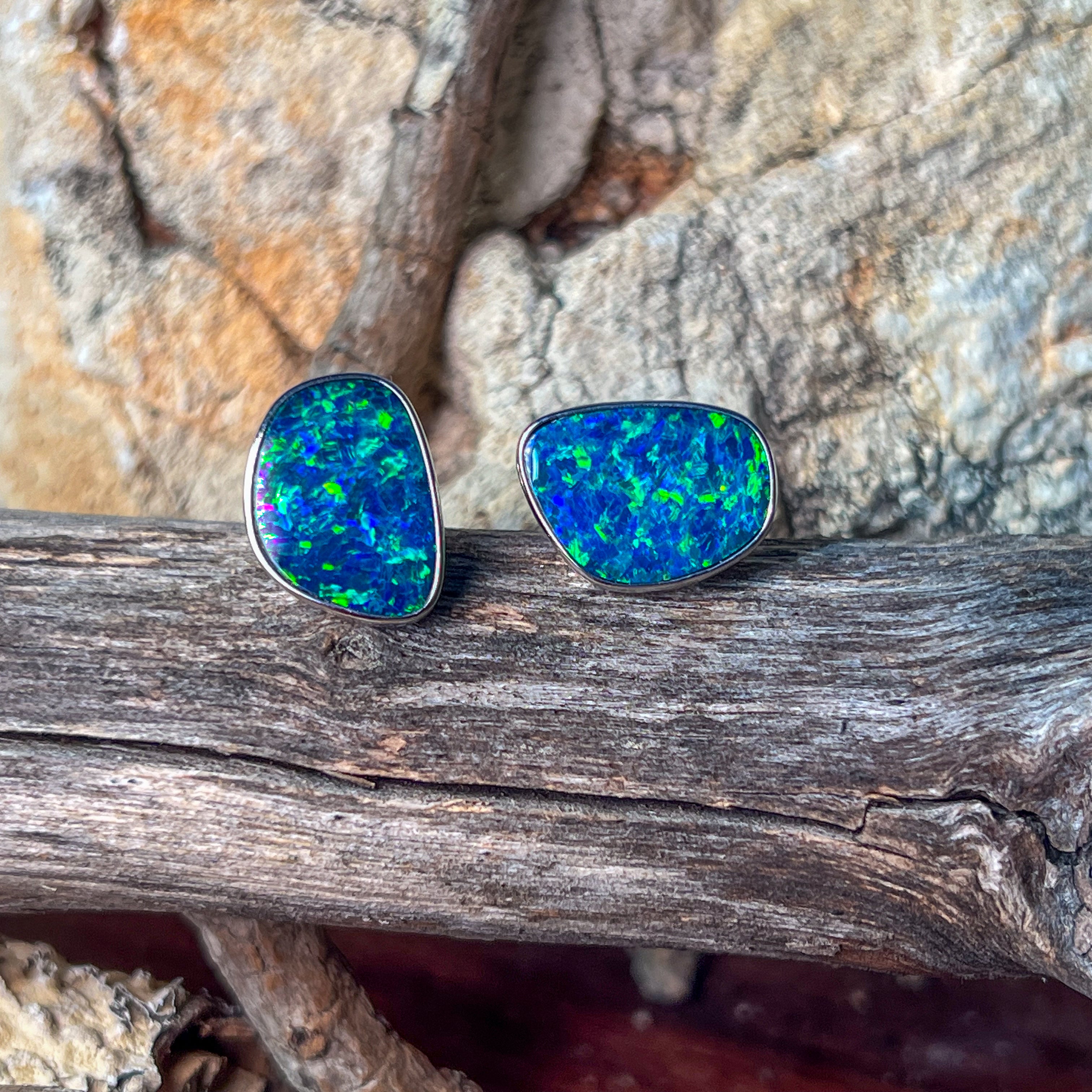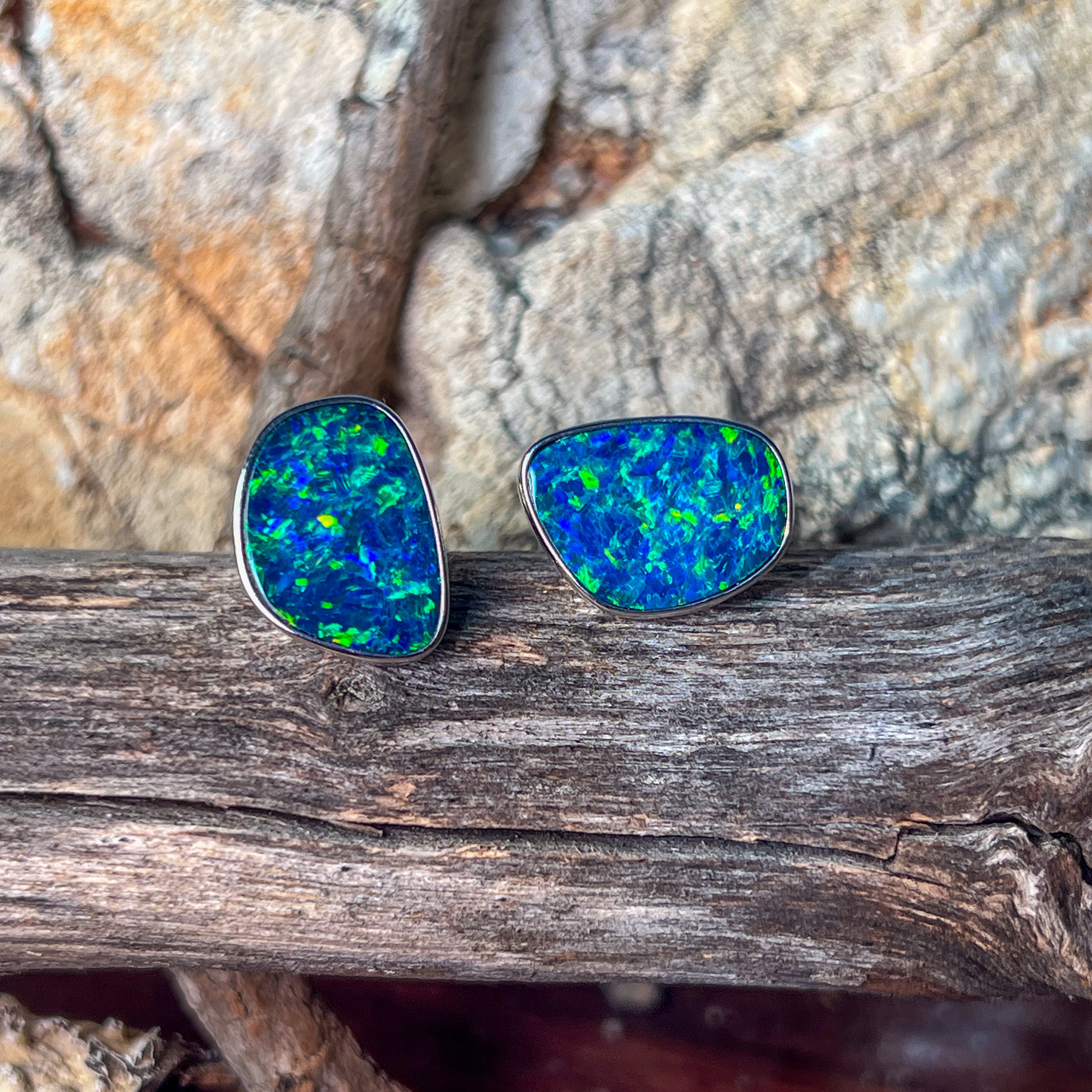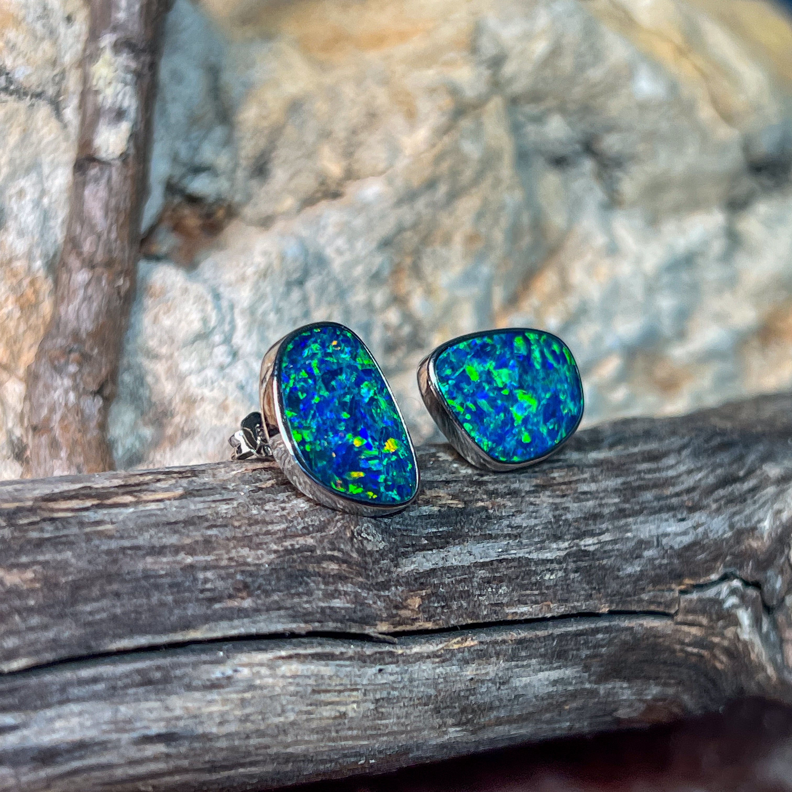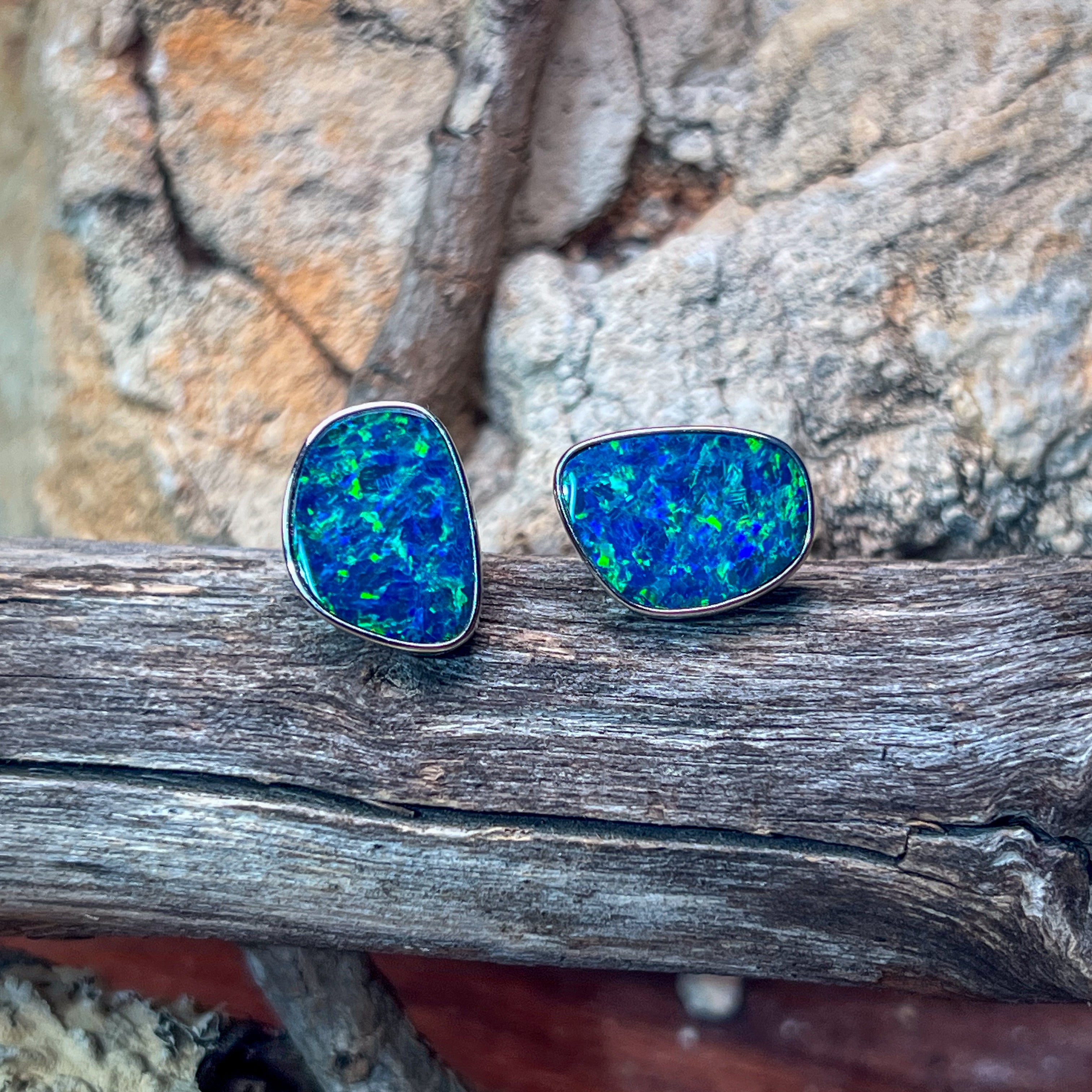 Add a splash of bold elegance with these sterling silver large studs featuring rectangular freeform-shaped opal doublets. Their deep, classic colors catch the light with every move, making your ears the life of the party. Perfect for those who love a playful twist on timeless style!