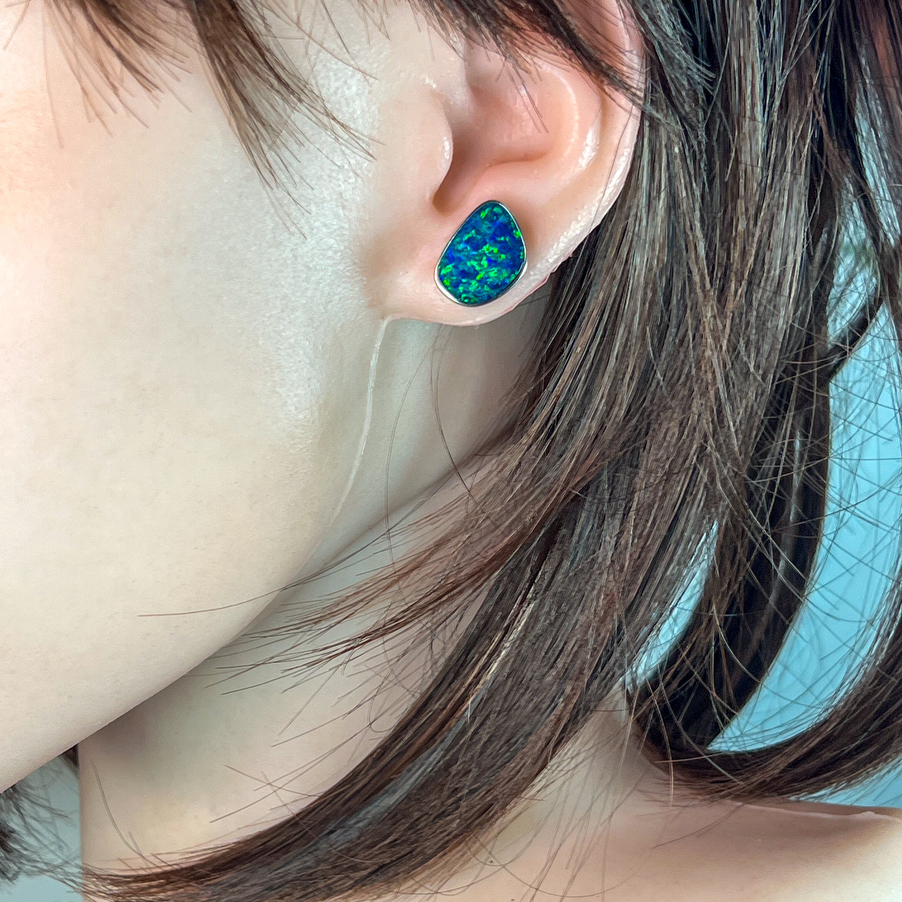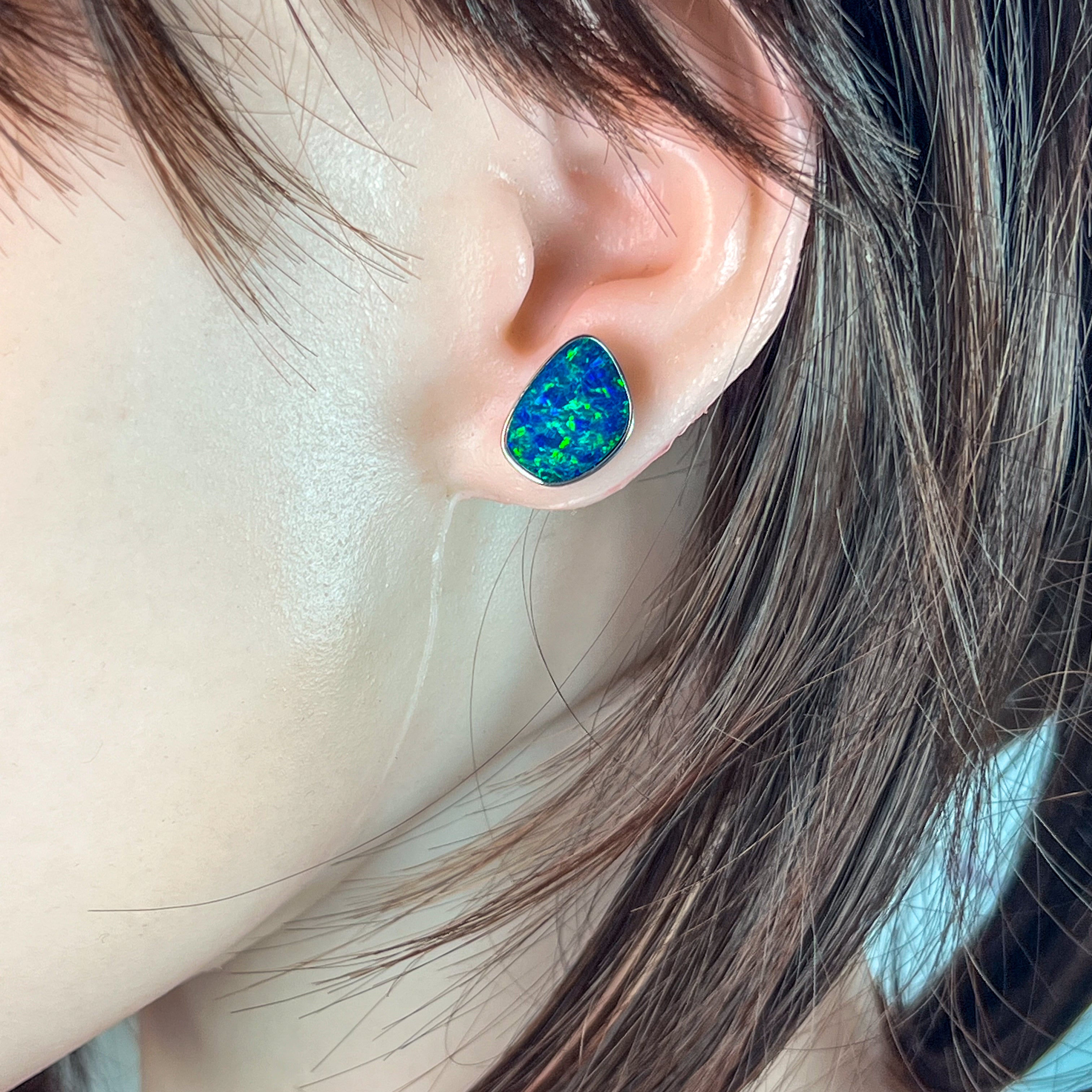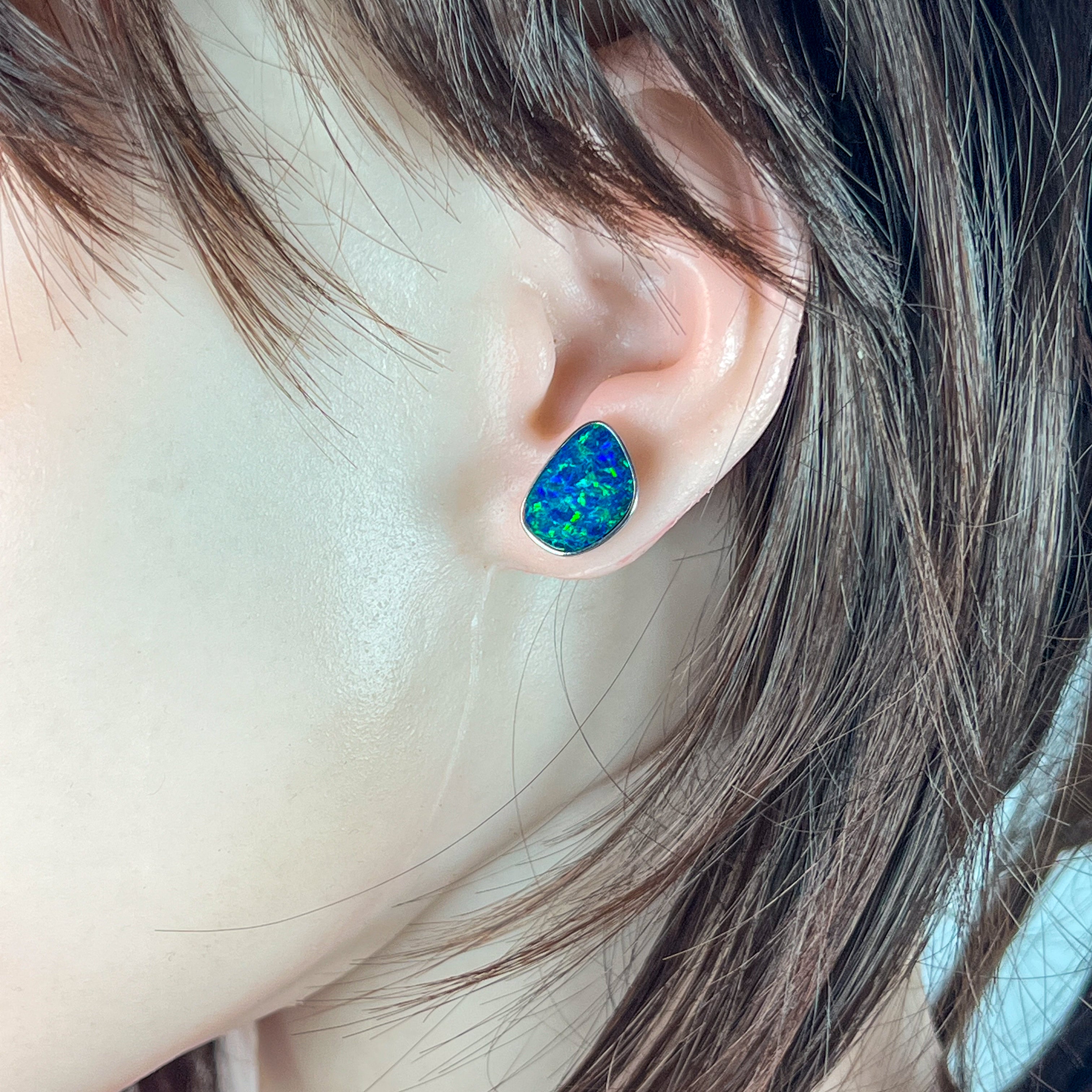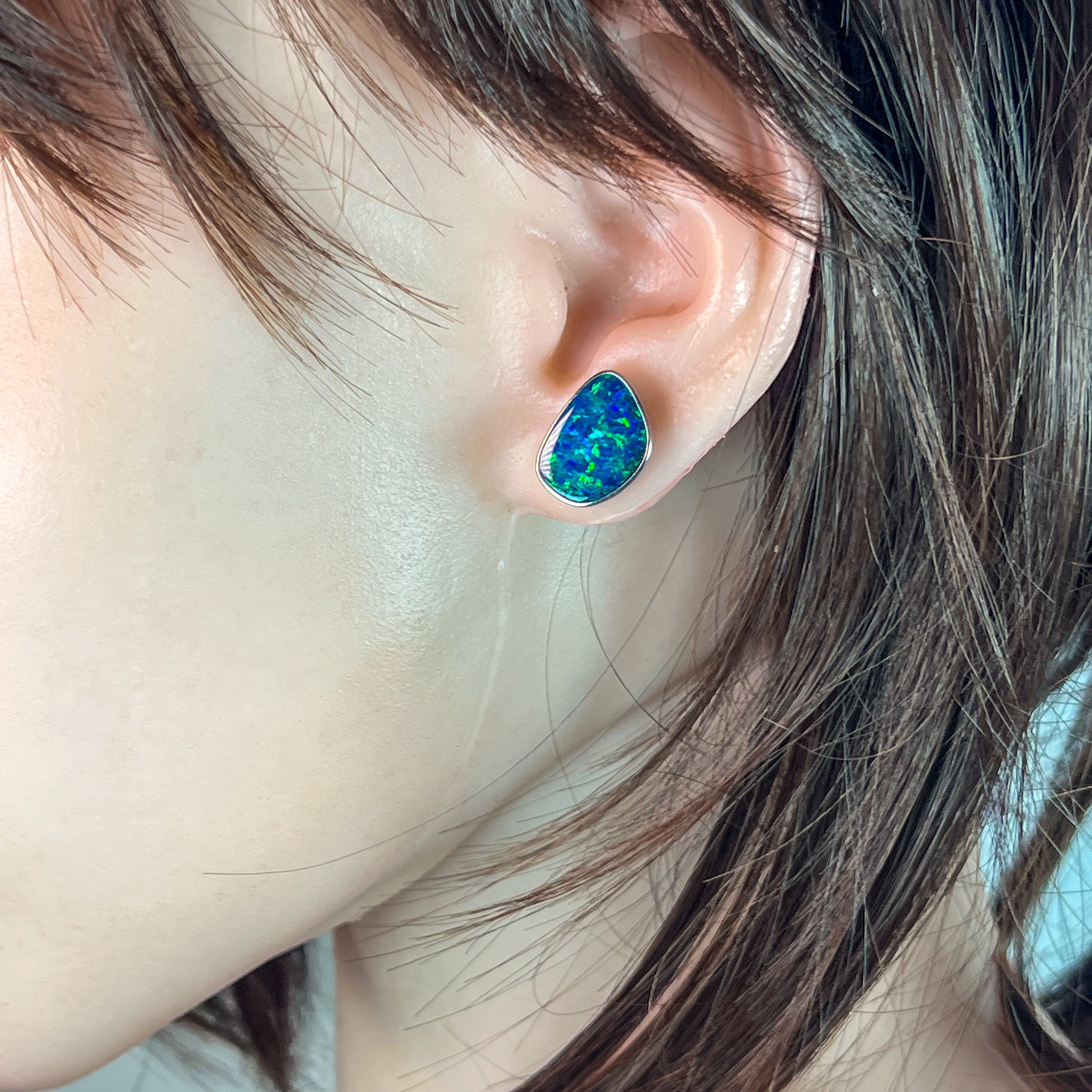 Add a splash of bold elegance with these sterling silver large studs featuring rectangular freeform-shaped opal doublets. Their deep, classic colors catch the light with every move, making your ears the life of the party. Perfect for those who love a playful twist on timeless style!