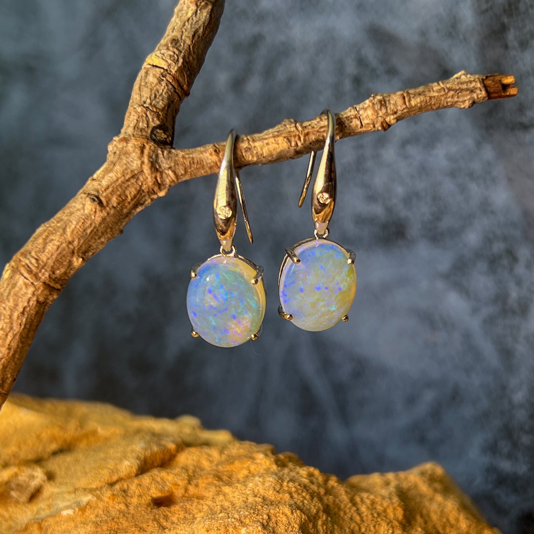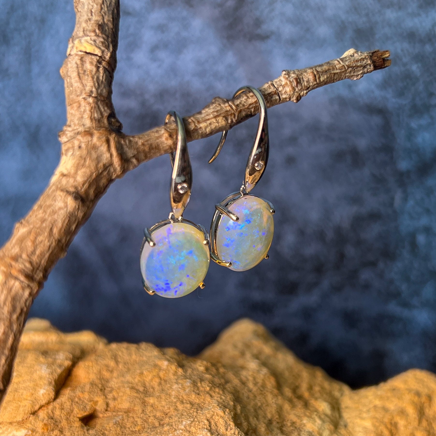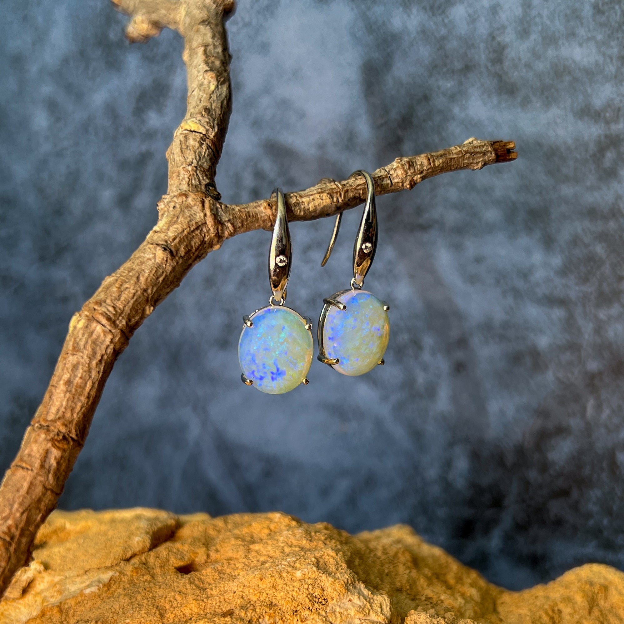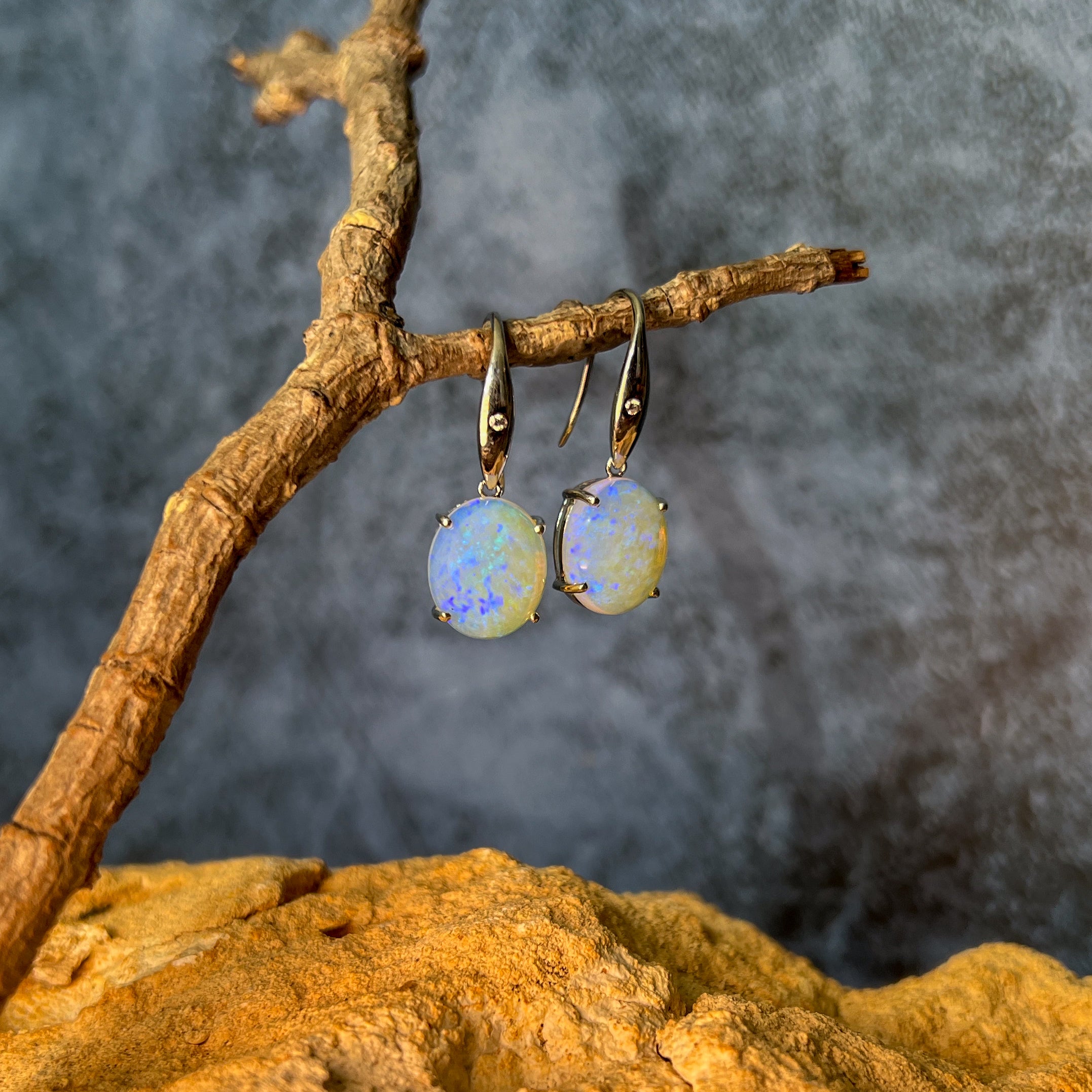 These sterling silver earrings showcase stunning light opals in captivating blue and purple hues. Their oval shape and elegant dangling hook design add a graceful movement that complements any outfit. Perfect for adding a touch of vibrant colour and sophistication to your collection.
