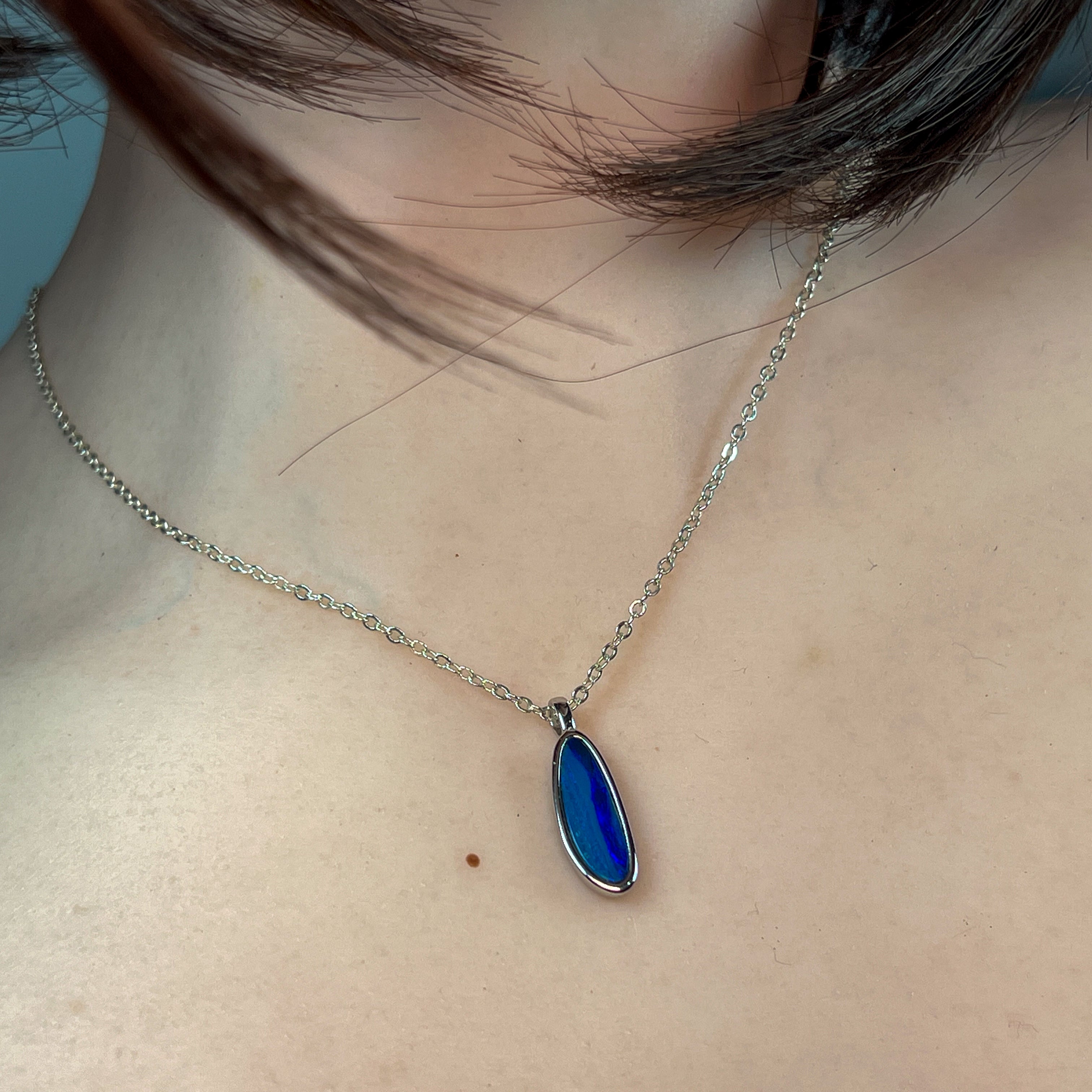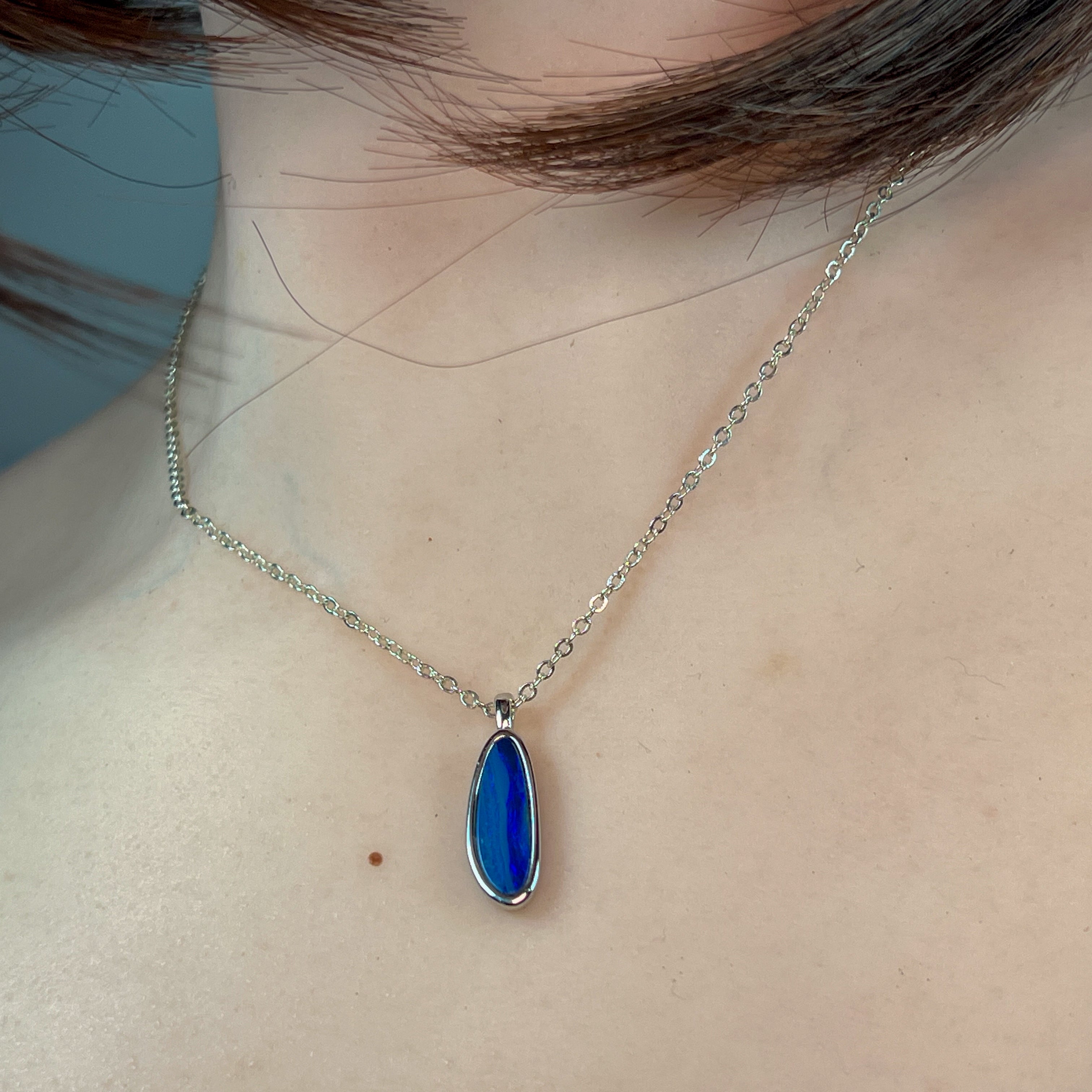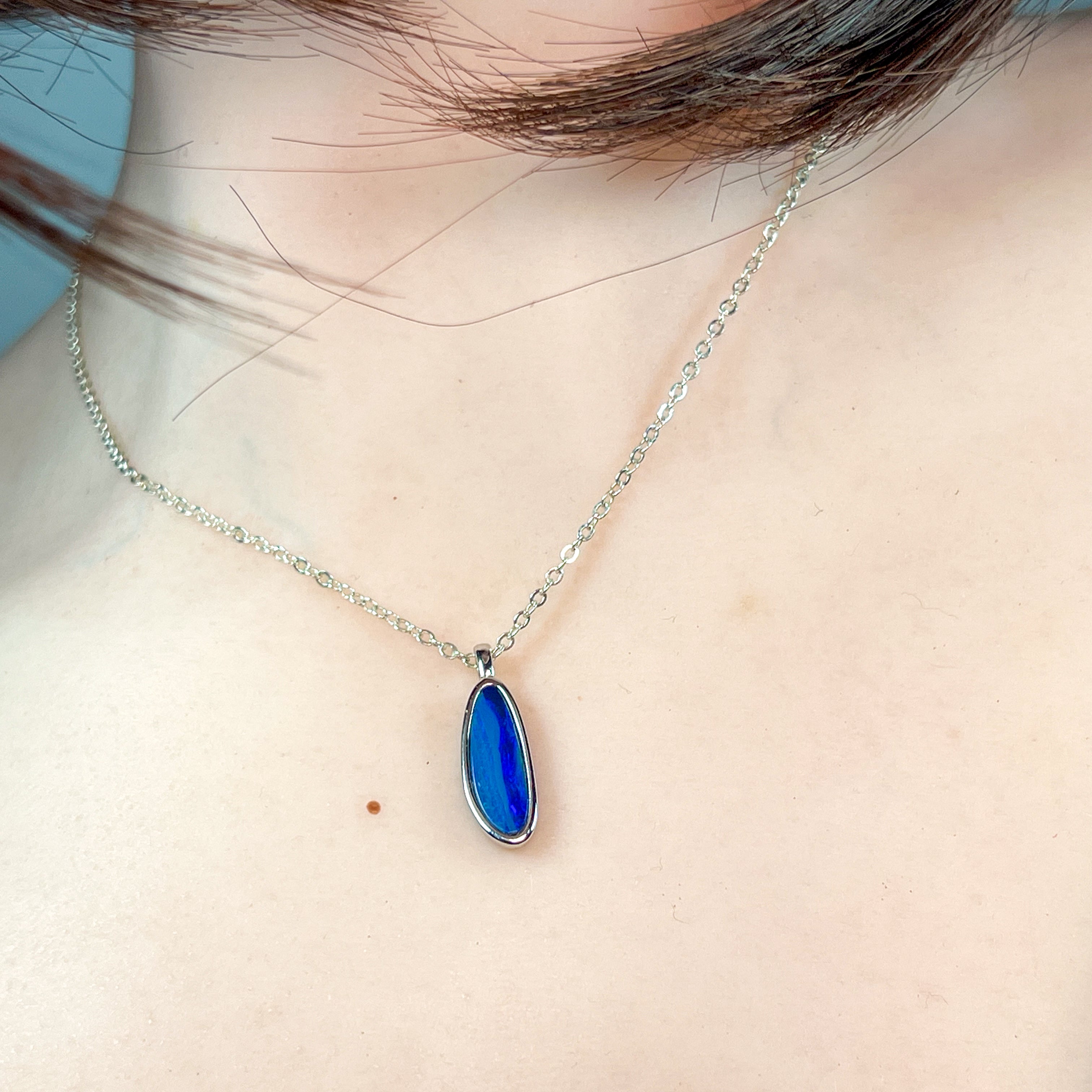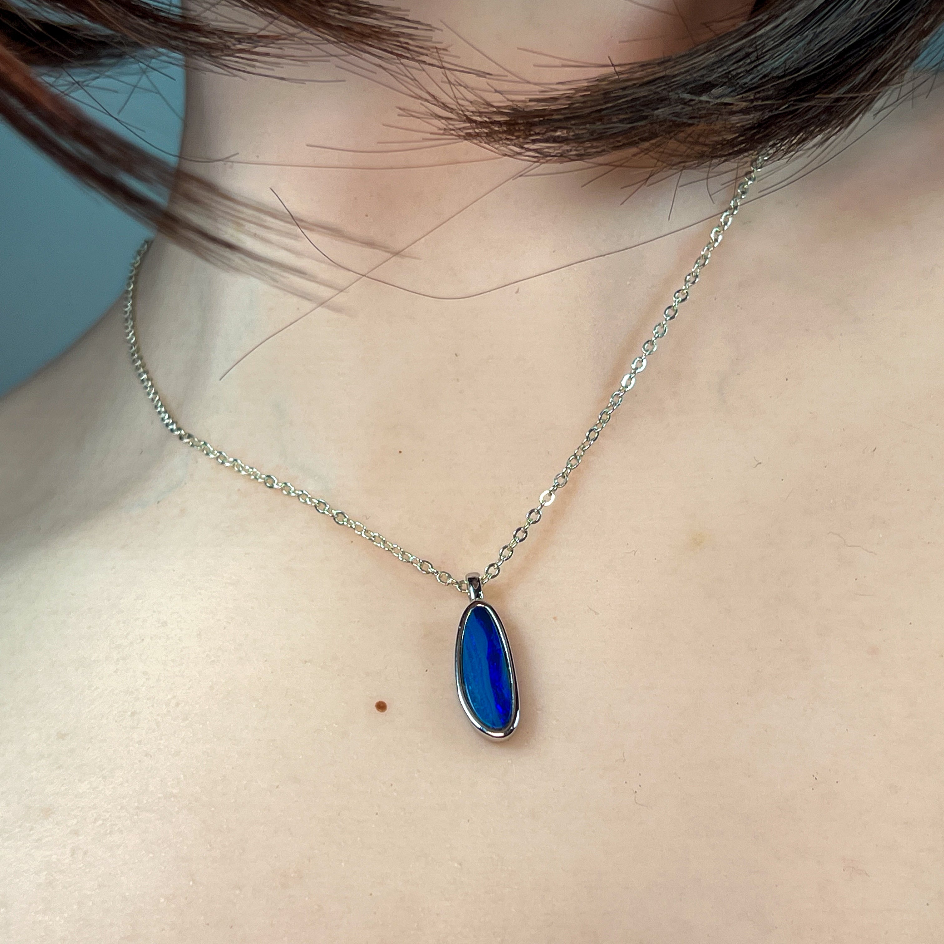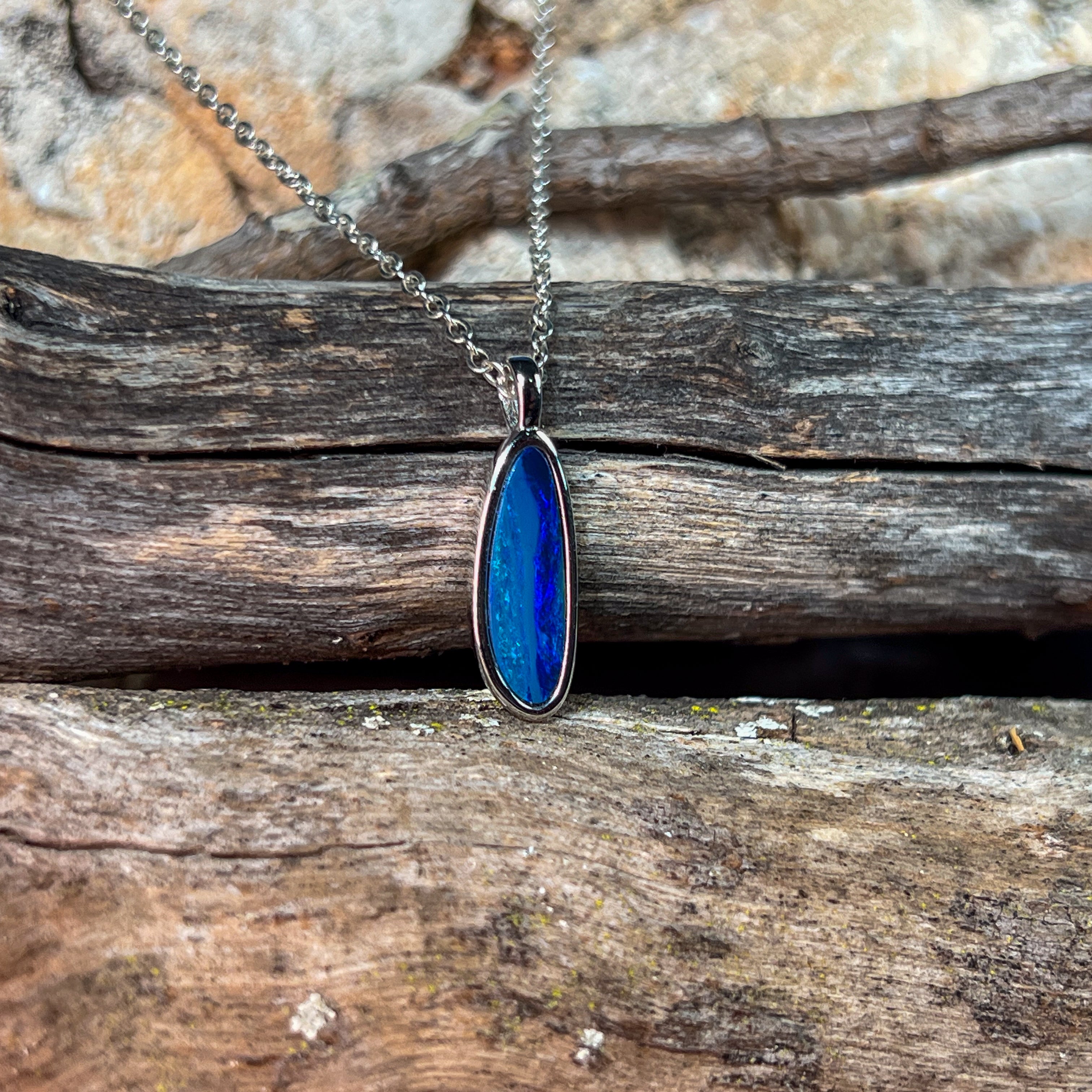 Elongated elegance meets timeless sophistication with this sterling silver pendant featuring a captivating blue-green opal doublet. The drop silhouette creates a graceful line that draws the eye downward, while the opal's mesmerizing play of colour adds depth and movement to any ensemble. Crafted in quality sterling silver, this piece combines durability with refined beauty. Perfect for those seeking a statement pendant that transitions effortlessly from day to evening wear, this design celebrates the natural artistry of opal in a contemporary style that never goes out of fashion.