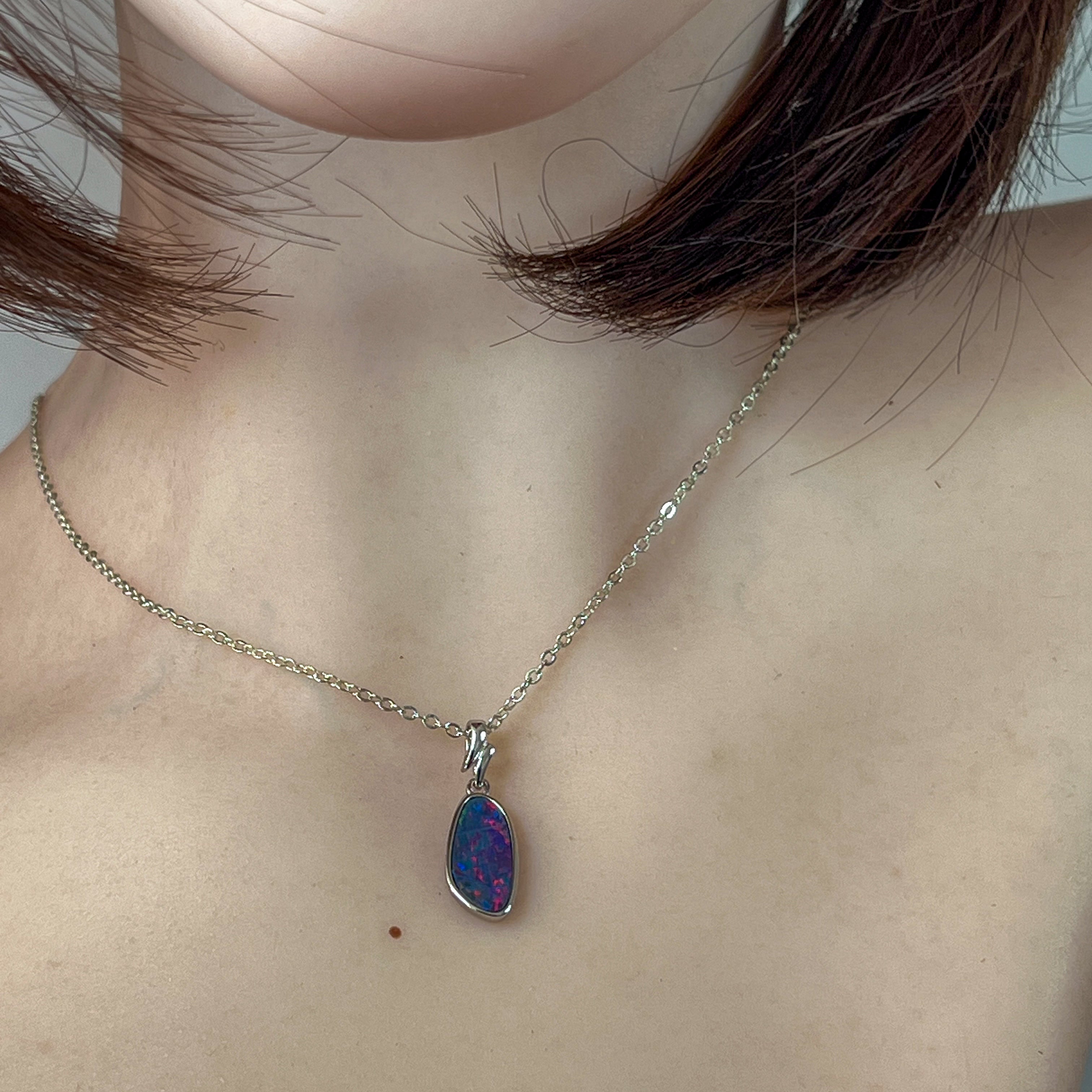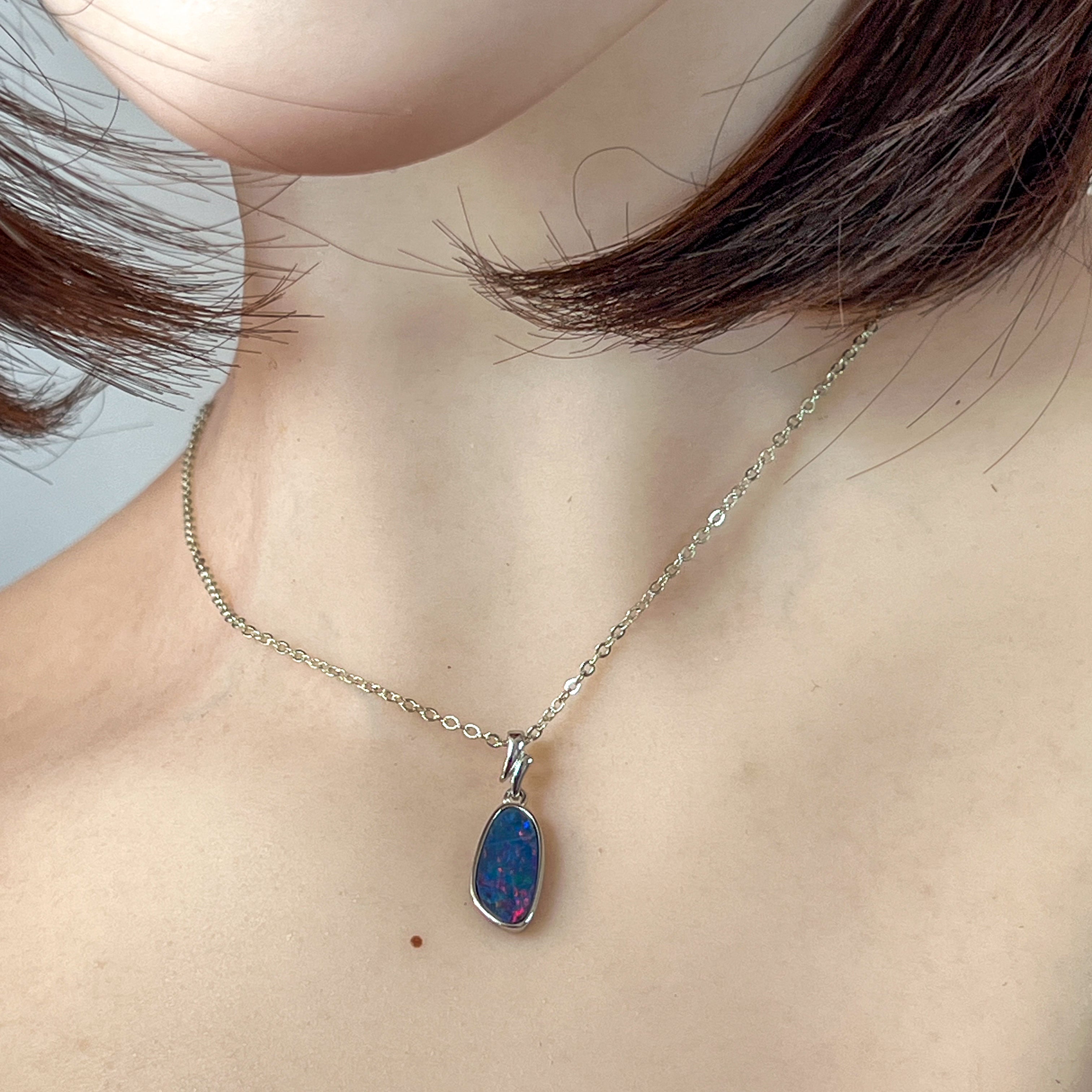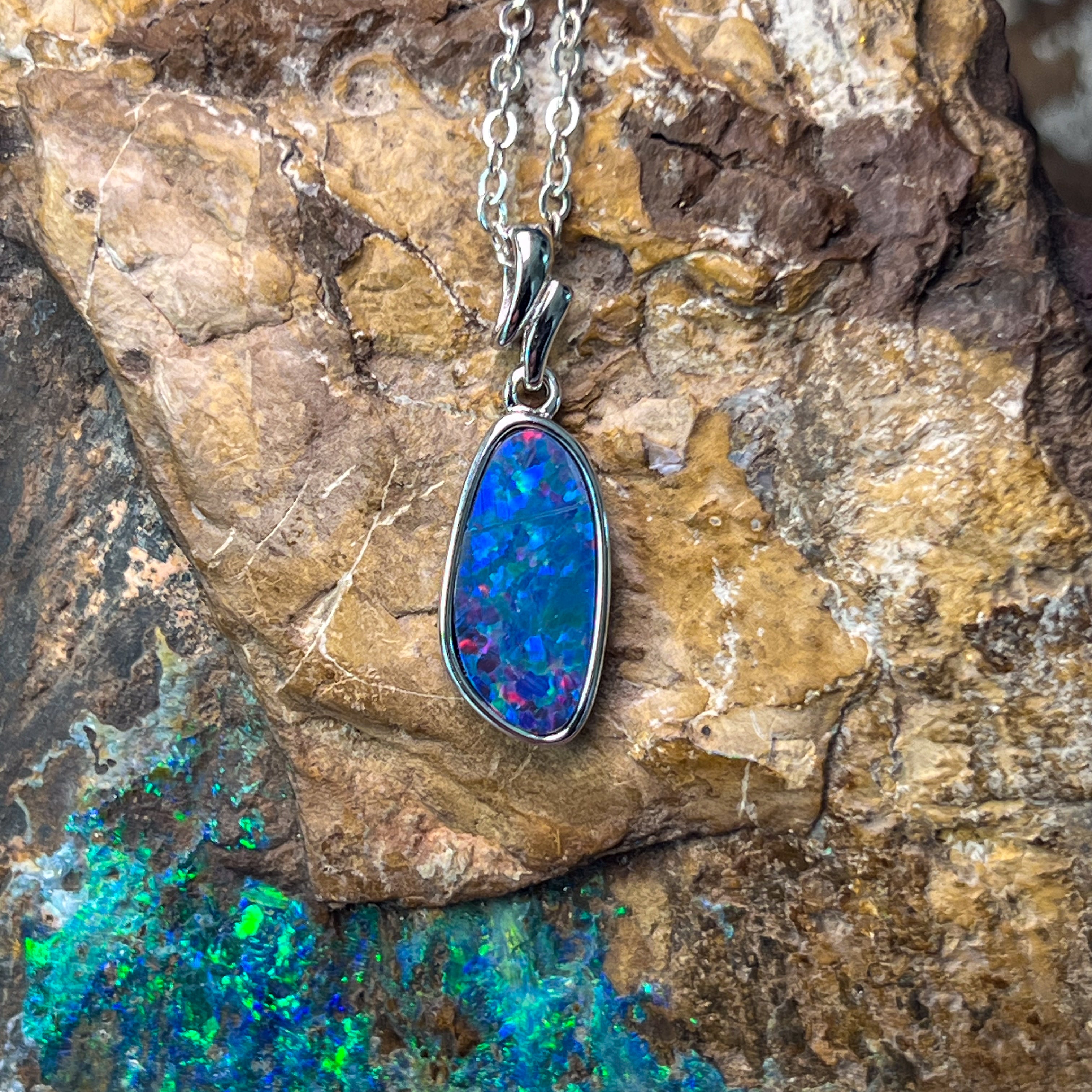 Elevate your elegance with this sterling silver pendant featuring a long, freeform doublet opal. Its fiery red and blue hues create a captivating play of color, making it a striking statement piece. Perfect for adding a refined touch to any ensemble, this pendant combines artistry and sophistication in one exquisite design.