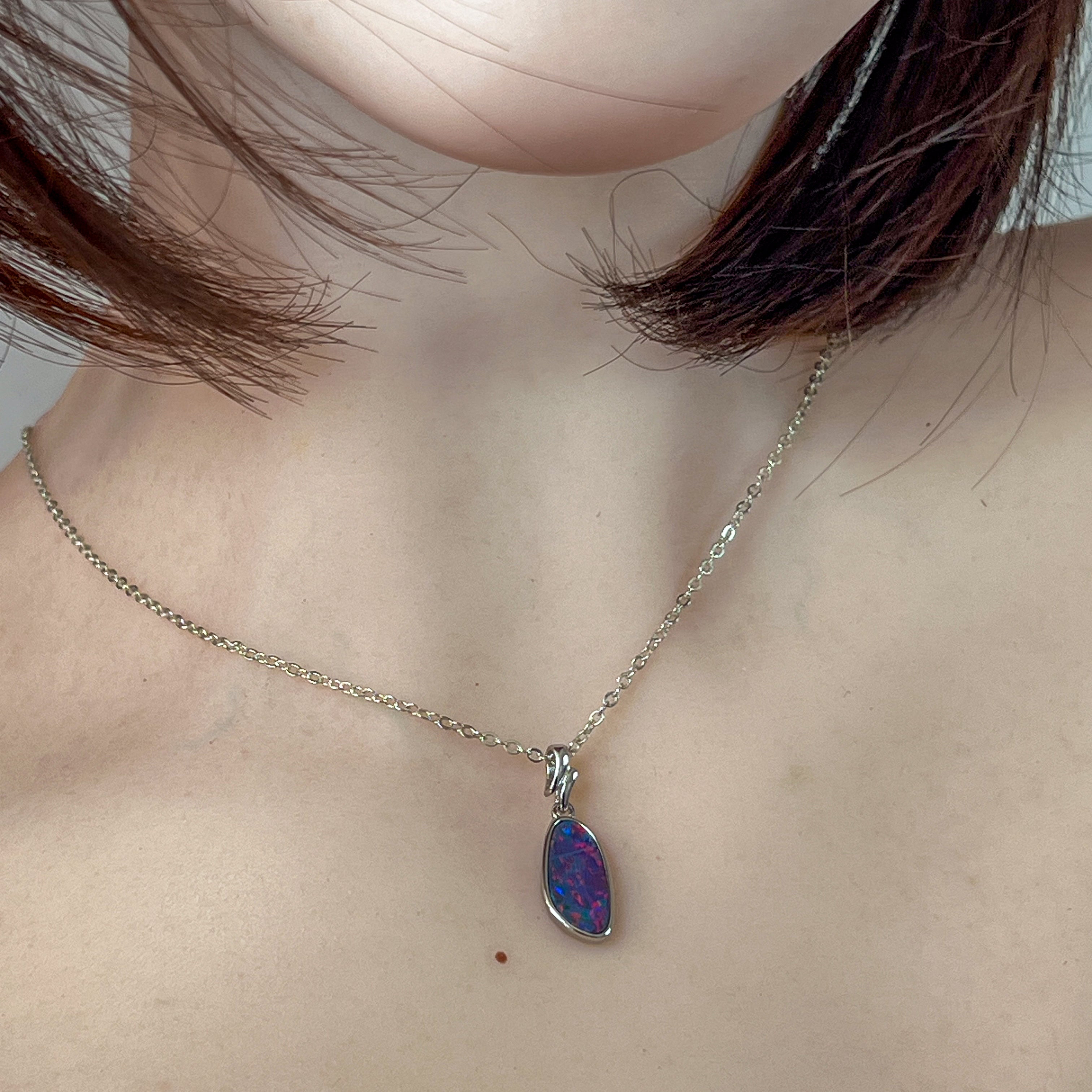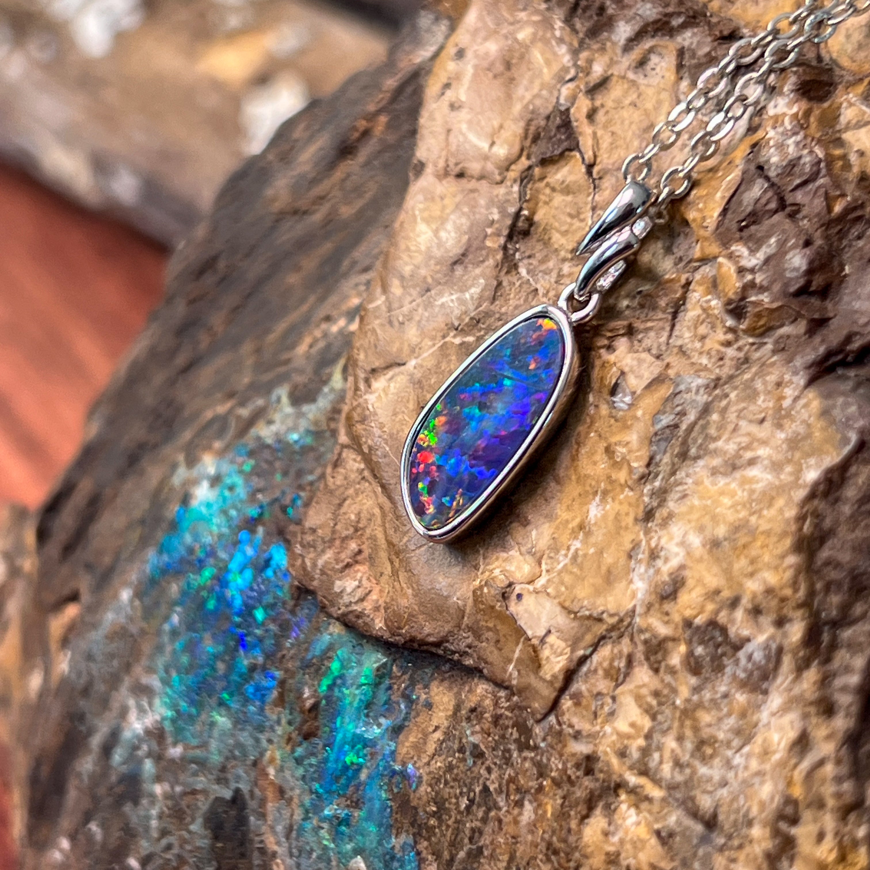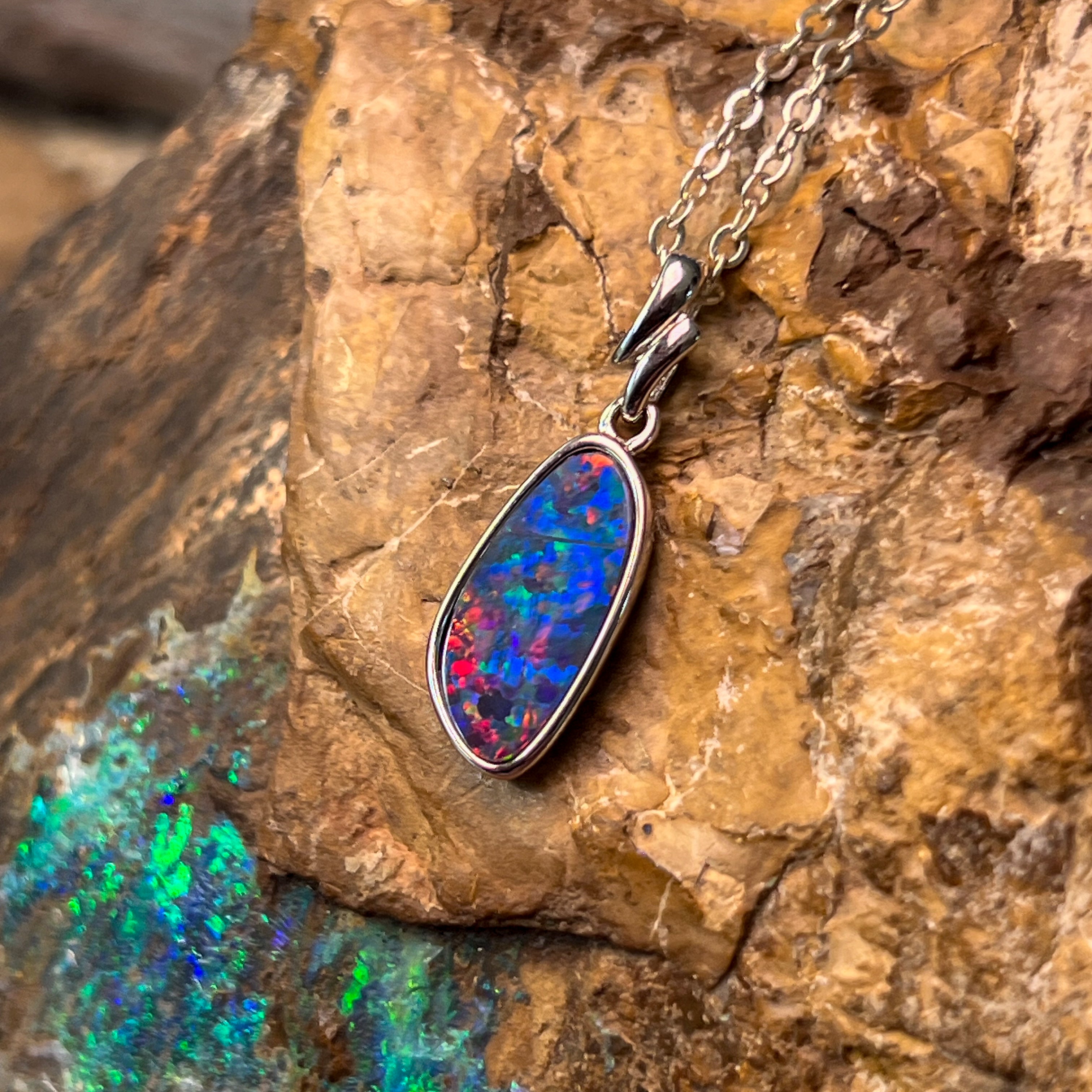 Elevate your elegance with this sterling silver pendant featuring a long, freeform doublet opal. Its fiery red and blue hues create a captivating play of color, making it a striking statement piece. Perfect for adding a refined touch to any ensemble, this pendant combines artistry and sophistication in one exquisite design.