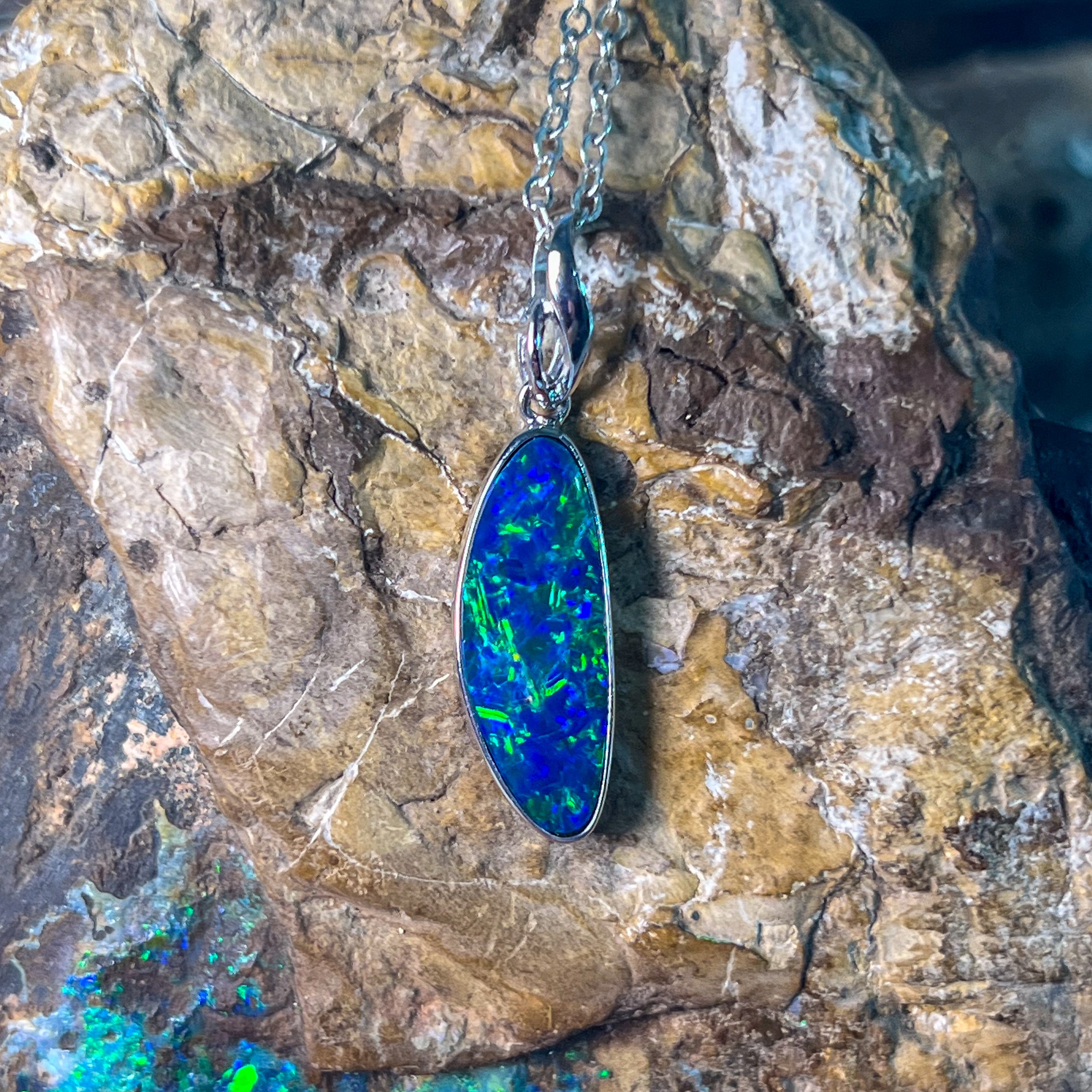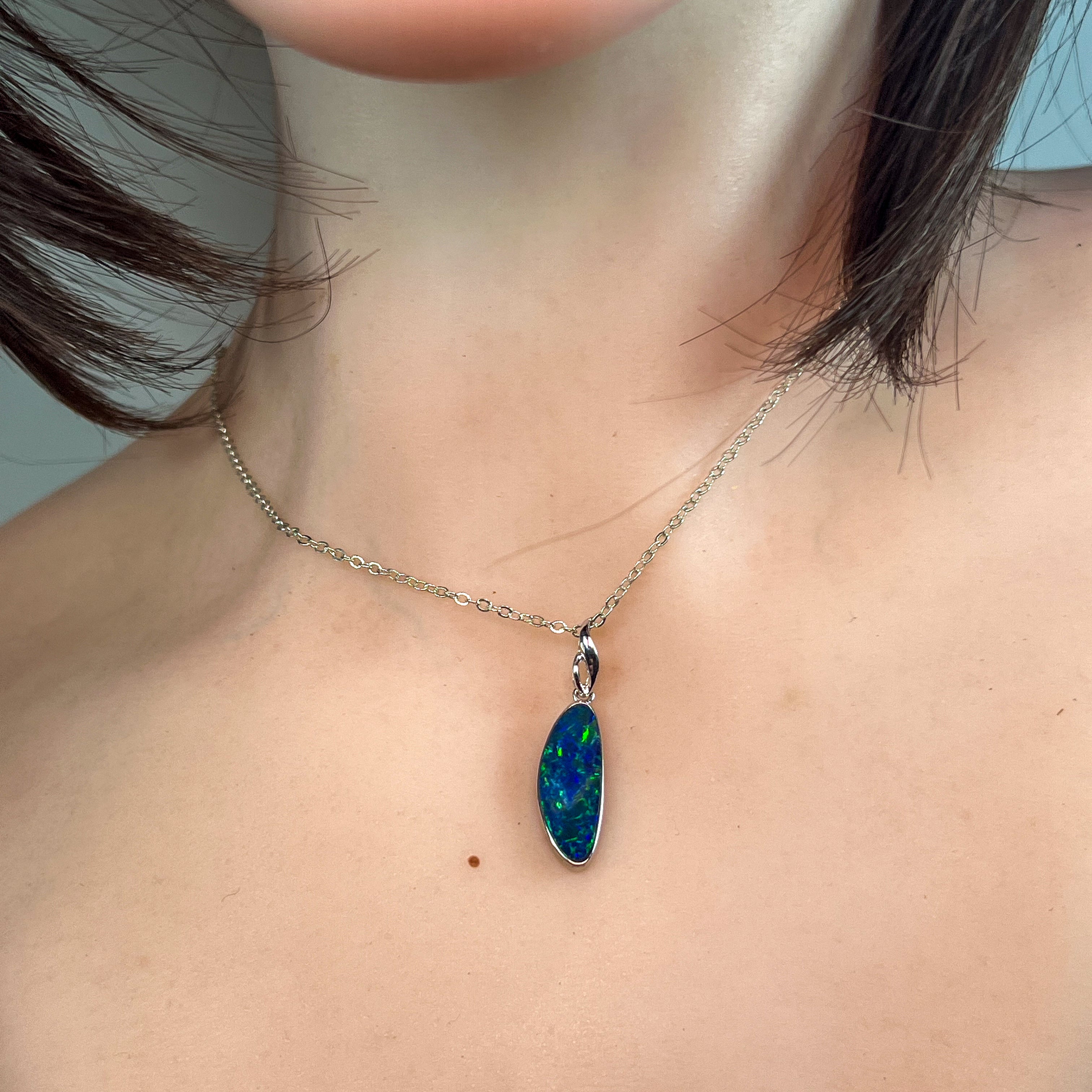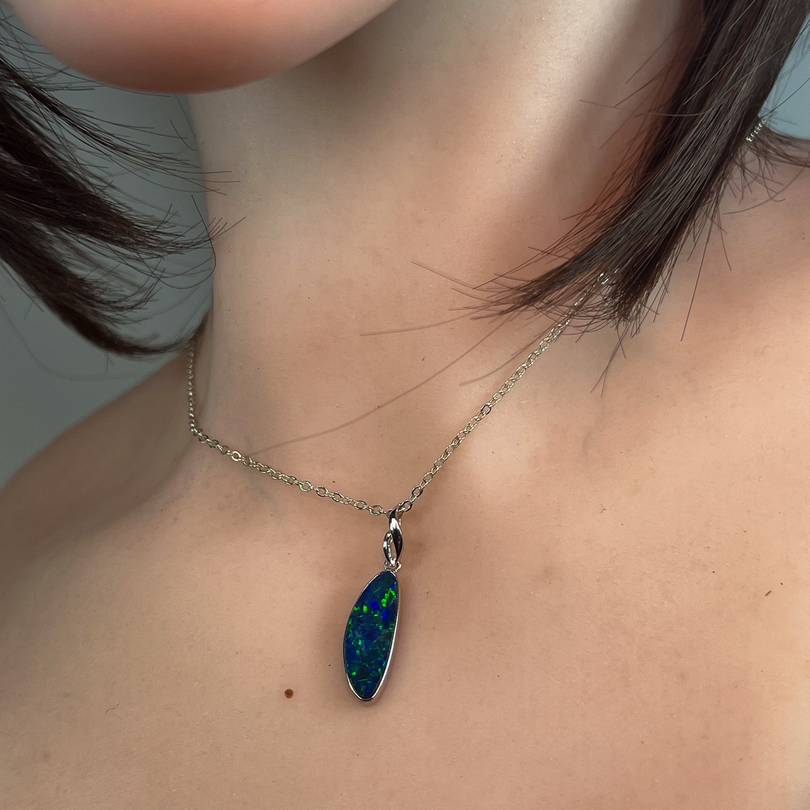 Elevate your style with this Sterling Silver pendant featuring a long, thin freeform design. The deep forest green and rich blue hues of the opal doublet create a captivating contrast that catches the light beautifully. Lightweight yet striking, this pendant adds a touch of elegance and uniqueness to any outfit, perfect for those who appreciate subtle sophistication.