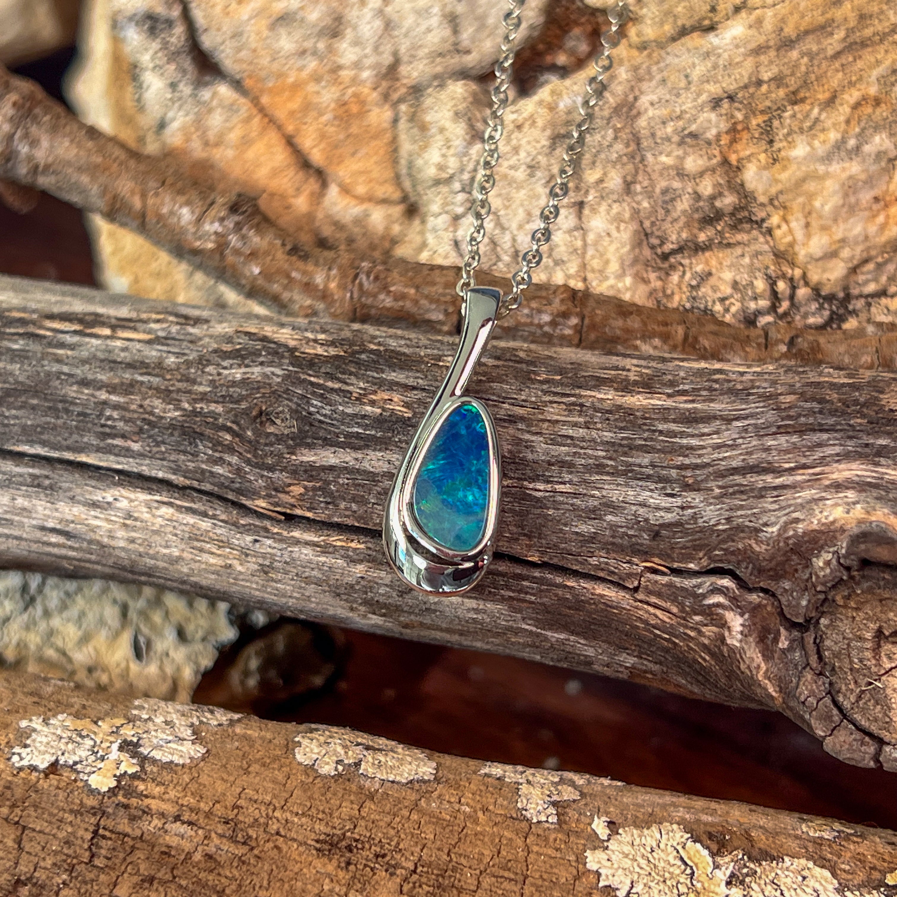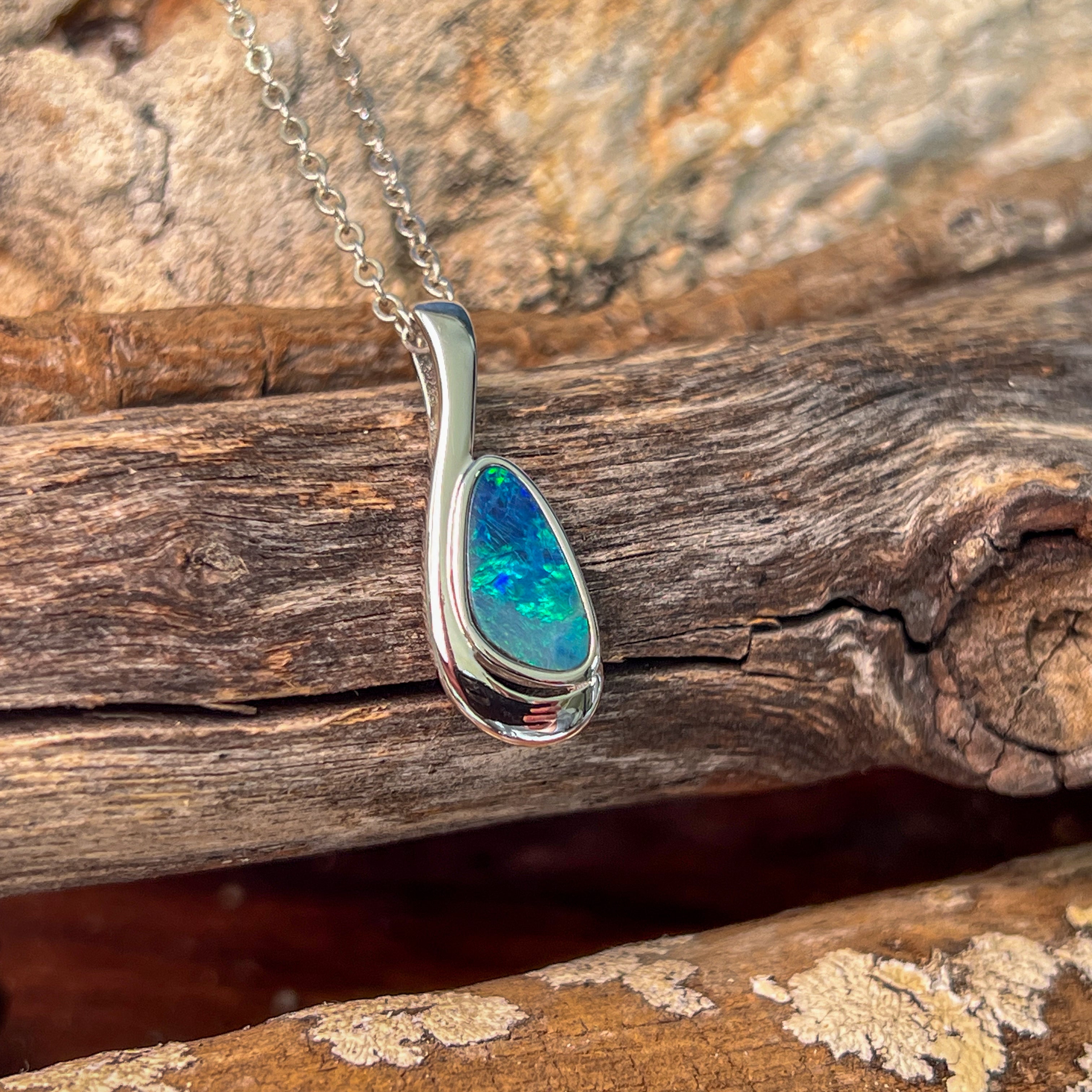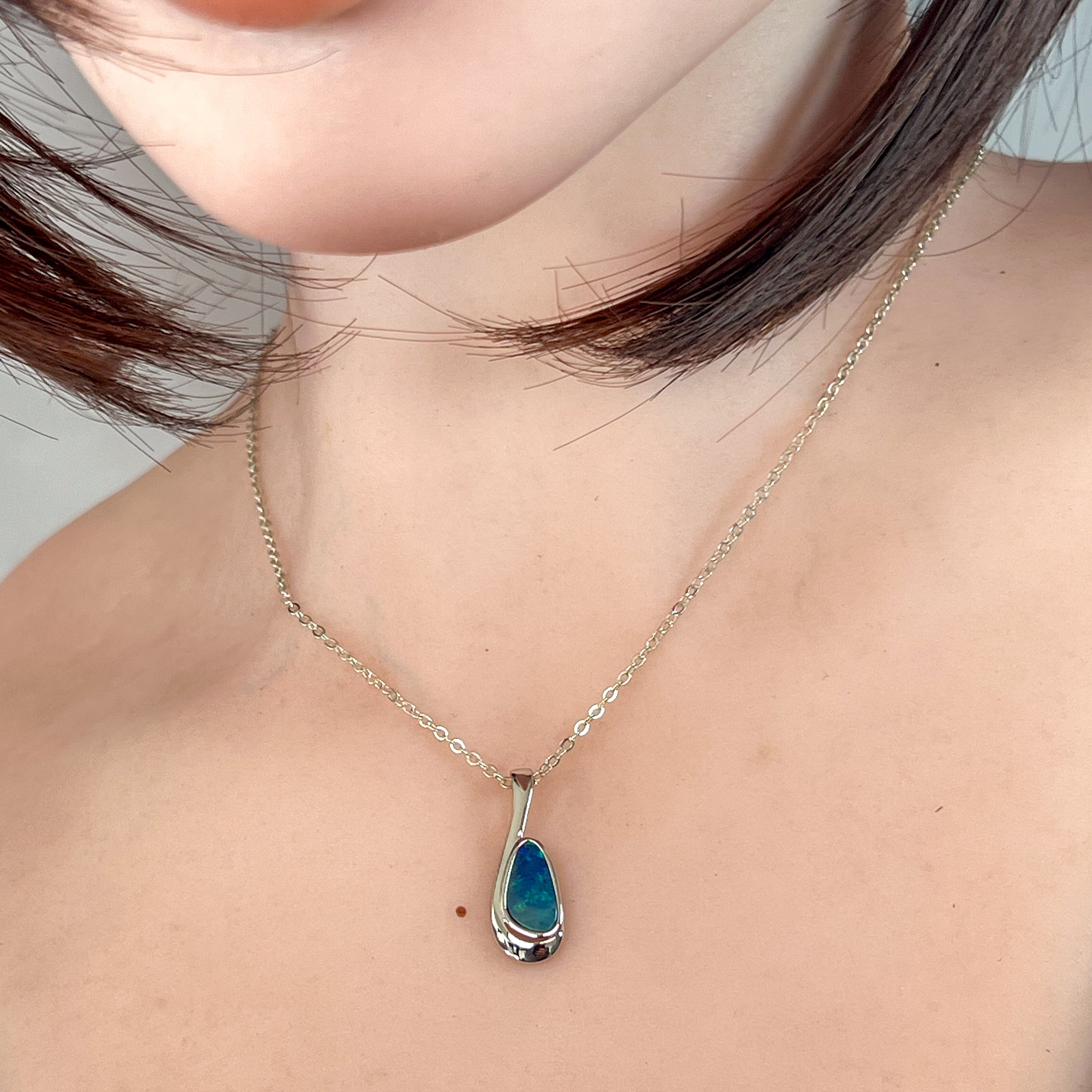 Add a splash of ocean-inspired charm to your look with this sterling silver pendant featuring a mesmerizing blue-green opal drop. Its sleek, modern design effortlessly catches the light, making it the perfect playful accessory to brighten any outfit. Dive into style with a piece that’s as vibrant and unique as you are!