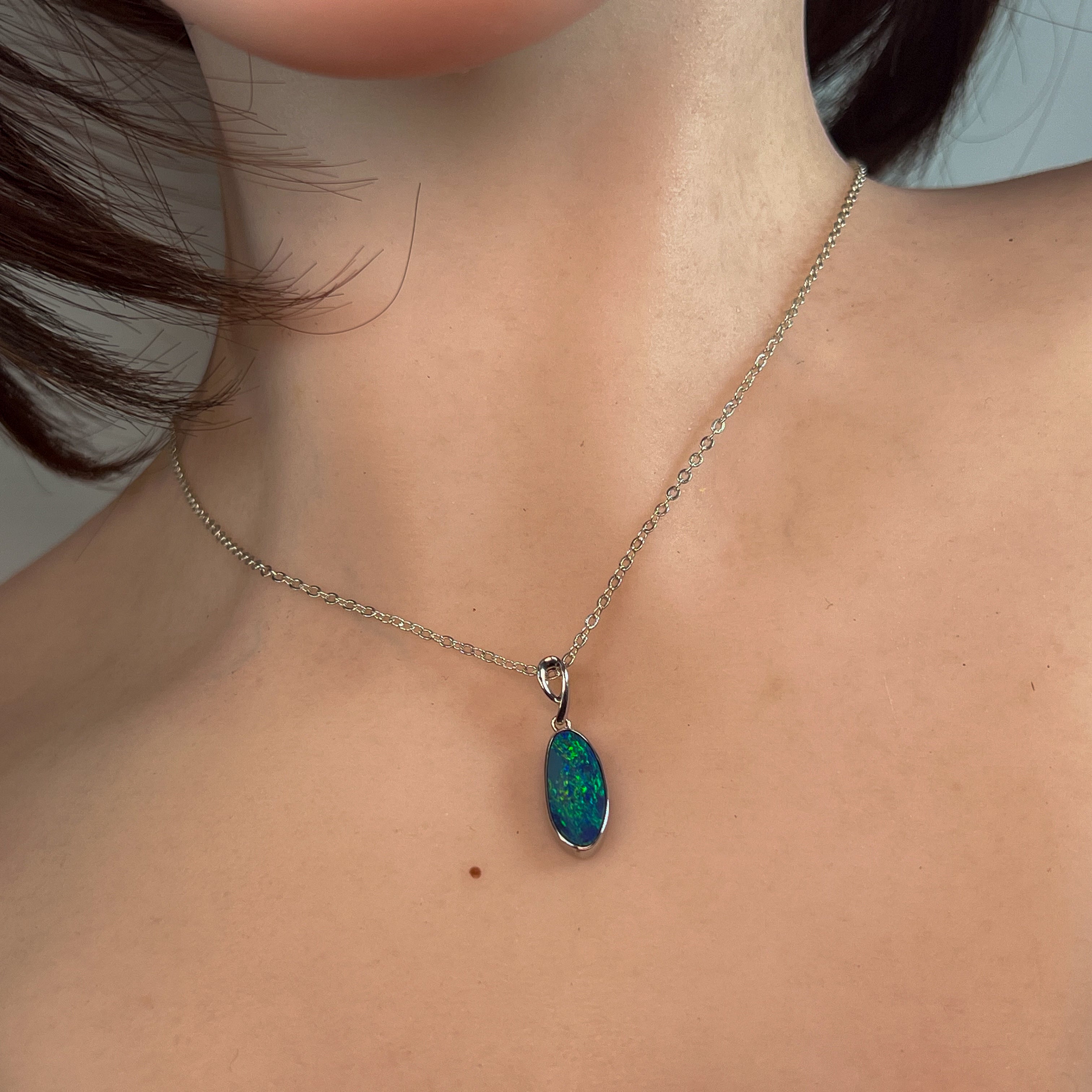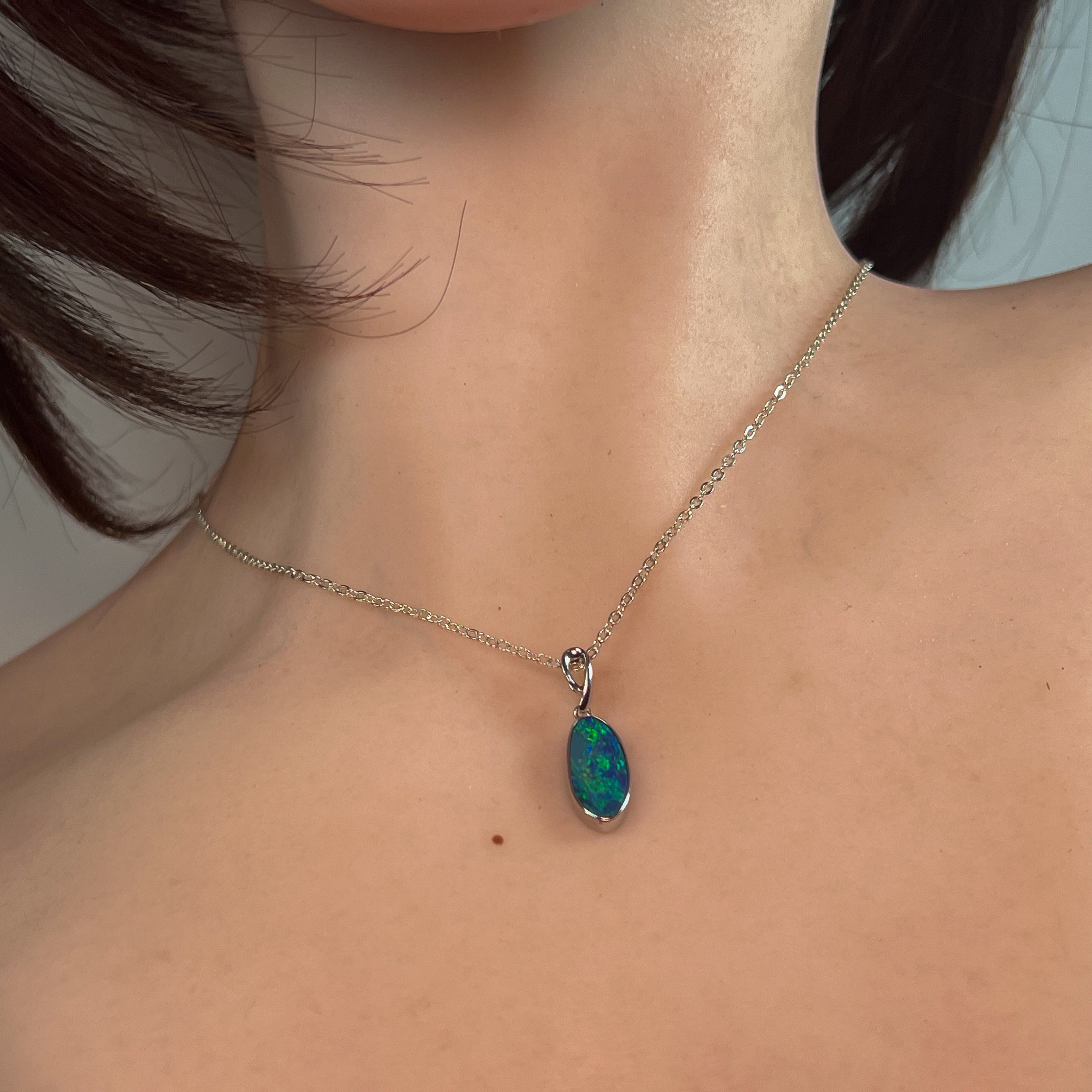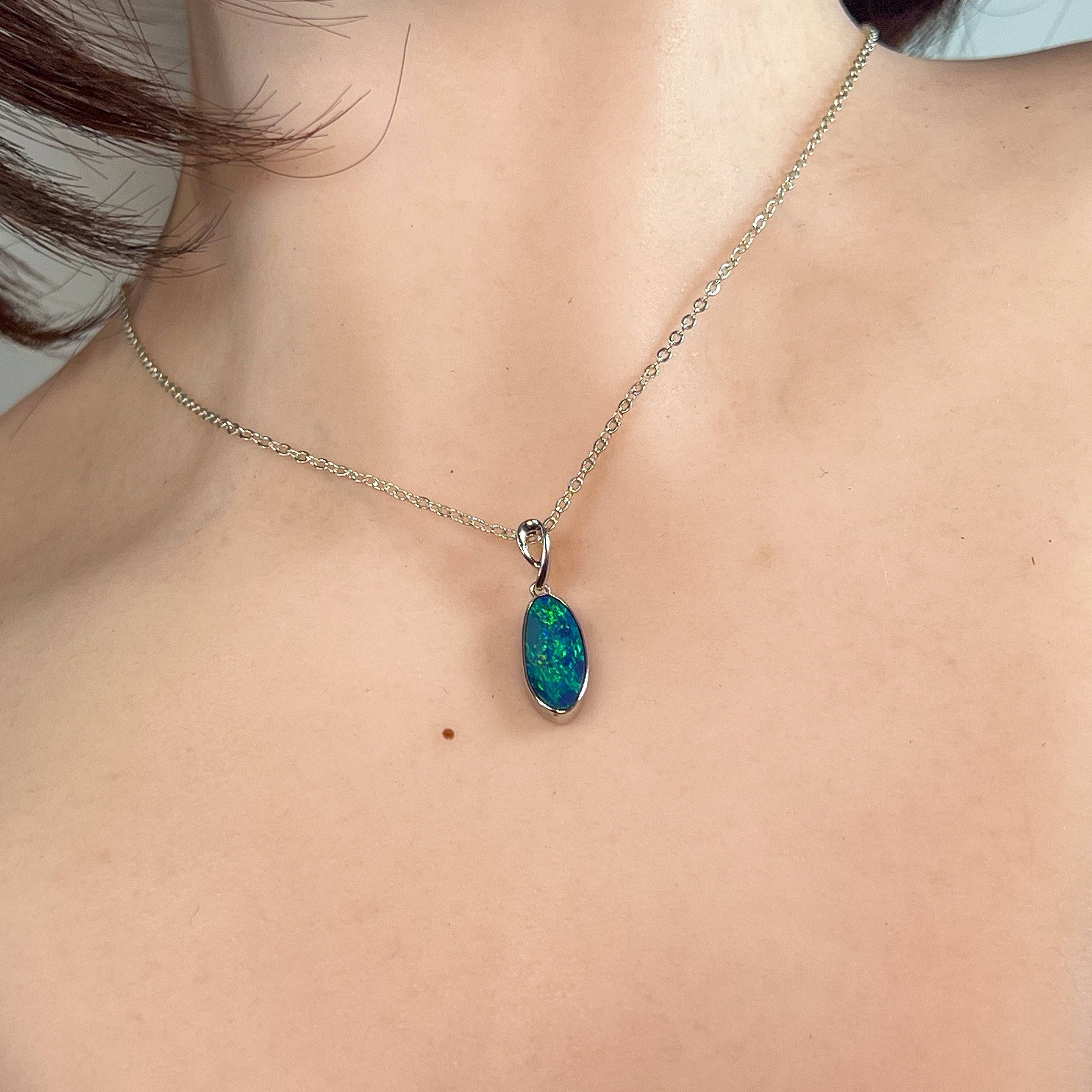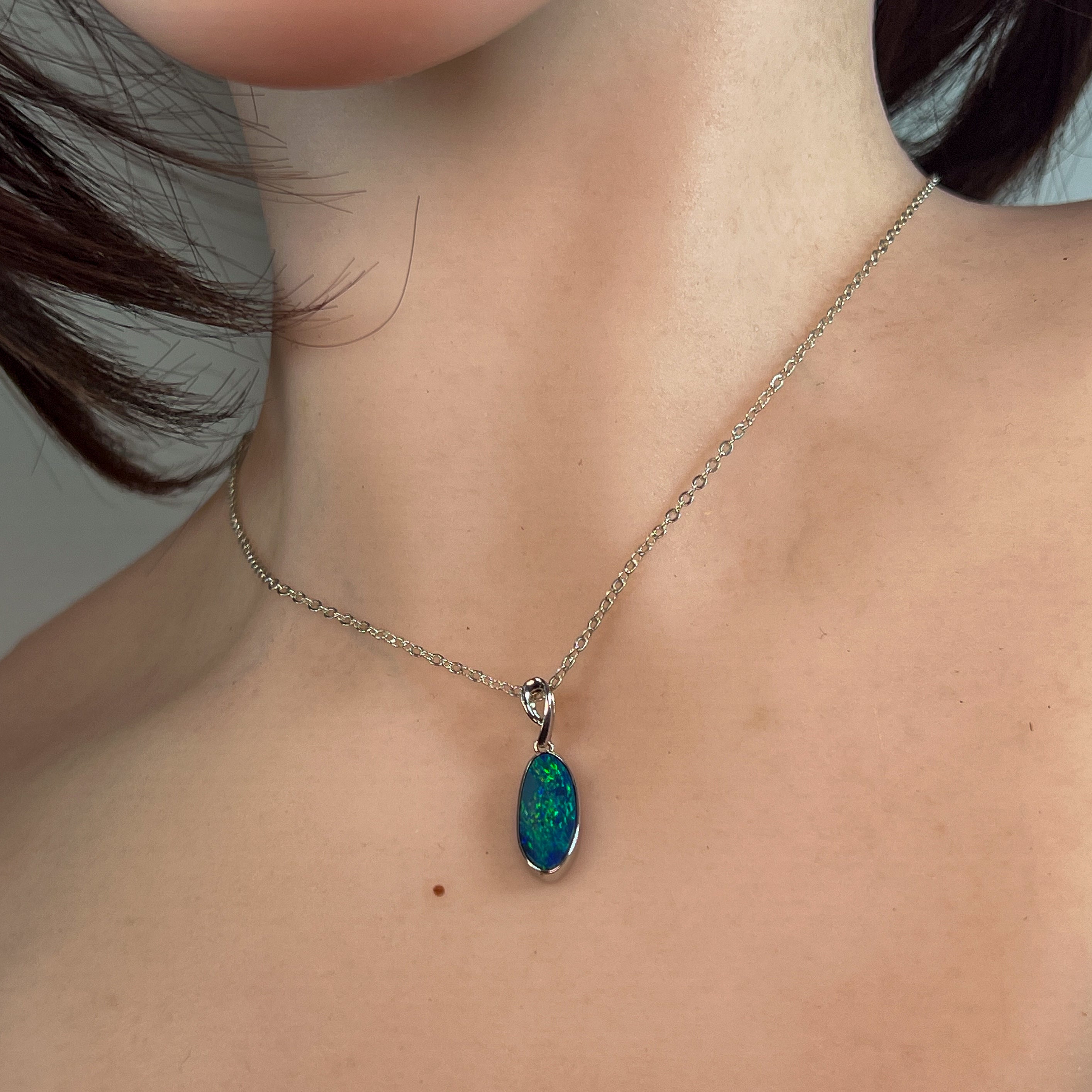 This sterling silver pendant features a stunning long oval-shaped blue-green opal doublet, capturing the enchanting hues of the forest. Its elegant design complements any outfit, making it a perfect statement piece that brings a touch of natural beauty and sophistication to your jewelry collection.