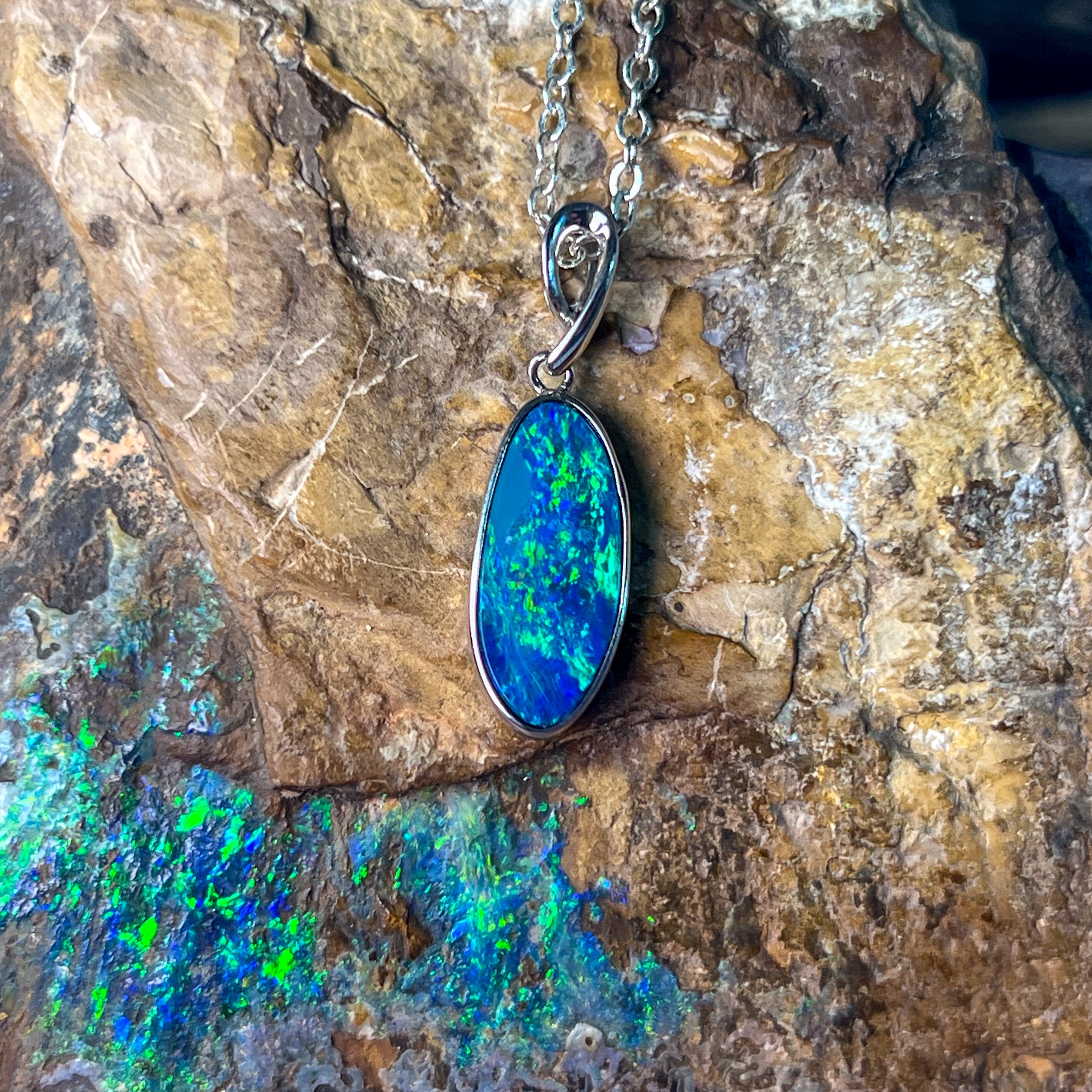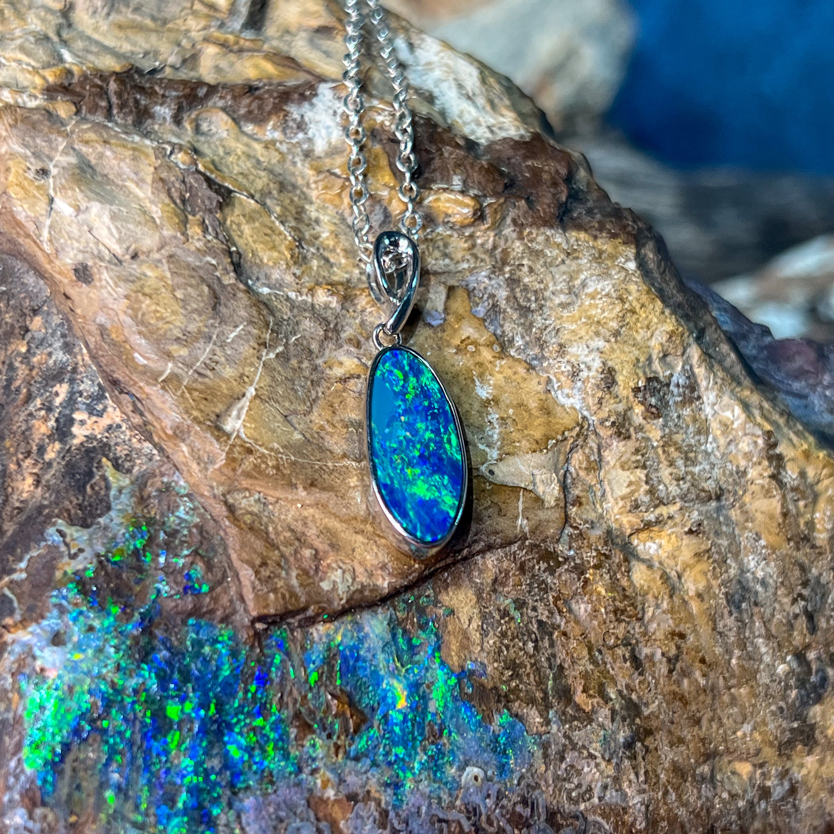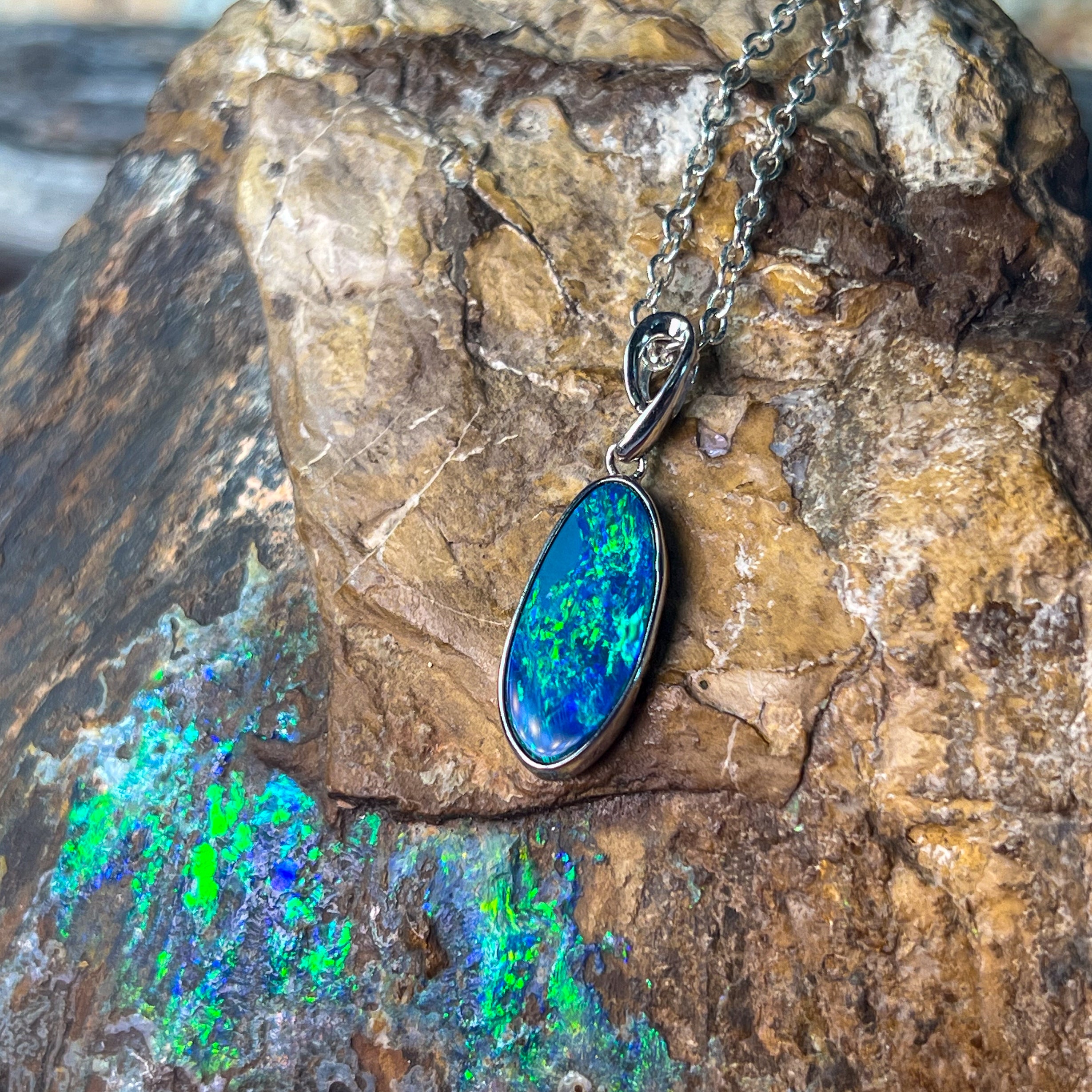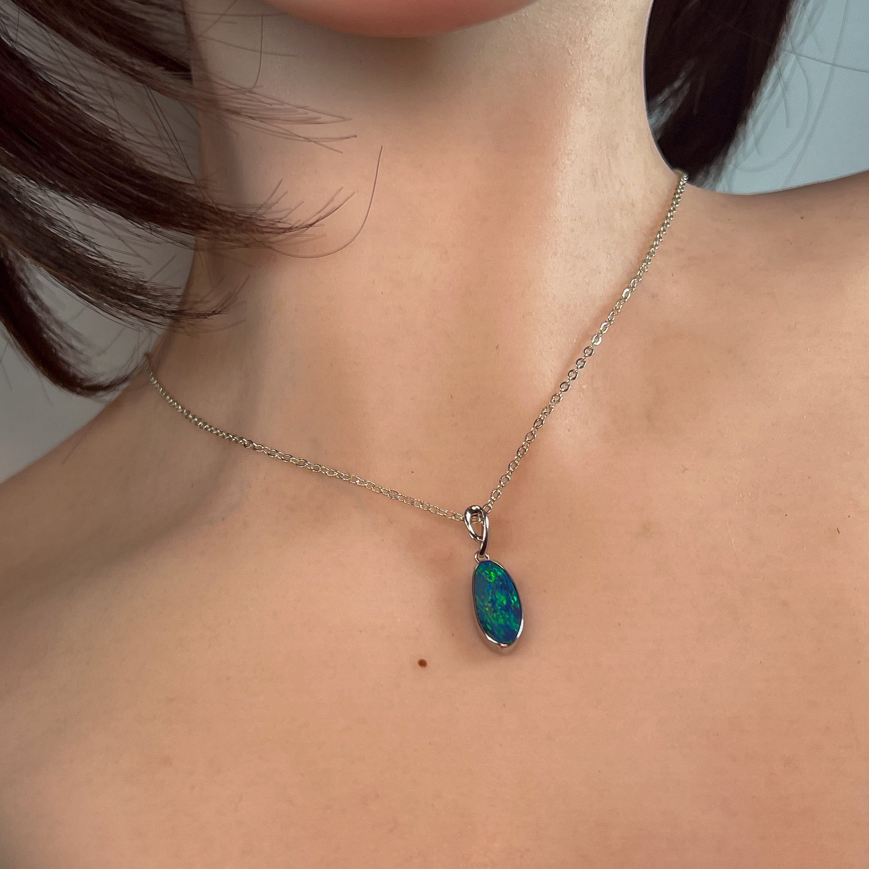 This sterling silver pendant features a stunning long oval-shaped blue-green opal doublet, capturing the enchanting hues of the forest. Its elegant design complements any outfit, making it a perfect statement piece that brings a touch of natural beauty and sophistication to your jewelry collection.