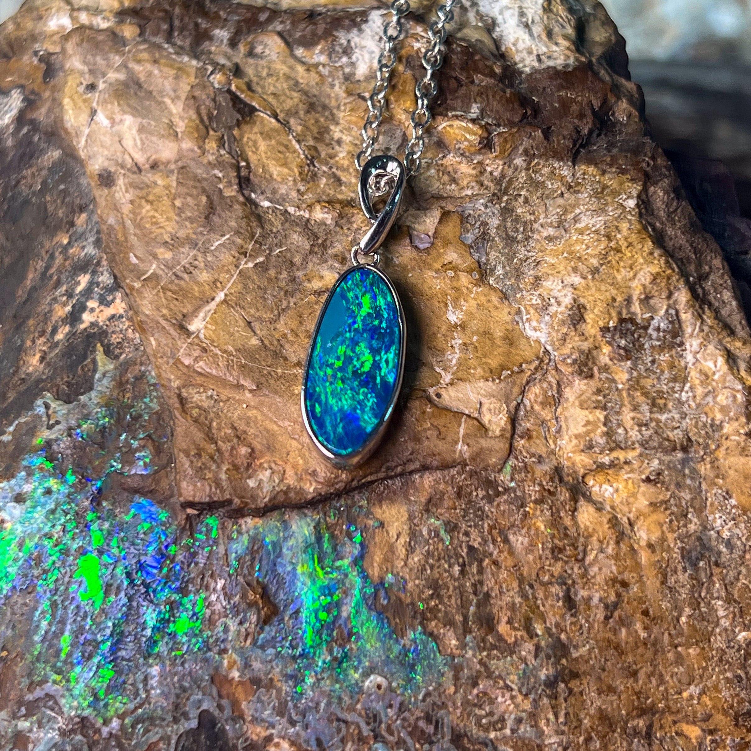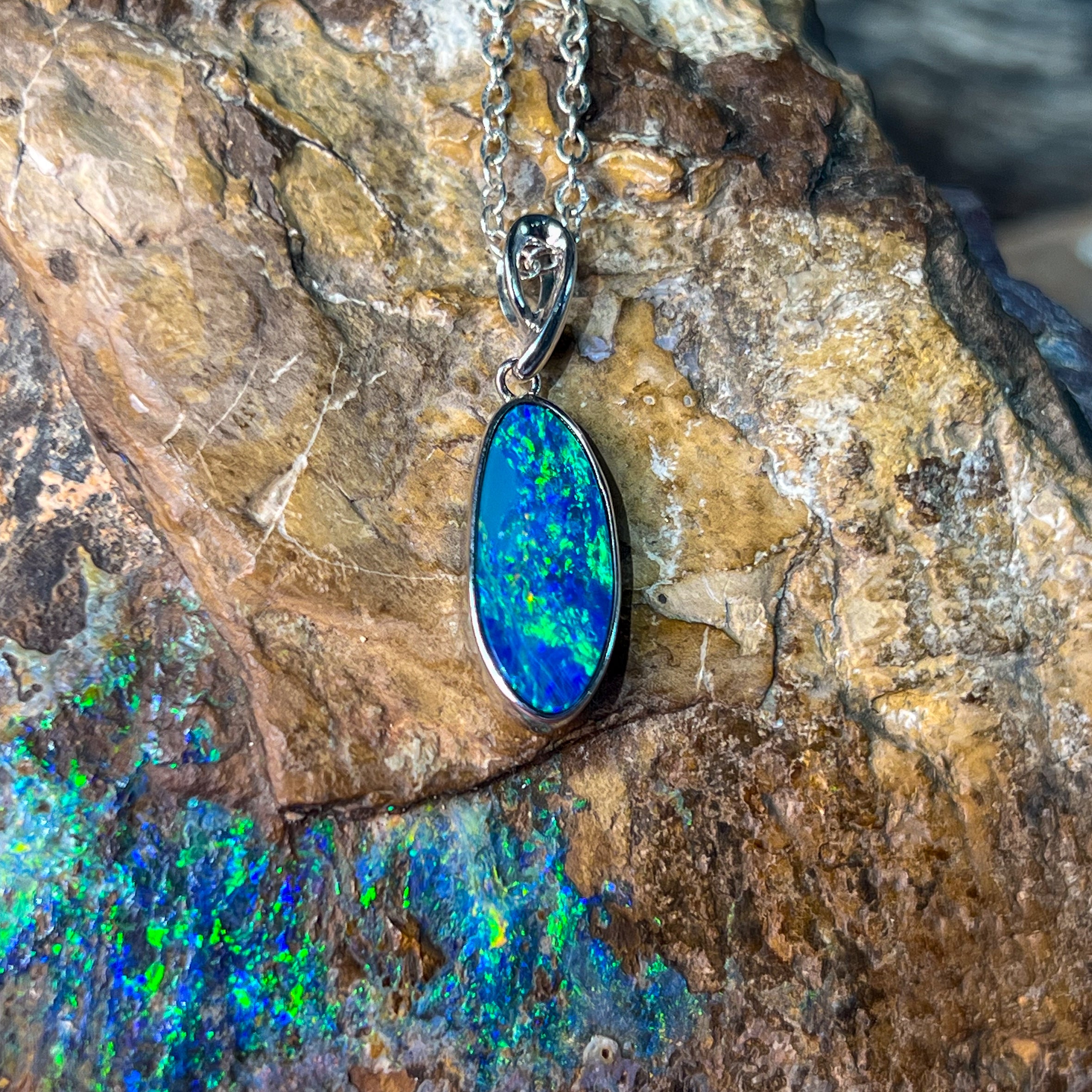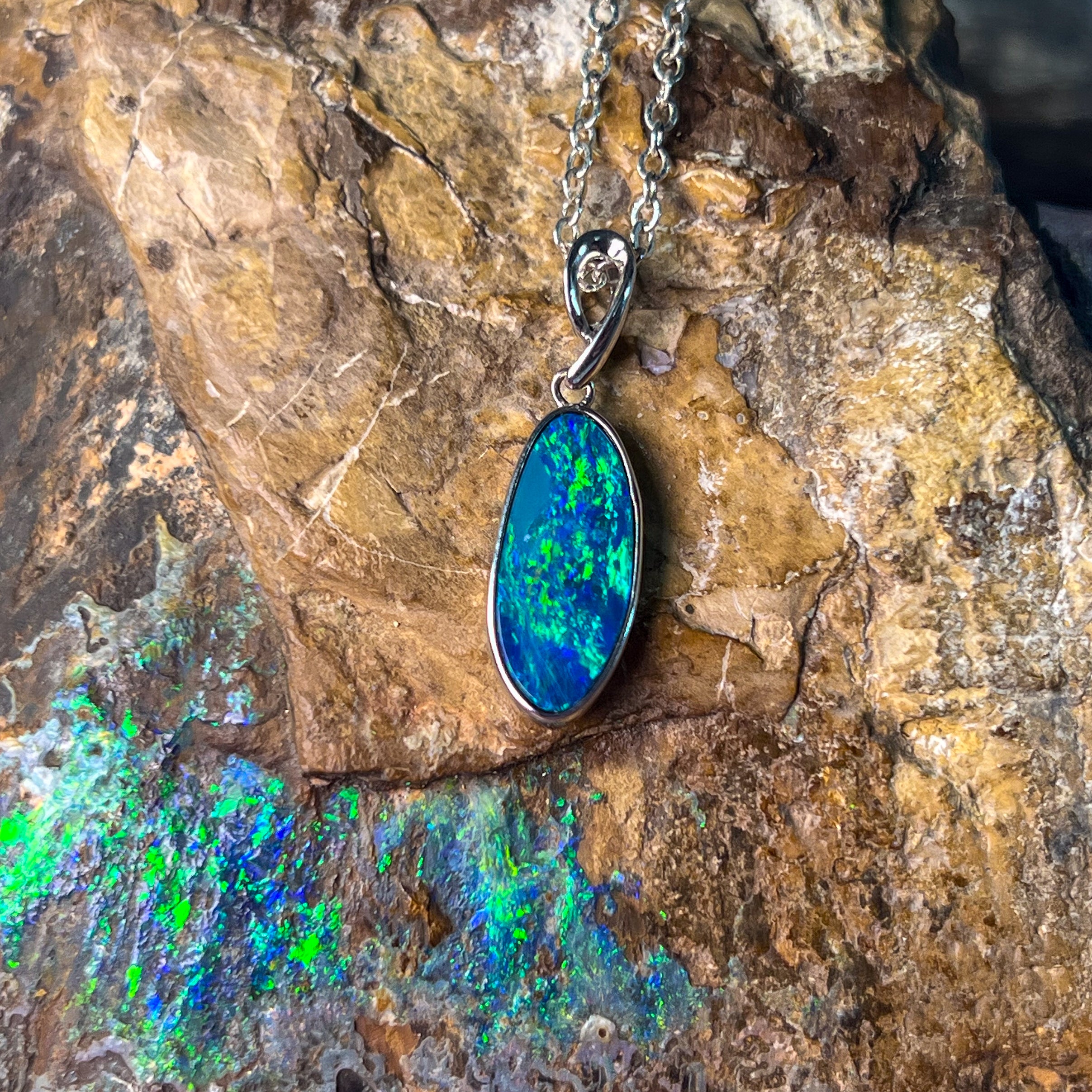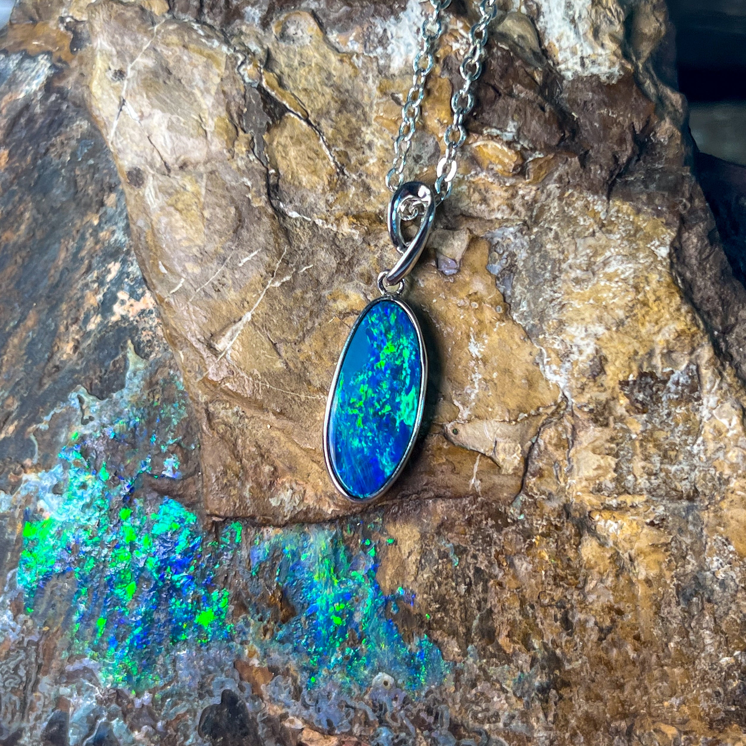 This sterling silver pendant features a stunning long oval-shaped blue-green opal doublet, capturing the enchanting hues of the forest. Its elegant design complements any outfit, making it a perfect statement piece that brings a touch of natural beauty and sophistication to your jewelry collection.