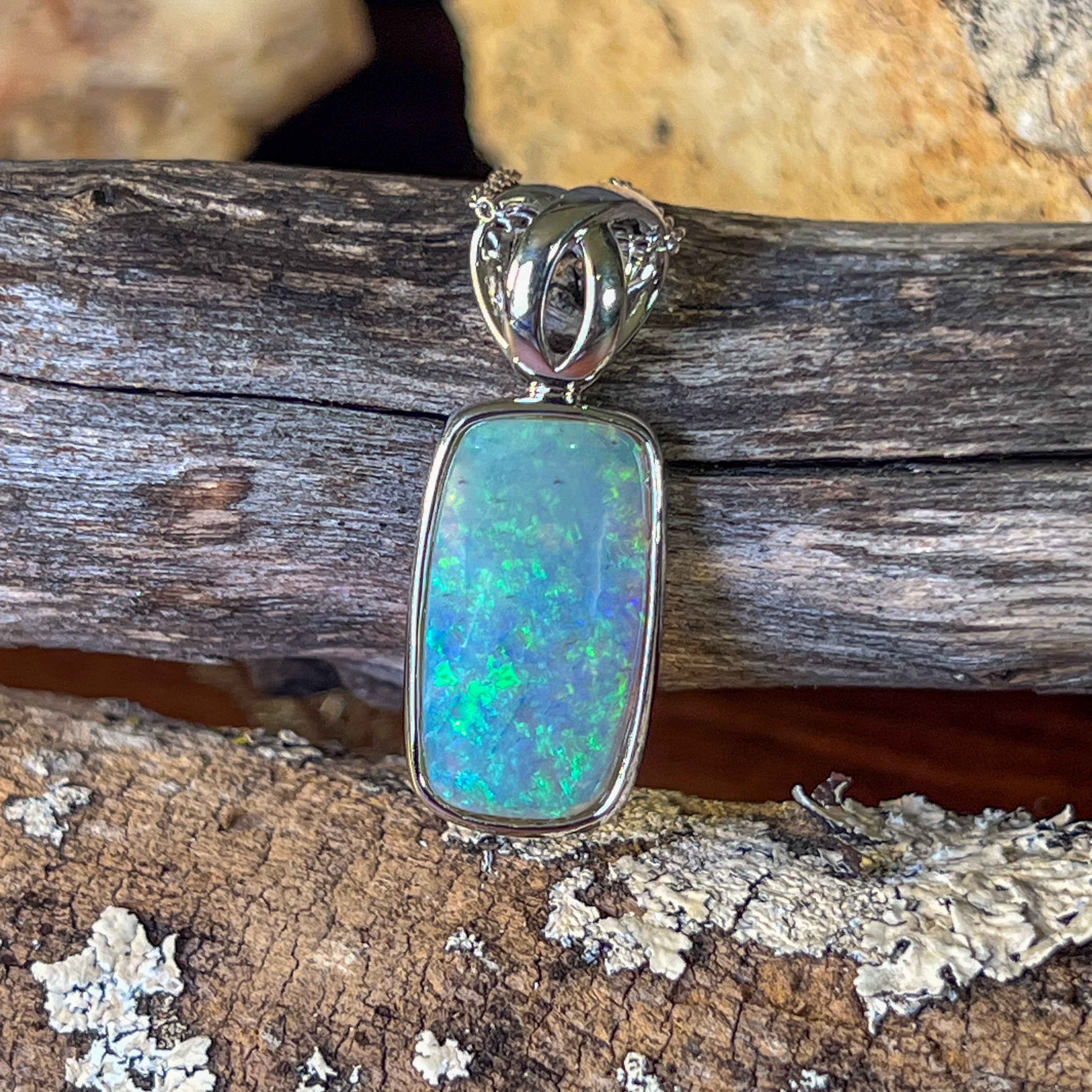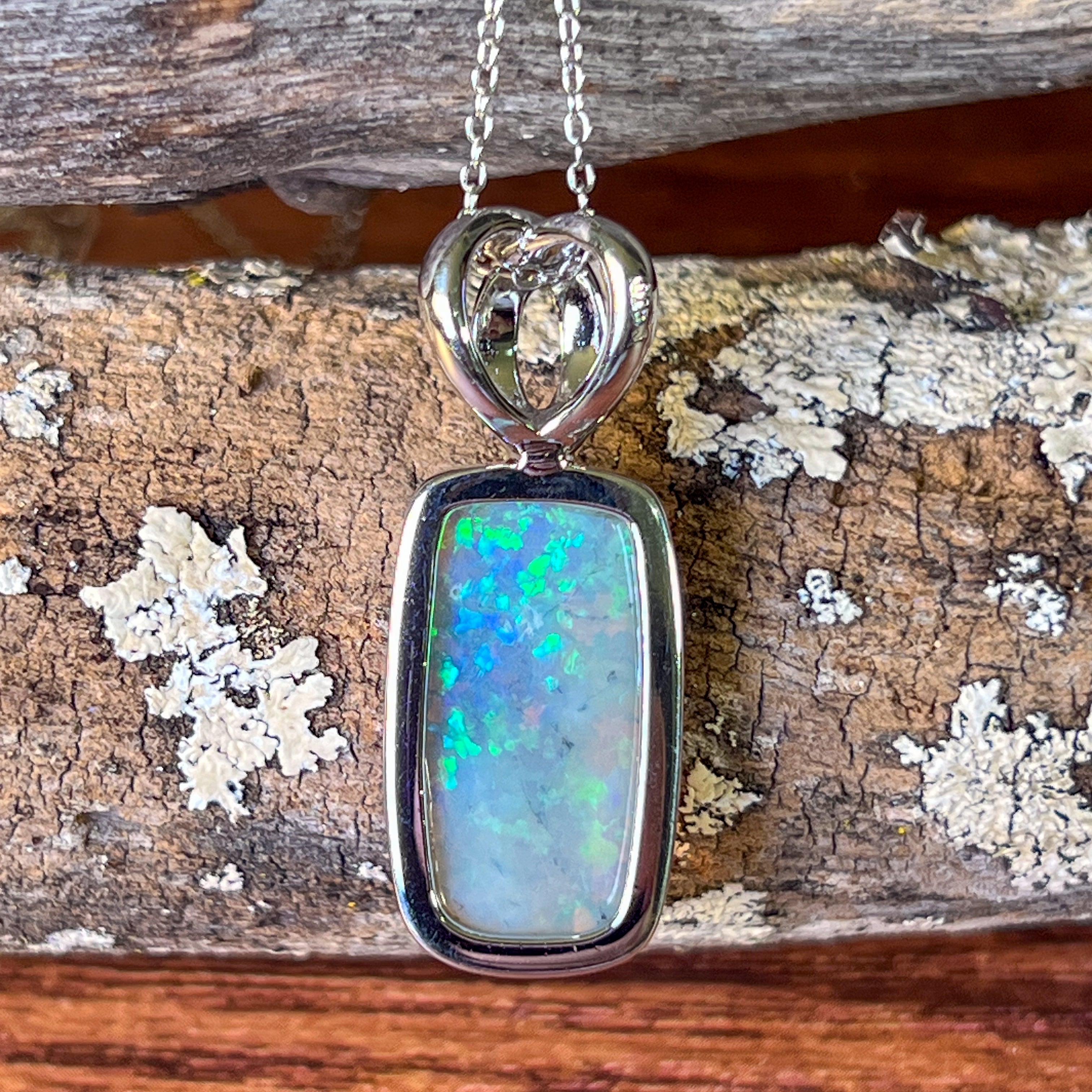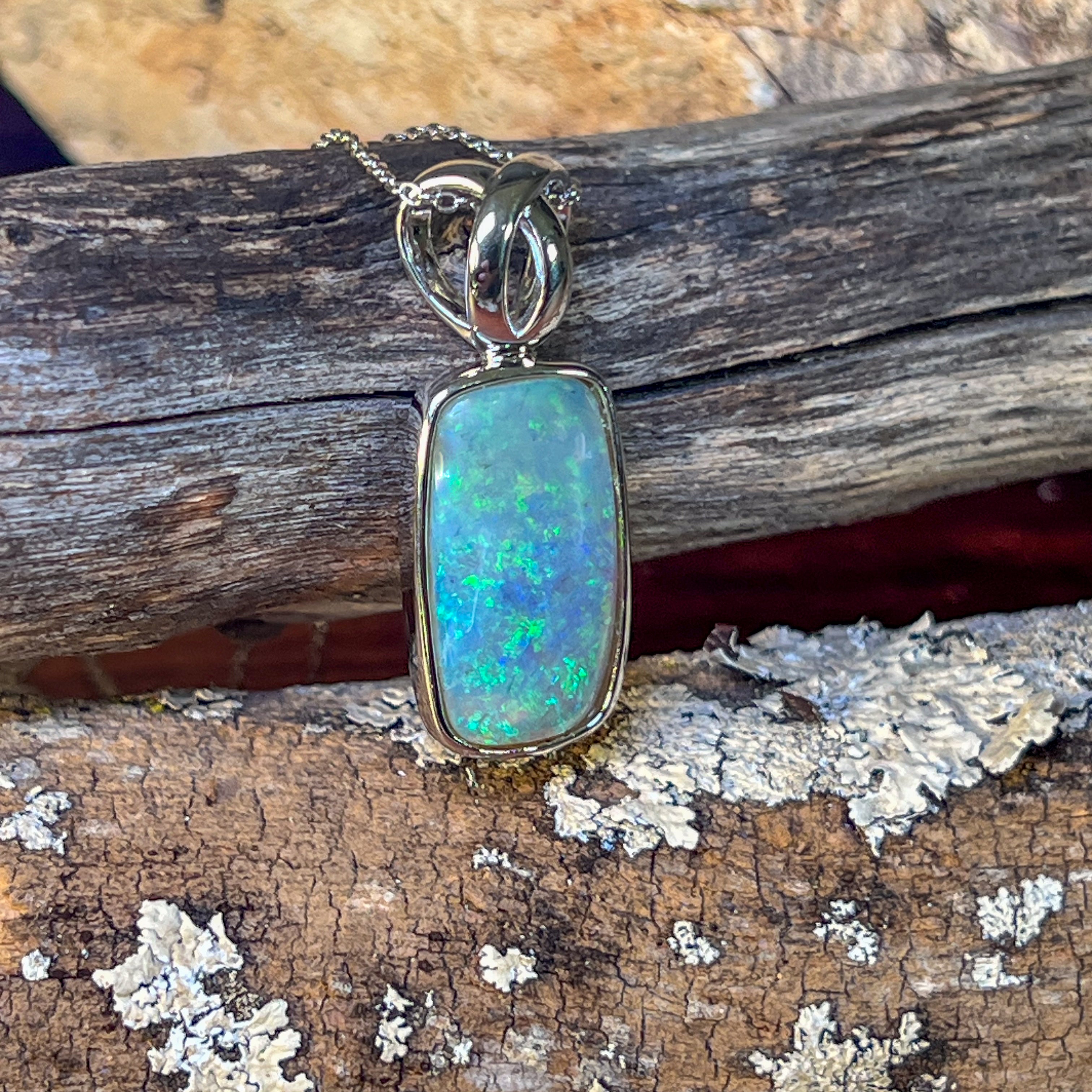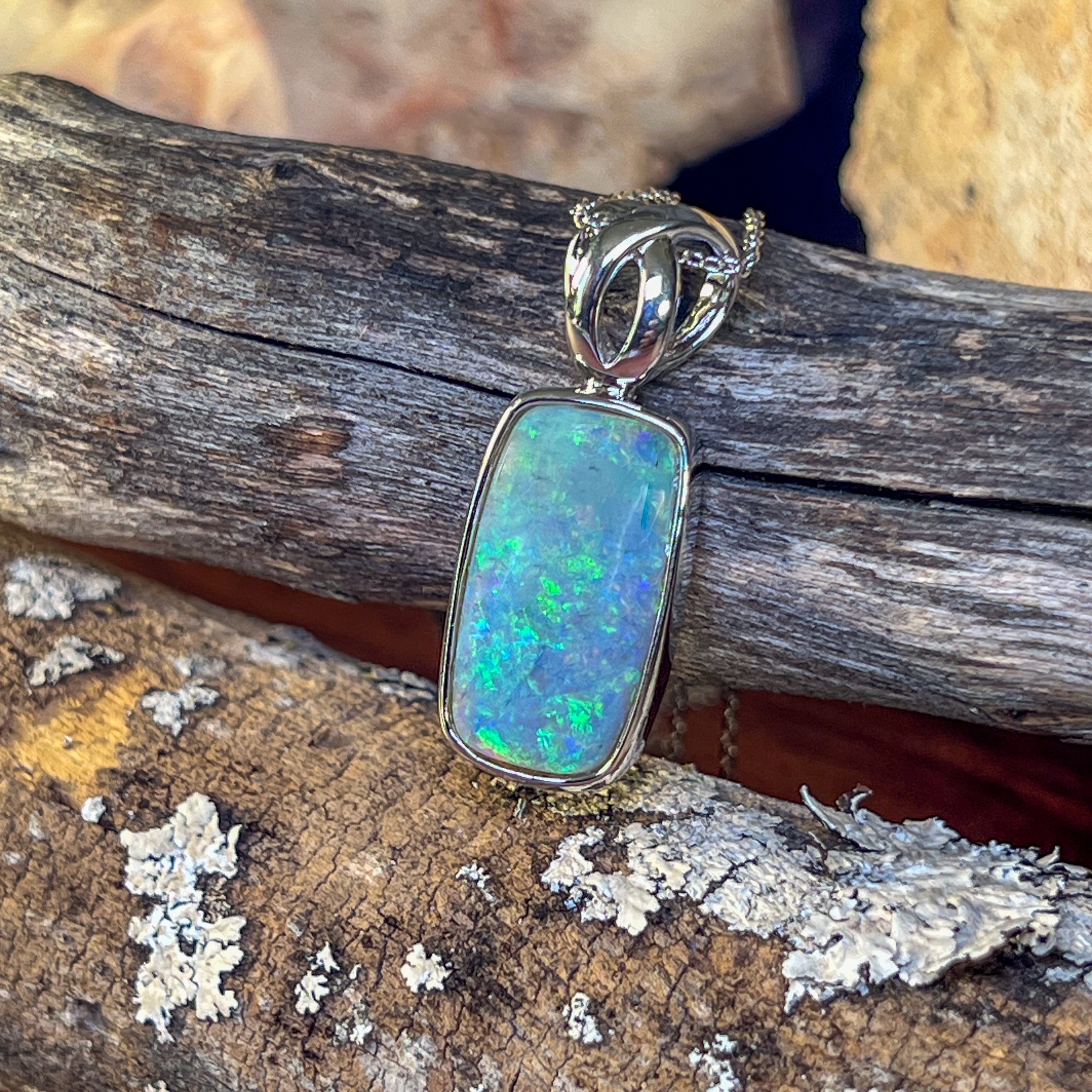 Indulge in the luxurious beauty of our Sterling Silver Opal Crystal Green Blue Rectangle shape necklace. Enchanting large green colours will add a pop of color to any outfit. Elevate your style with this stunning piece and turn heads wherever you go!