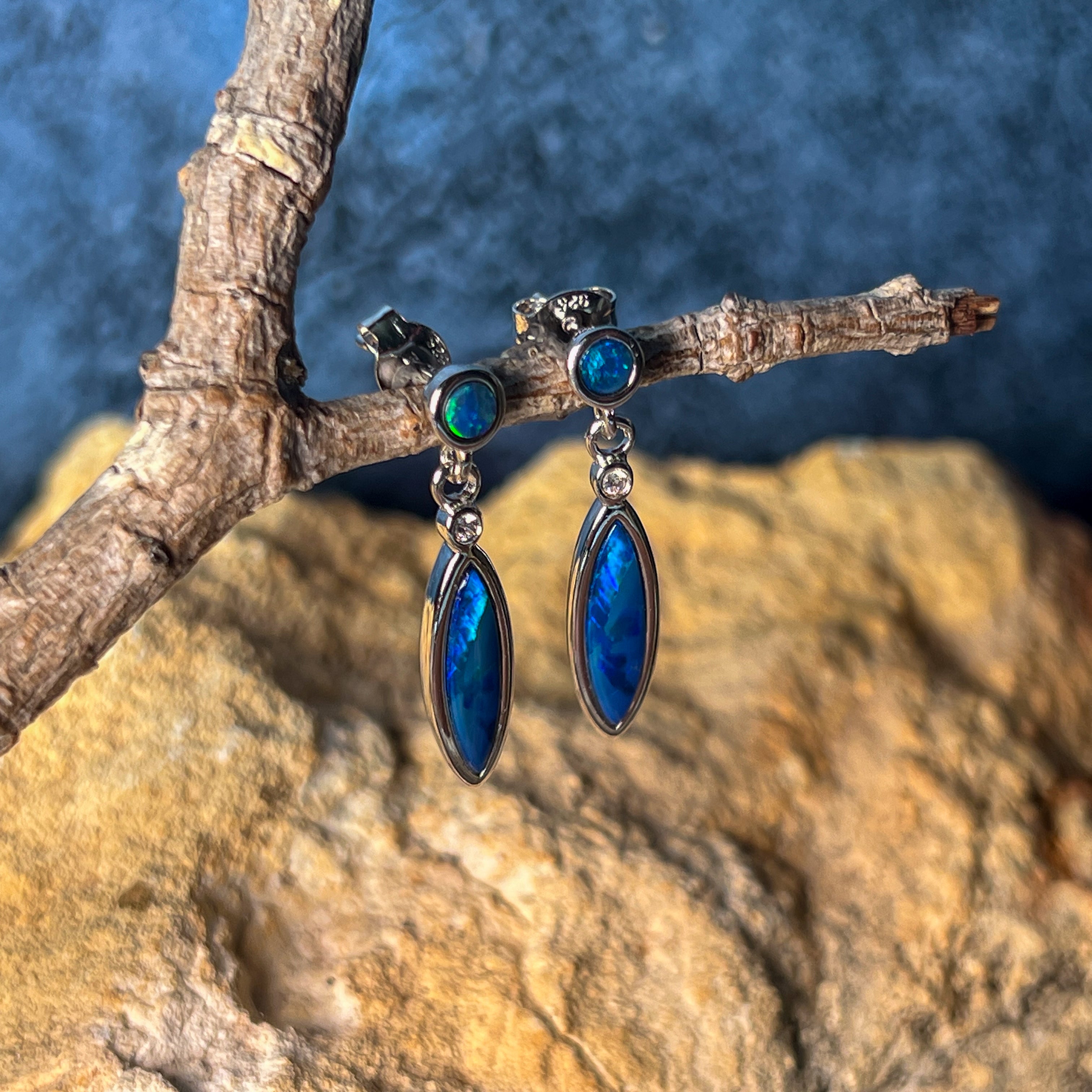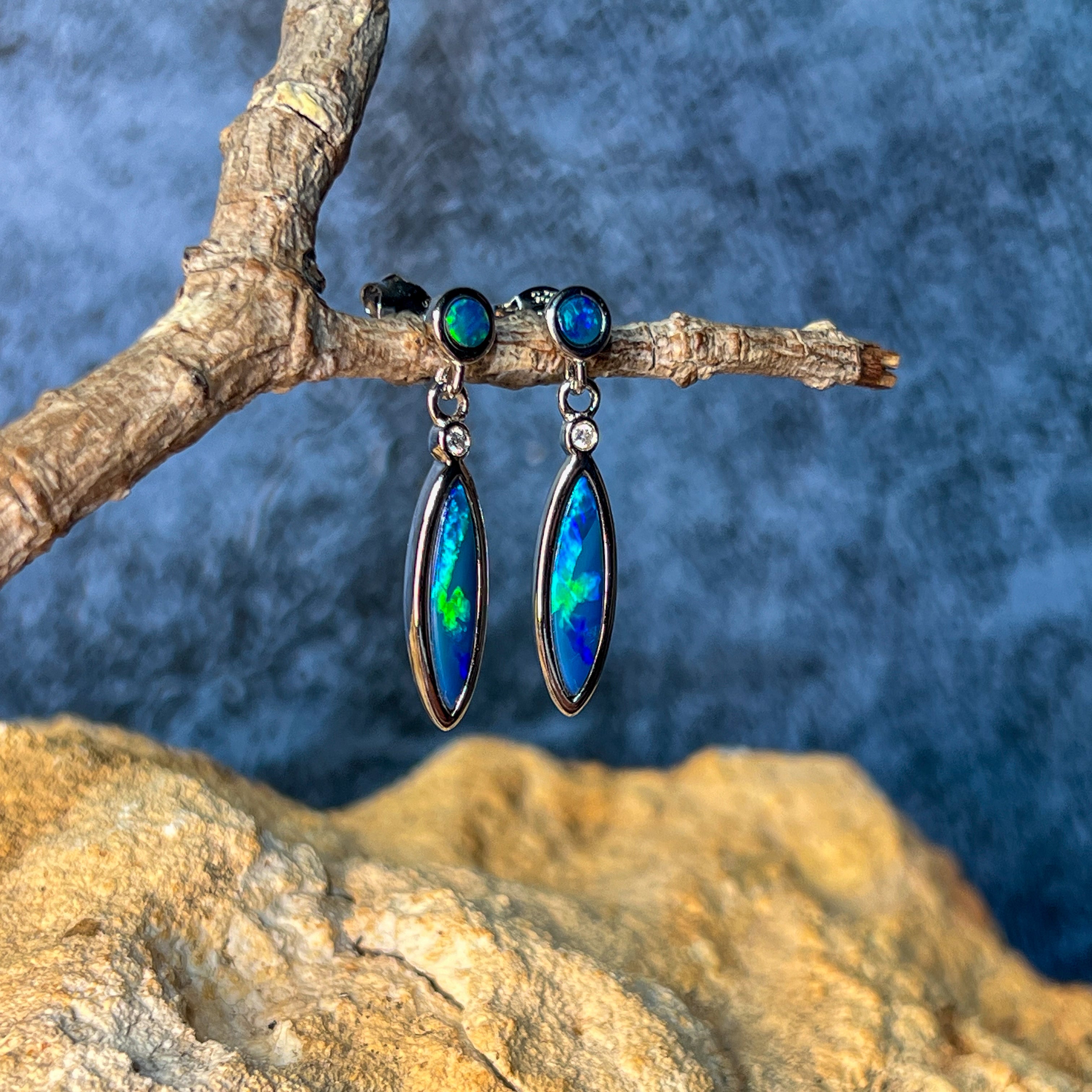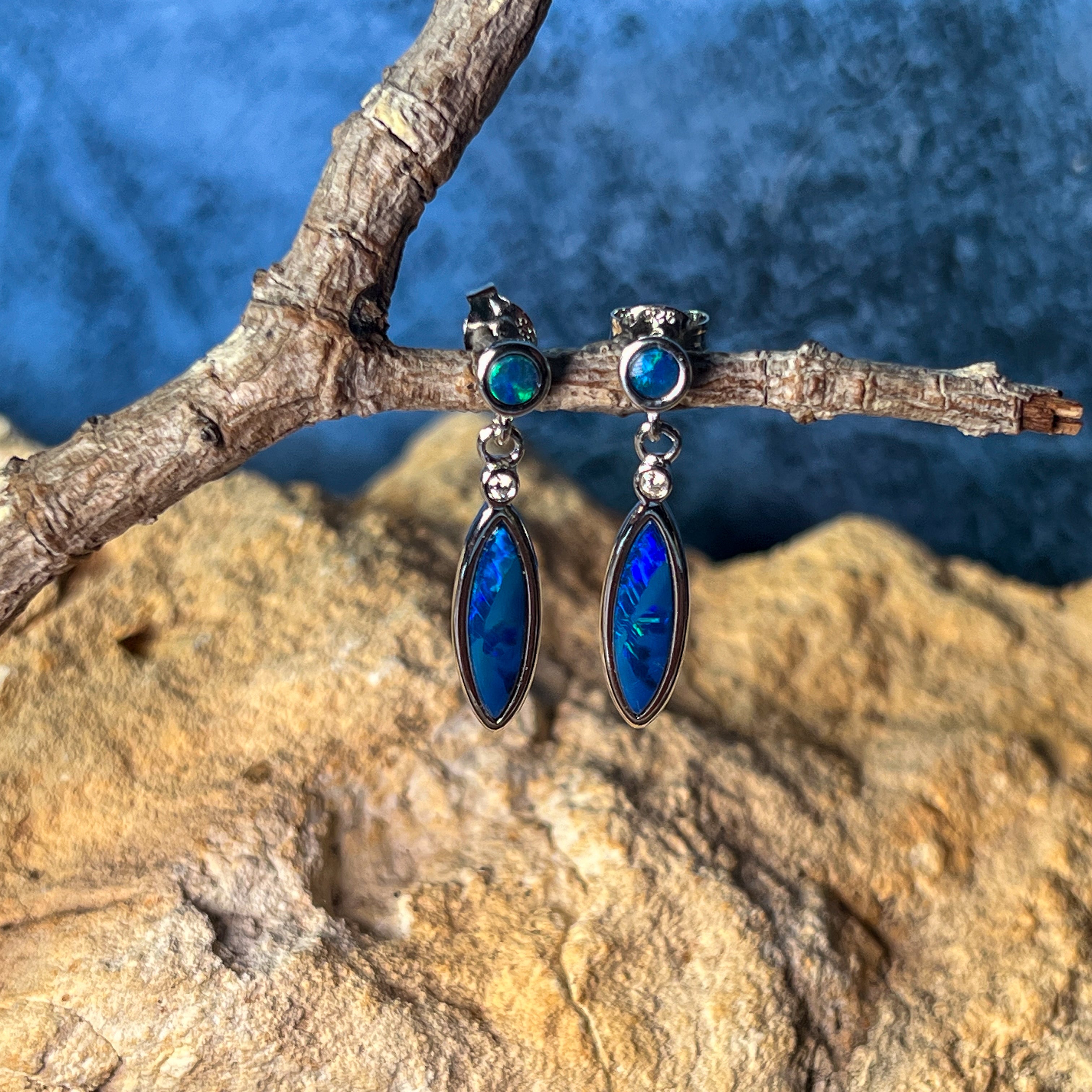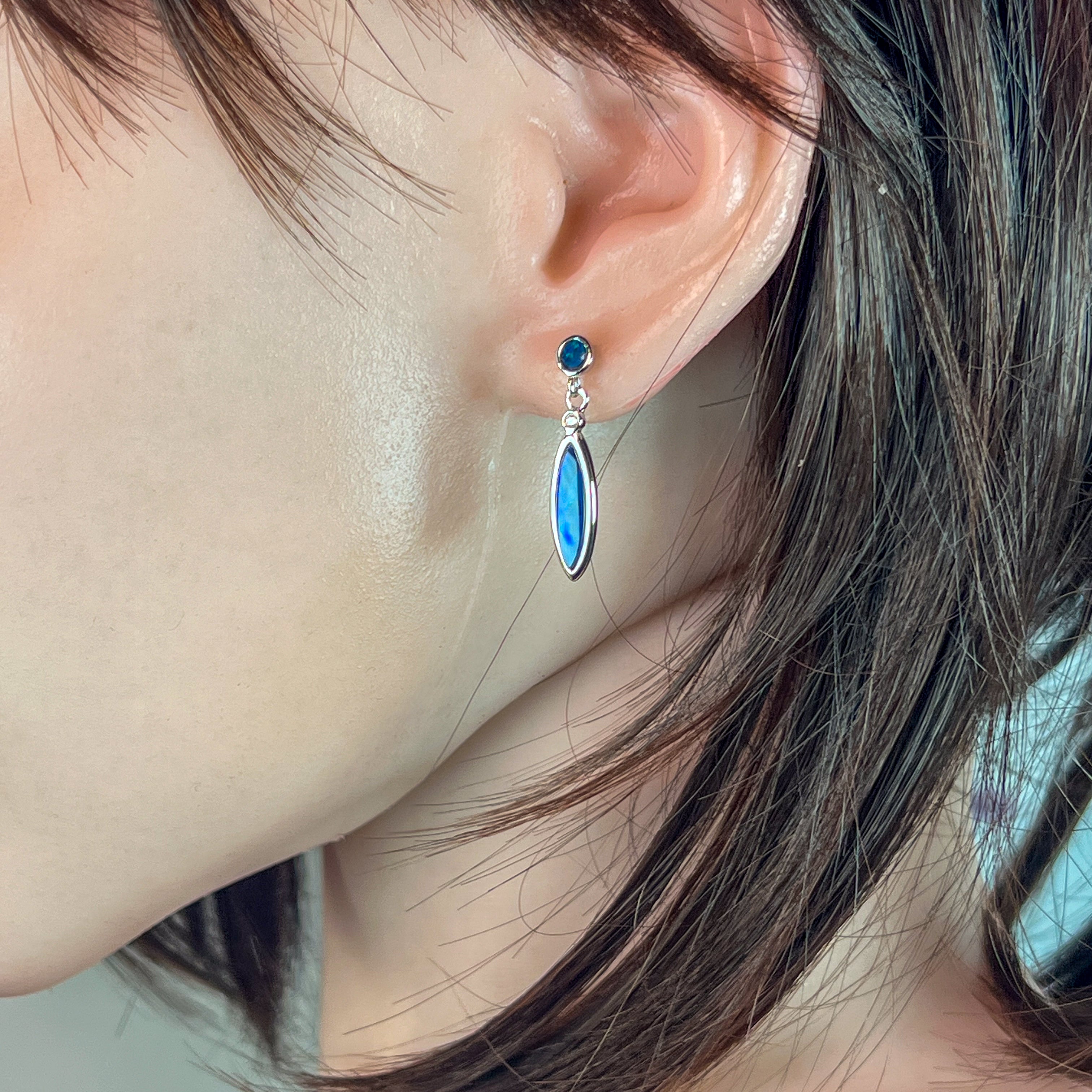 Sterling Silver Opal dangling Blue Green marquise and round shape drop earrings