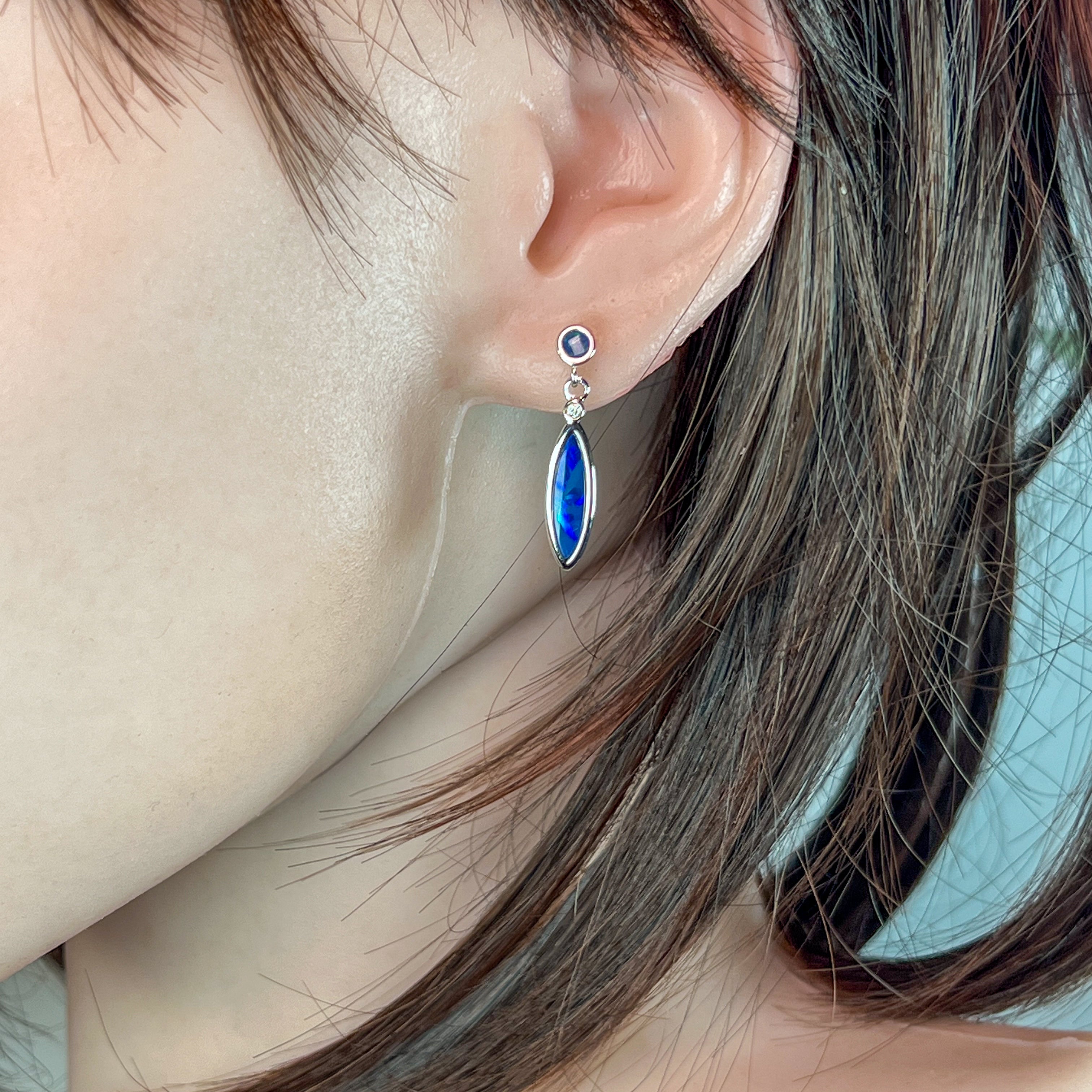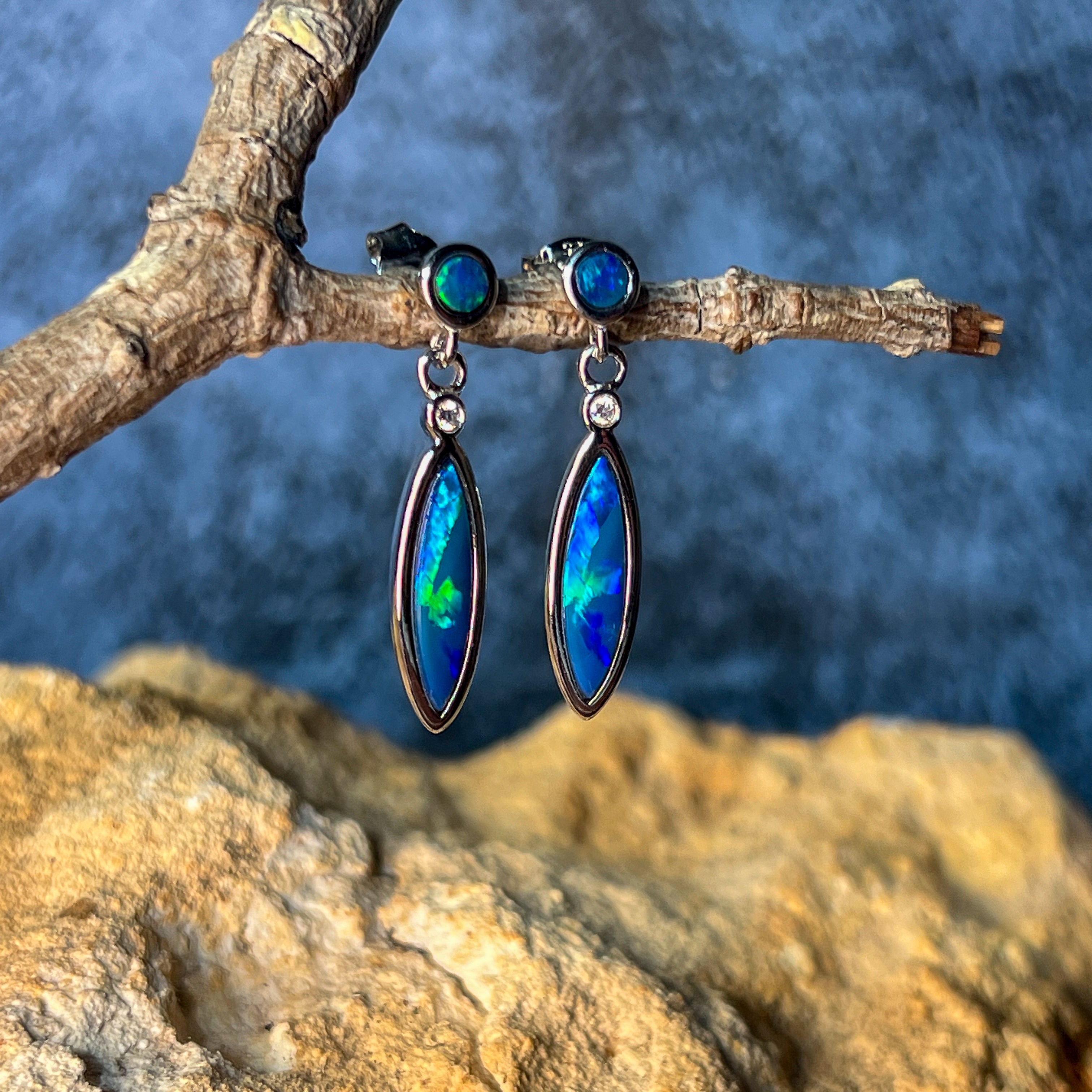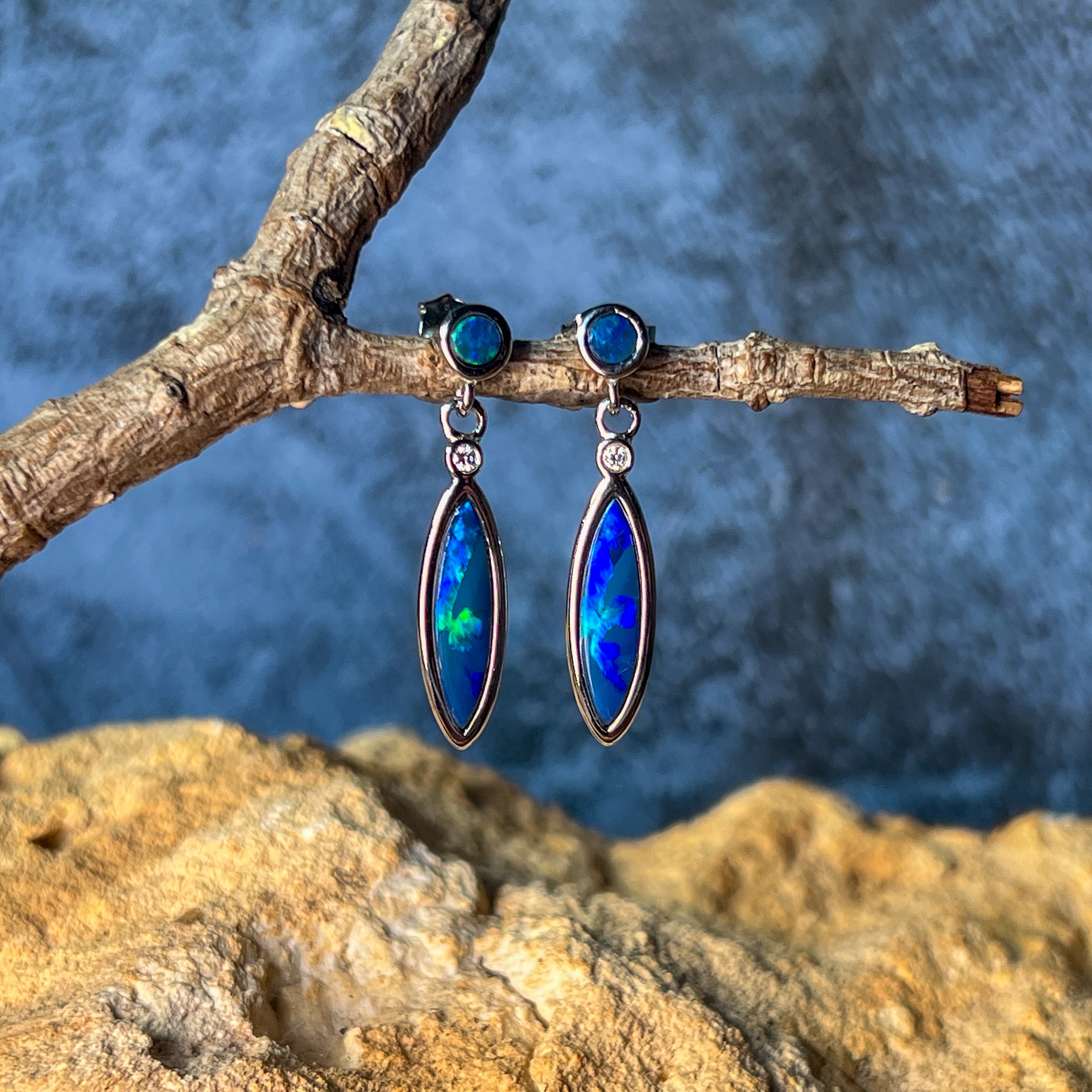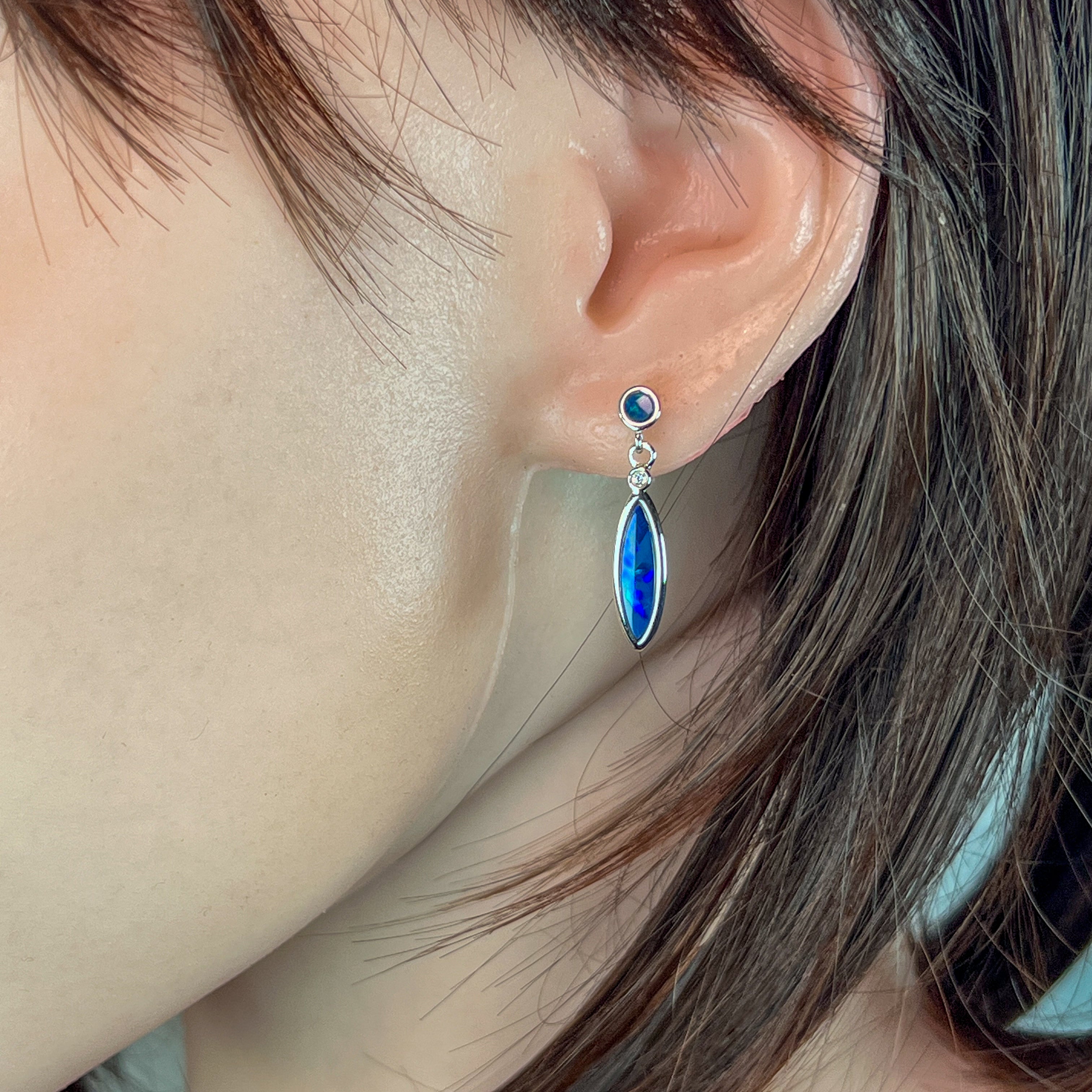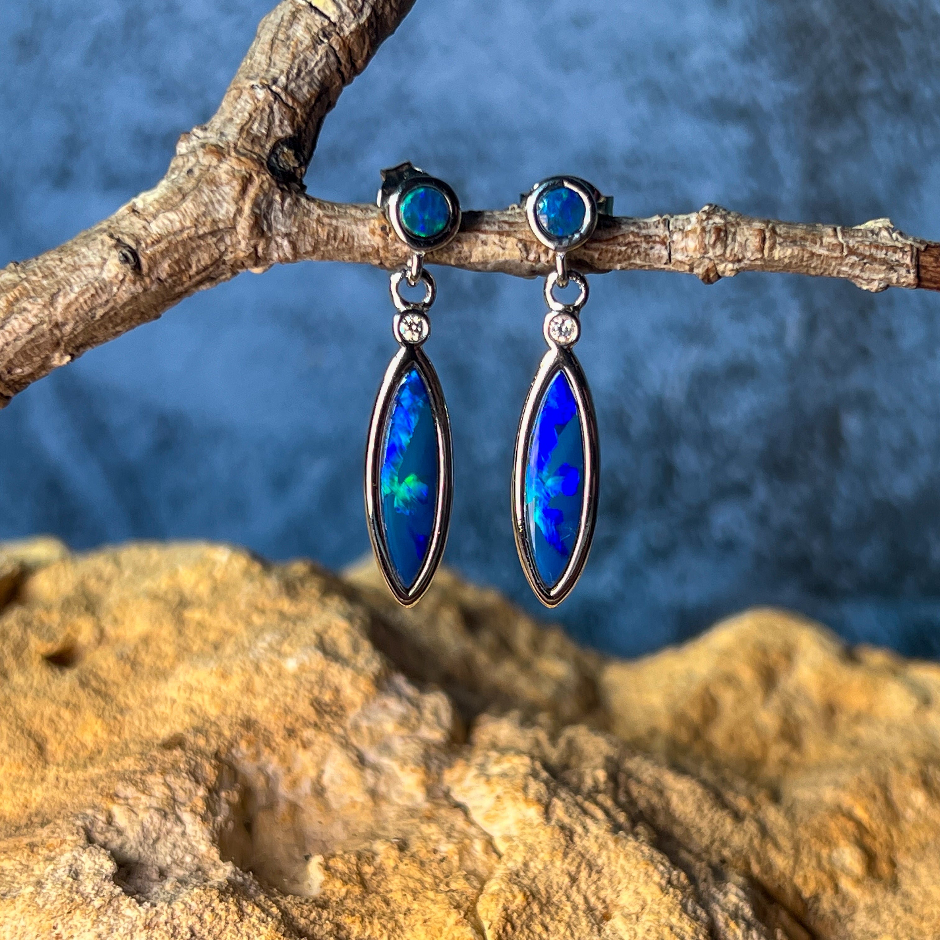 Sterling Silver Opal dangling Blue Green marquise and round shape drop earrings