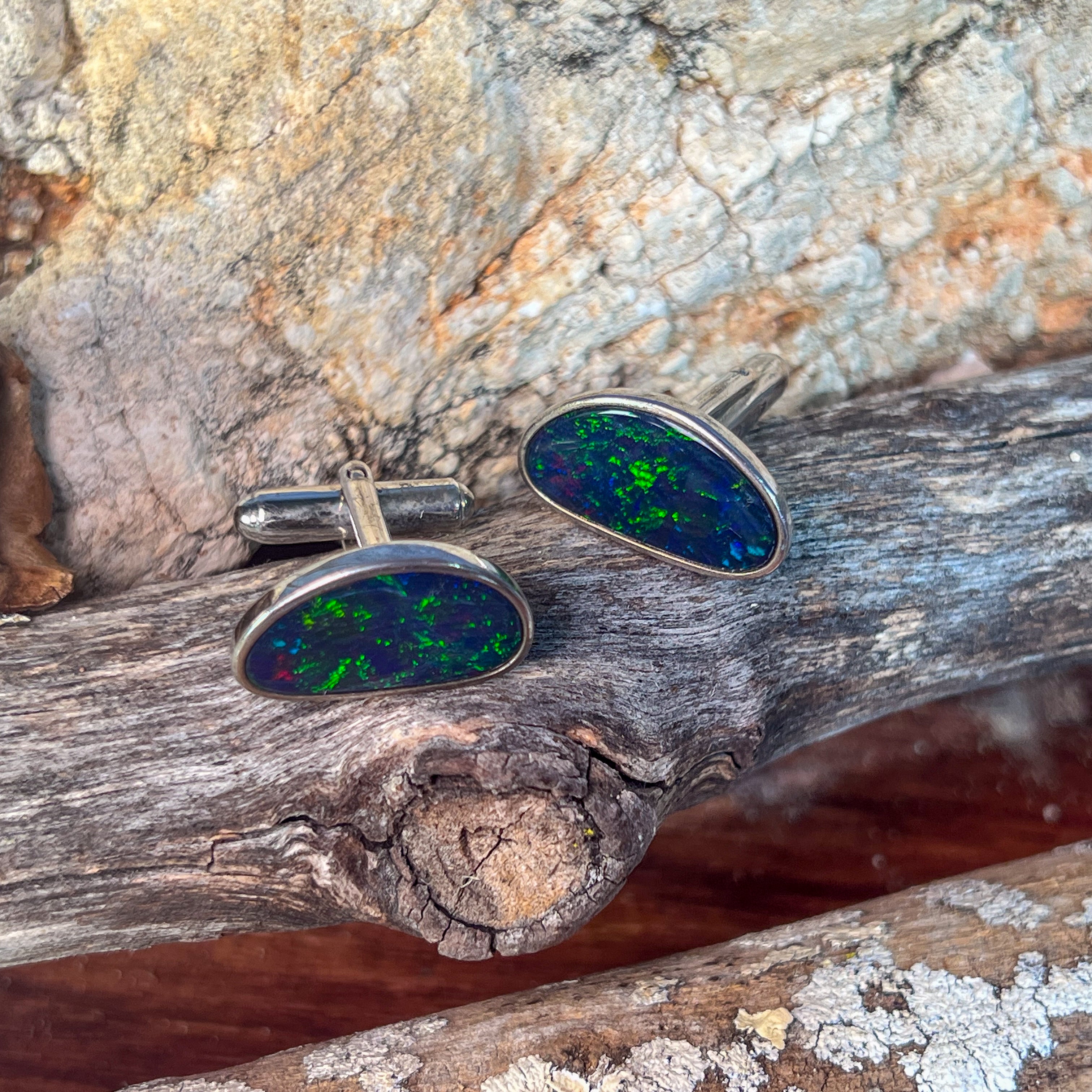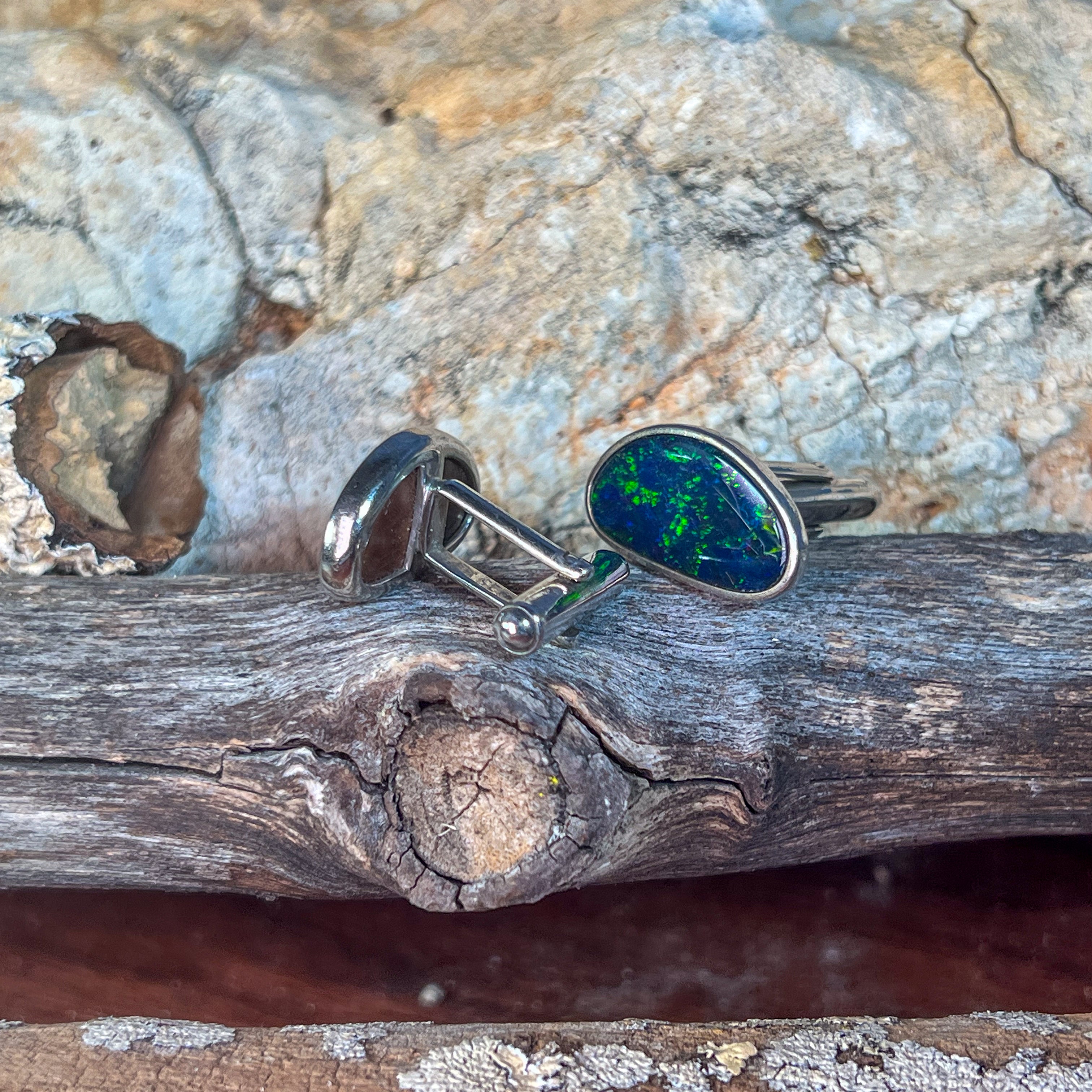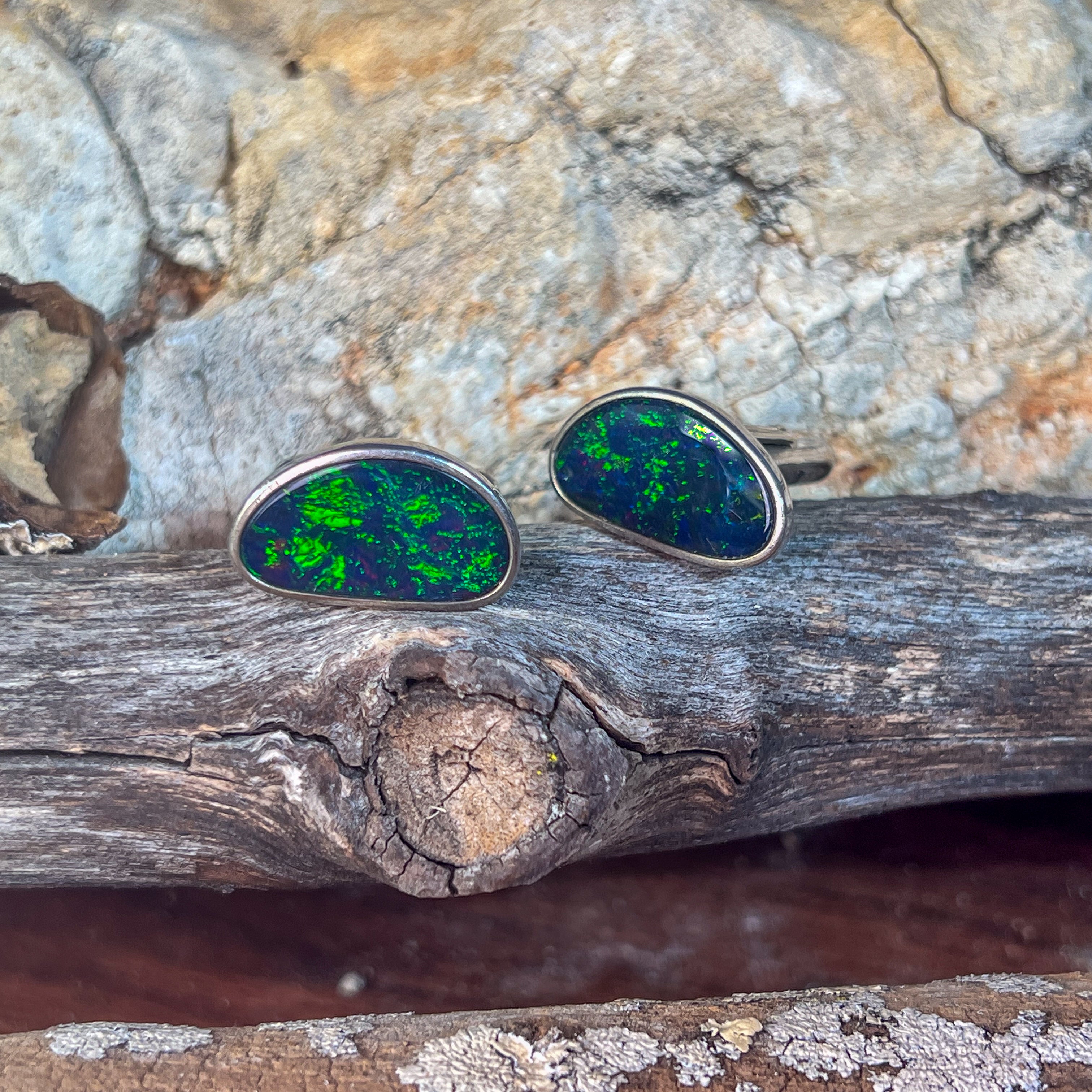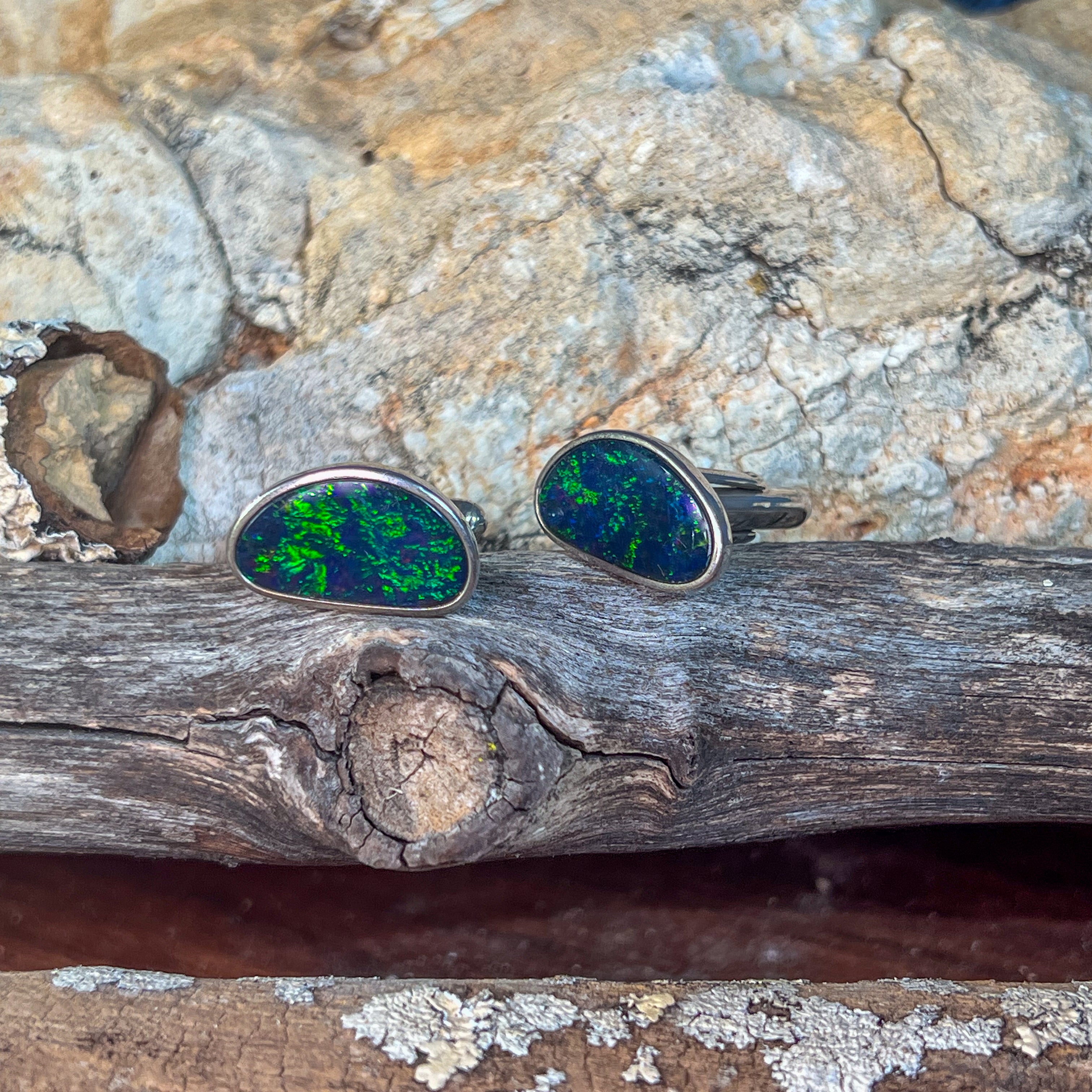 Make a bold statement with these Sterling Silver Opal Doublet Green Red cufflinks. Featuring a unique freeform design, these cufflinks are the perfect touch of color and sophistication to any outfit. The bezel set adds durability and a sleek look. Elevate your style and make a lasting impression with these cufflinks!