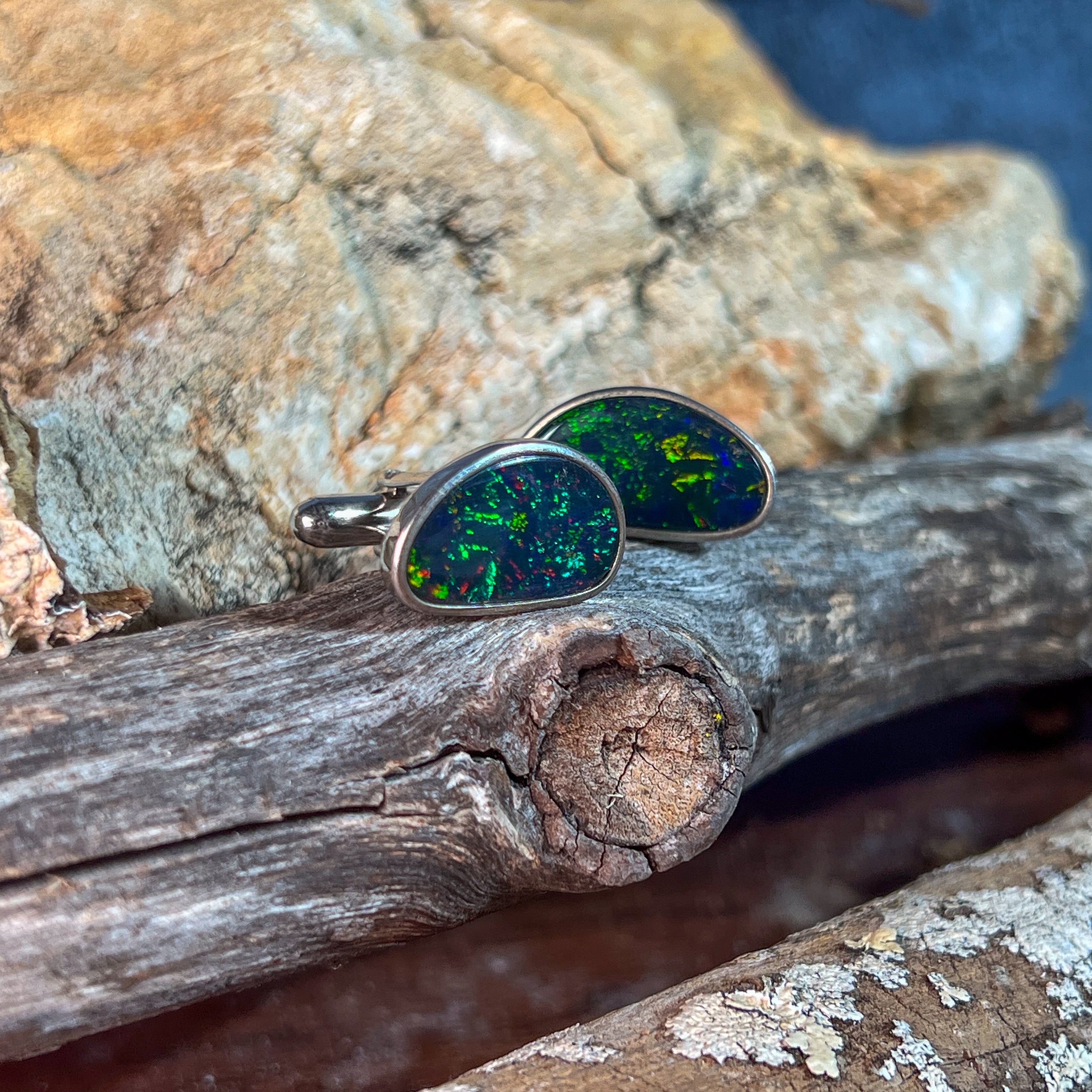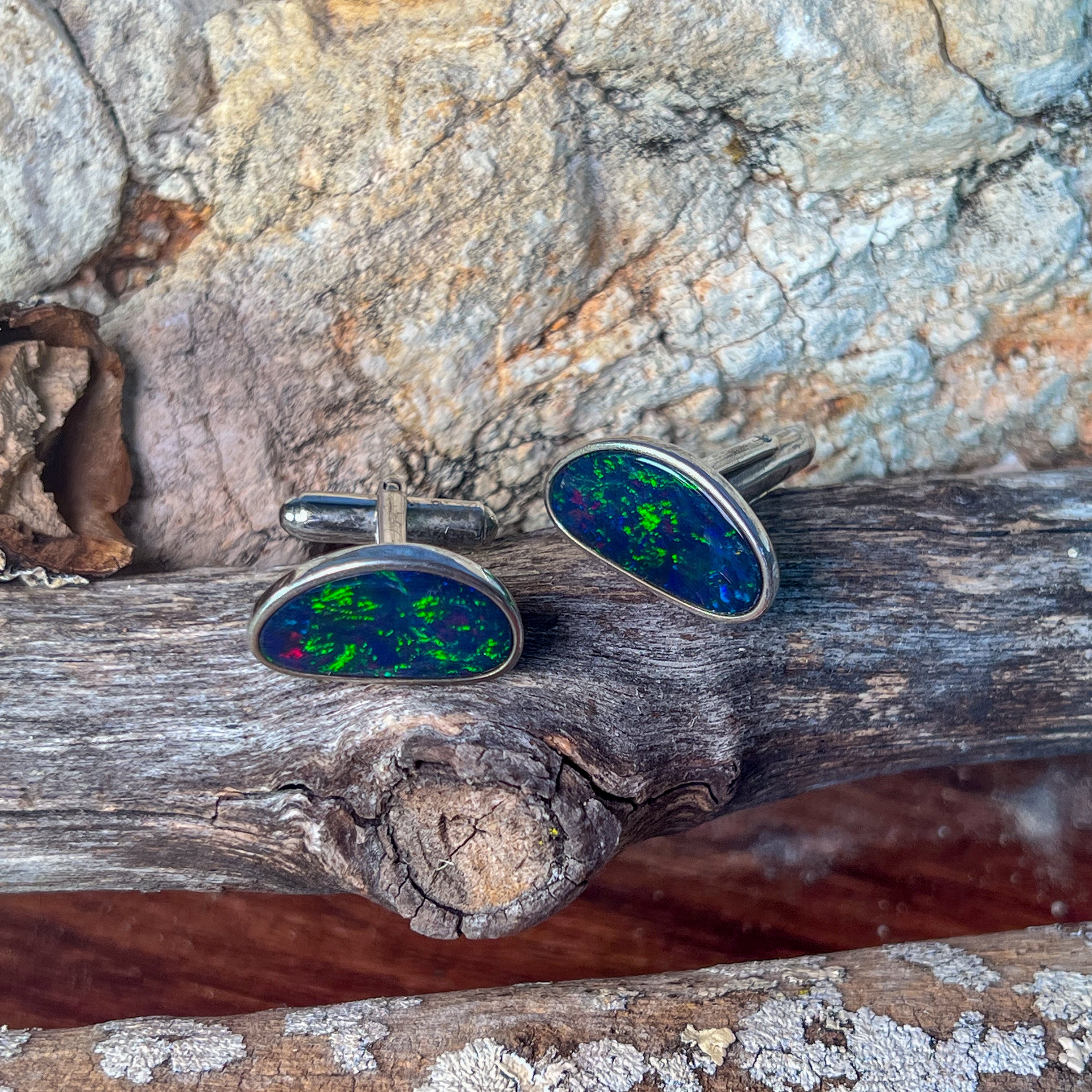 Sterling Silver Opal doublet Green Red bezel set cufflinks