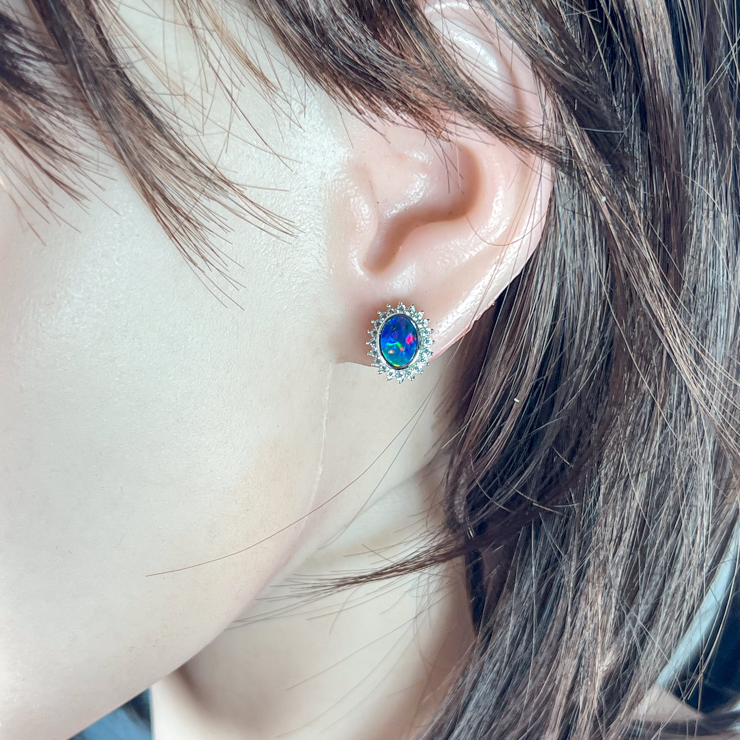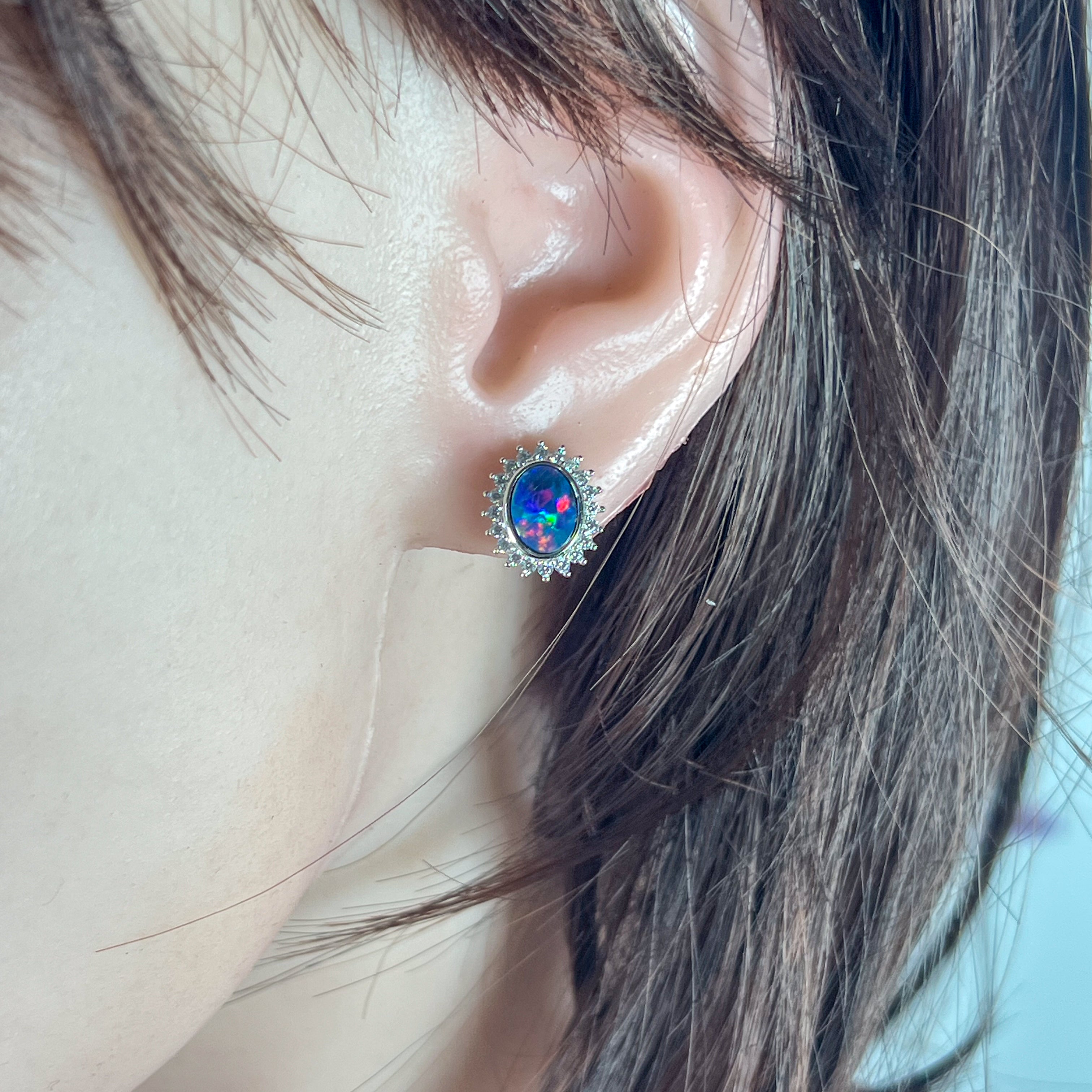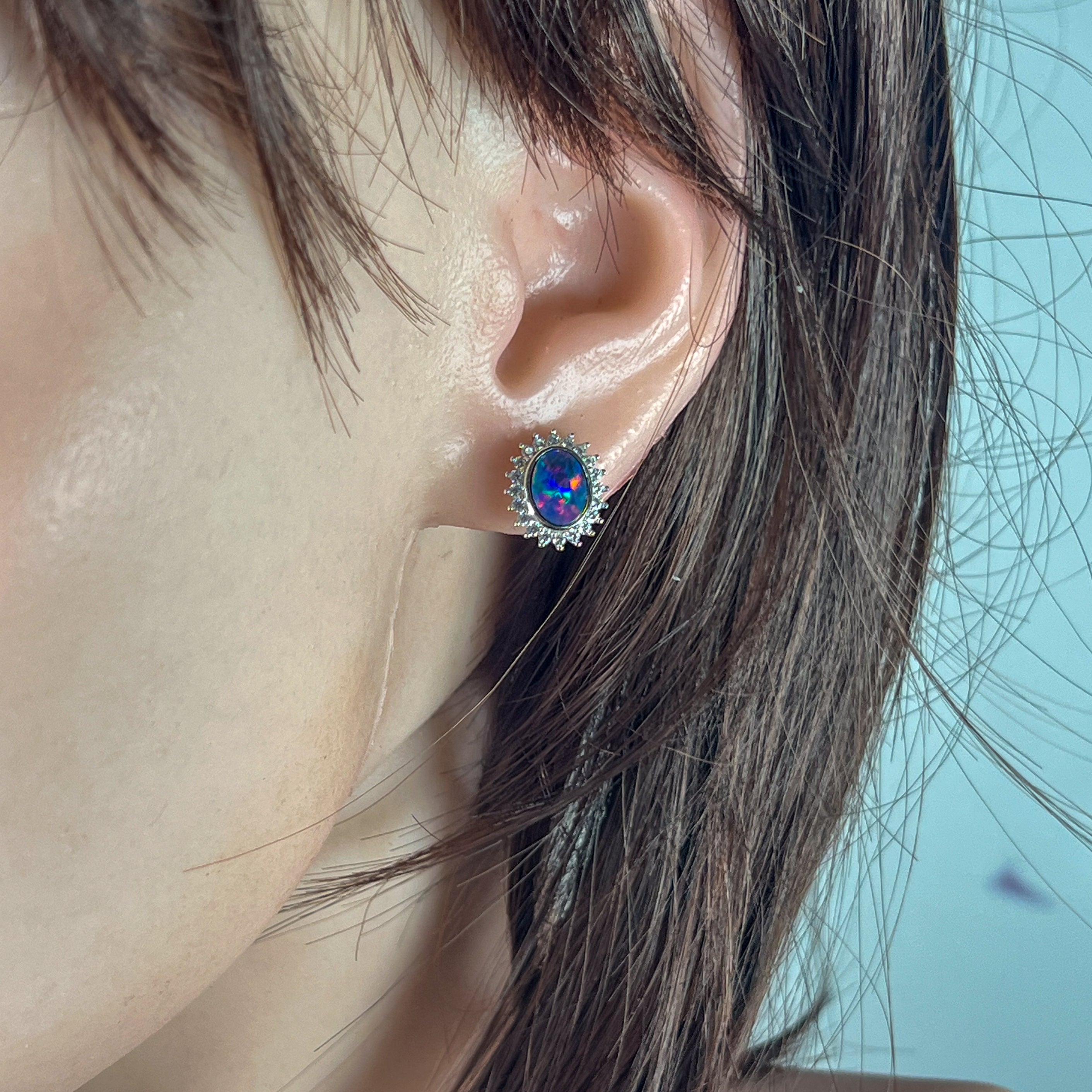 Elevate your elegance with these Sterling Silver Opal Doublet Oval Cluster Earrings. Featuring a harmonious blend of classic red and blue hues, each oval opal doublet is expertly set in a refined cluster design. These earrings offer a timeless sophistication, perfect for adding a subtle yet striking touch to any ensemble. Crafted with sterling silver, they promise lasting quality and a graceful finish.