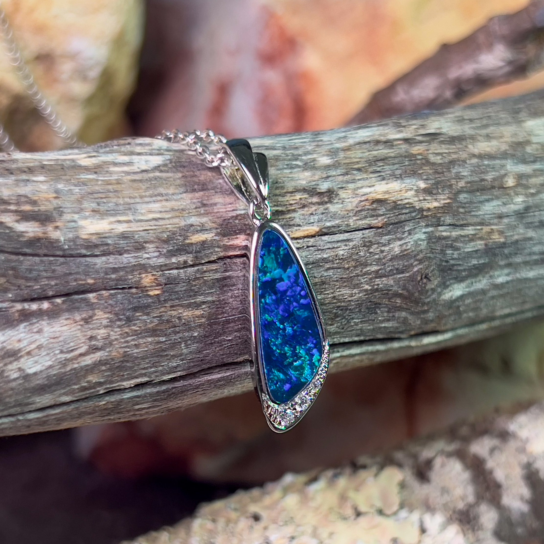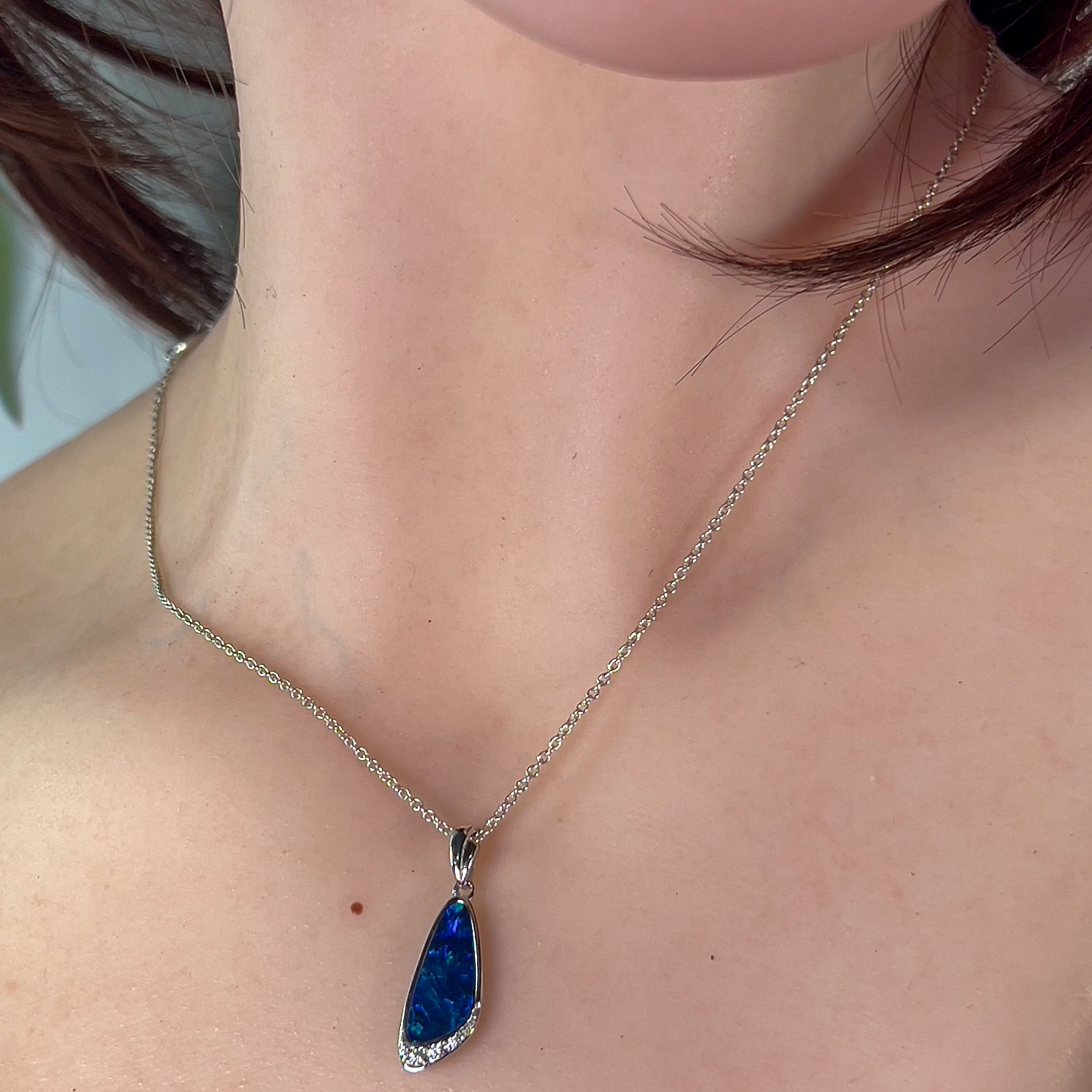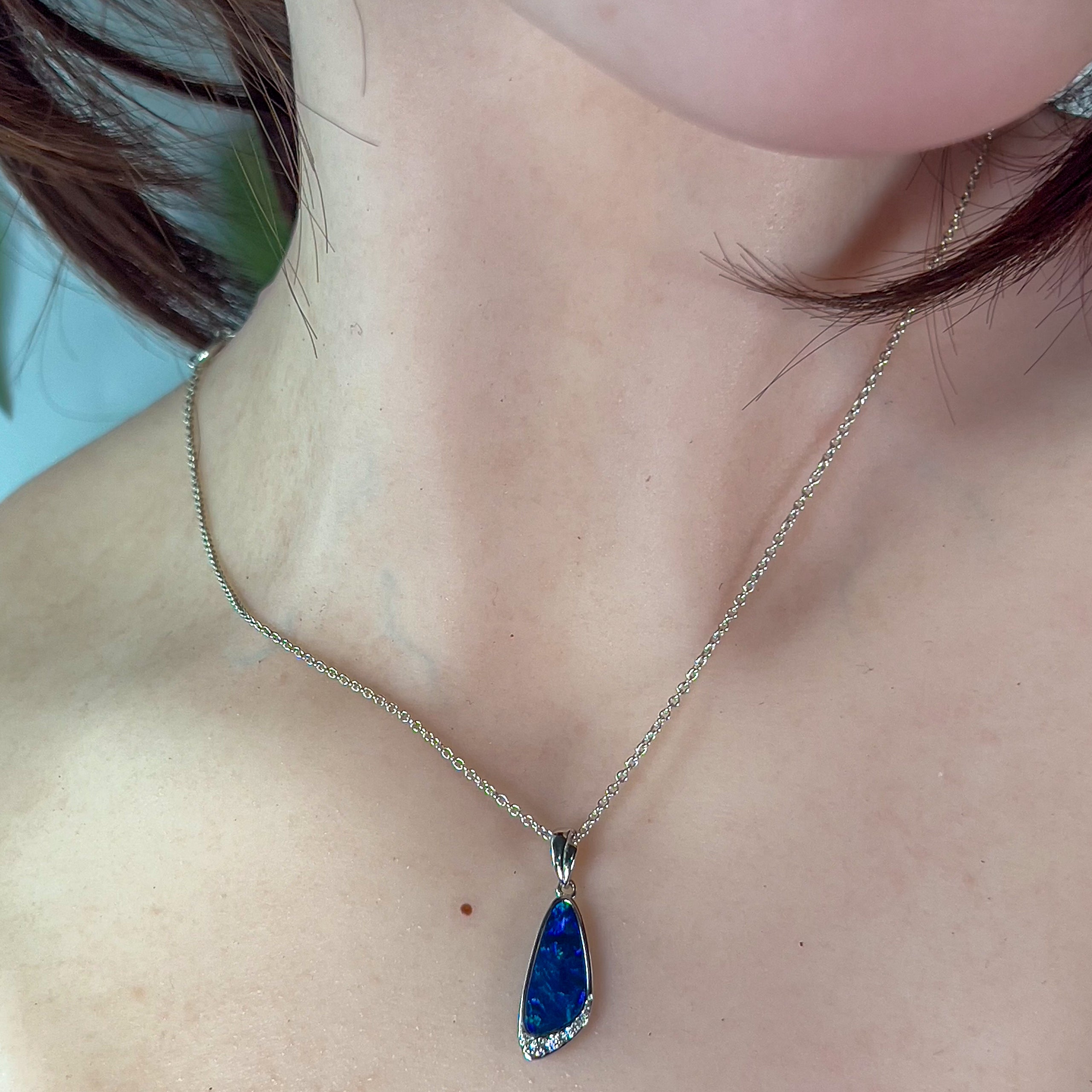 Experience the stunning beauty of our Sterling Silver Opal doublet Triangle Pendant. The triangle shape and vibrant blue-green colors will make a statement and bring positive energy to your outfit. Complete the look with sparkling cz stones. Elevate your style today!