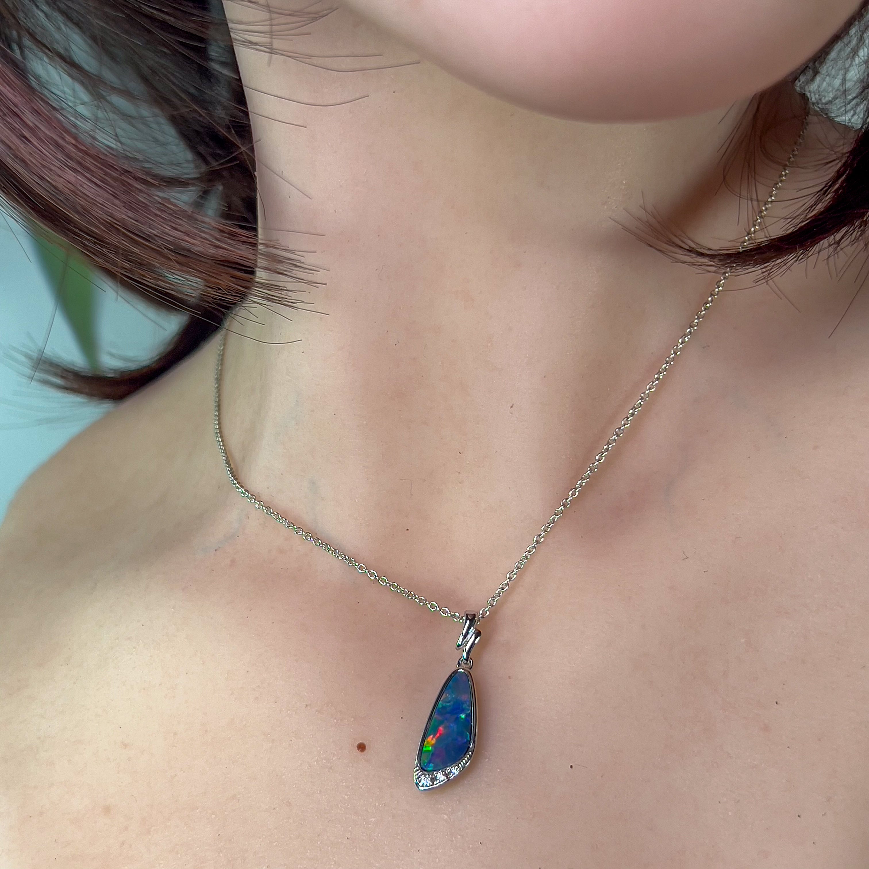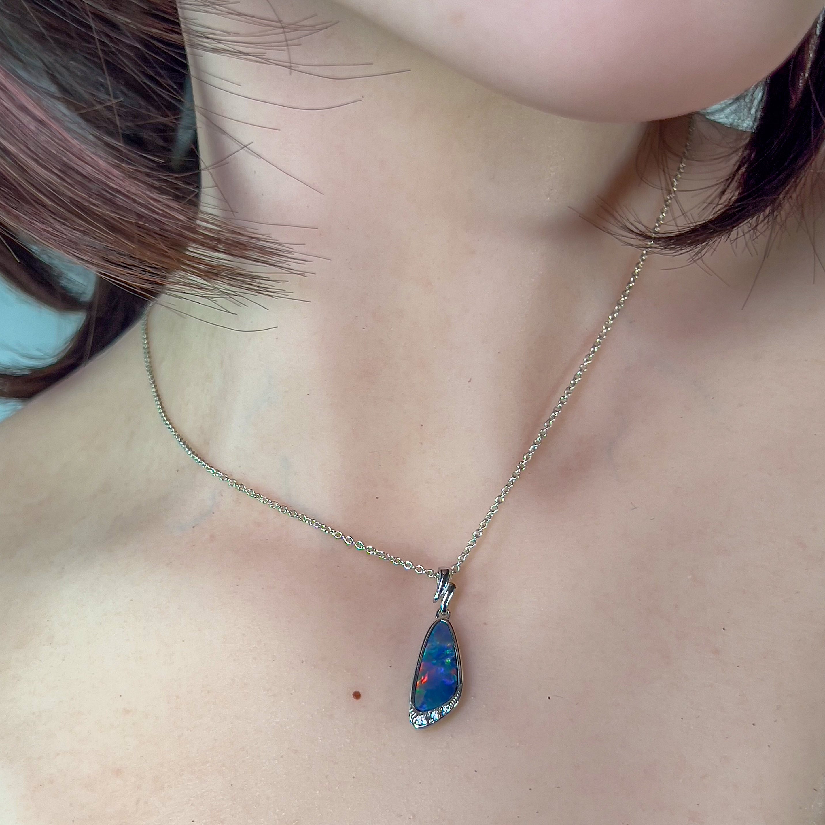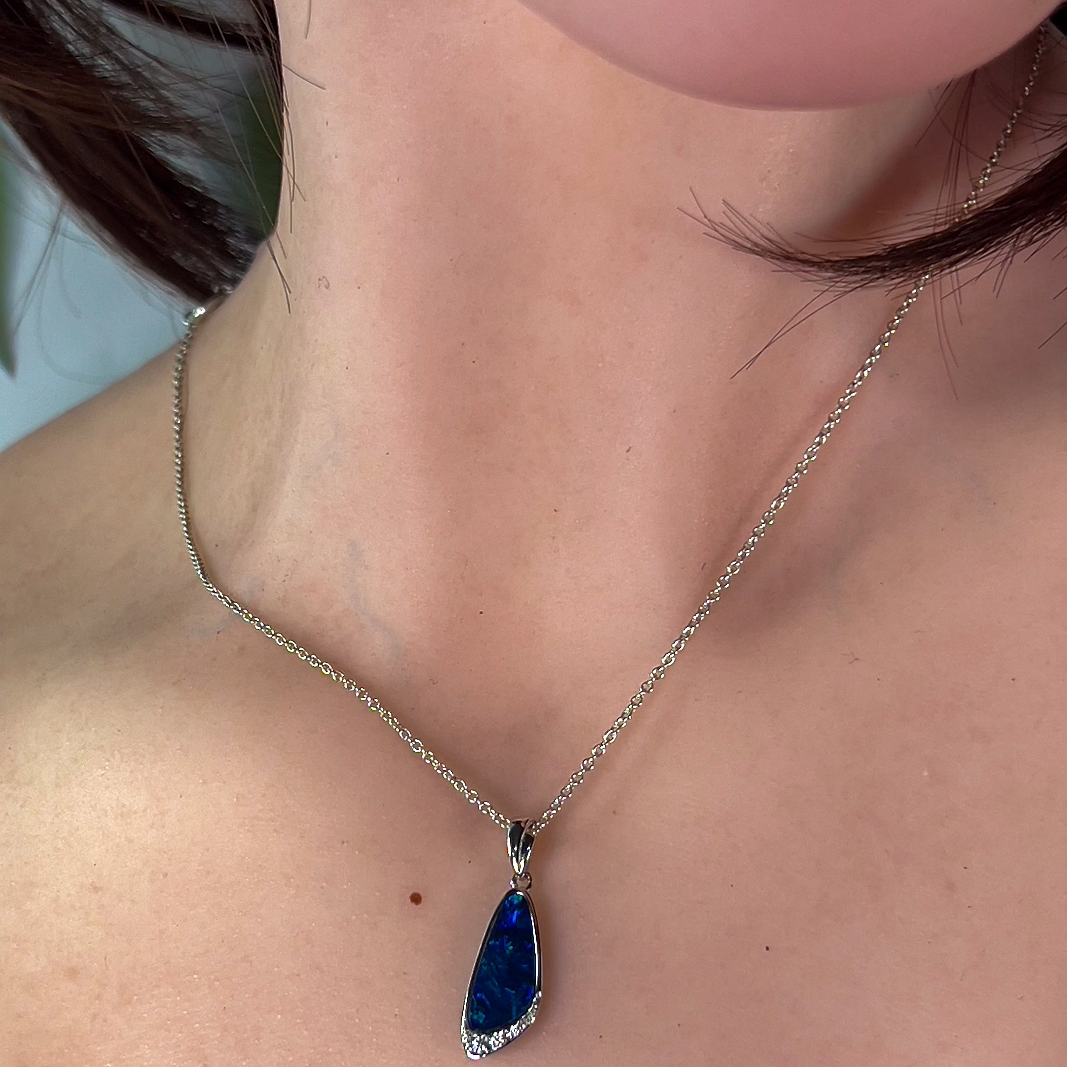 Experience the stunning beauty of our Sterling Silver Opal doublet Triangle Pendant. The triangle shape and vibrant blue-green colors will make a statement and bring positive energy to your outfit. Complete the look with sparkling cz stones. Elevate your style today!